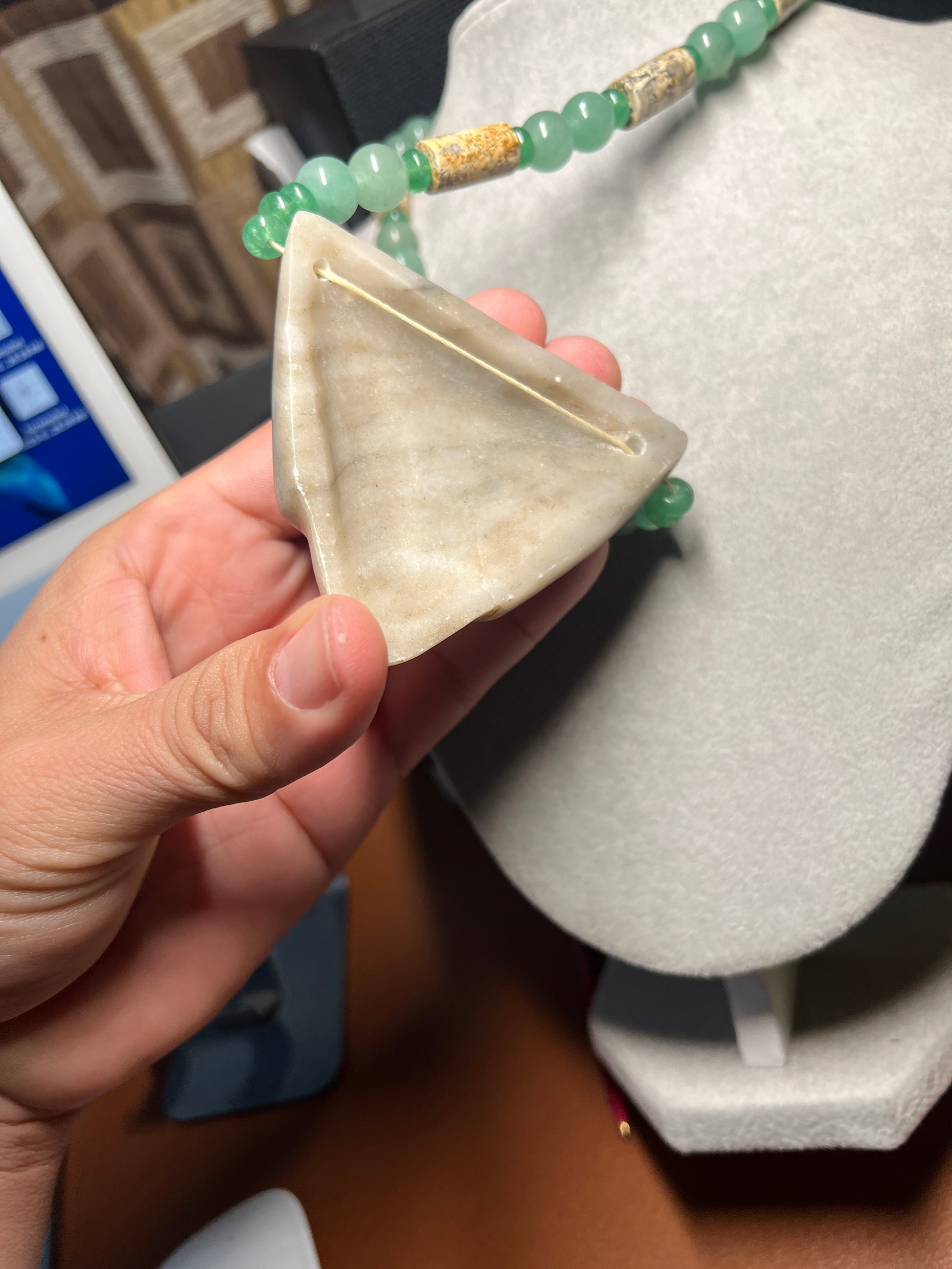 Aventurine necklace with fossil stone tubes. The pendant is carved marble in the shape of an alien skull with aventurine inlays in the eyes.
