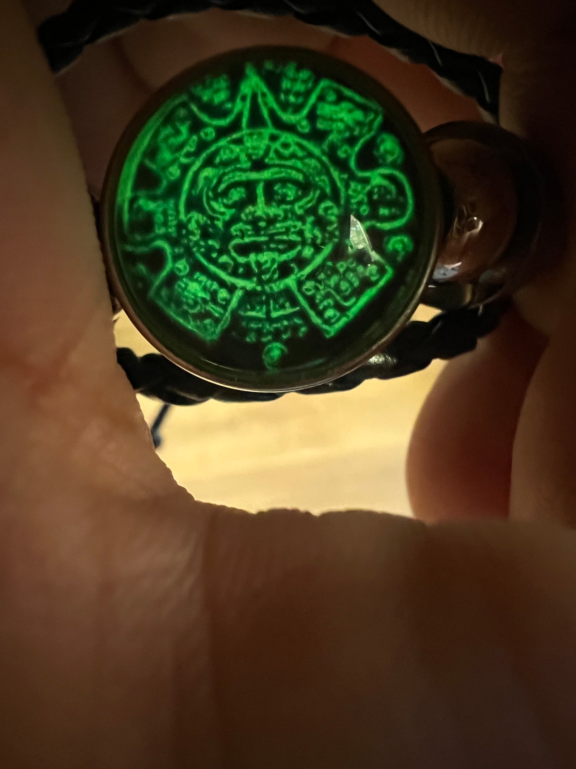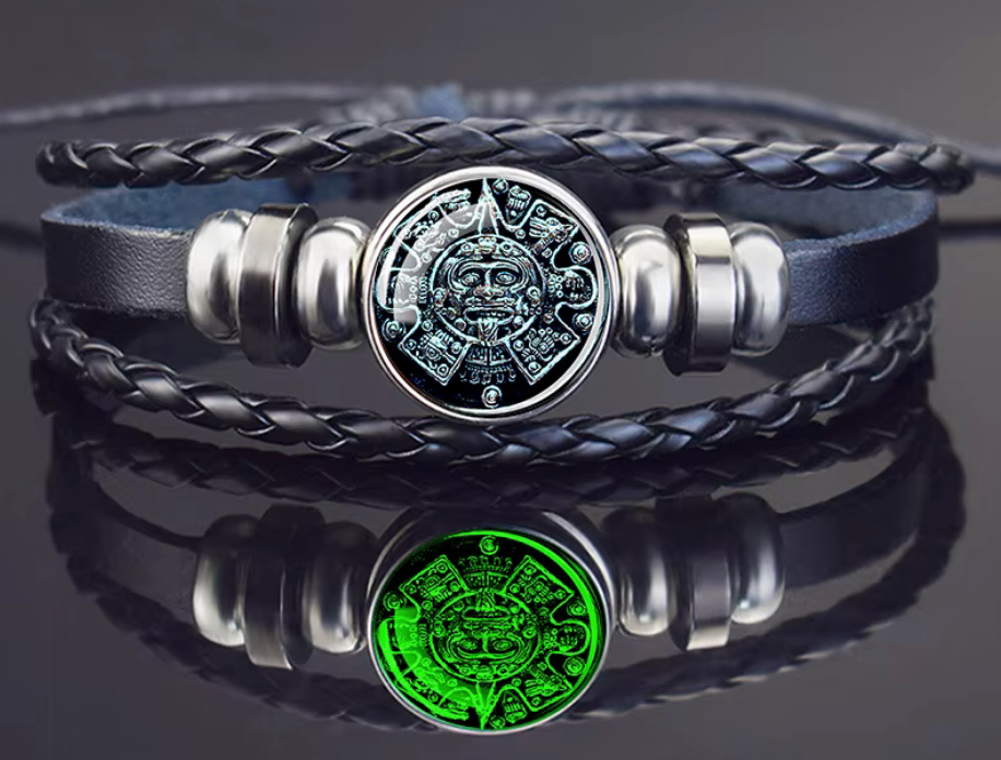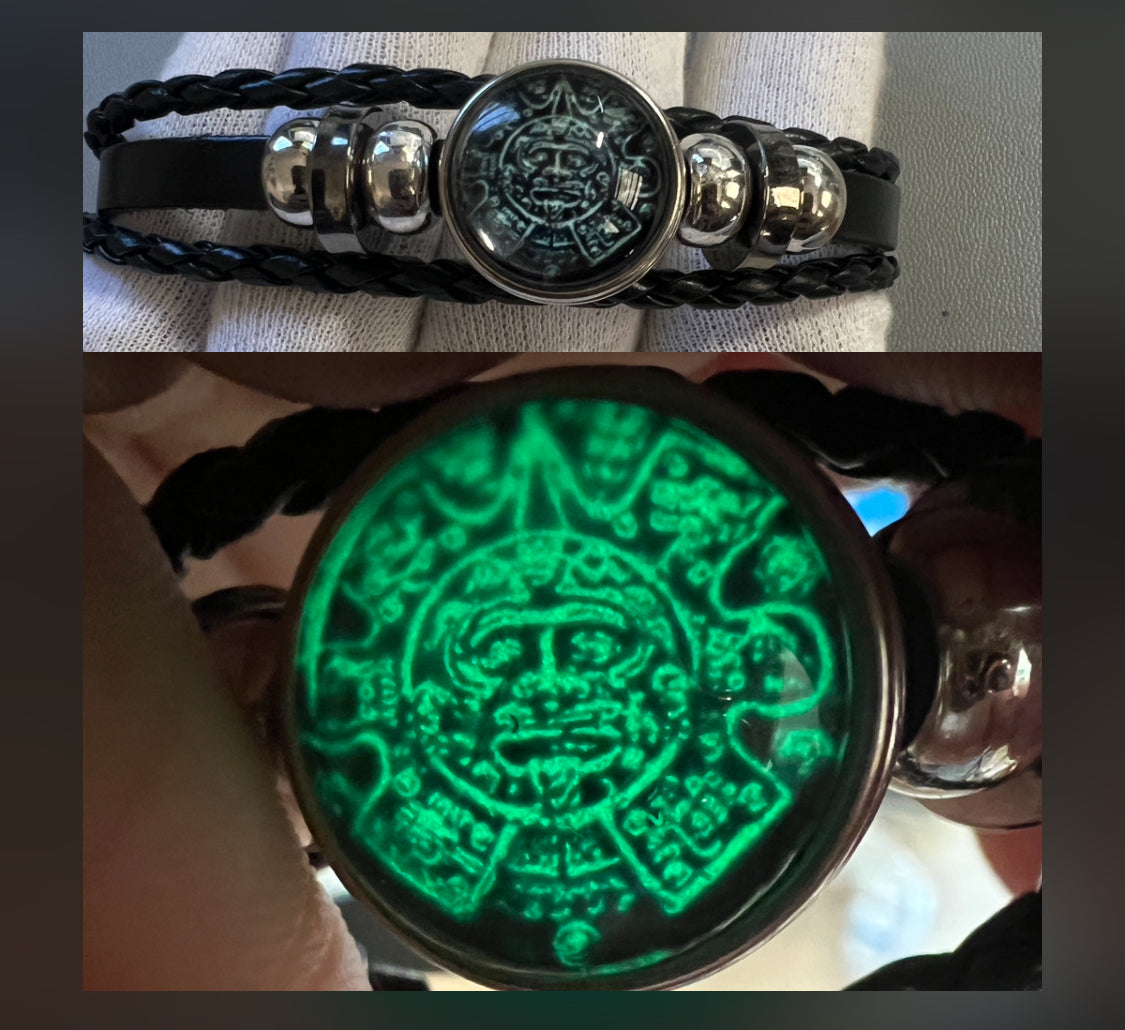 Aztec Calendar Bracelet, Glow In Dark, braided leather, silver tone adornments, adjustable, handmade from Mexico (#4)