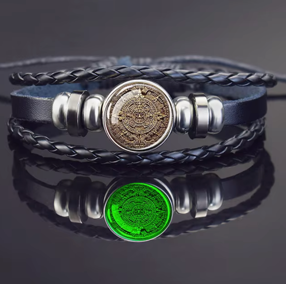 Aztec Calendar Bracelet, Glow In Dark, Stone Calendar, braided leather, silver tone adornments, adjustable, handmade from Mexico (#35)