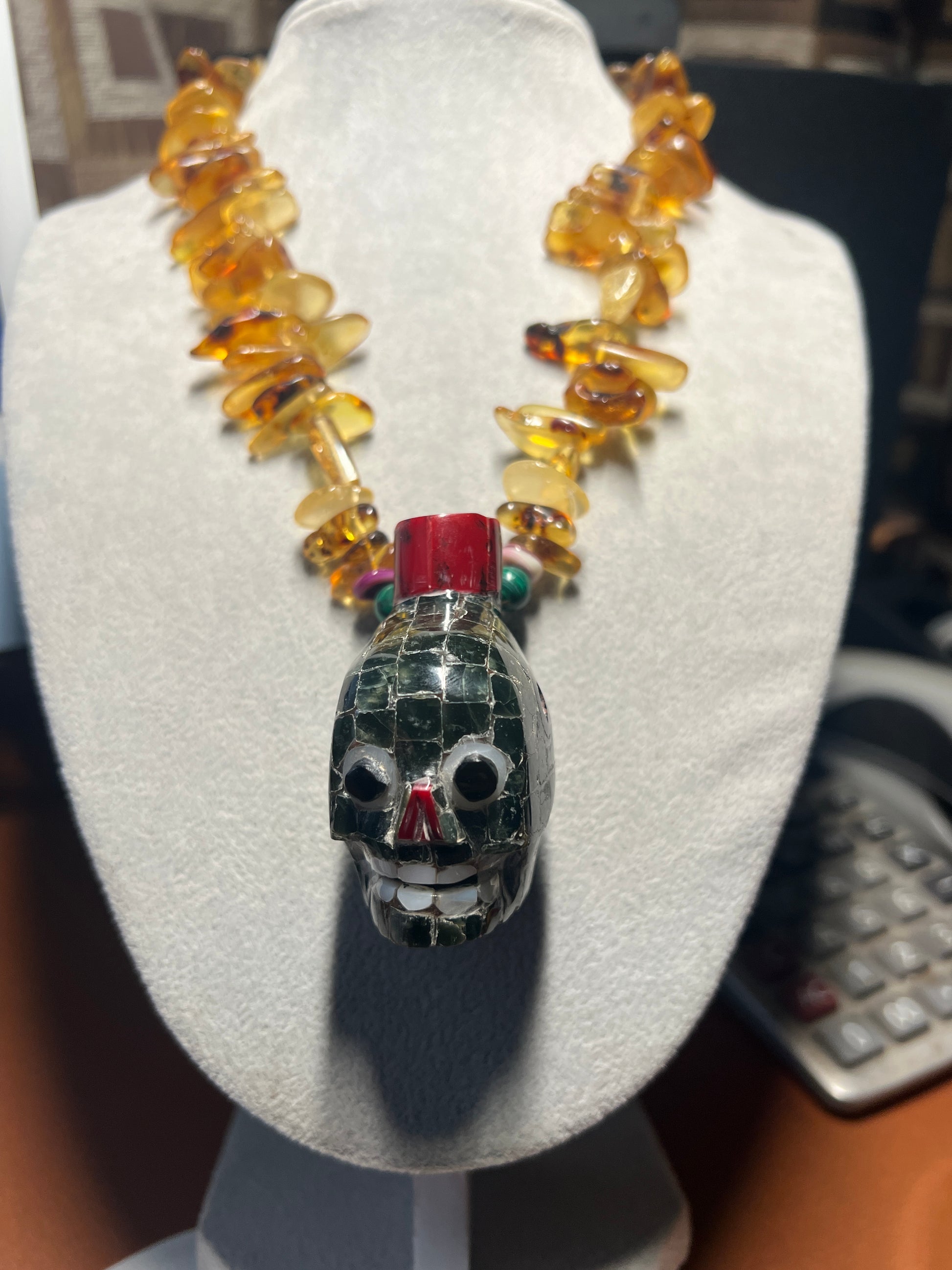 Aztec Death Whistle Serpentine Tiles, Obsidian Eyes, Nacre Teeth, Coral, Y Amber Beads Hecho en Mexico Indigenous
