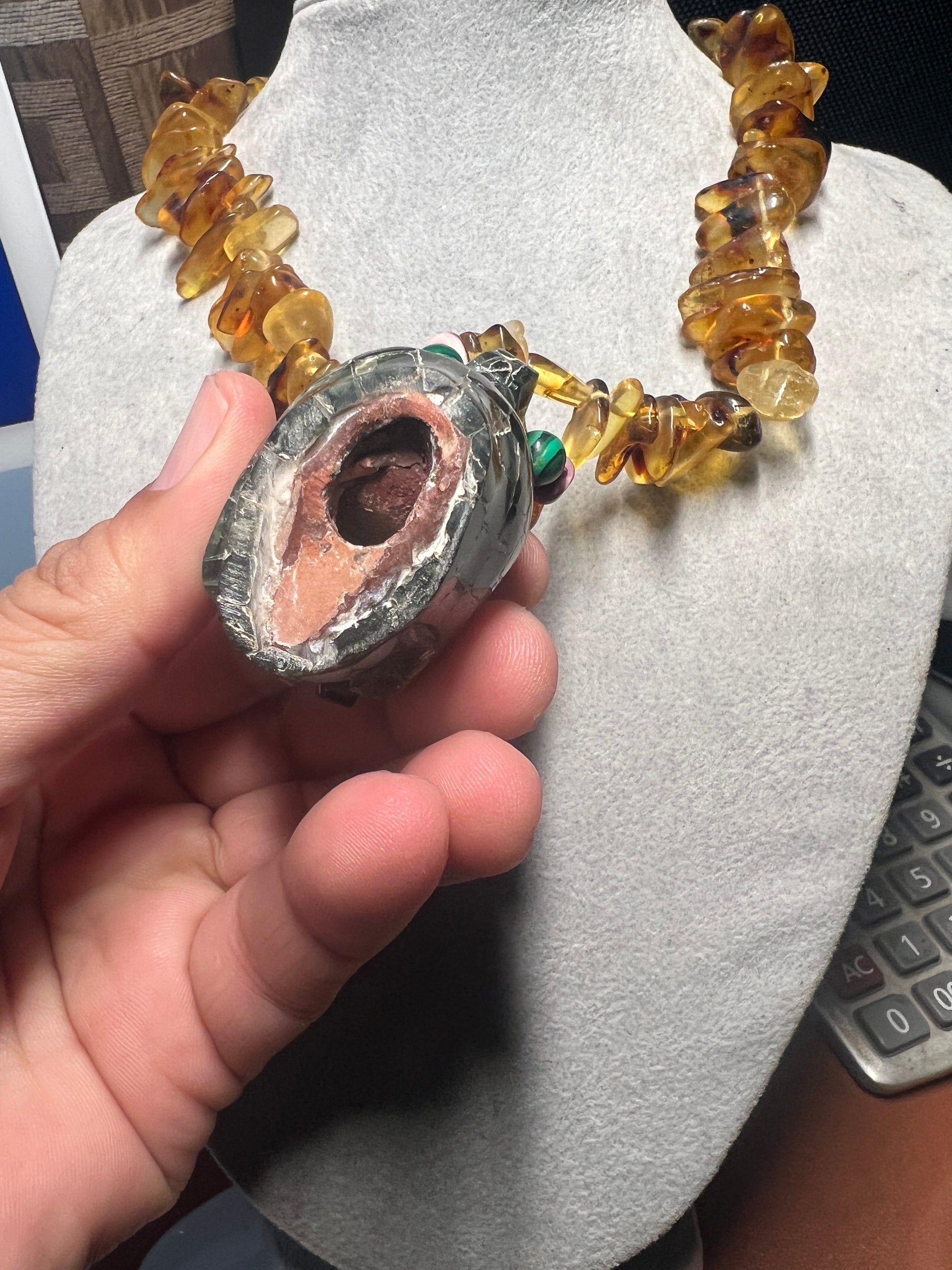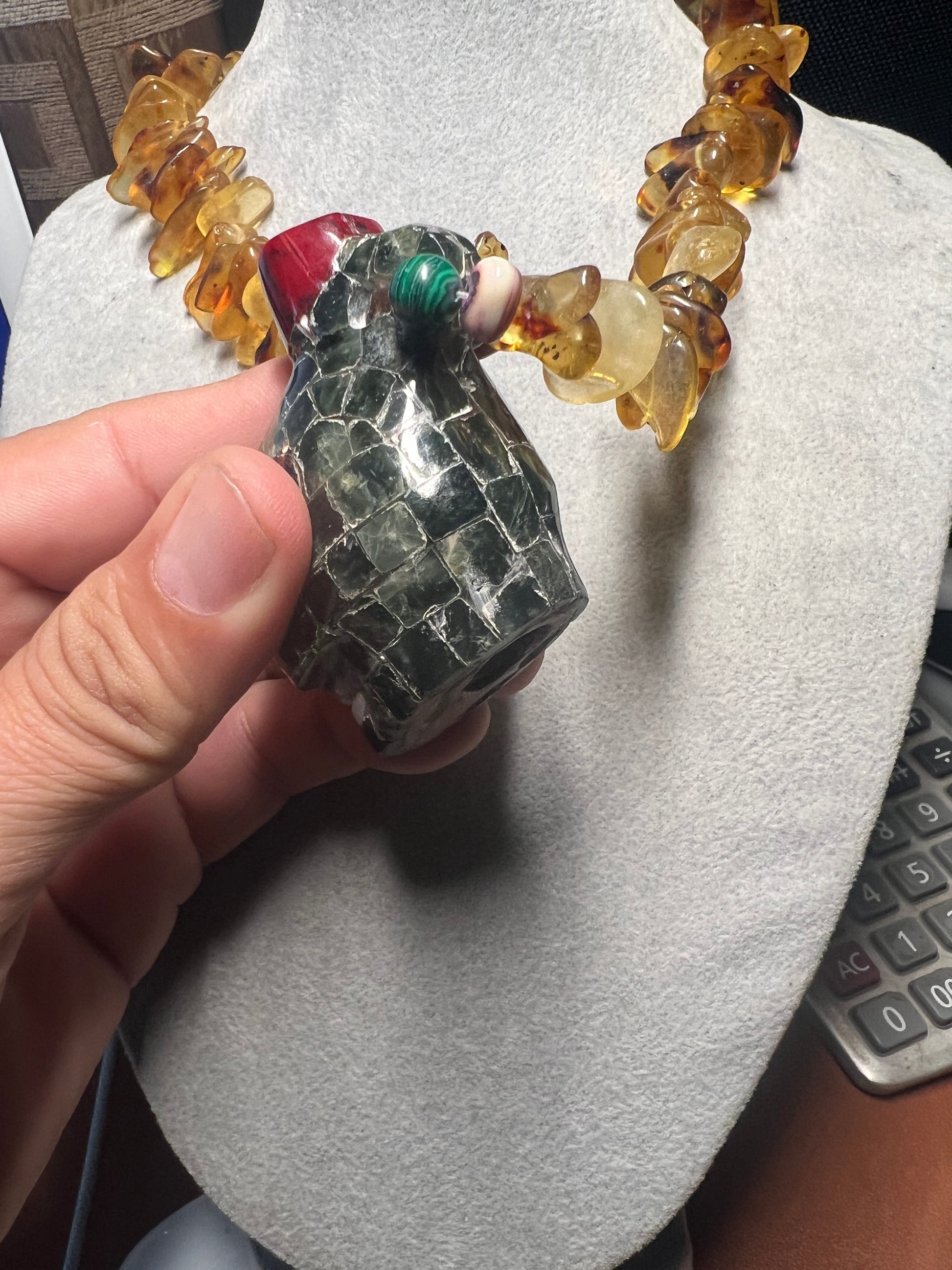 This unique Aztec Death Whistle is a must-have for any collector of rare and intriguing artifacts. Handmade in Mexico, it features serpentine tiles, obsidian eyes, mother of pearl (nacre) teeth, coral, with amber beads, making it a true work of art. The intricate details and craftsmanship are evident in every inch of this stunning piece. With its rich cultural heritage, this Mexican-made whistle is sure to be a conversation starter. Its unique design and materials make it a one-of-a-kind item that will be treasured for years to come. Don't miss your chance to own this remarkable piece of art.