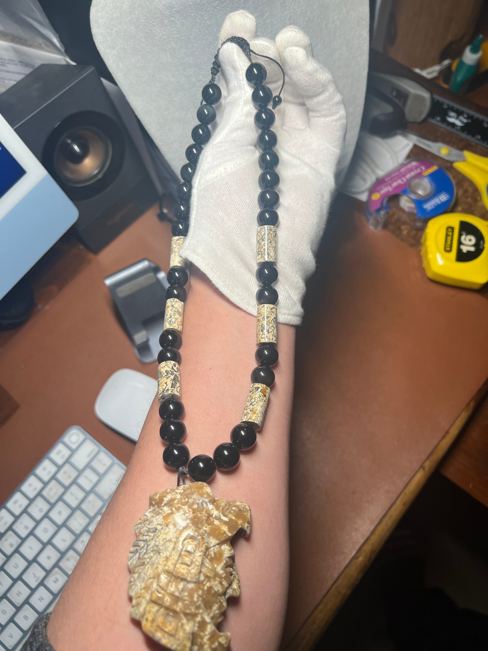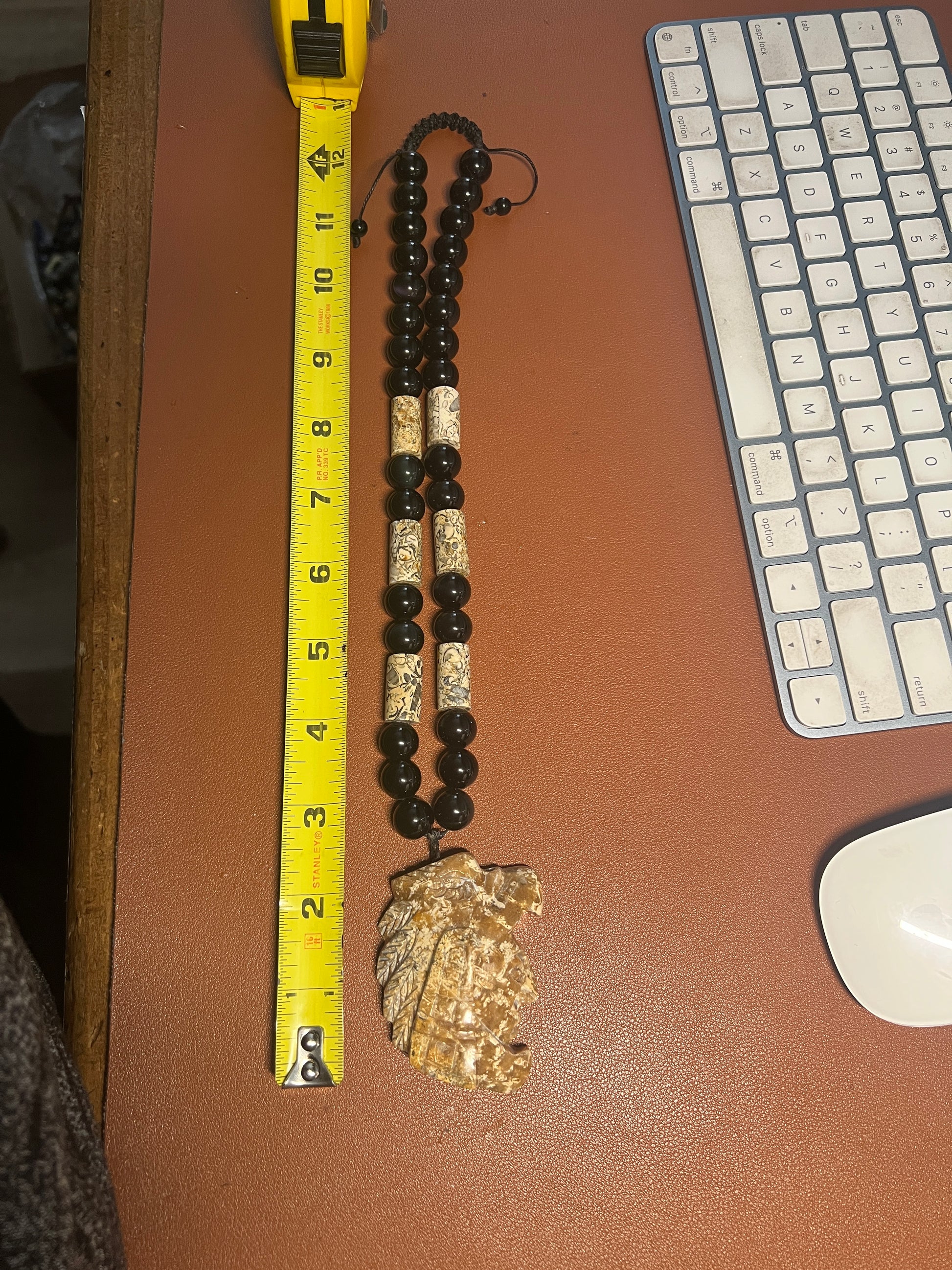 Aztec Eagle Warrior Fossil Stone Pendant Necklace Rainbow Obsidian Beads MX (35)