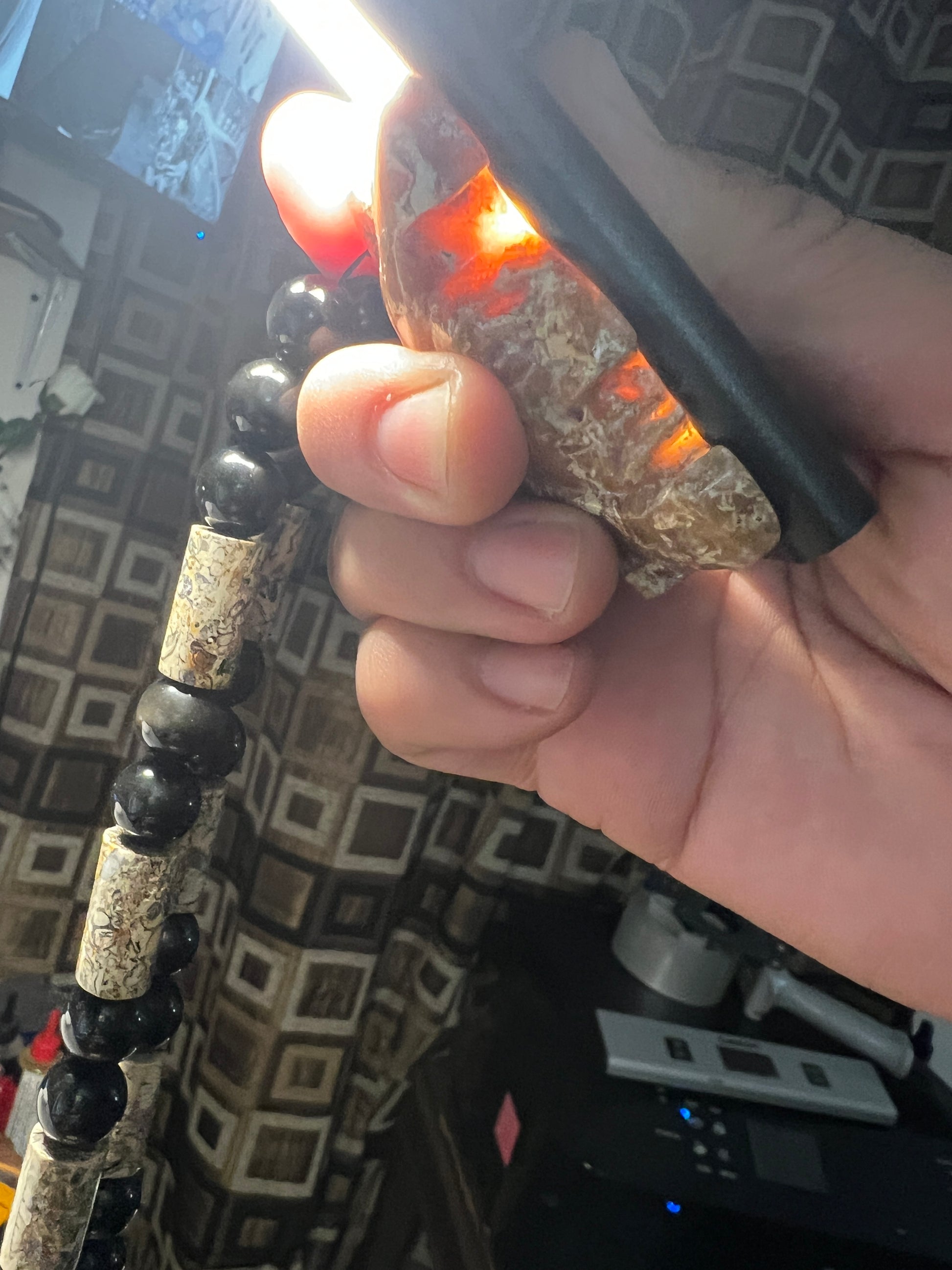 Rainbow obsidian necklace with fossil stone tubes and a carved eagle warrior pendant in translucent sponge fossil stone.
