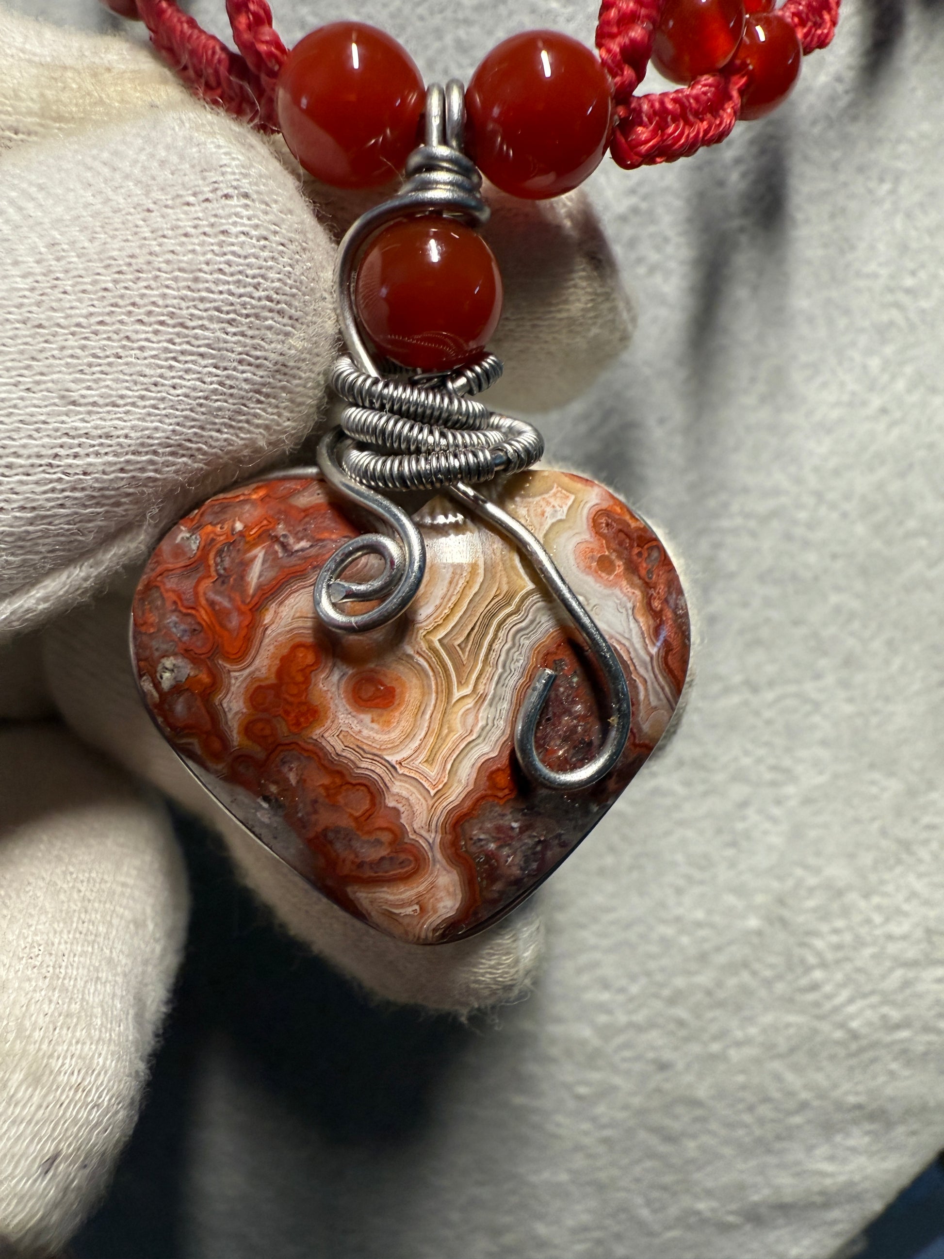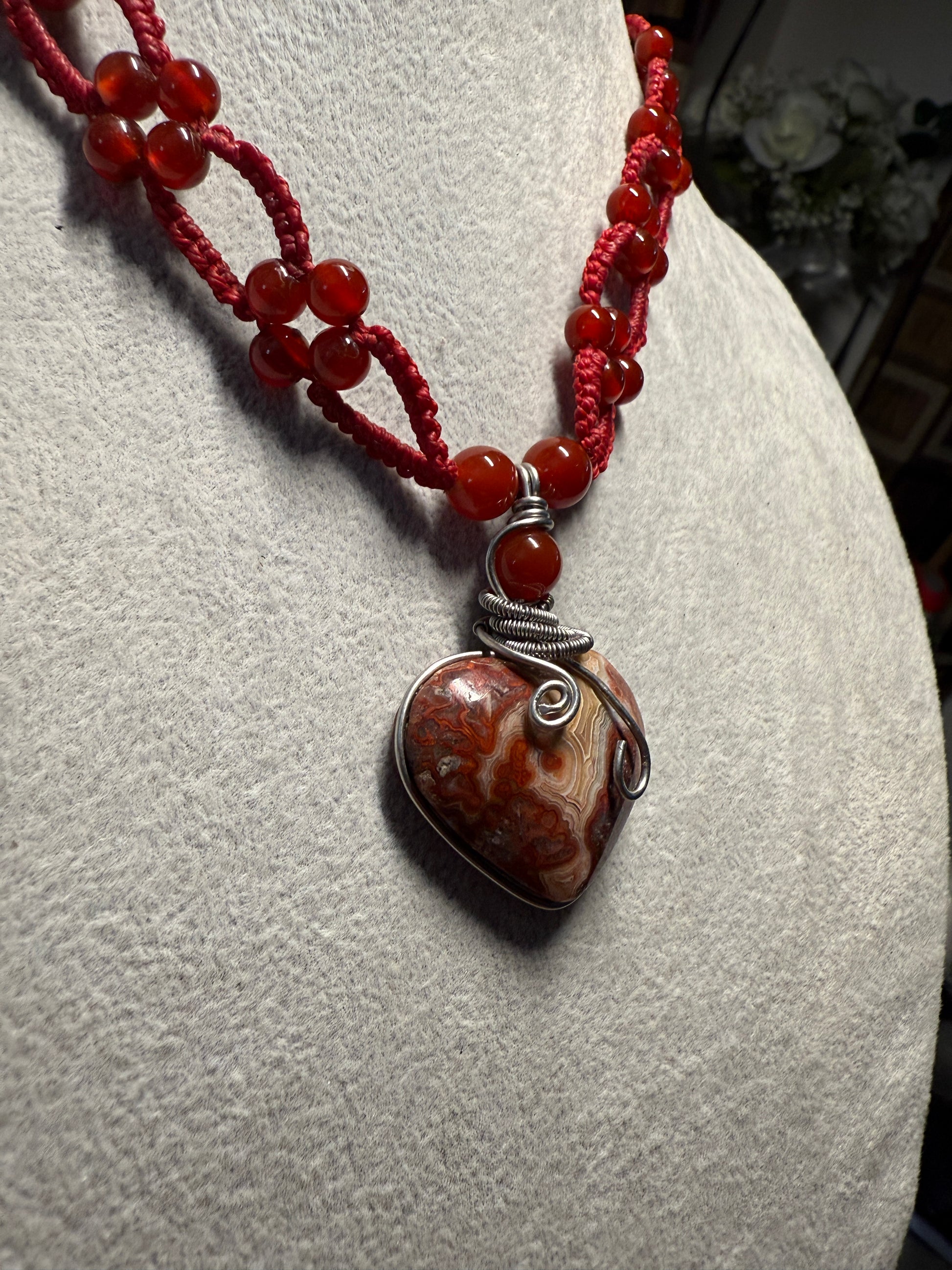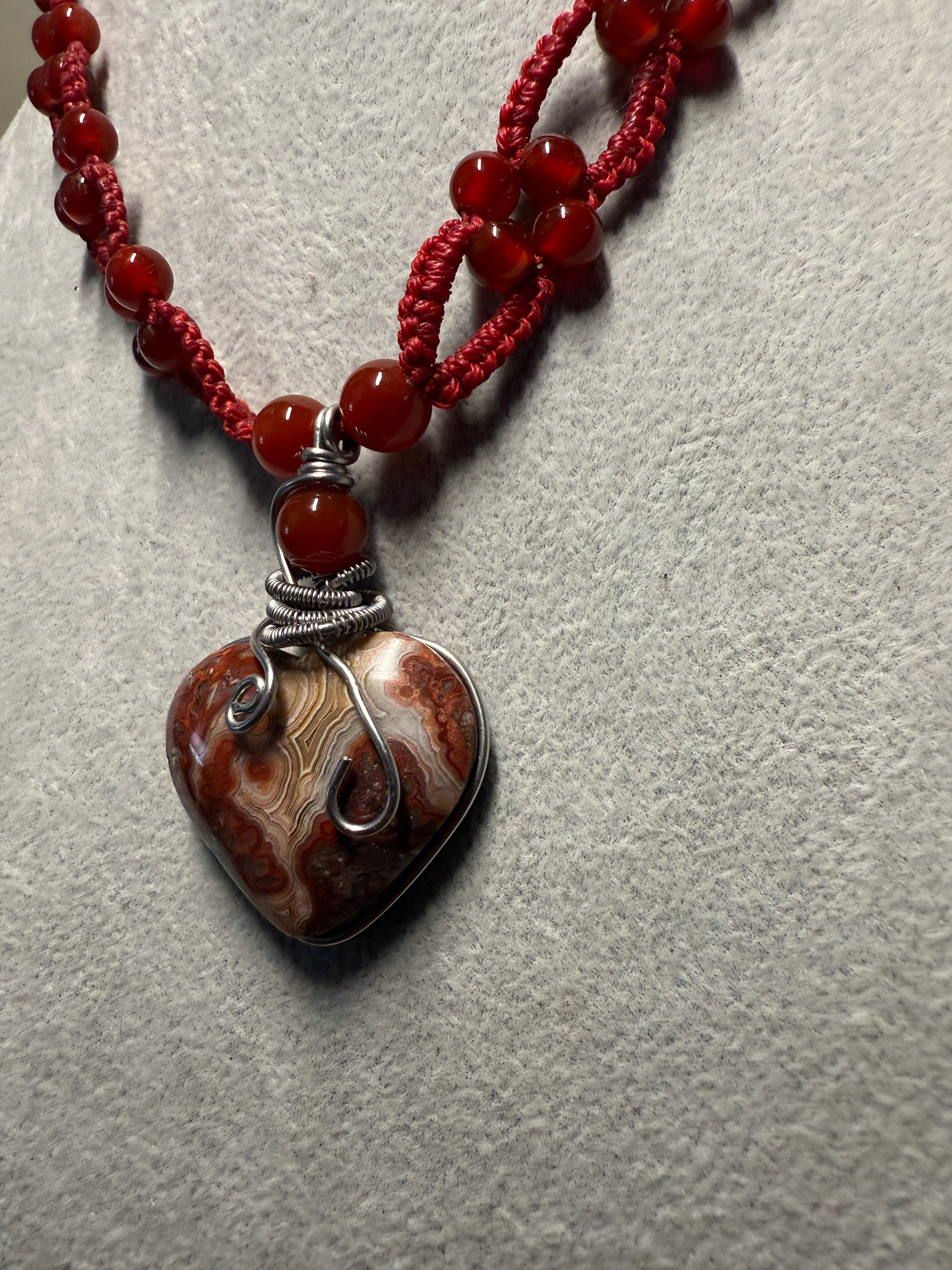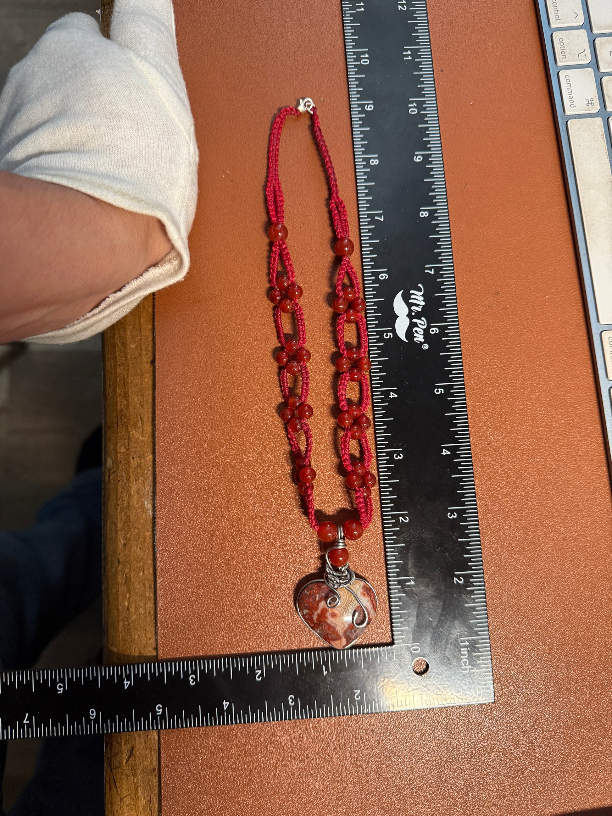 Aztec Heart Necklace, Agate Coralina, Red Jasper, Woven 15" (#20)