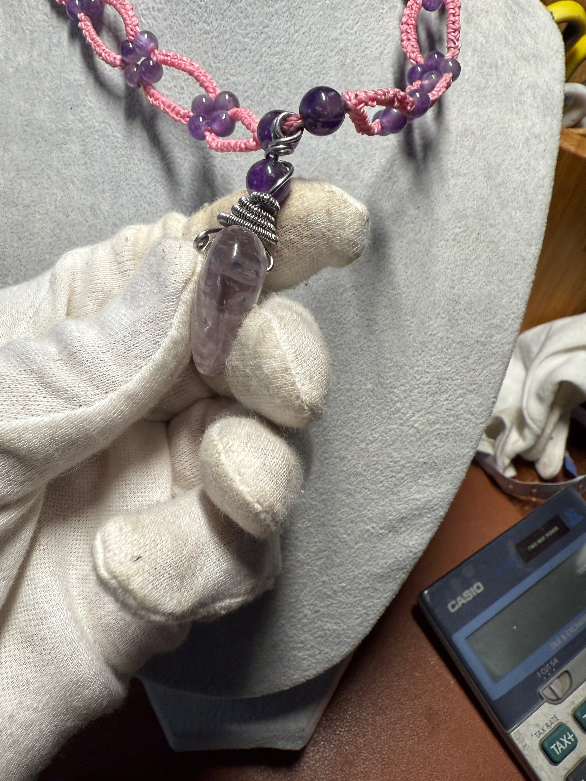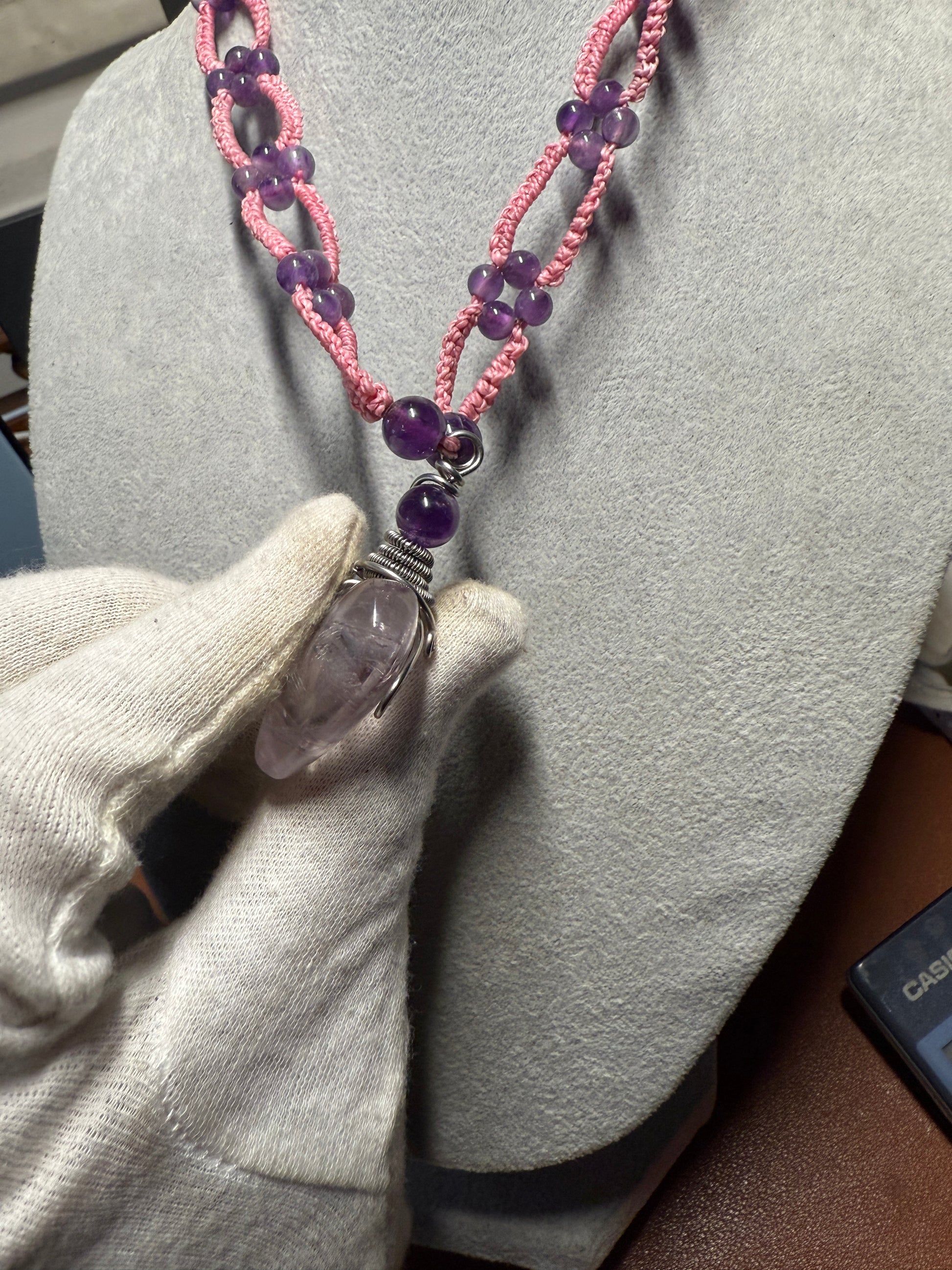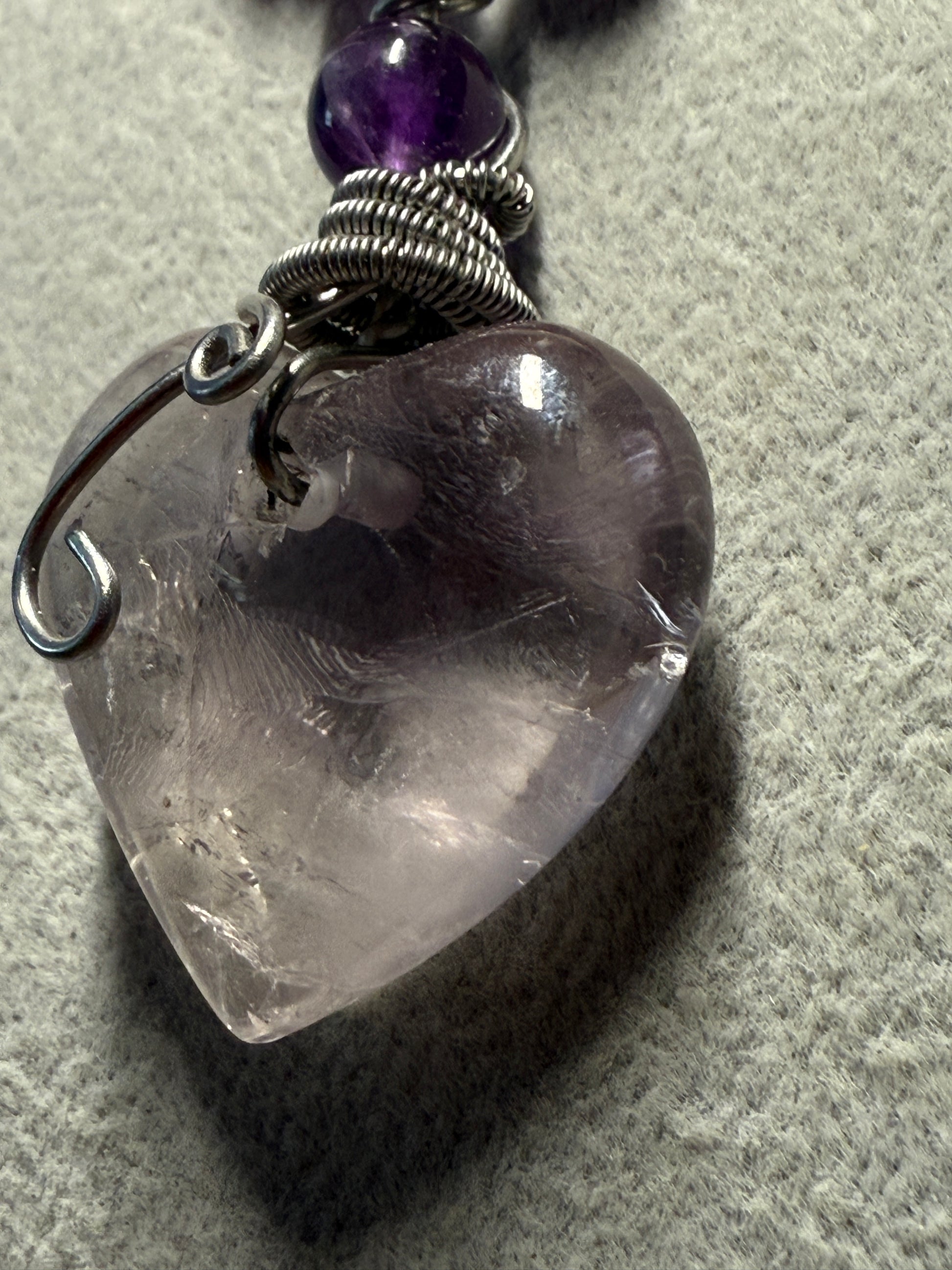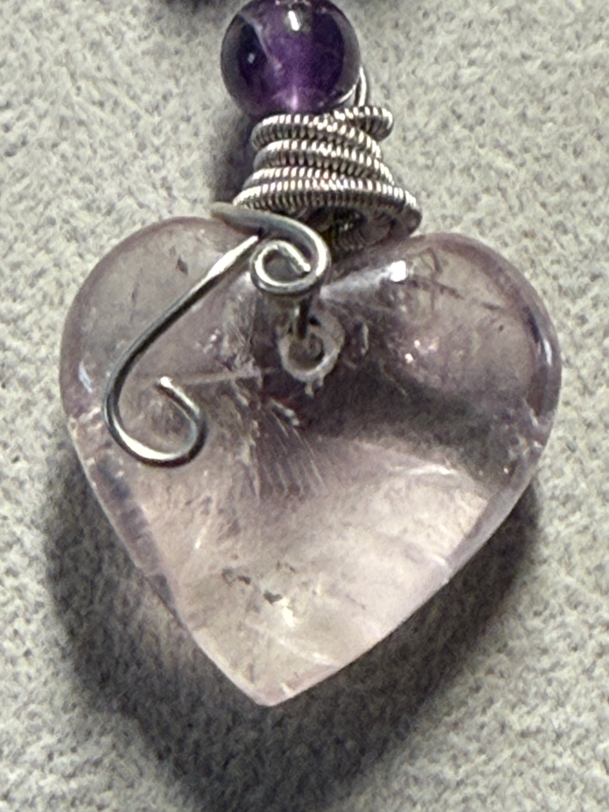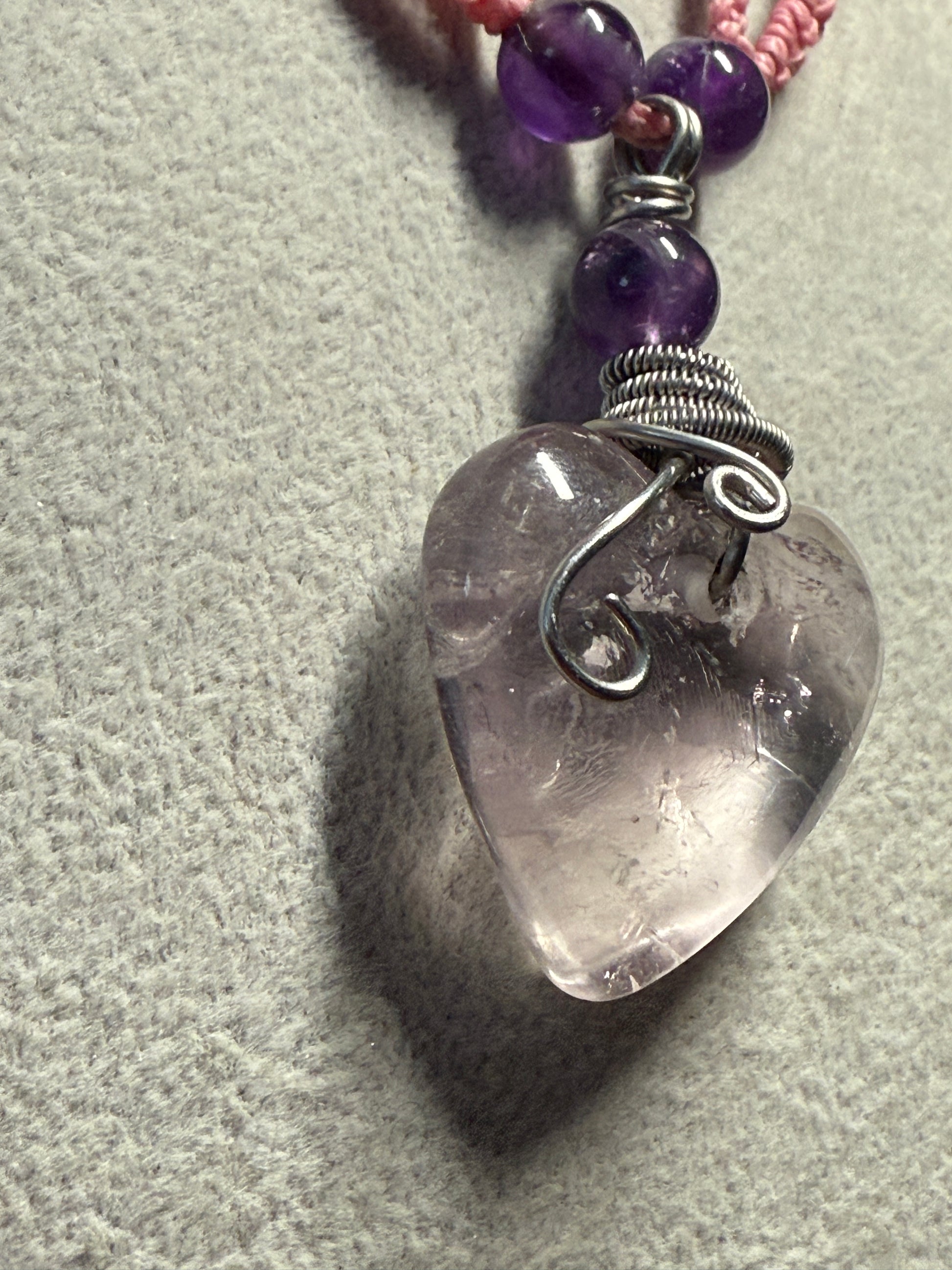 Explore the essence of Aztec culture with this enchanting Heart Necklace, meticulously crafted with rose quartz and quartz beads. The centerpiece, a natural rose quartz pendant, is complemented by a series of delicately woven purple quartz beads, creating a piece that is both elegant and steeped in tradition. With a length of 17 inches, this necklace sits perfectly around the neck, making it an ideal choice for both casual and formal wear. The charm's intricate design and the pendant's heartfelt appeal make it a standout accessory that adds a touch of sophistication to any outfit.