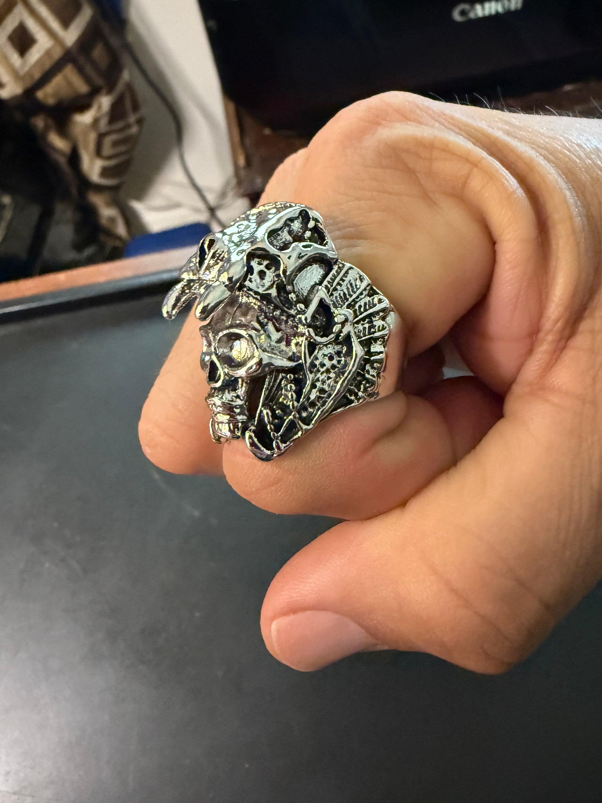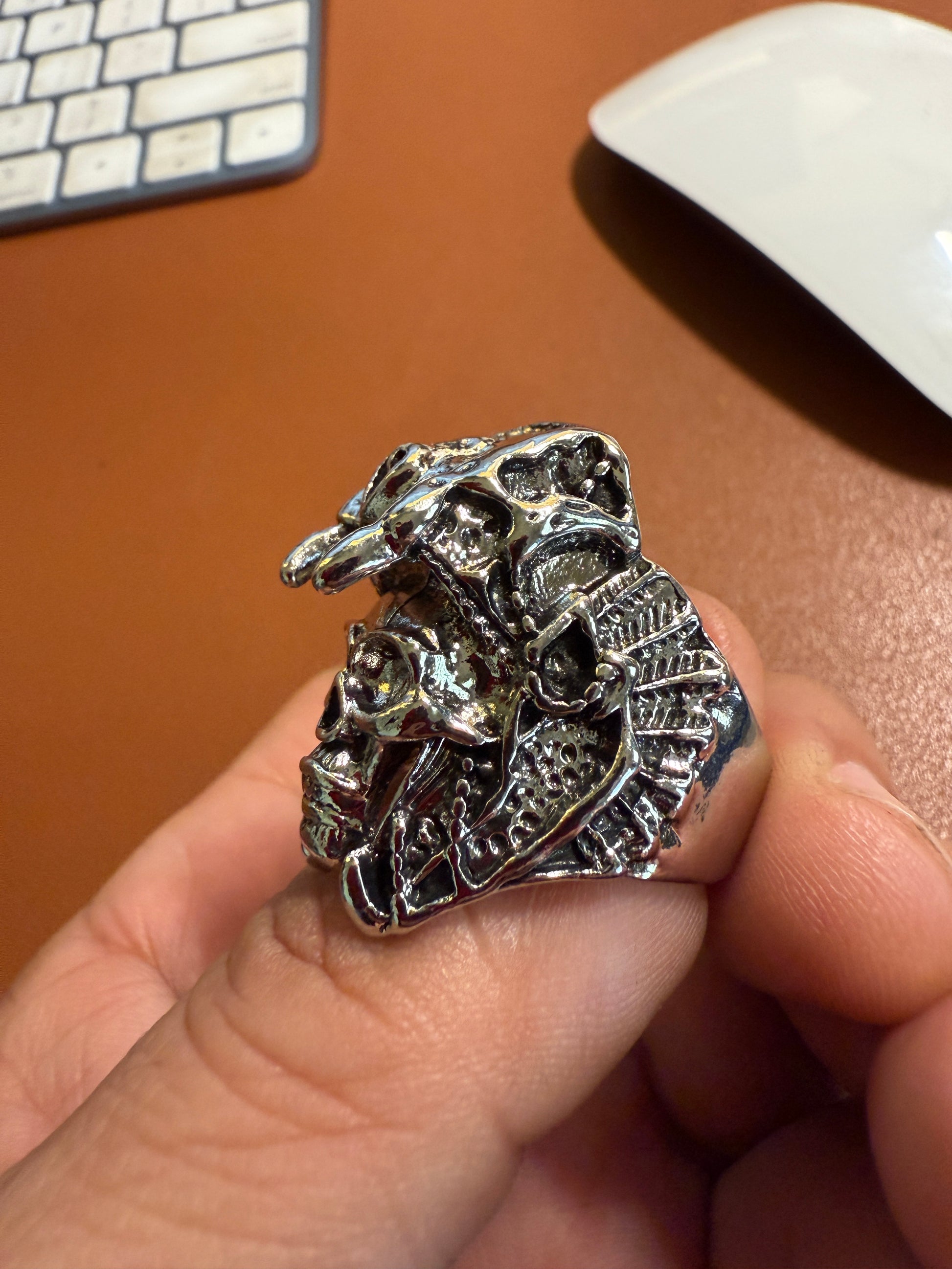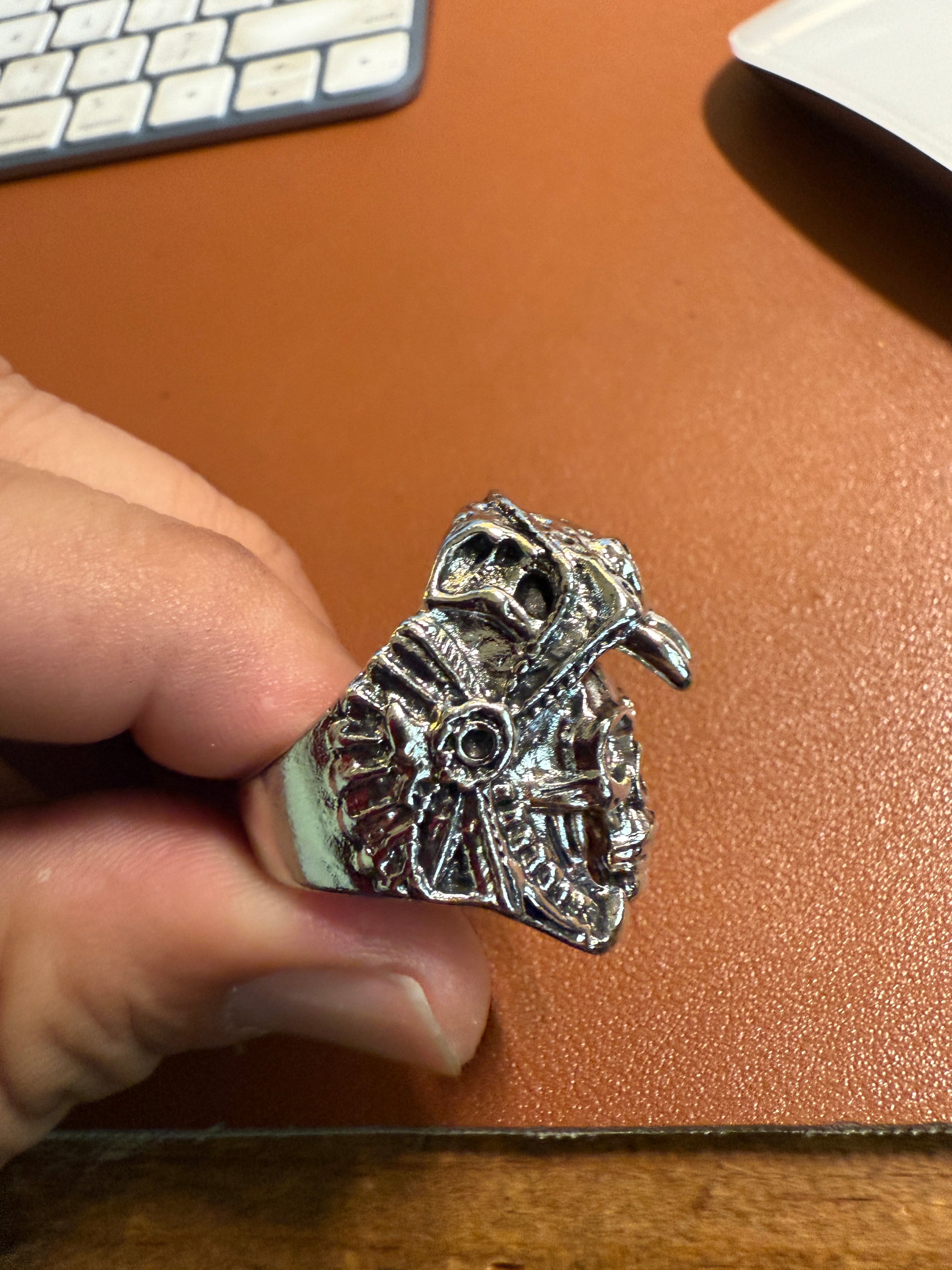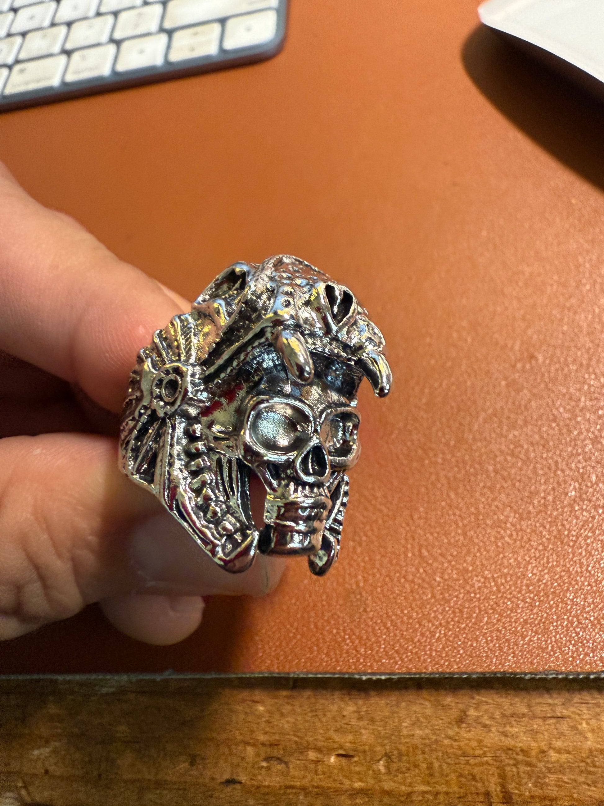 Aztec Jaguar Warrior Skull Ring, Shiny Metal Alloy, Mexica Rings, Indigenous Native American (#9)