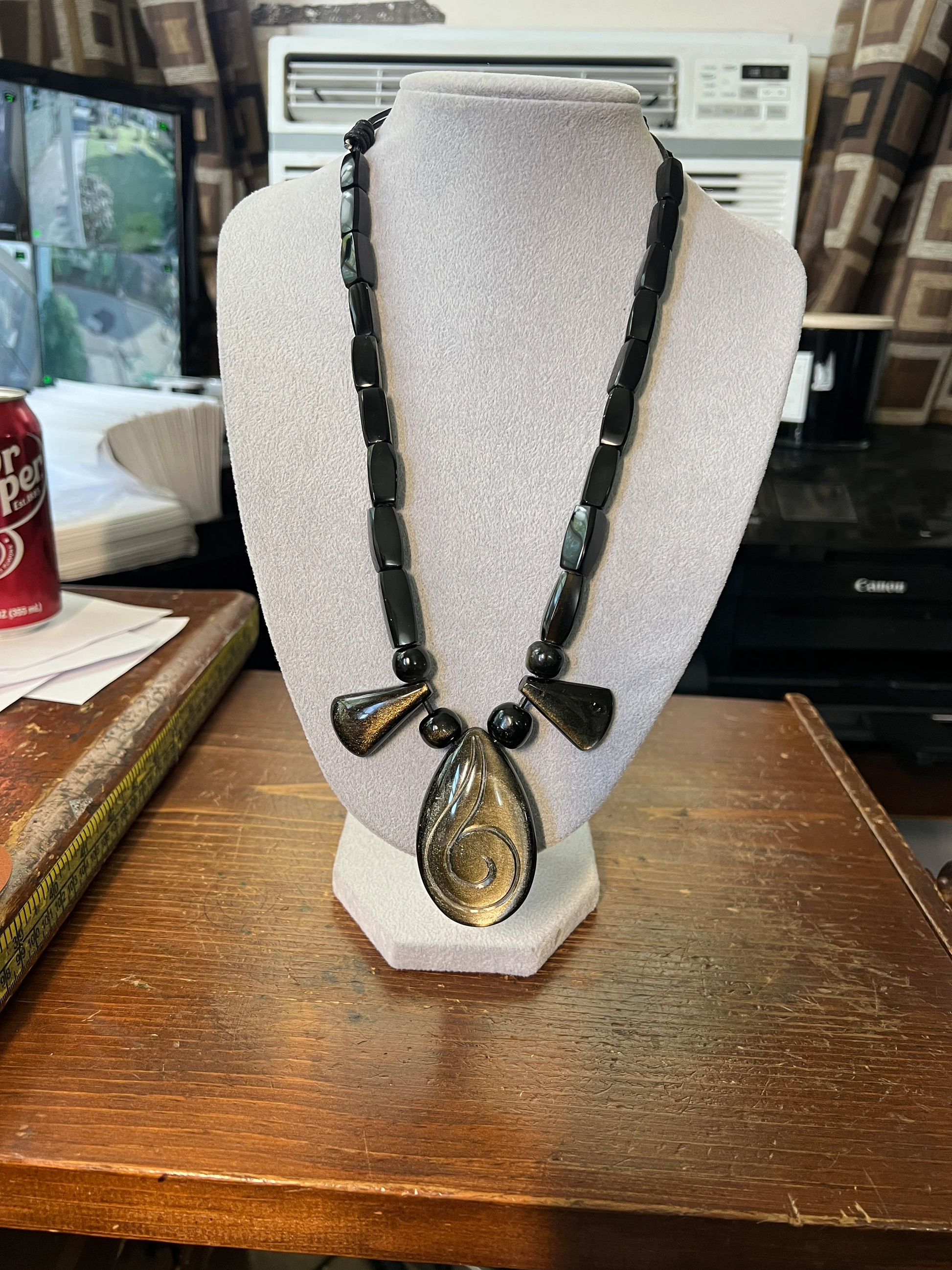 Aztec Nahuatl Speech Symbol Necklace Golden Sheen and Black Obsidian