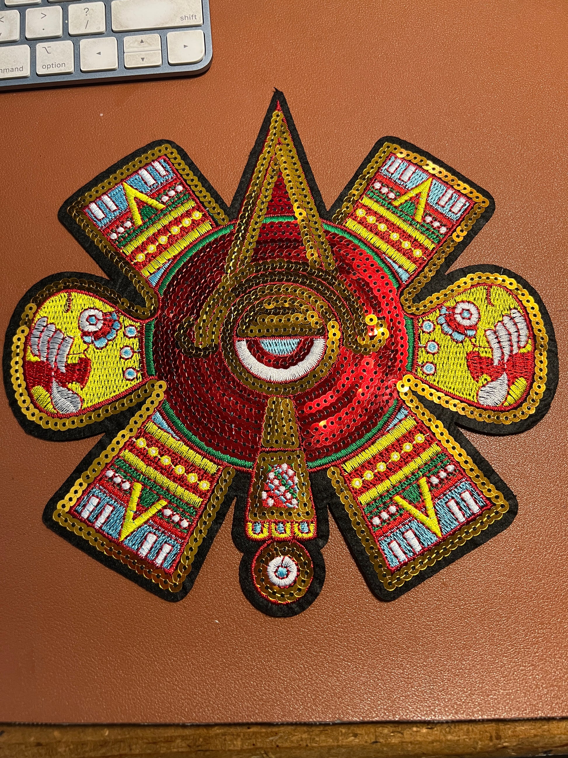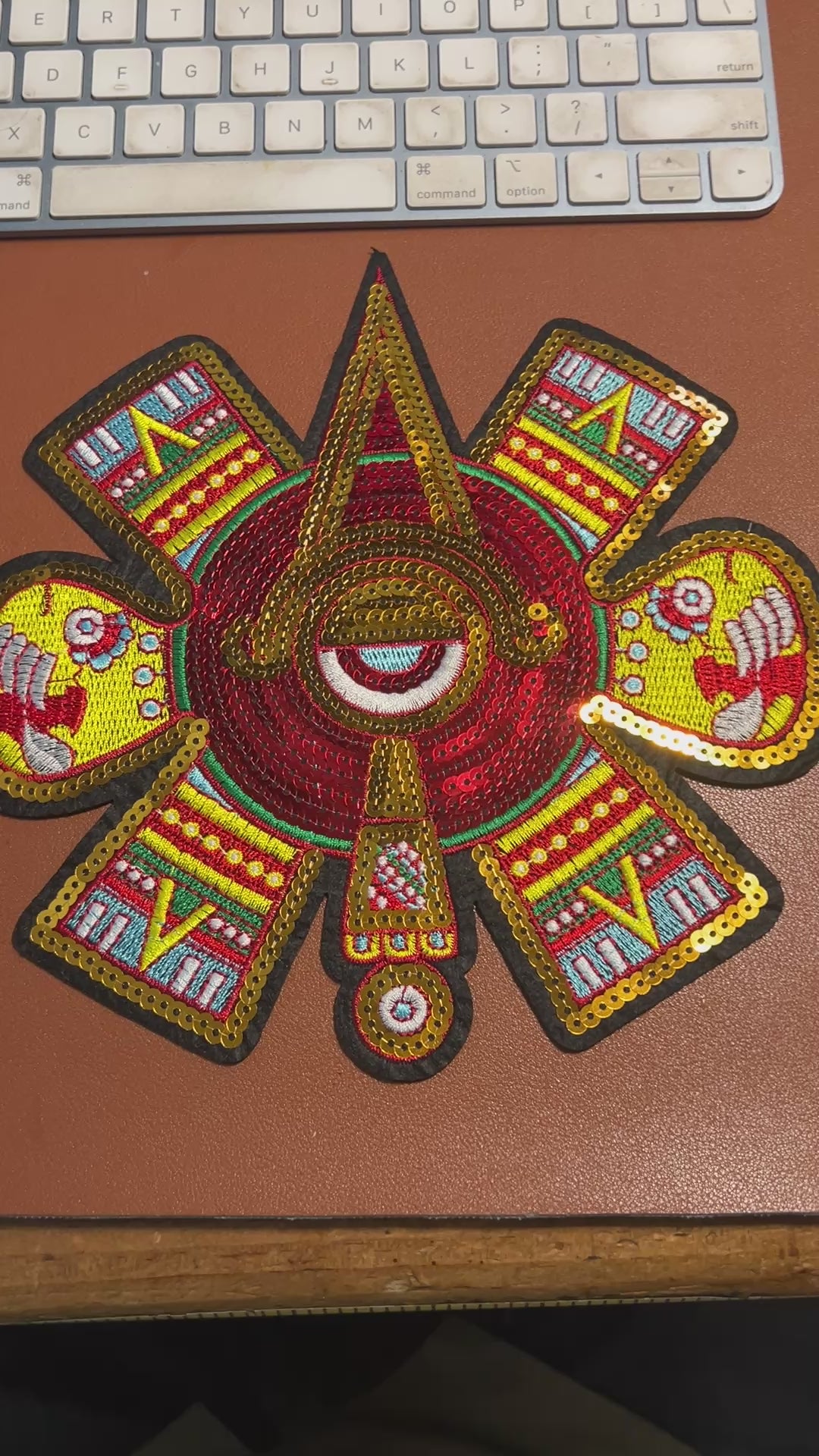 Aztec Nahui Ollin Patch, Azteca Calendario Center, Embroidery Sequins (#31)