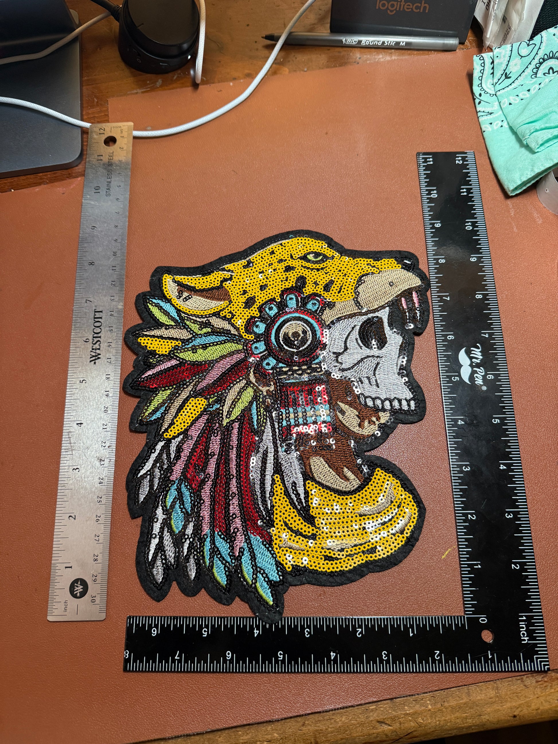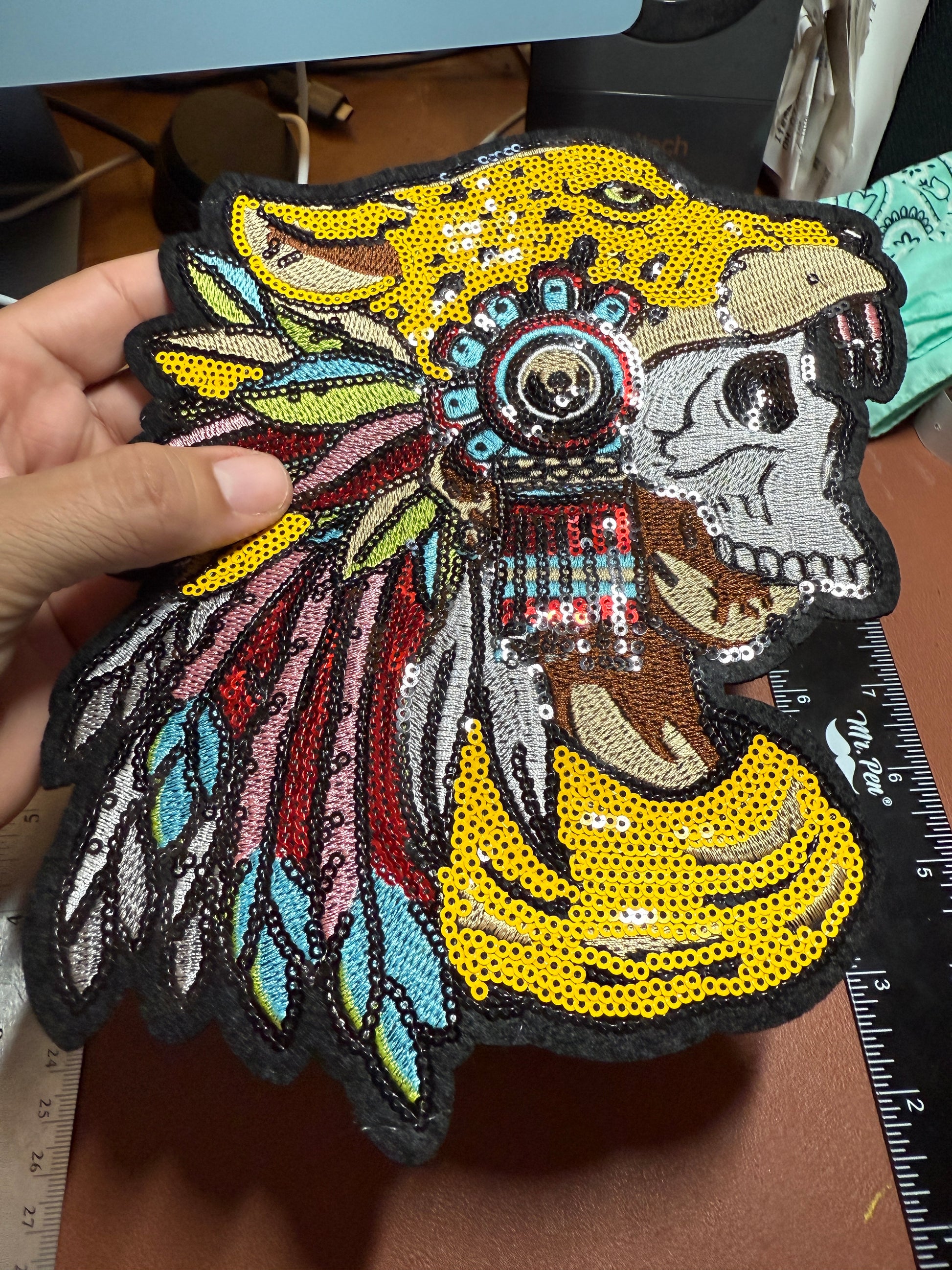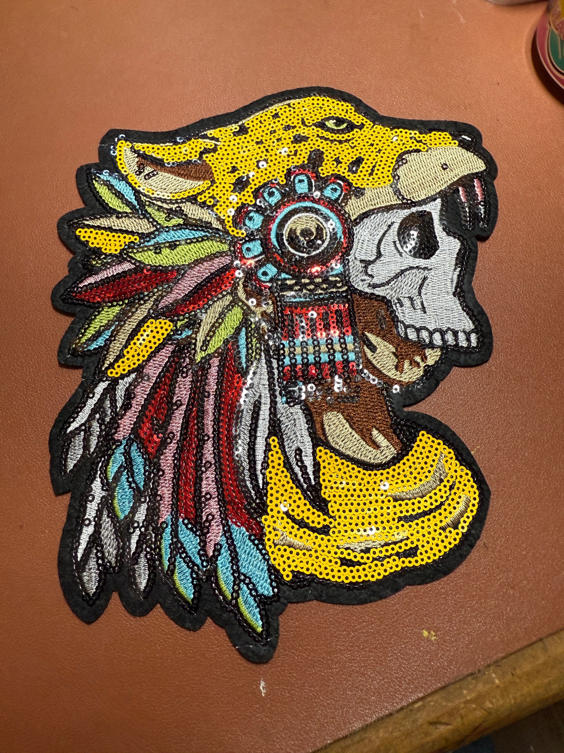 Aztec or Mayan Dead Jaguar Warrior Patch, 9" x 7", patches, Sequins, embroidered (#27)