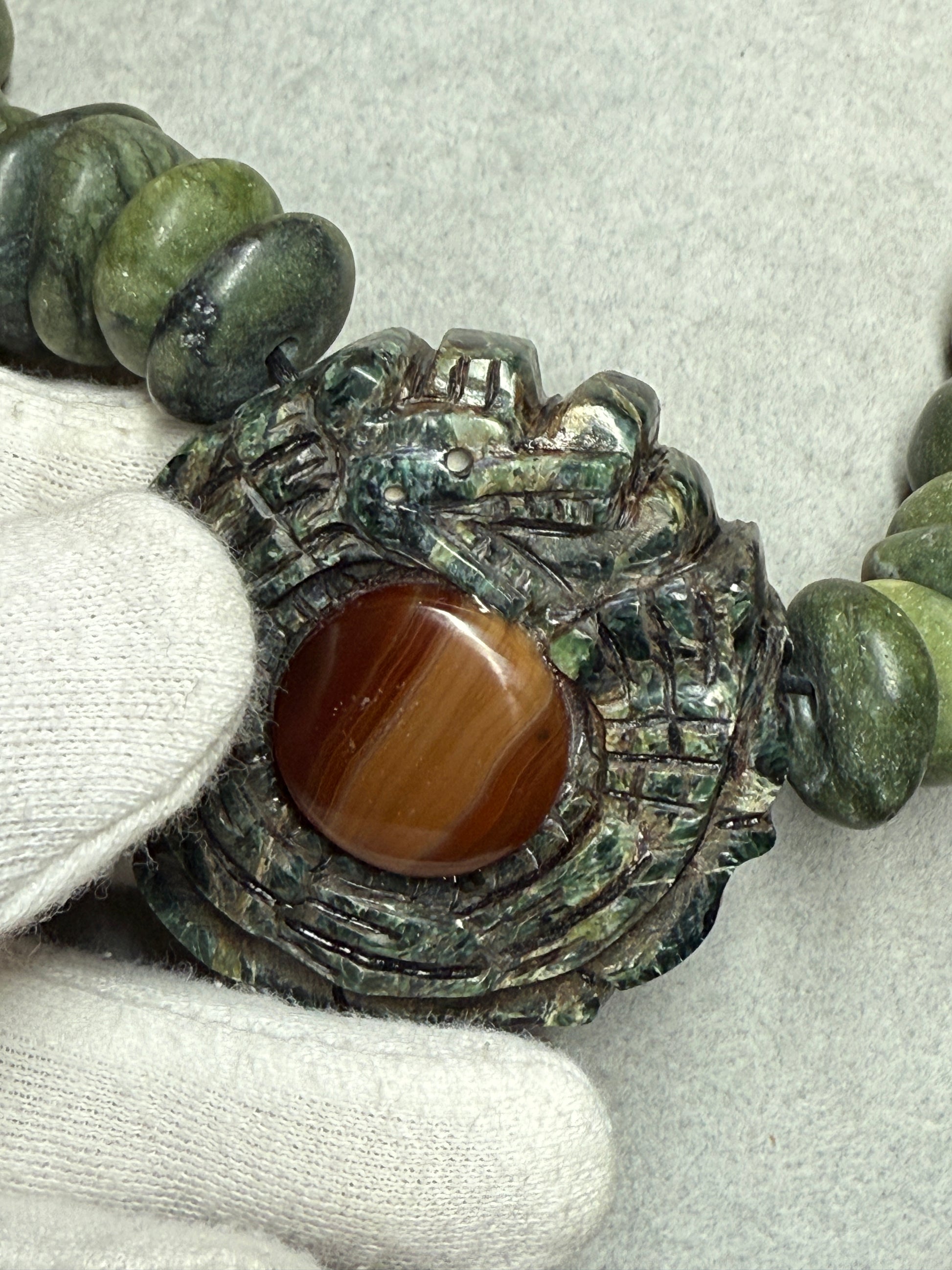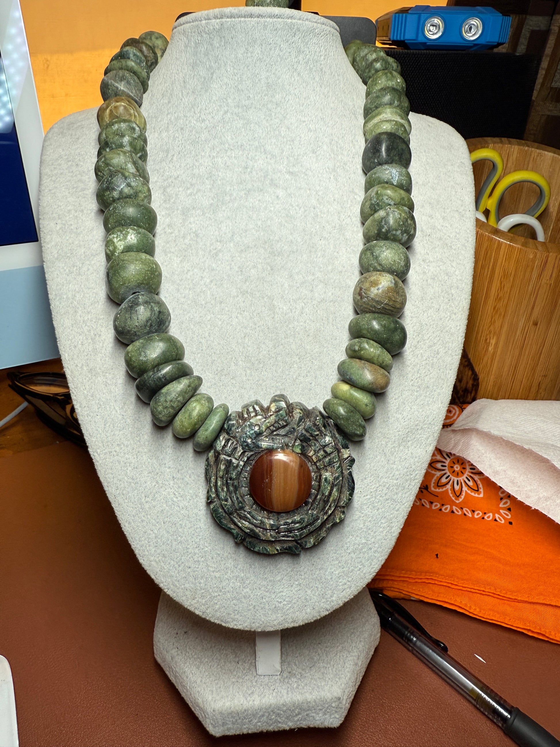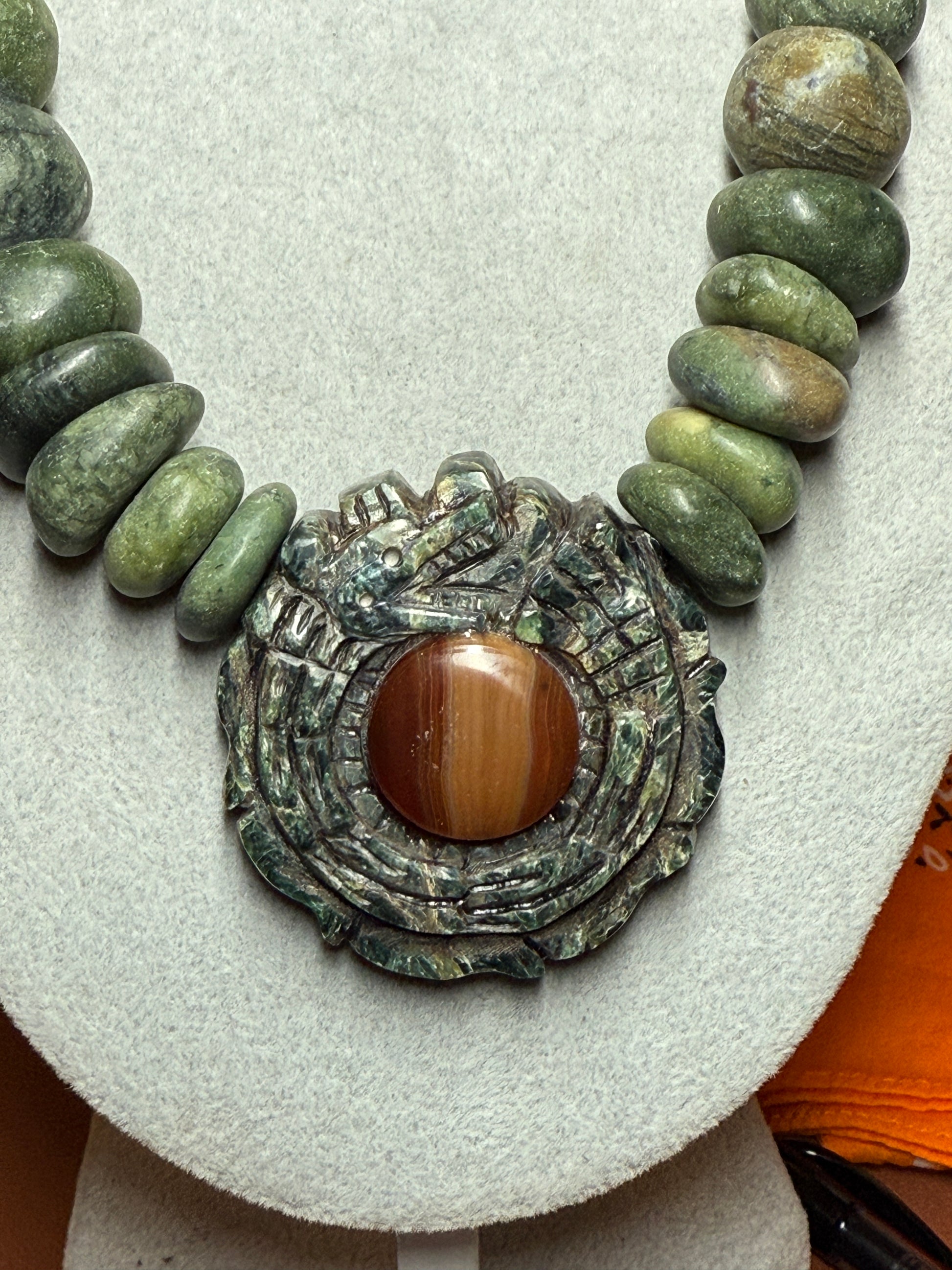 Crafted with meticulous attention to detail, this thick and heavy beaded necklace embodies the mythic Quetzalcoatl, the feathered serpent deity revered in Mexica and Azteca culture. The piece features a striking dragon-shaped main stone, precision-carved from resilient serpentine jade, capturing the essence of the plumed serpent's legend. Accented by bead stones of Guatemalan marble, the necklace offers a unique blend of natural elegance and historical significance. Also known as Kukulkan, Mayan plumed serpent.