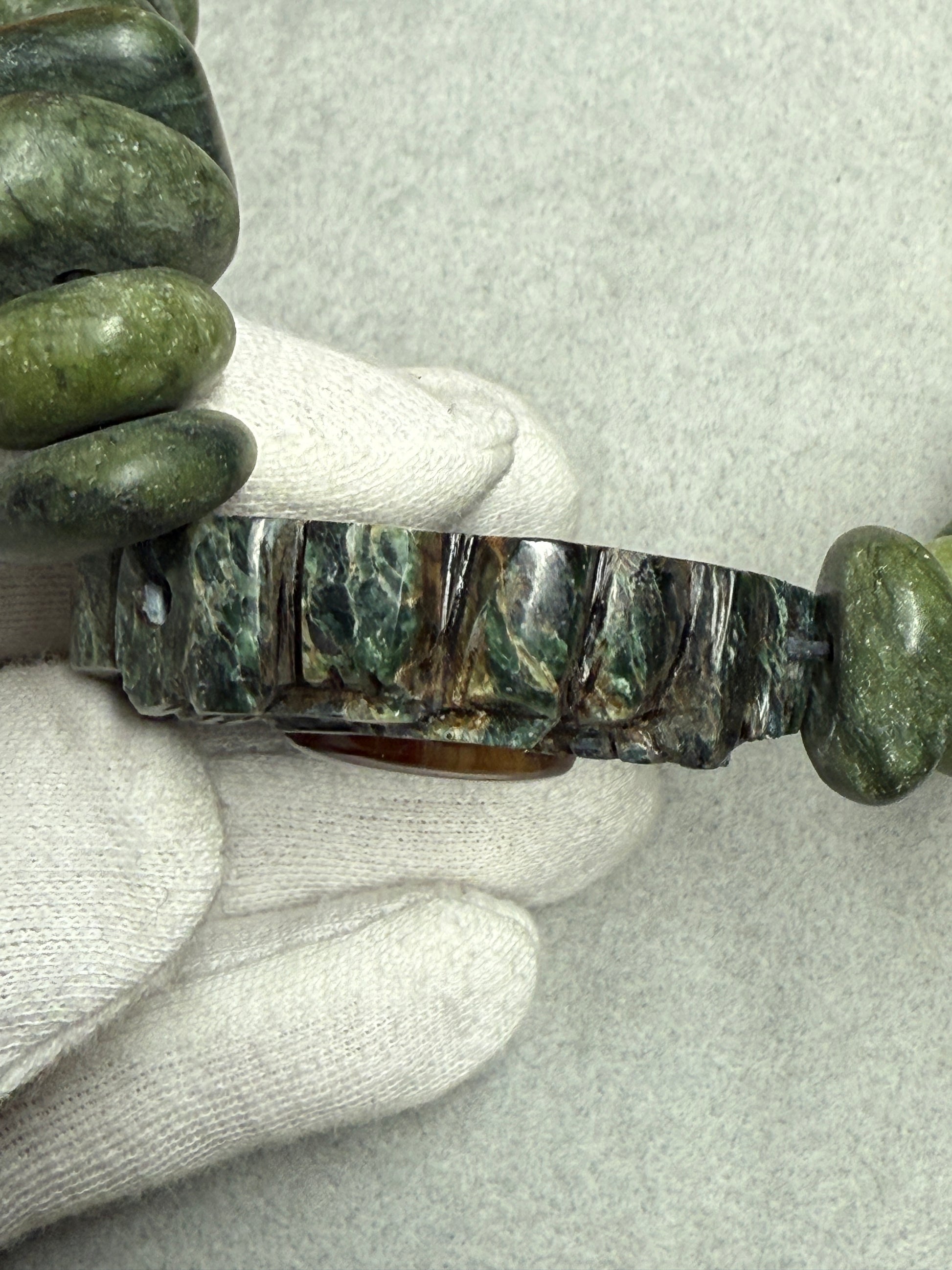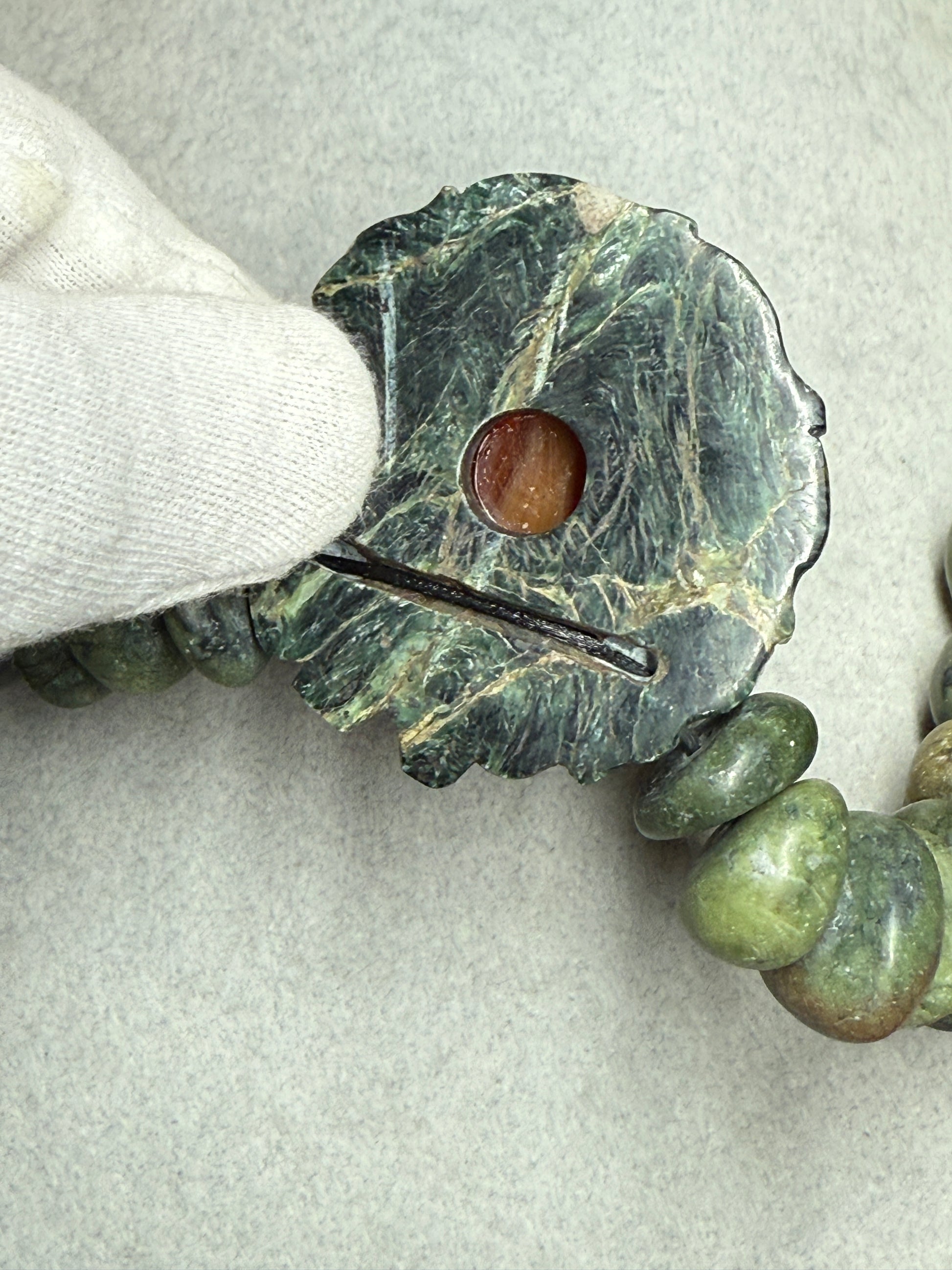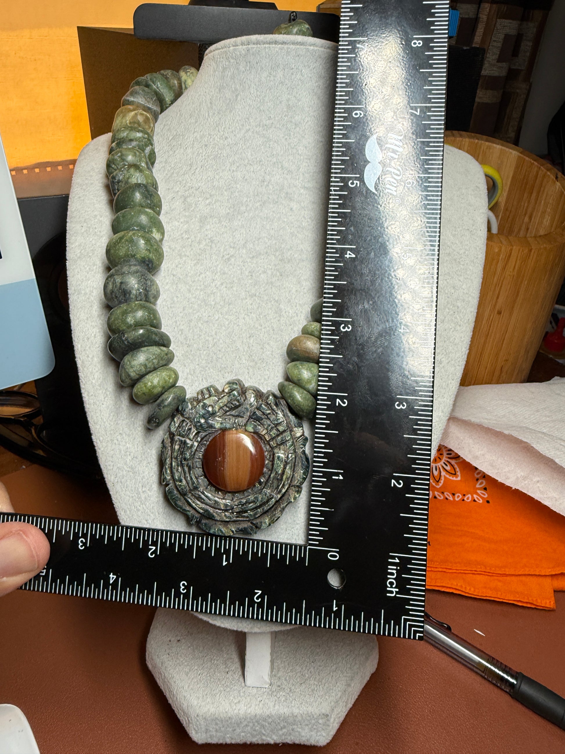 Crafted with meticulous attention to detail, this thick and heavy beaded necklace embodies the mythic Quetzalcoatl, the feathered serpent deity revered in Mexica and Azteca culture. The piece features a striking dragon-shaped main stone, precision-carved from resilient serpentine jade, capturing the essence of the plumed serpent's legend. Accented by bead stones of Guatemalan marble, the necklace offers a unique blend of natural elegance and historical significance. Also known as Kukulkan, Mayan plumed serpent.