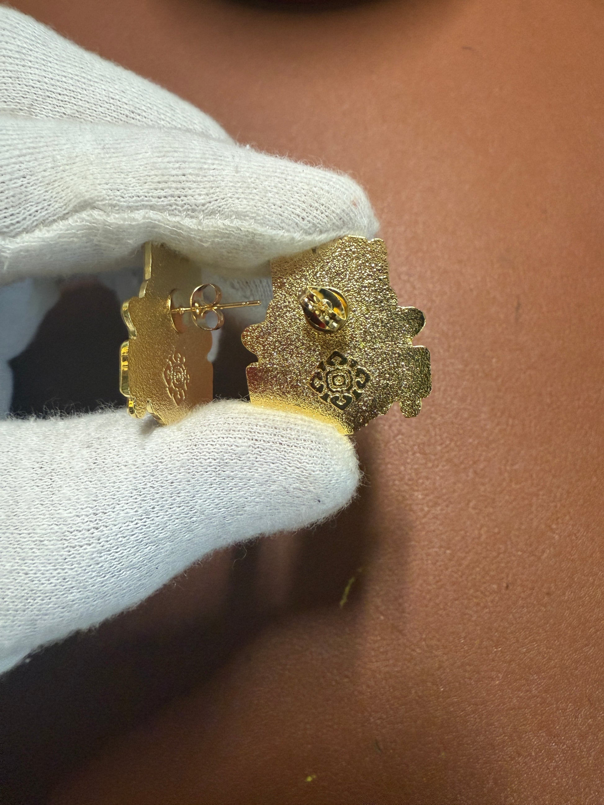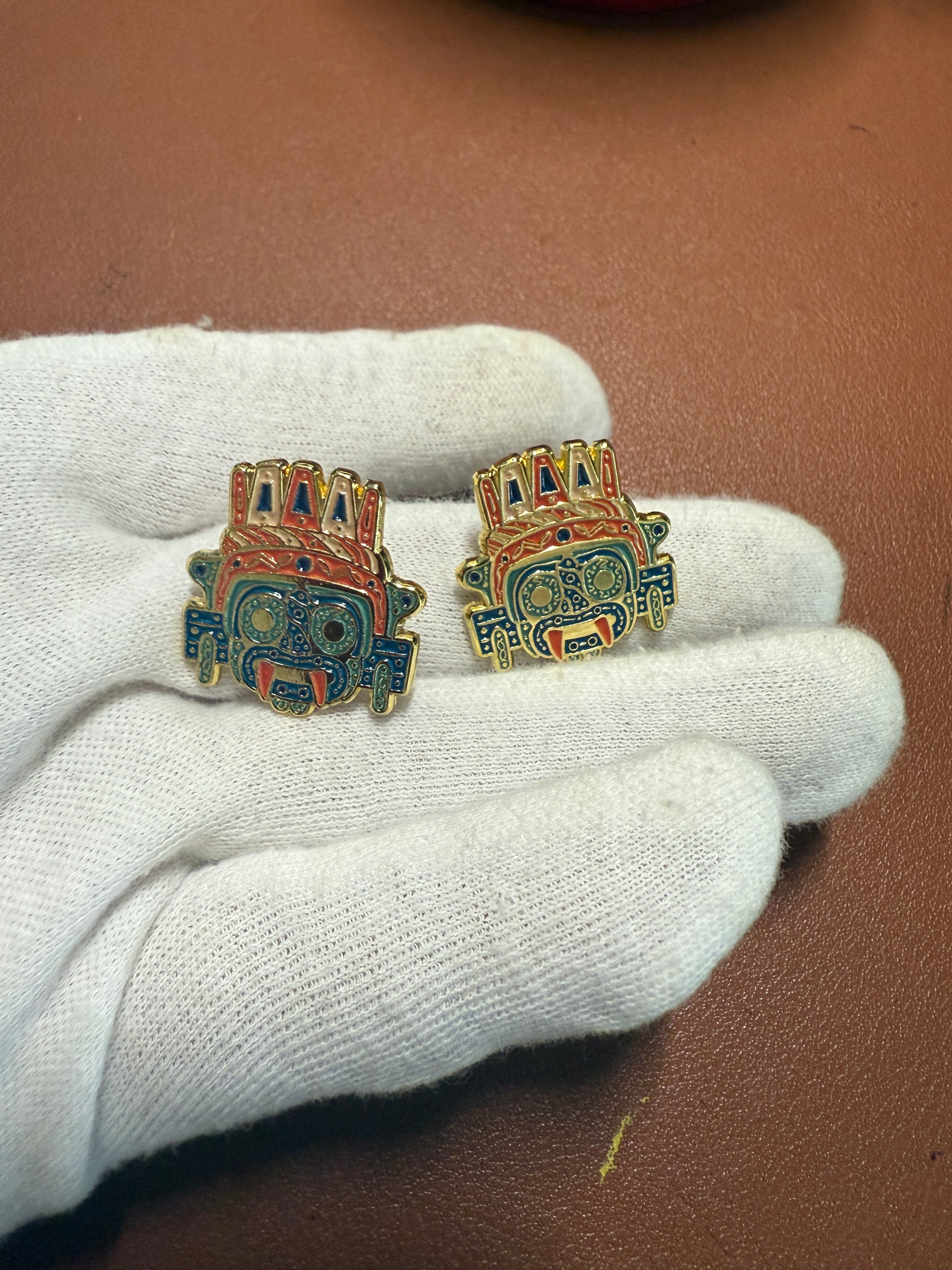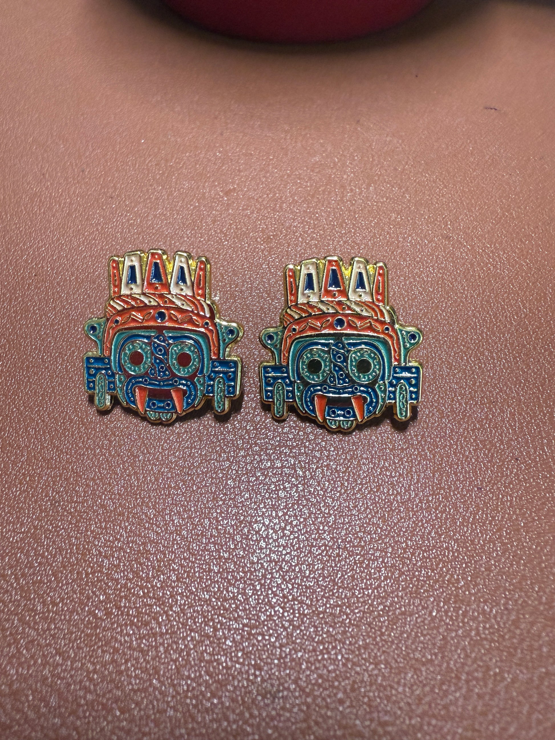 Aztec Tlaloc Earrings Rain God Ancient Mexico, gold tone alloy, post back