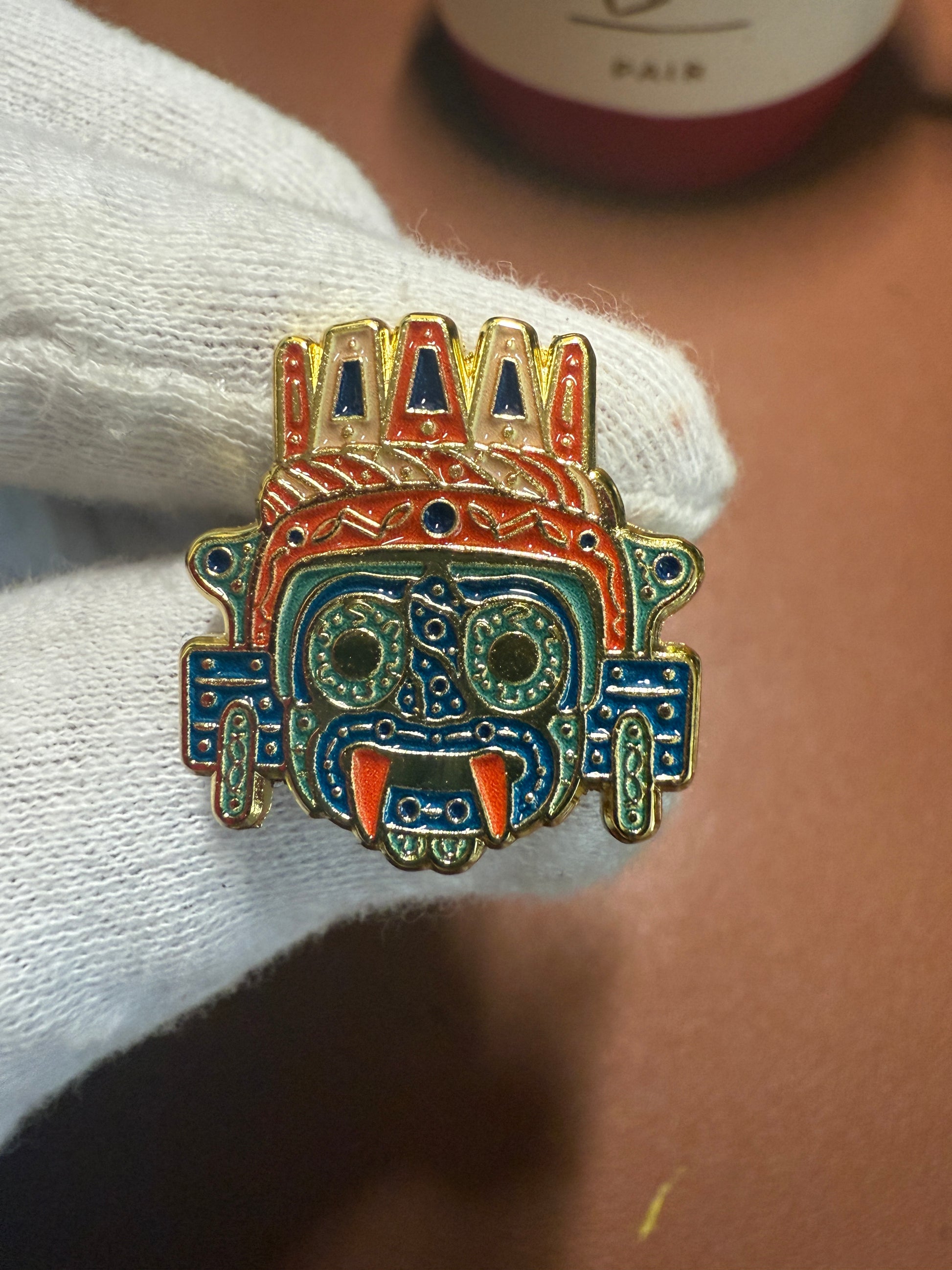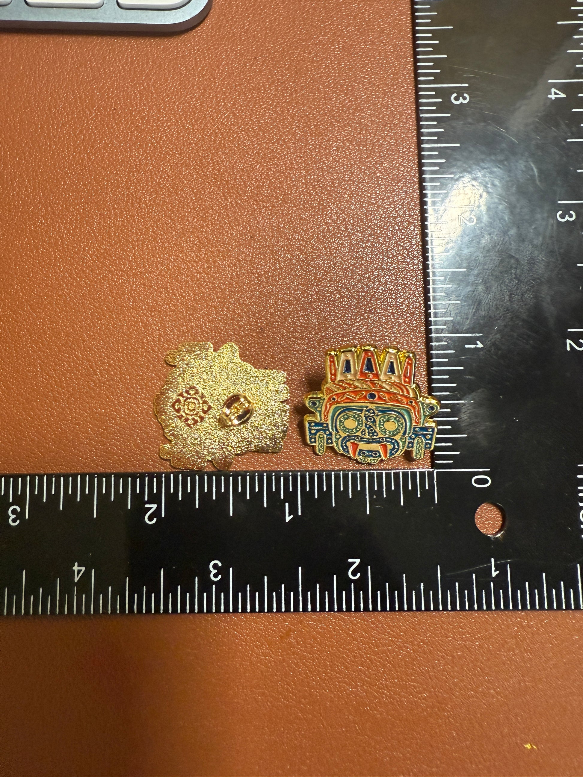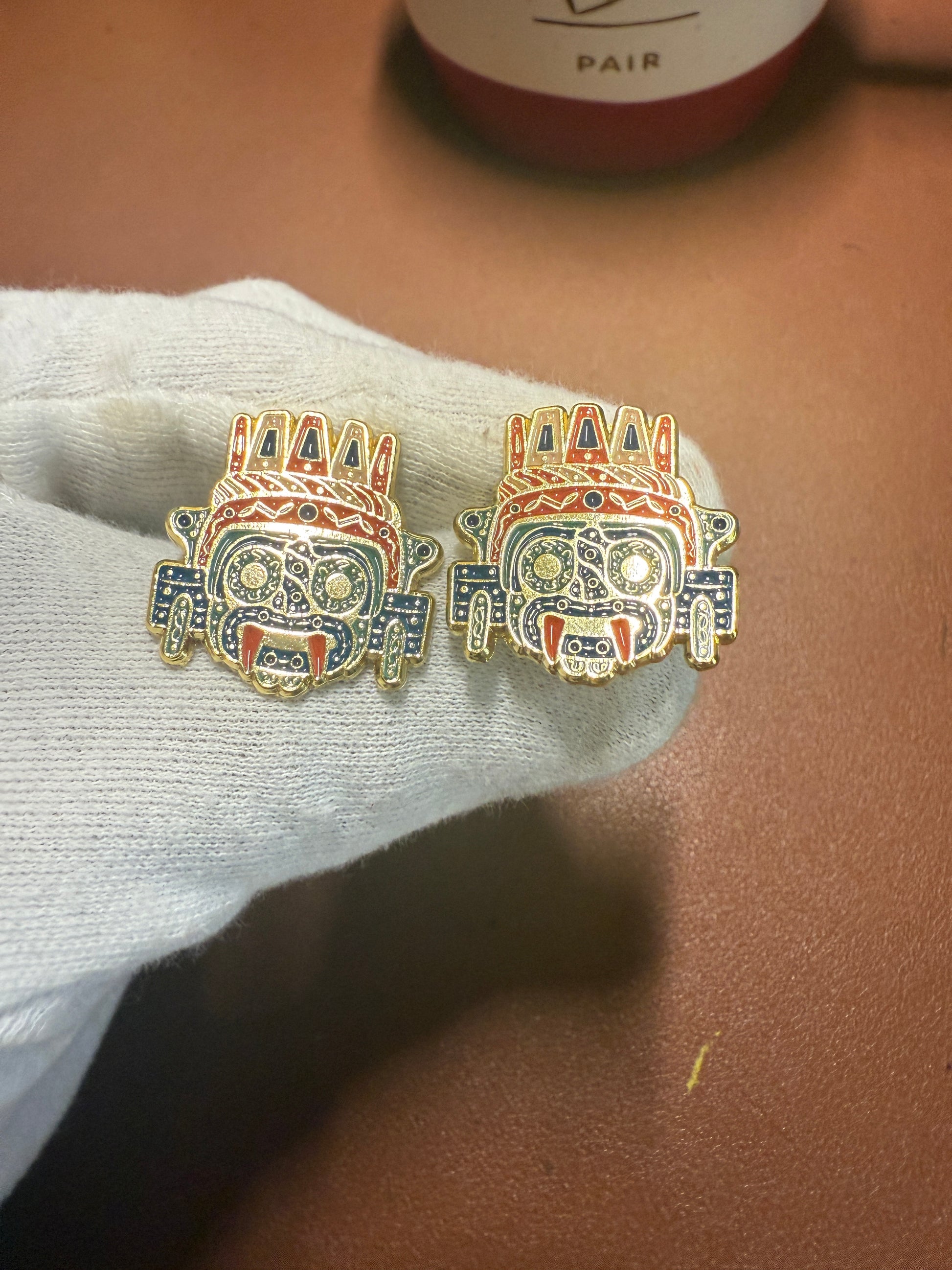 Aztec Tlaloc Earrings Rain God Ancient Mexico, gold tone alloy, post back