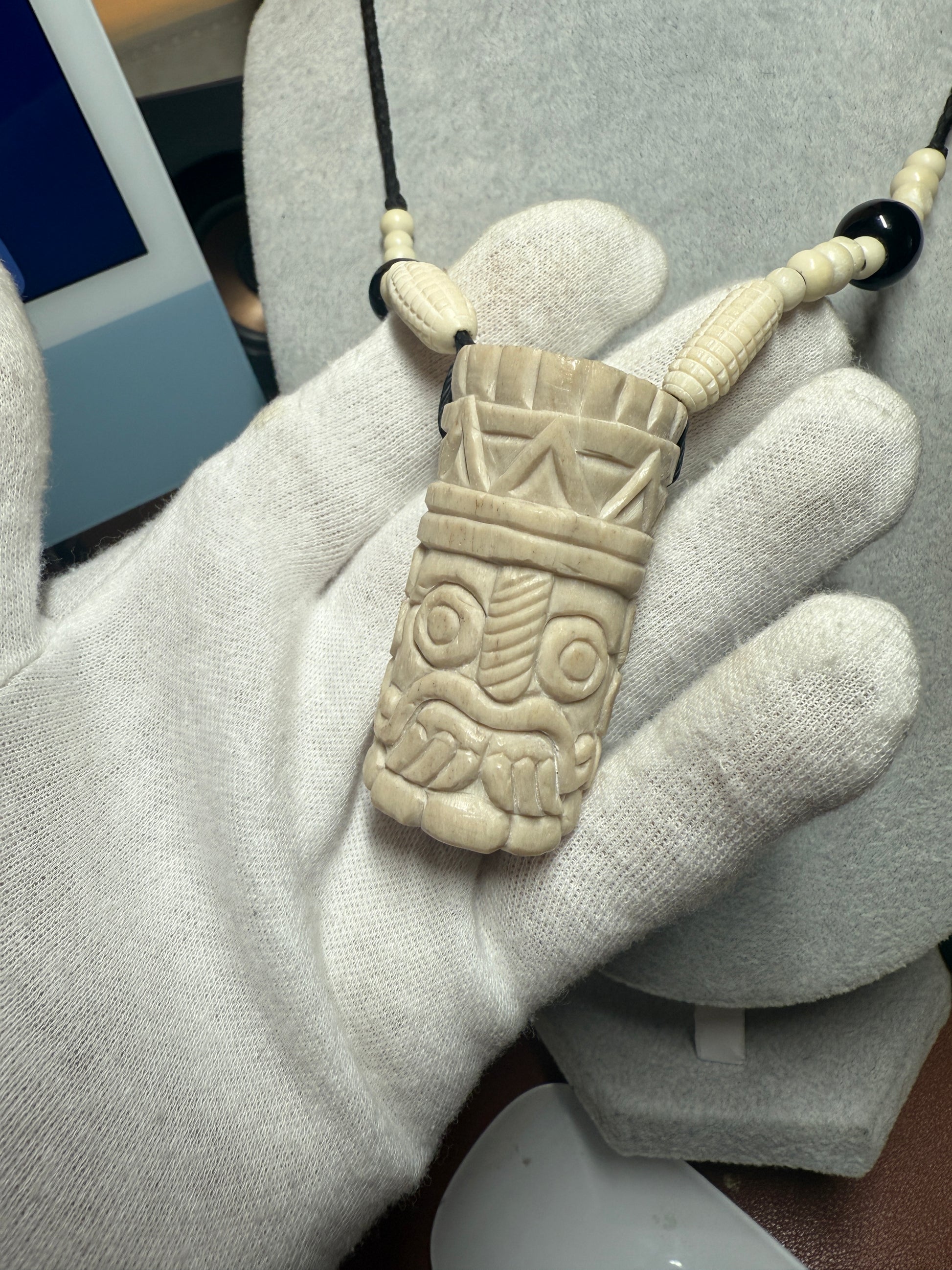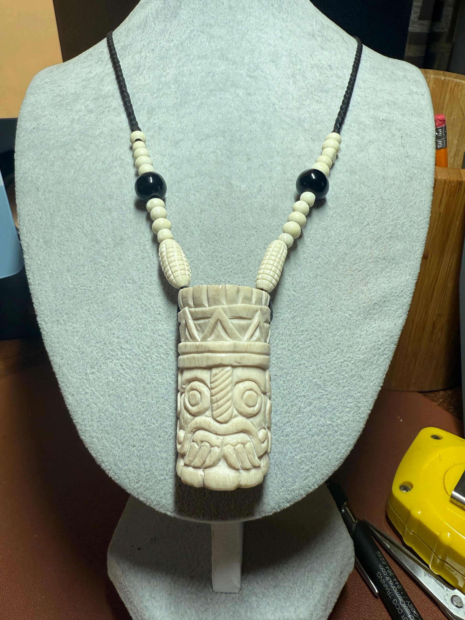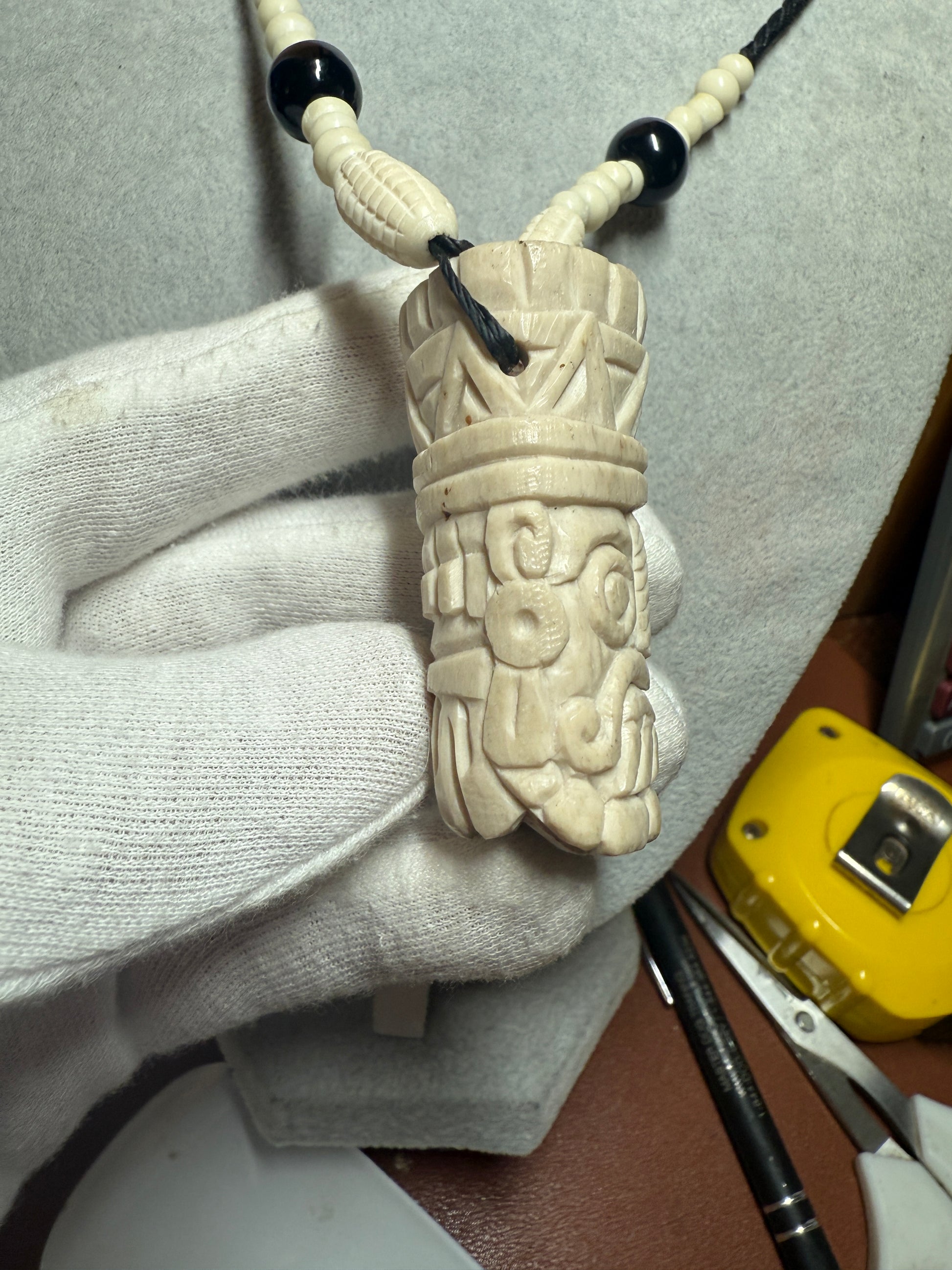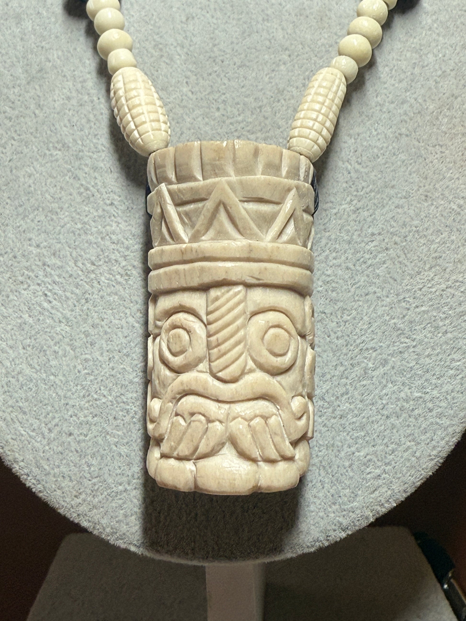 This Aztec Tlaloc pendant is a unique piece of jewelry, handcrafted from bone in Mexico. The pendant features a carving of Tlaloc, the Rain God, which adds a spiritual and ethnic touch to its design. Made with attention to detail, this piece showcases traditional Mexican craftsmanship and cultural significance, making it a standout accessory for anyone looking to add a touch of authenticity to their outfit. Has bone beads and bone corn beads with an adjustable rope.