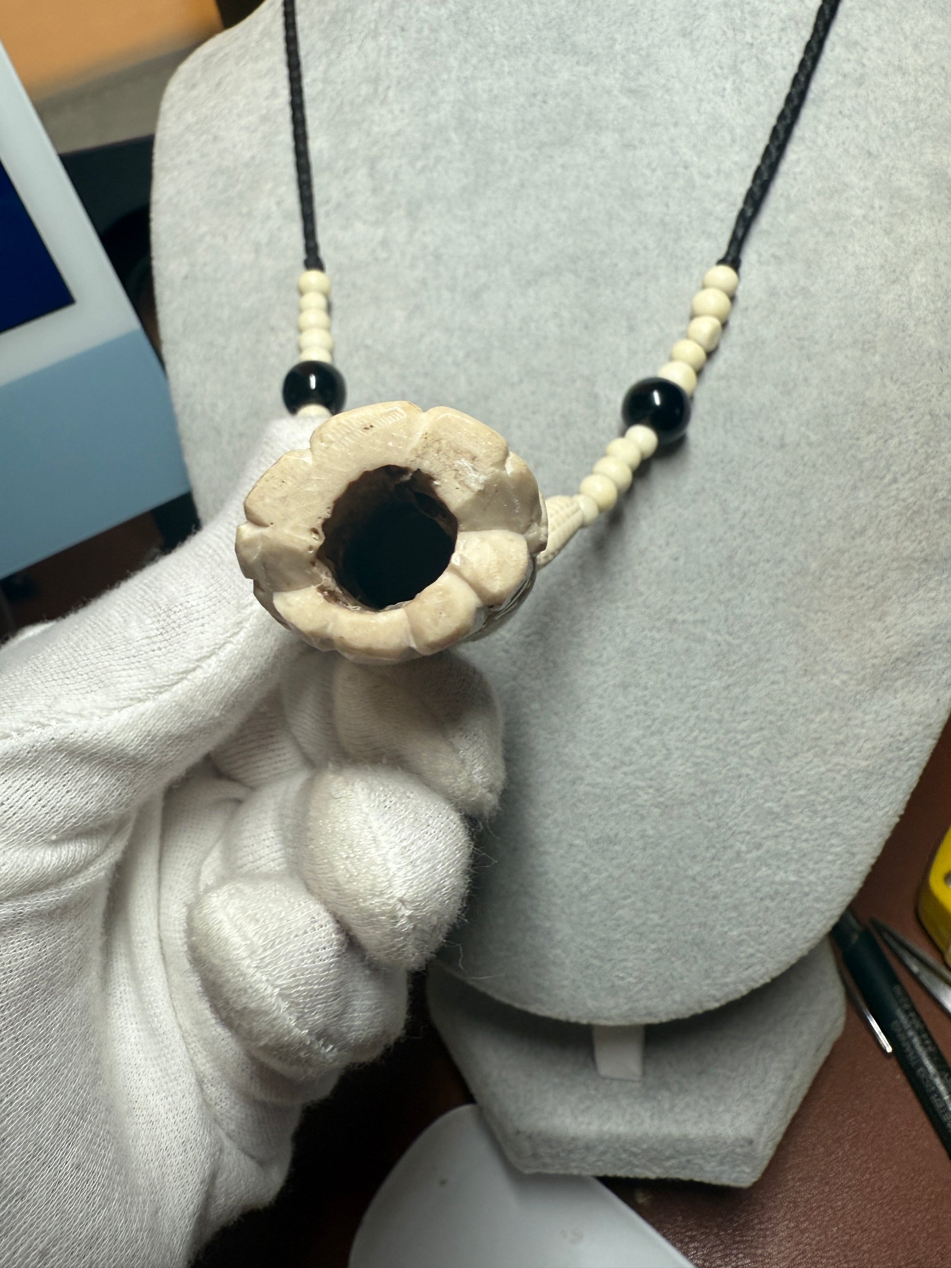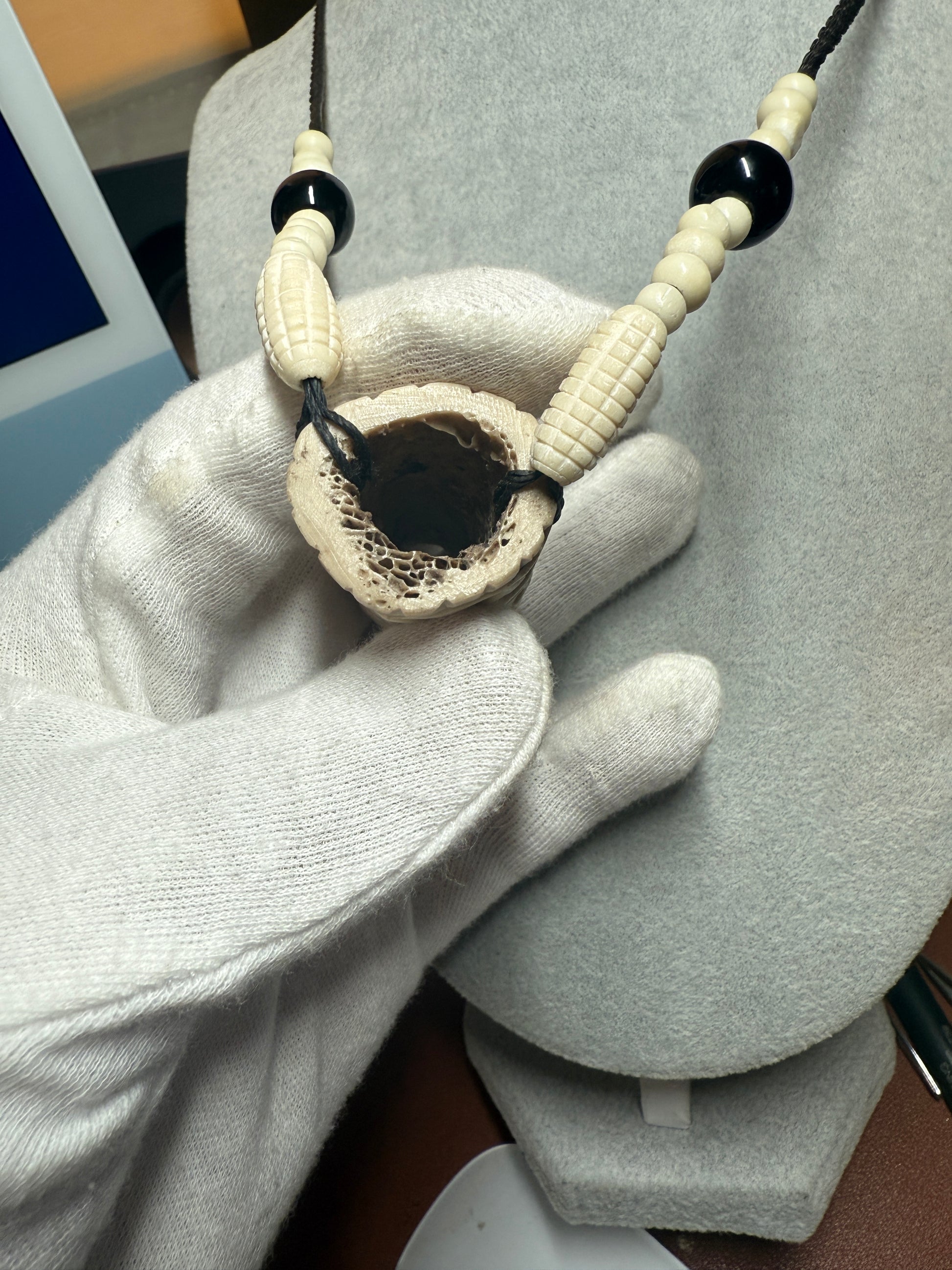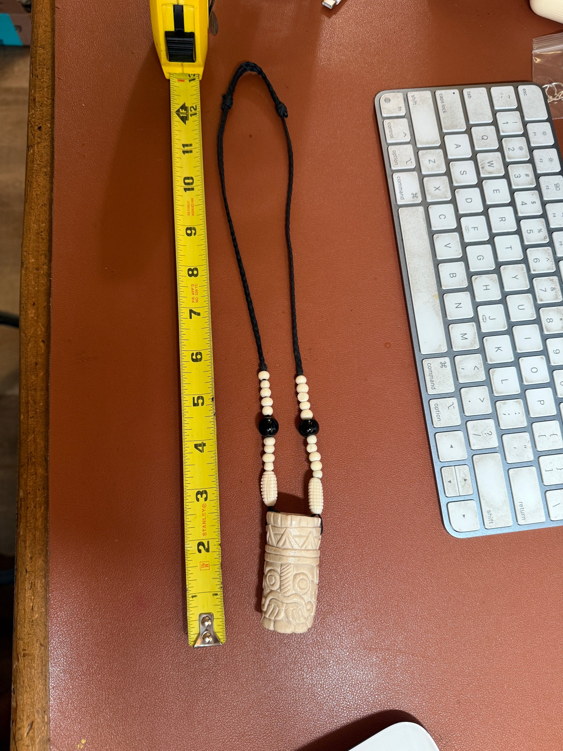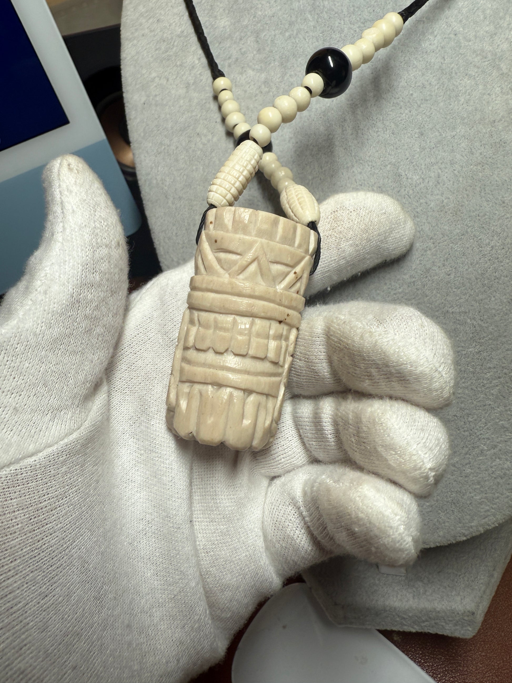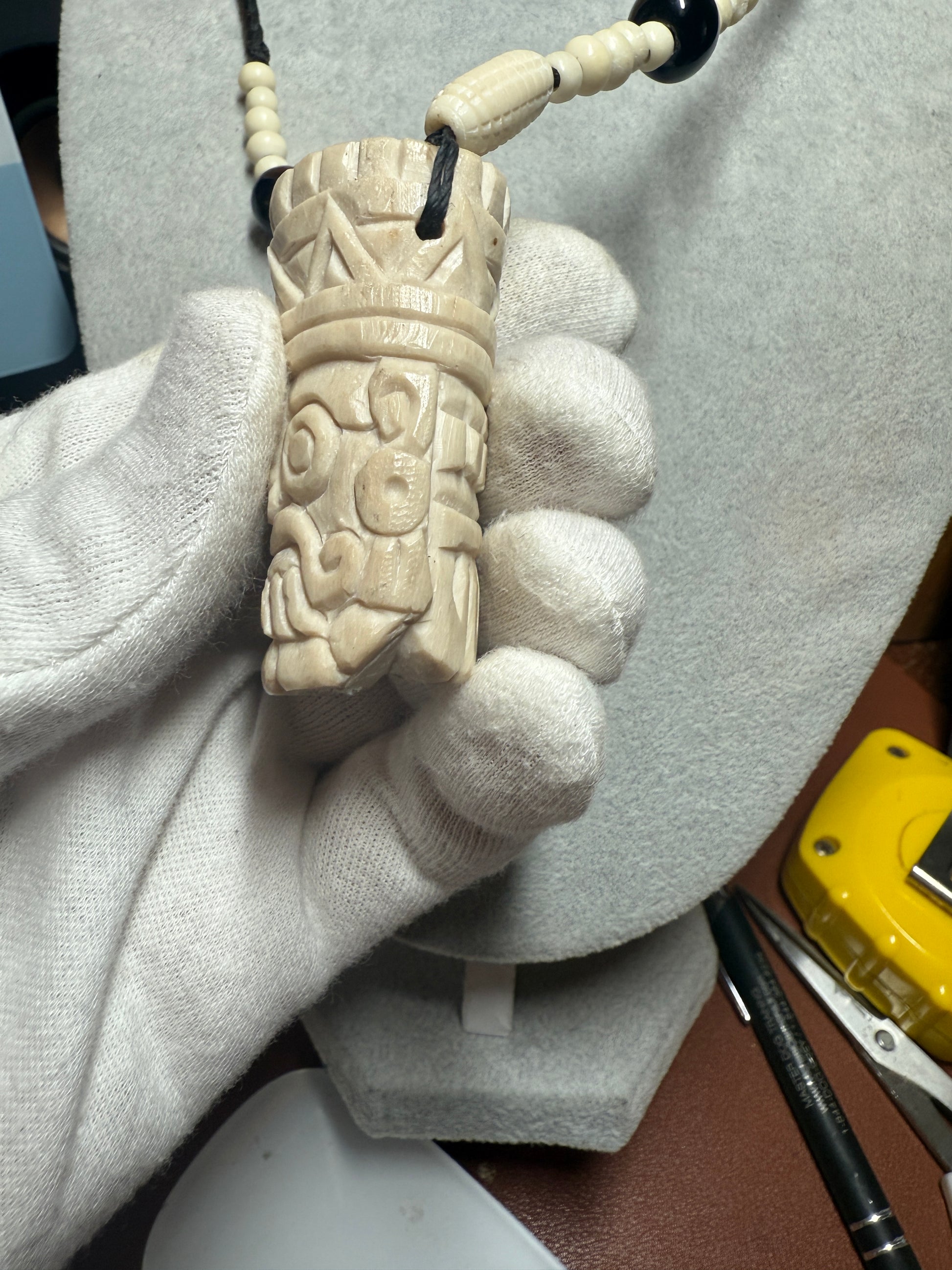 This Aztec Tlaloc pendant is a unique piece of jewelry, handcrafted from bone in Mexico. The pendant features a carving of Tlaloc, the Rain God, which adds a spiritual and ethnic touch to its design. Made with attention to detail, this piece showcases traditional Mexican craftsmanship and cultural significance, making it a standout accessory for anyone looking to add a touch of authenticity to their outfit. Has bone beads and bone corn beads with an adjustable rope.