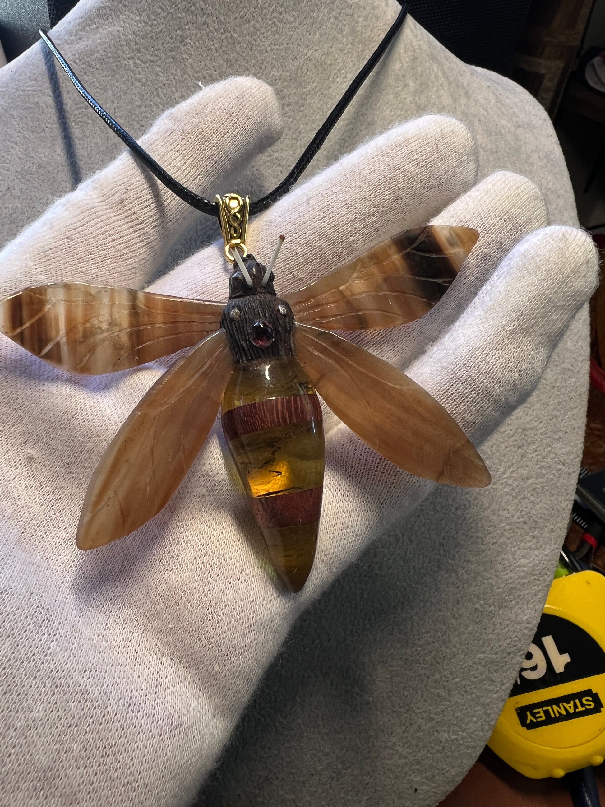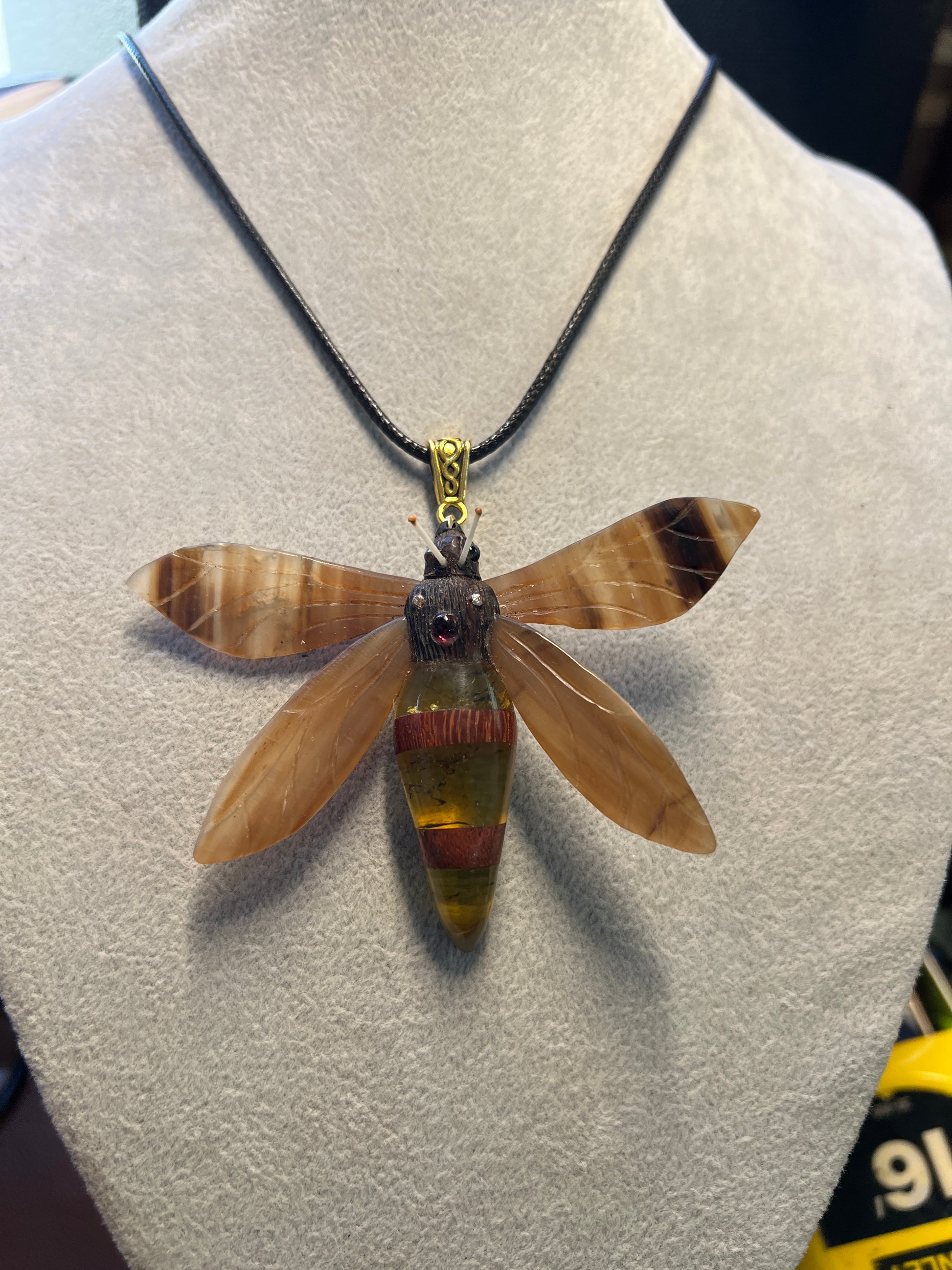 Discover an intriguing piece of jewelry with this handmade Bee Pendant, featuring a Bull Horn folding wings, and Amber and Ebony body, Ironwood, tourmaline and agate. The intricate work on this piece is remarkable, meticulously crafted showcasing a dedication to artisanship. Its distinct design is complemented by the natural beauty of amber, lending a unique appeal that's both rustic and refined. Originating from Mexico, this pendant embodies a blend of cultural artistry and contemporary style. Whether you're accessorizing for a casual event or adding a touch of sophistication to your evening attire, this piece is sure to make a statement.