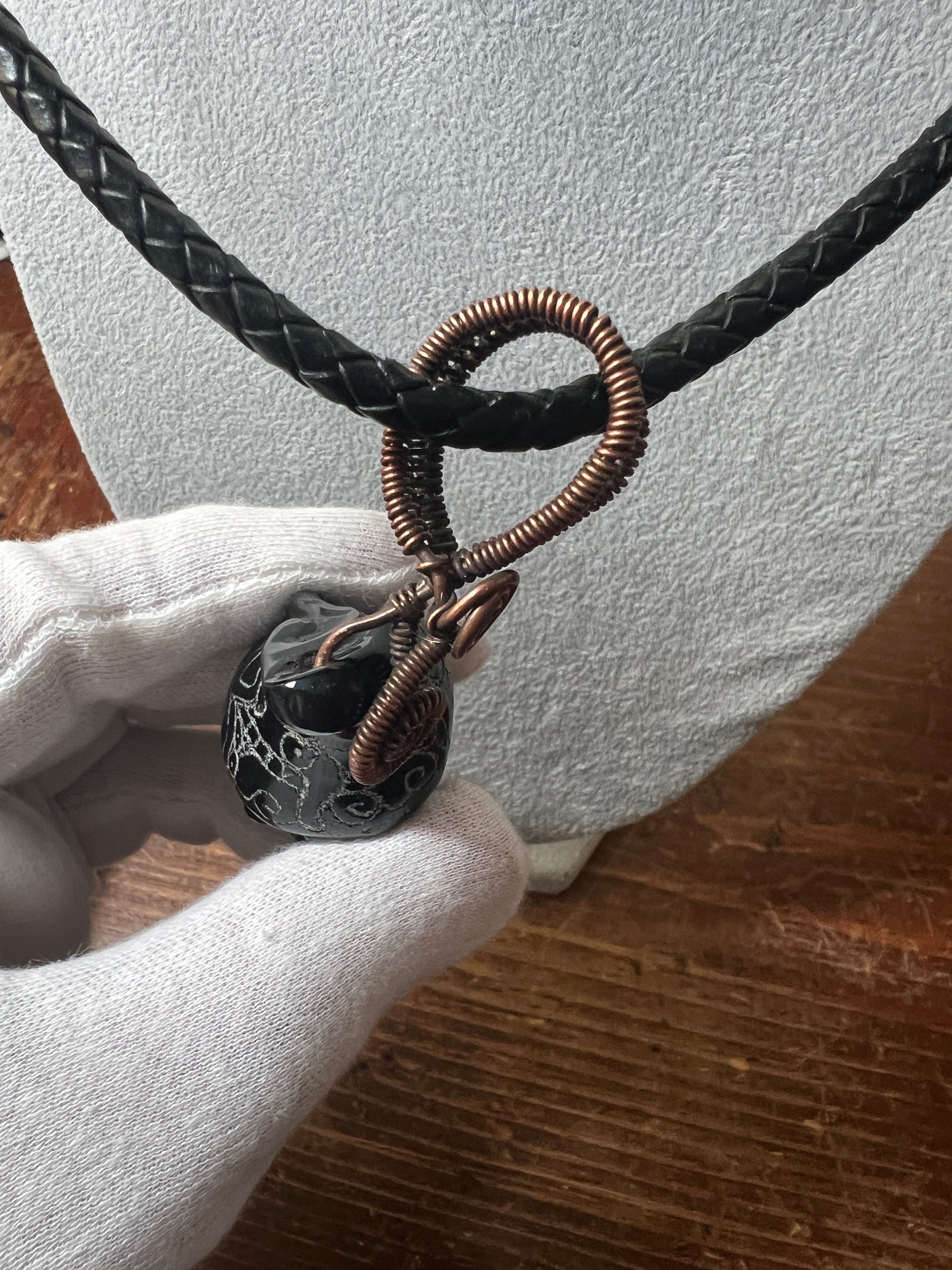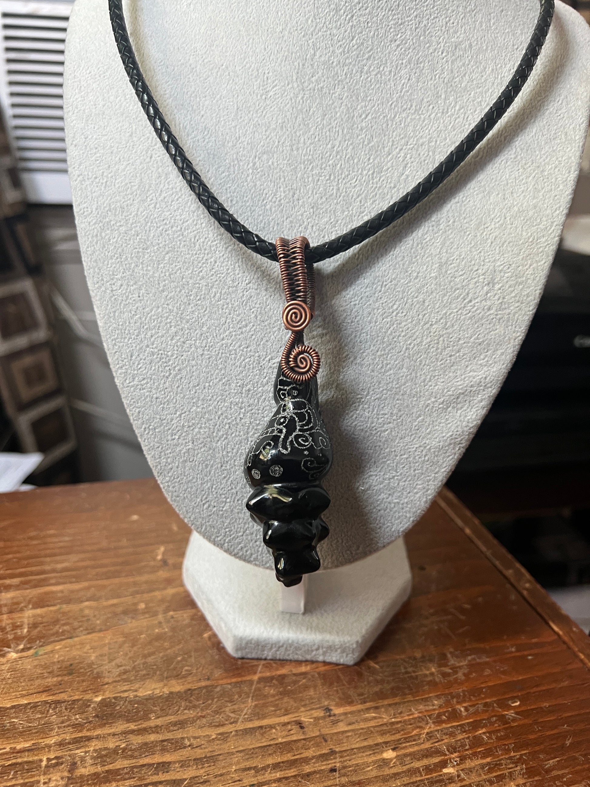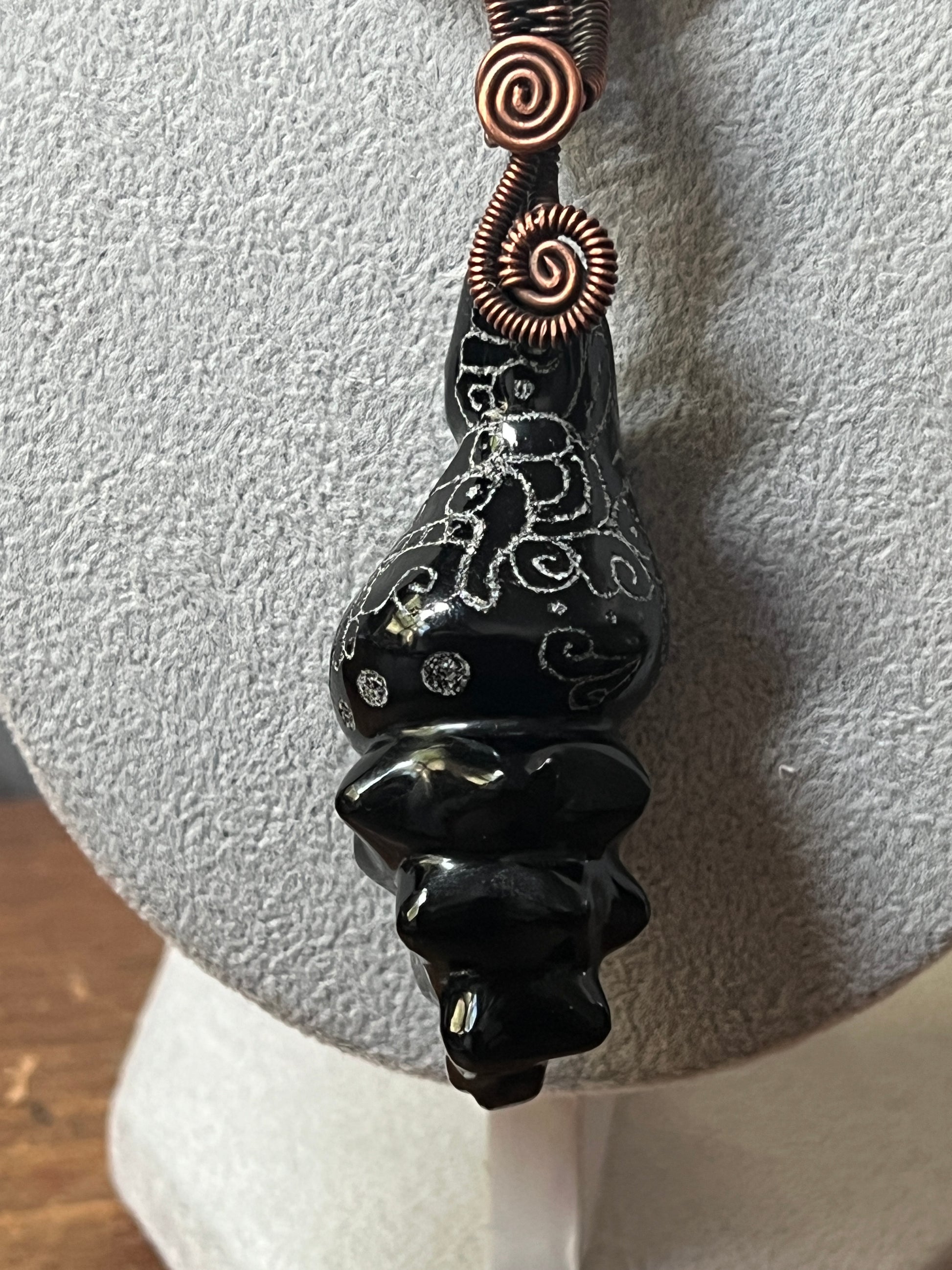Black Obsidian Carved Conch Sea Shell Necklace, Kukulkan Mayan Necklace 22"
