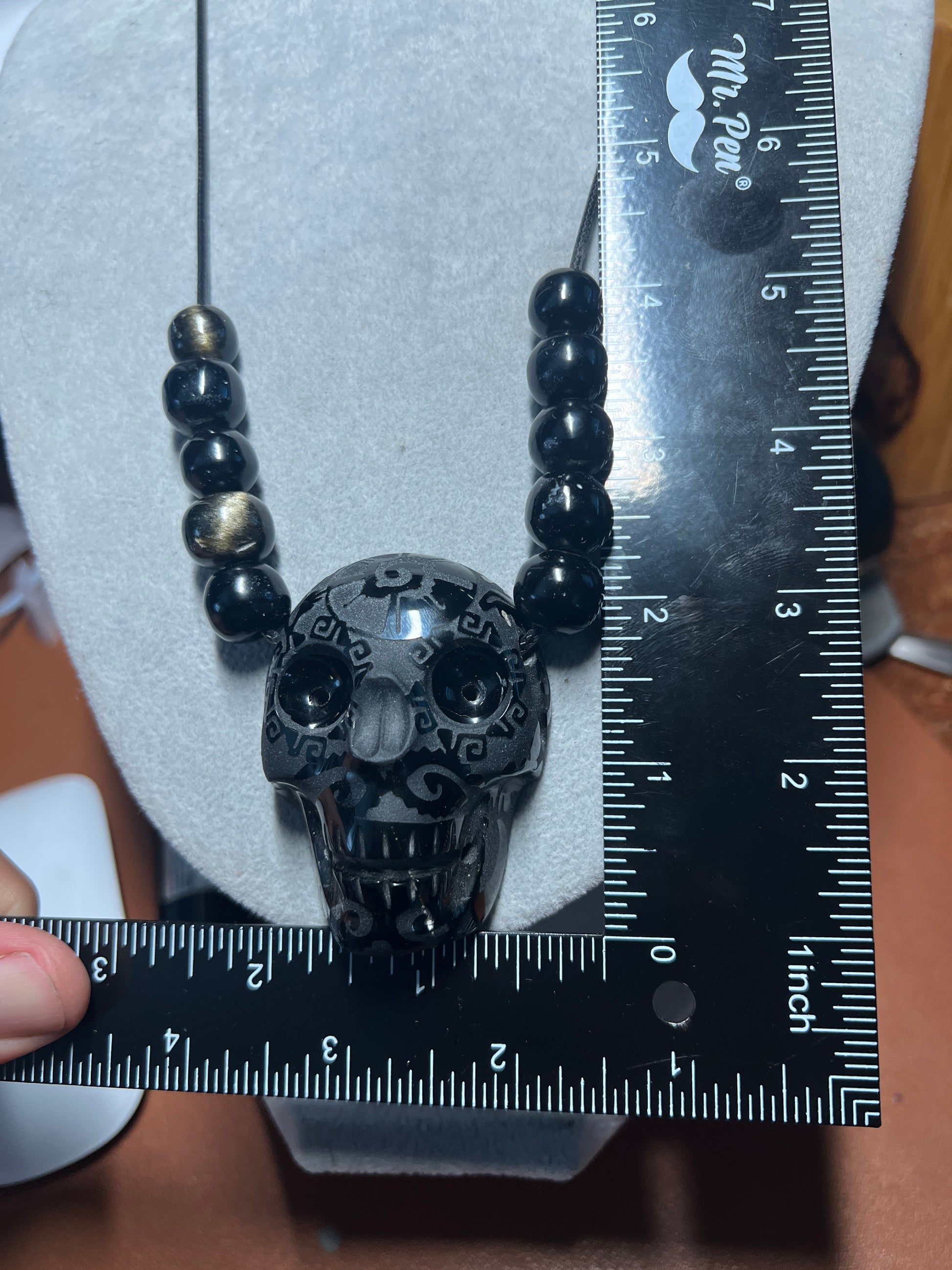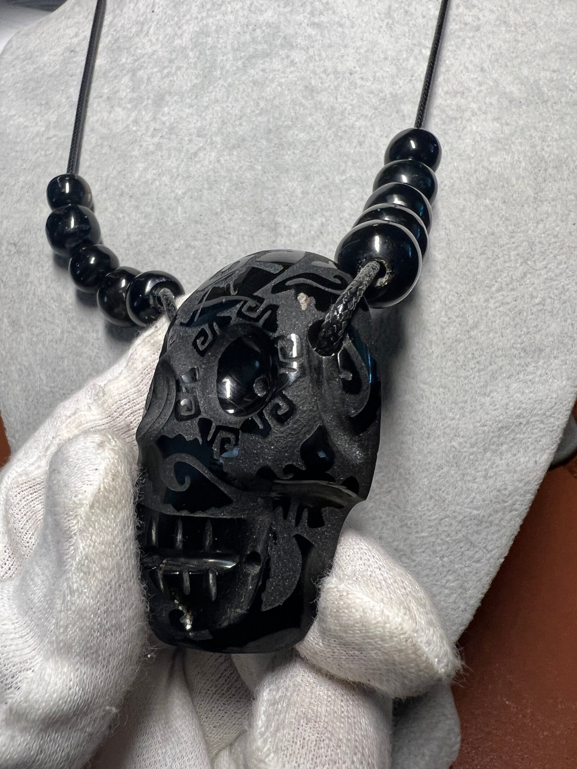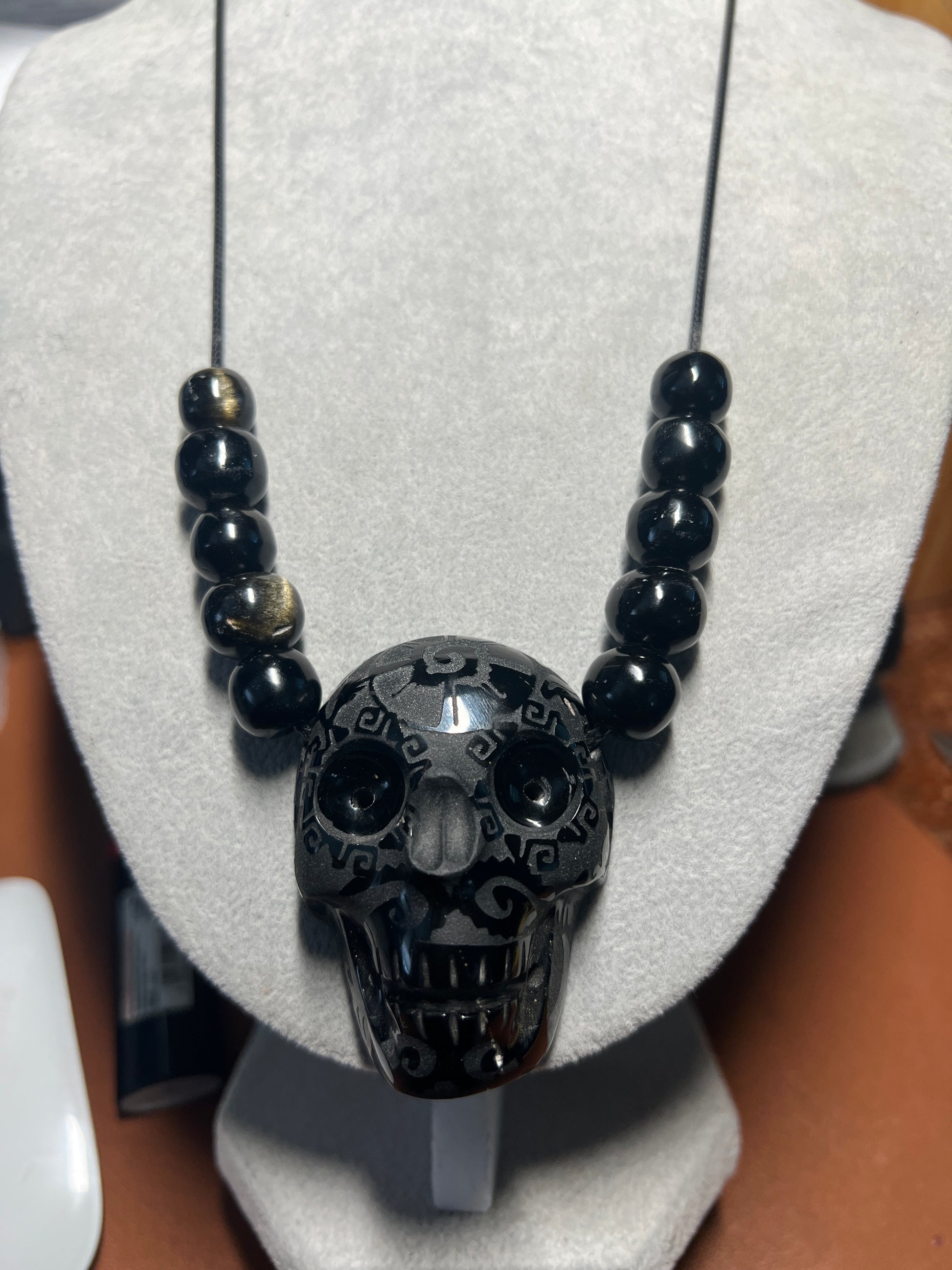 Elevate your accessory collection with this striking Black Obsidian Skull Pendant, a natural wonder that captures the essence of the Mictlan, the underworld in Aztec mythology. The pendant showcases the fearsome visage of Mictlantecuhtli, Ometeotl Hunab Ku, Mexica, intricately etched into the obsidian's glassy surface, creating a mesmerizing contrast of light and shadow. Crafted with precision, this piece is a testament to the skilled artisanship of its origin, blending traditional motifs with modern style. Whether you're looking to make a bold statement or seeking a unique addition to your jewelry collection, this obsidian skull pendant is sure to turn heads and invoke curiosity. Some beads are gold sheen black obsidian, and some are just black obsidian. See photos!