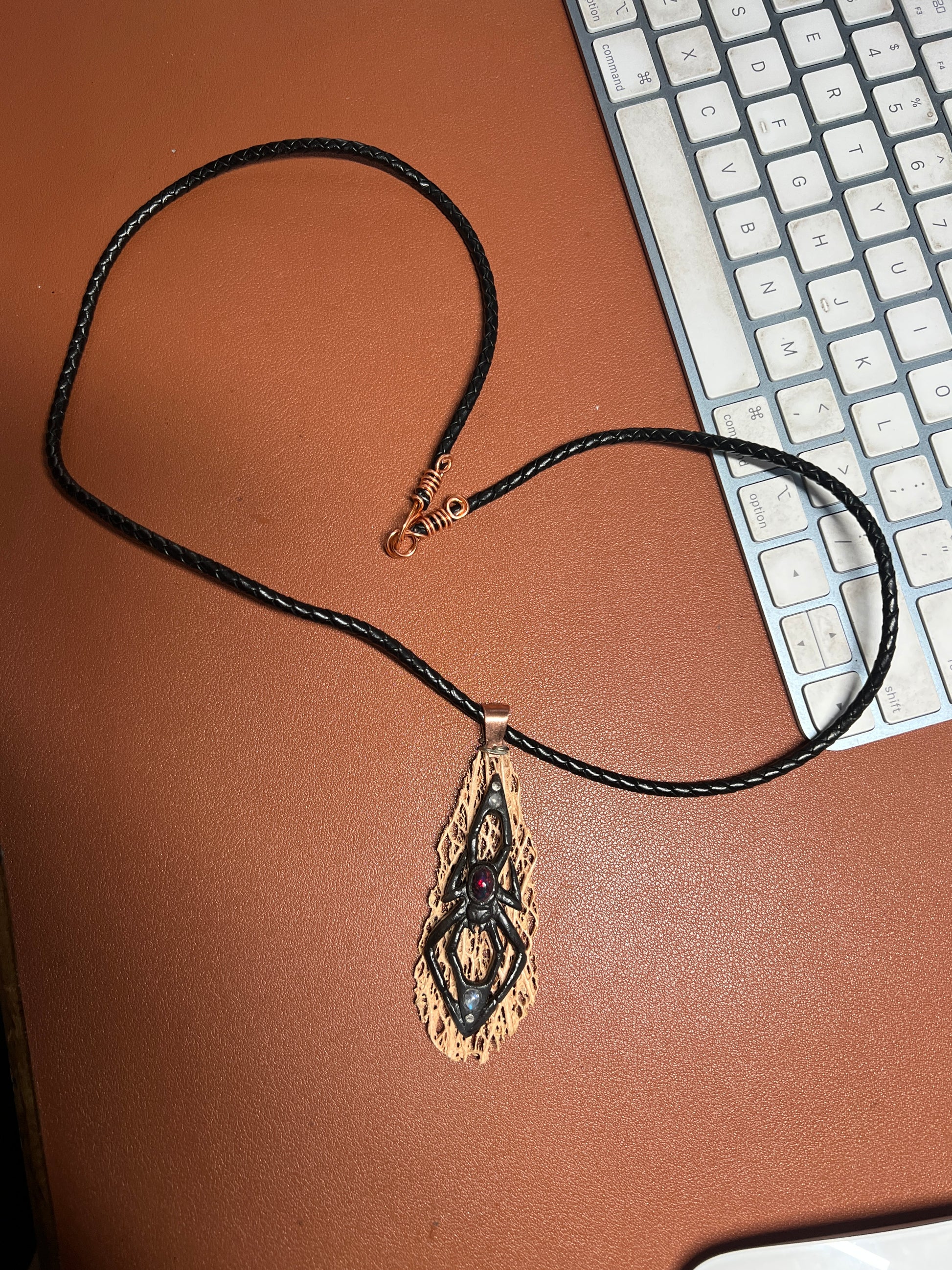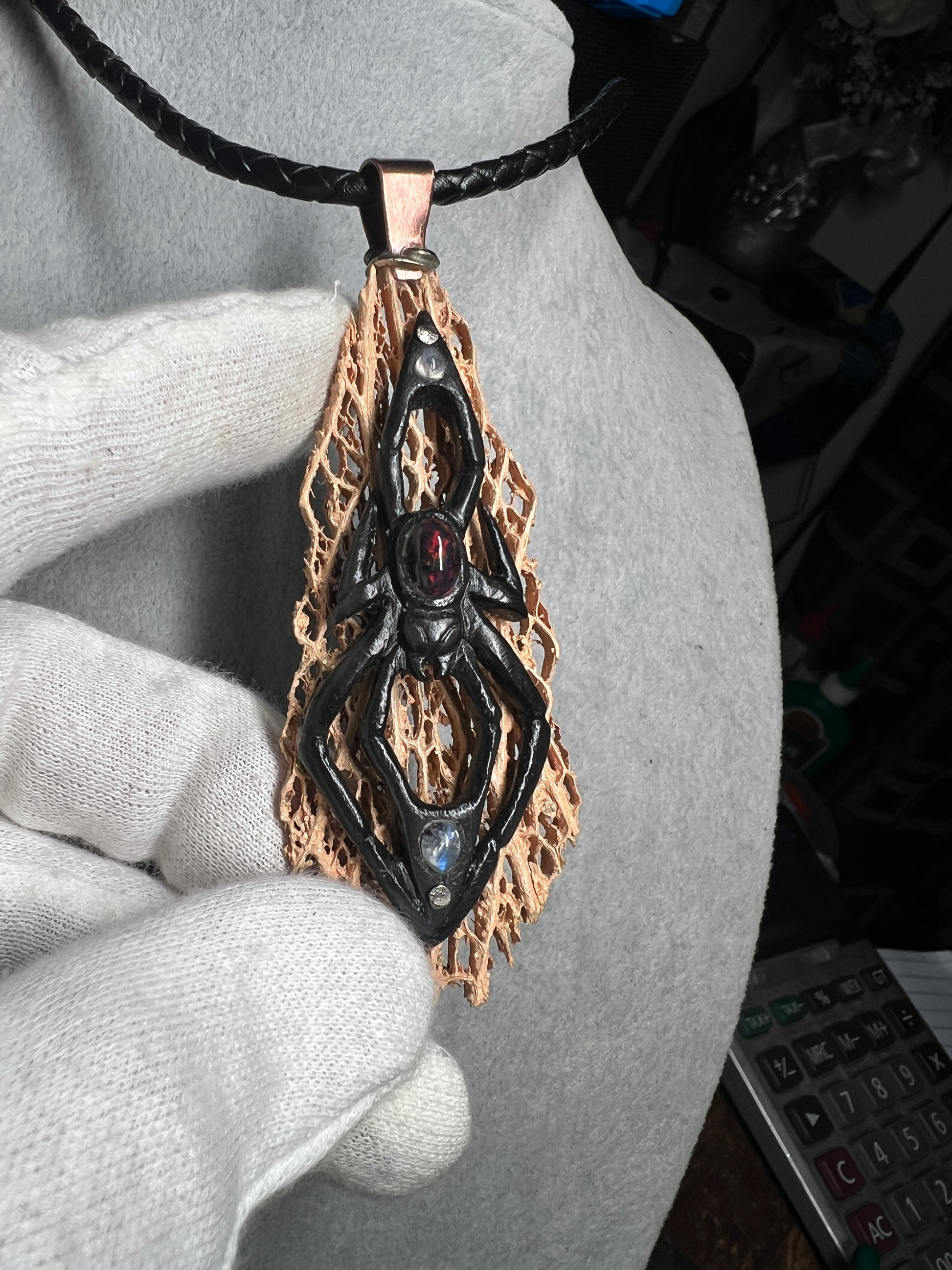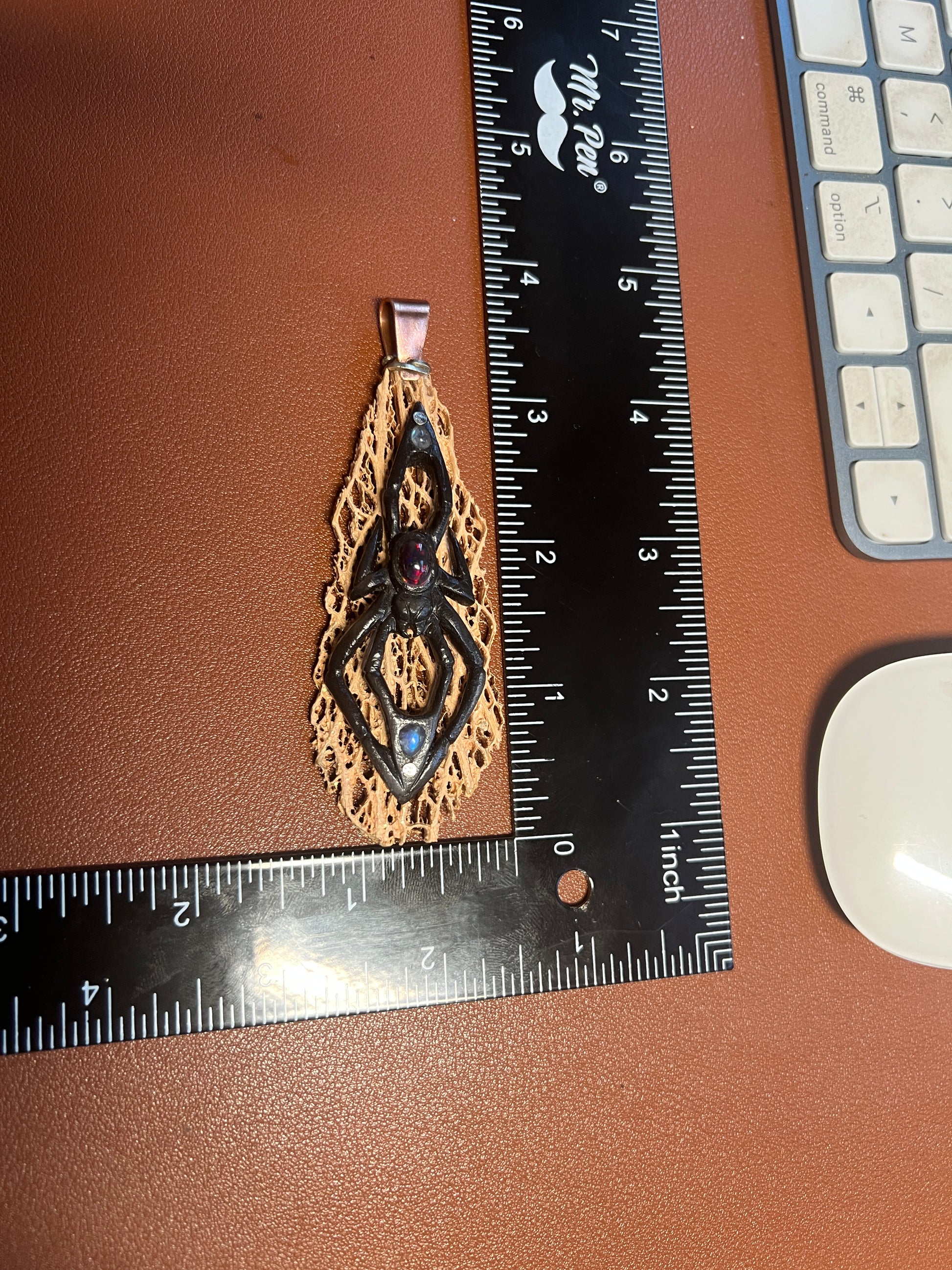 This handmade pendant from Mexico features a unique design with a Black Widow motif, crafted from bull horn and cactus skeleton. The centerpiece of the pendant is adorned with a striking black opal, adding a touch of elegance to the edgy and nature-inspired piece. Perfect for those who appreciate handcrafted jewelry with a touch of originality and Mexican craftsmanship.