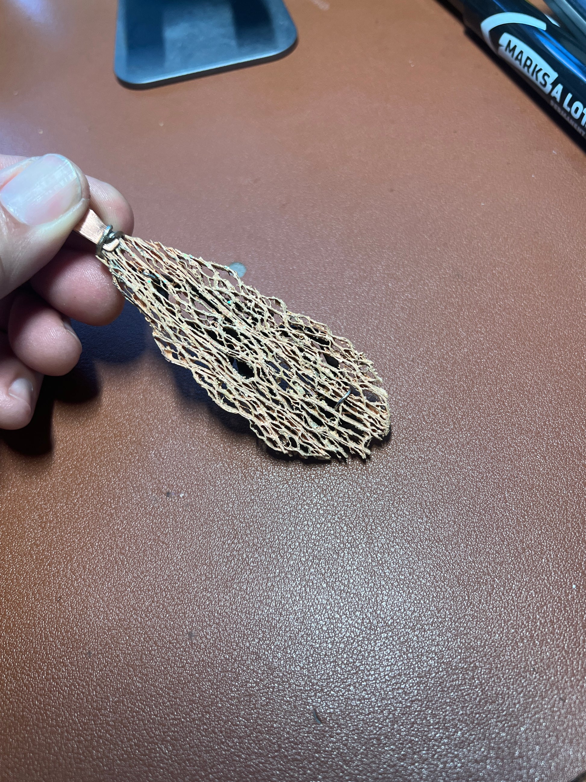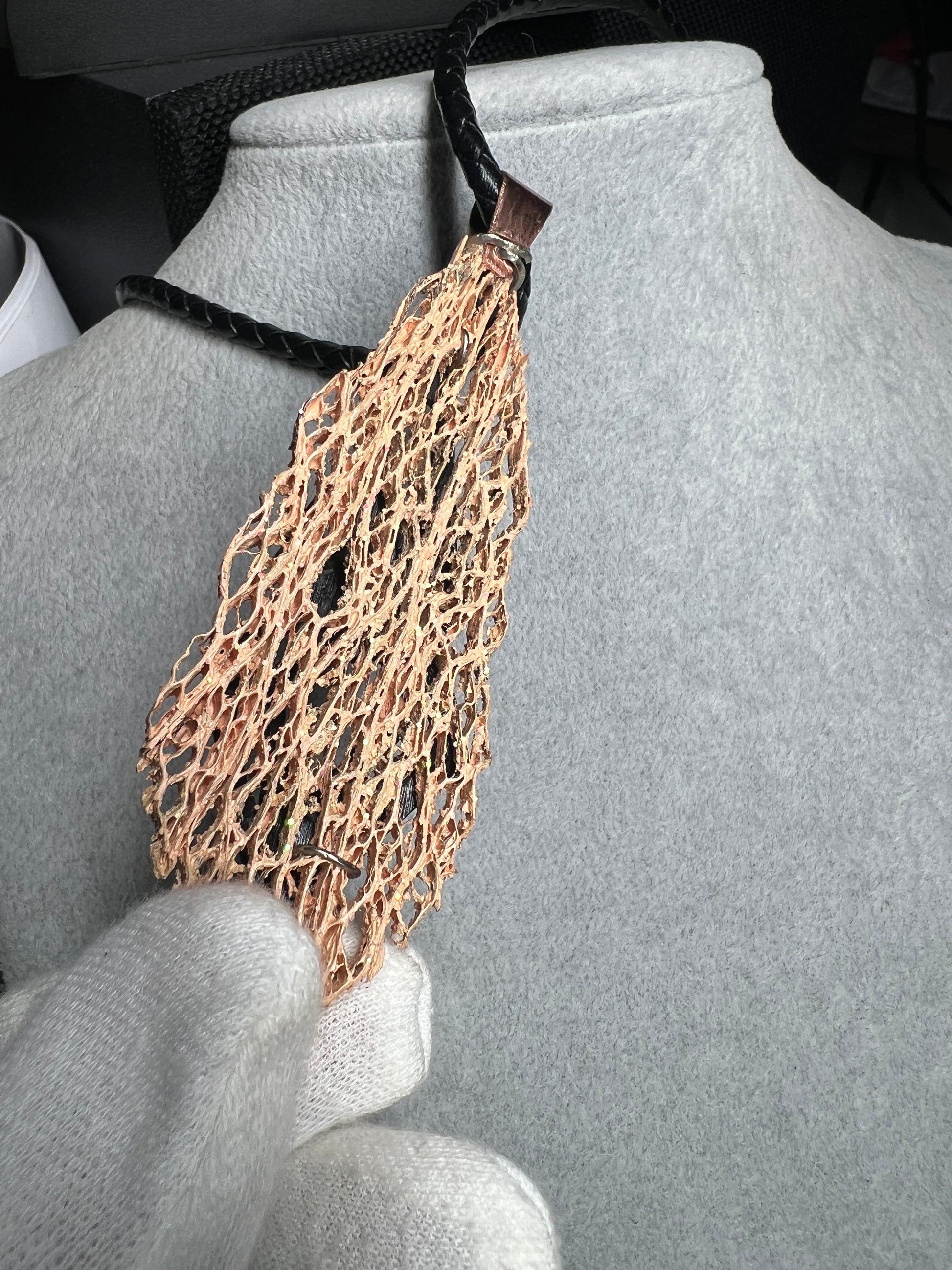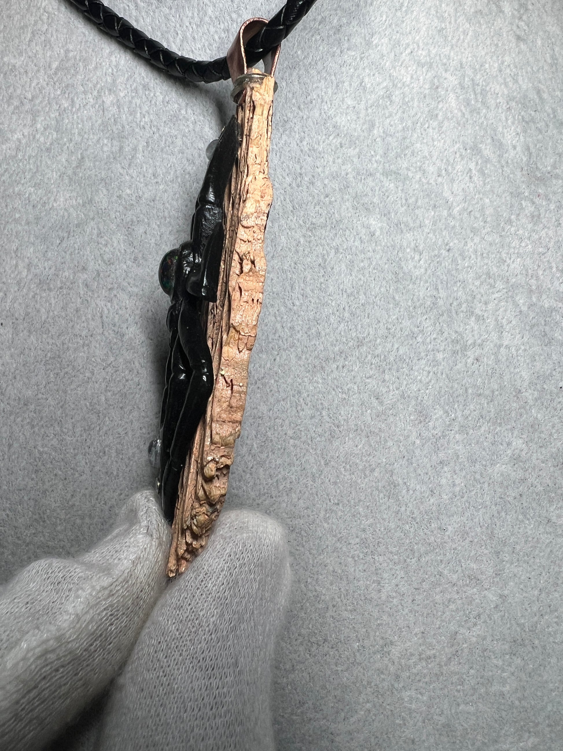 This handmade pendant from Mexico features a unique design with a Black Widow motif, crafted from bull horn and cactus skeleton. The centerpiece of the pendant is adorned with a striking black opal, adding a touch of elegance to the edgy and nature-inspired piece. Perfect for those who appreciate handcrafted jewelry with a touch of originality and Mexican craftsmanship.