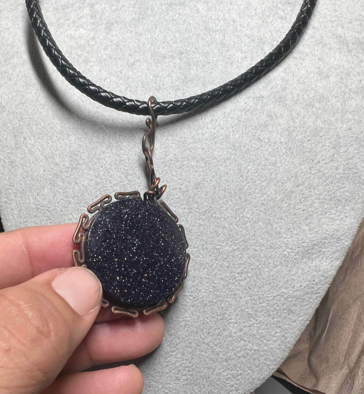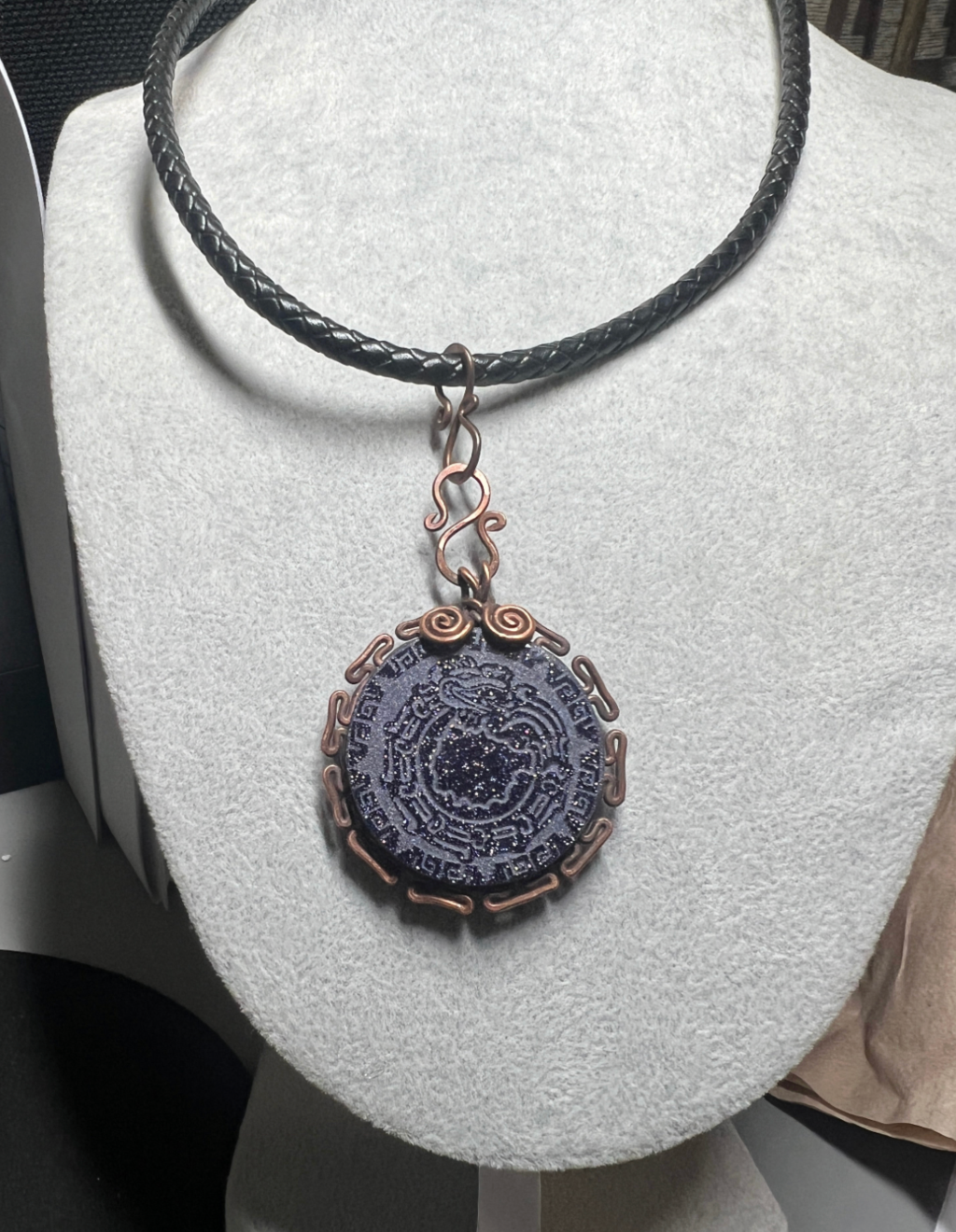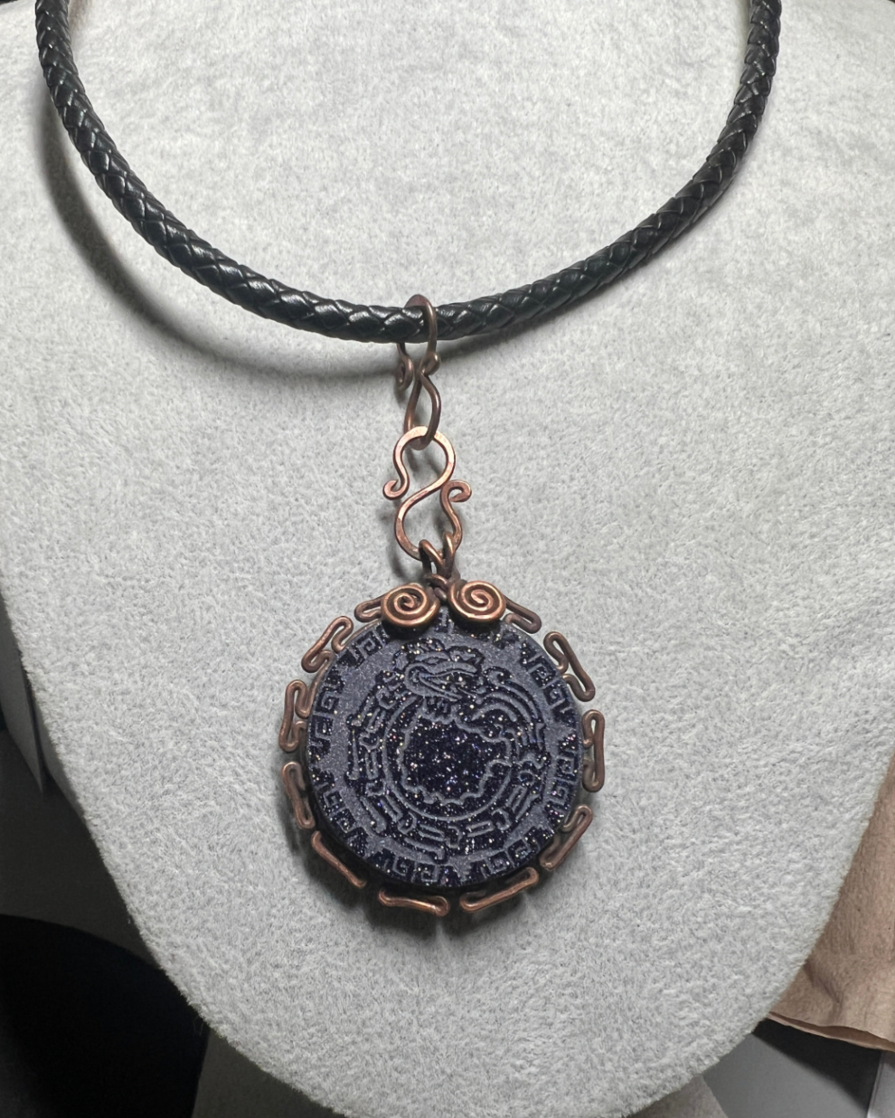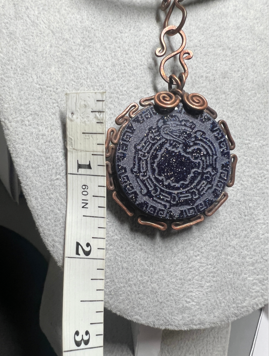 Blue Sparkles Aventurine Stone Ometeotl Hunab Ku Duality God of Aztec Mexica Maya, 2", leather rope necklace, 20" Mexico