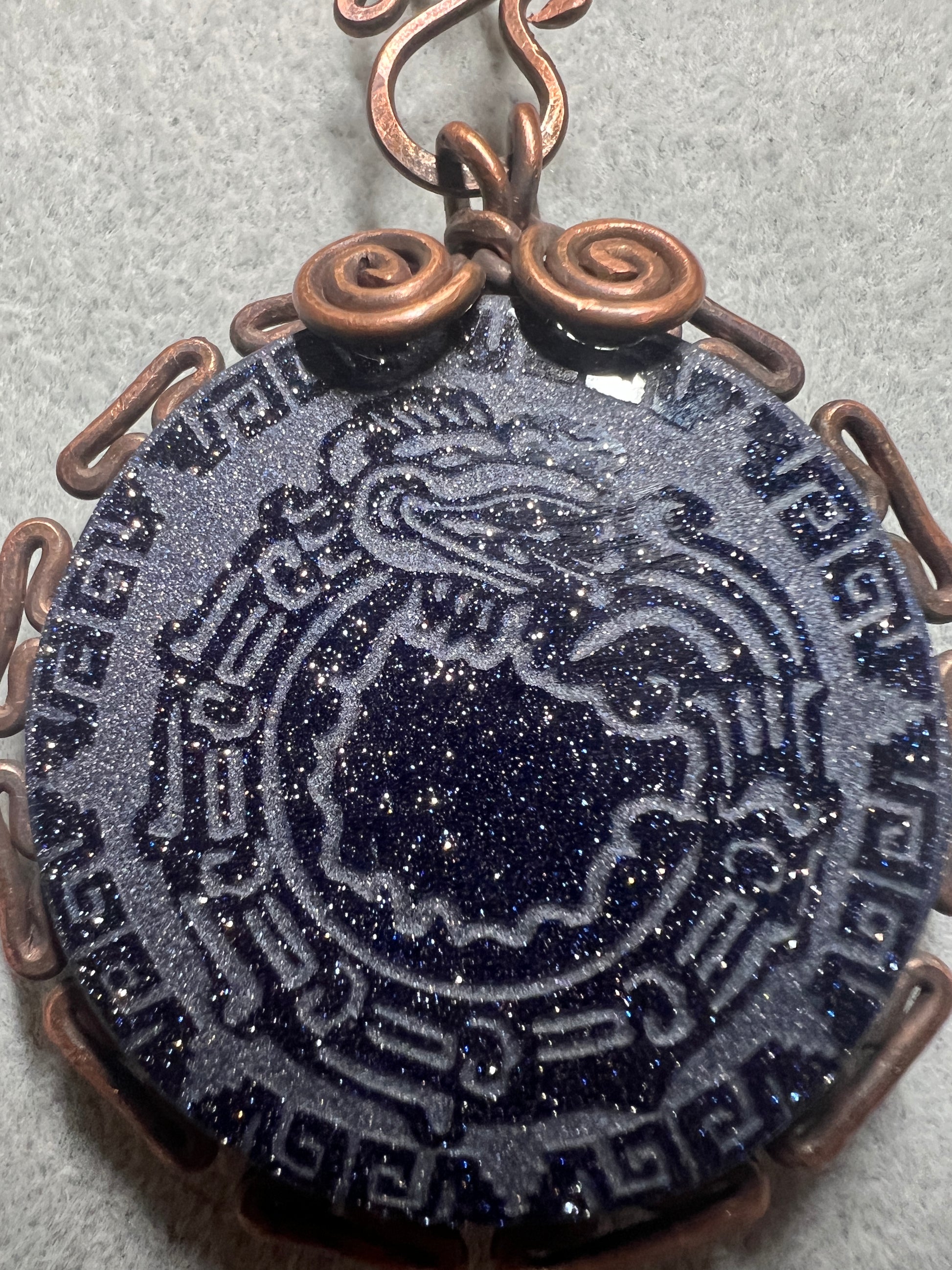 Blue Sparkles Aventurine Stone Kukulkan Quetzalcoatl Mexican Dragon Aztec Mexica Maya, 1.75", leather rope necklace, 20" Mexico