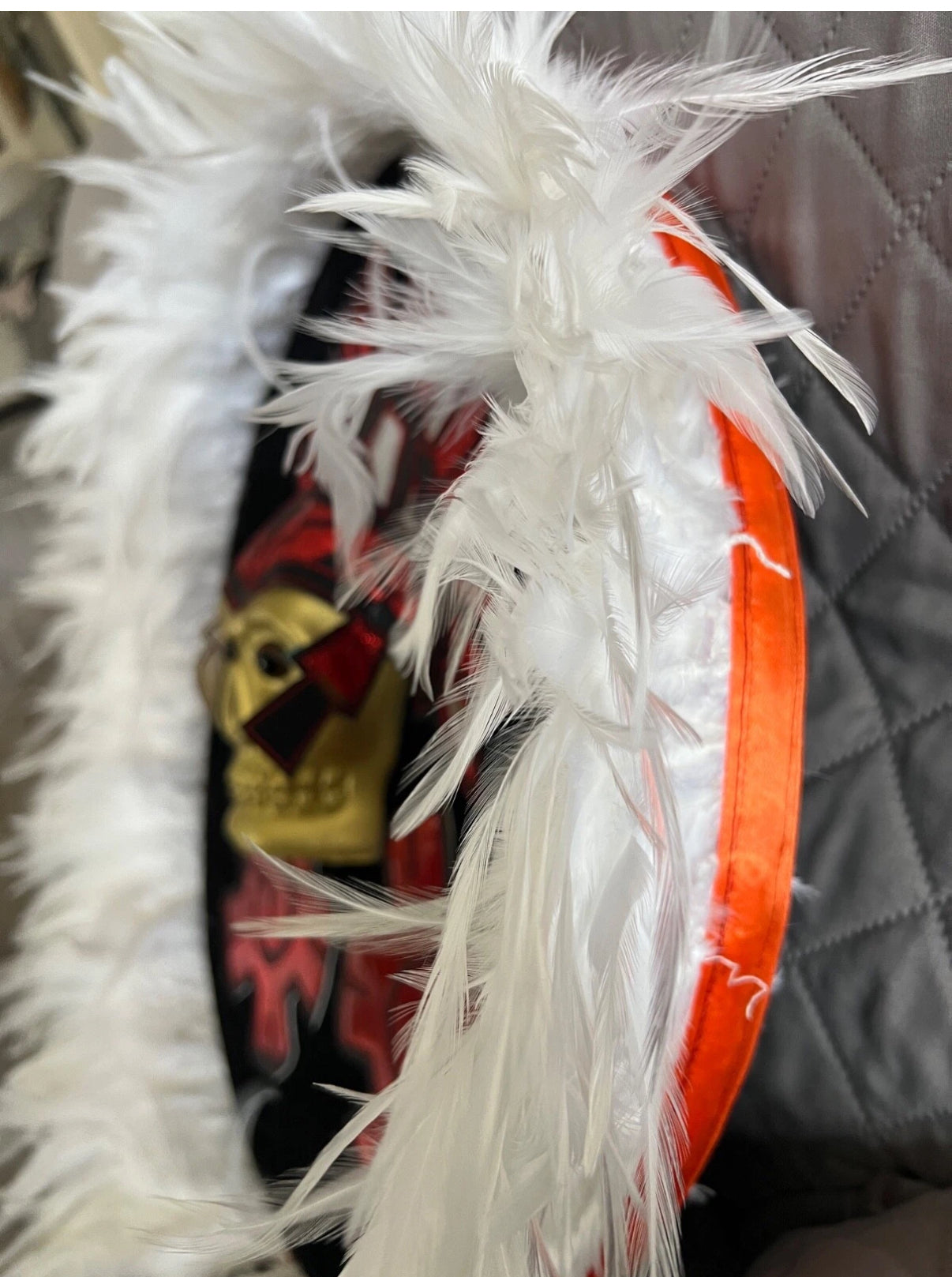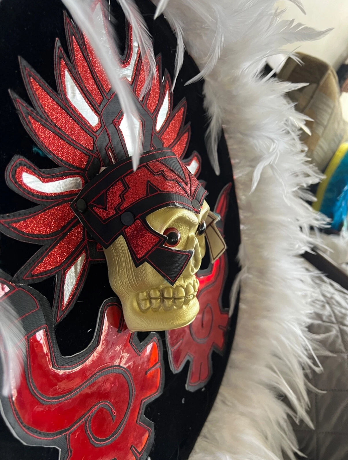Danzante Azteca Mictlantecuitli Shield, Chimalli, Black Red, Aztec Dance Shield, Aztec Skull, Mexica, Pow Wow, Indigenous Feathers, 17", with 3 dimensional skull in center.