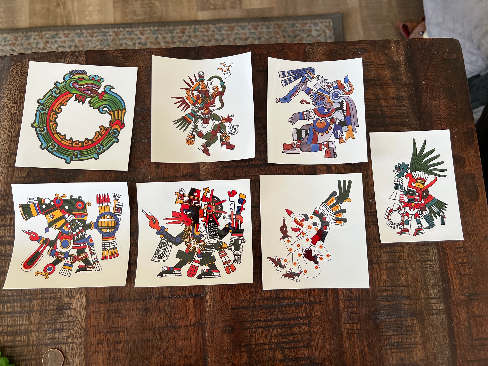 Set of Seven Aztec God Stickers, Vinyl, apprx. 4"