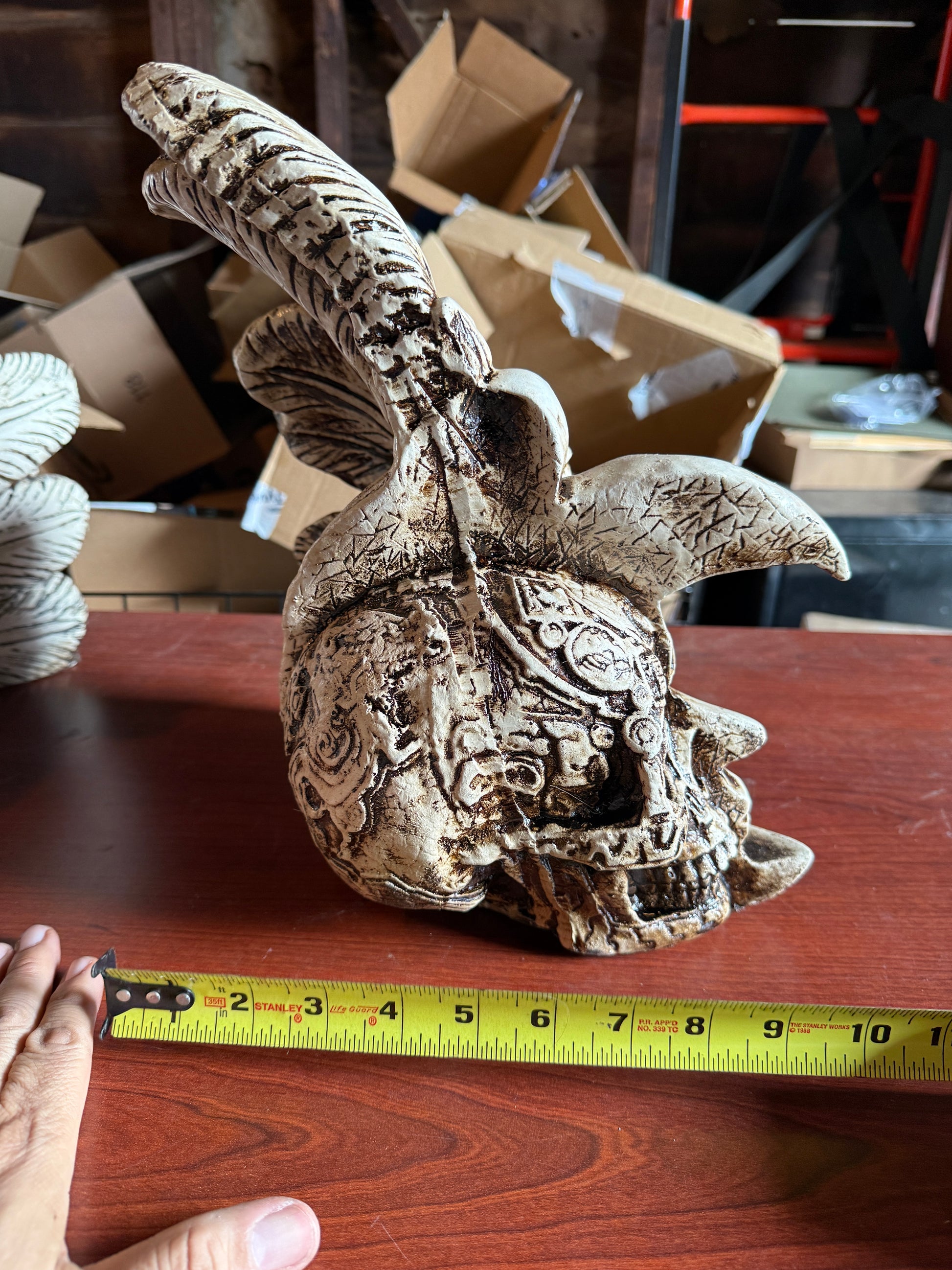 This Eagle Skull Warrior statue, standing at 12.5 inches tall, is a handcrafted piece from Mexico. Made of thick heavy clay, it reflects the rich Mexican culture and symbolism of the Mayan or Aztec civilizations. The statue depicts a fierce warrior, embodying strength and resilience. Perfect for collectors of Latin American artifacts or those interested in Mexican ethnicities, this unique piece would make a striking addition to any collection.