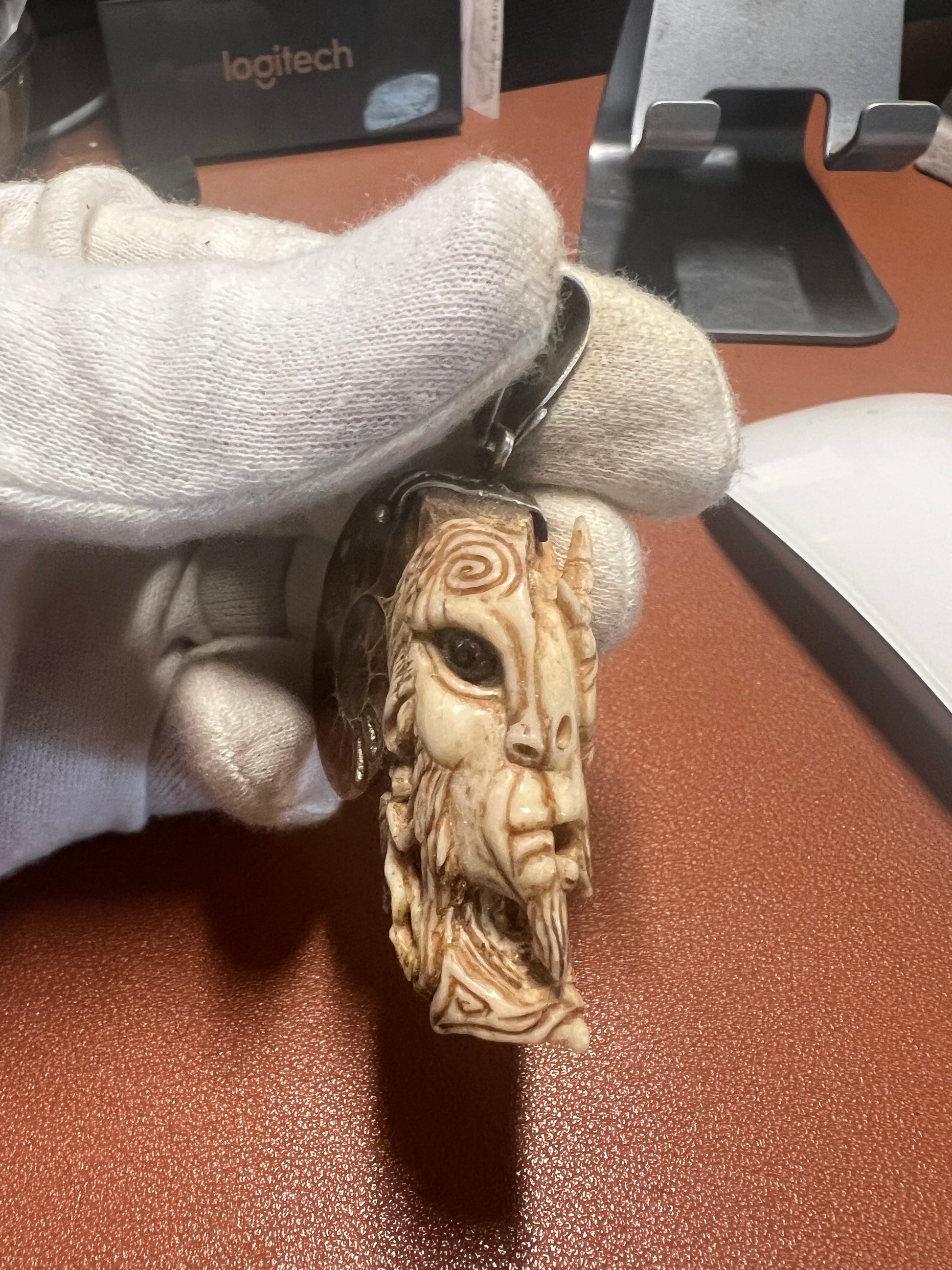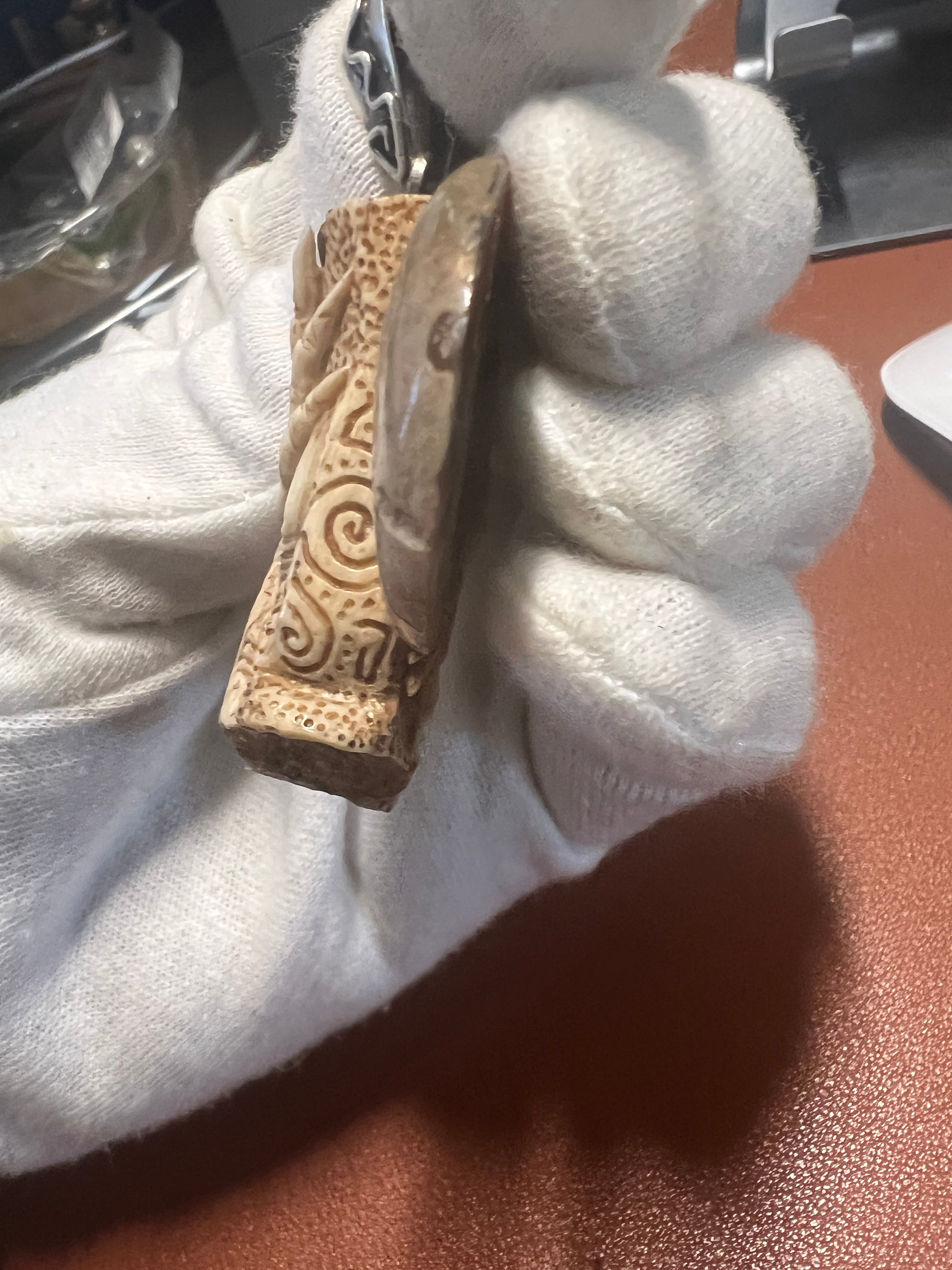 The Fauna Hand Eye Pendant handmade and carved from Deer Antler and an Ammonite Fossil. With a Silver Bail is a unique pendant inspired by fairytale and gothic themes. Handcrafted in Mexico, it features a design that incorporates elements such as a deer antler, snail fossil, and a silver bail. The pendant has a mysterious and whimsical aesthetic, reminiscent of a piece that could be found in a dark fantasy world like the one depicted in Pan's Labyrinth. It is a standout piece of fashion jewelry that will appeal to those who appreciate intricate and mystical designs.