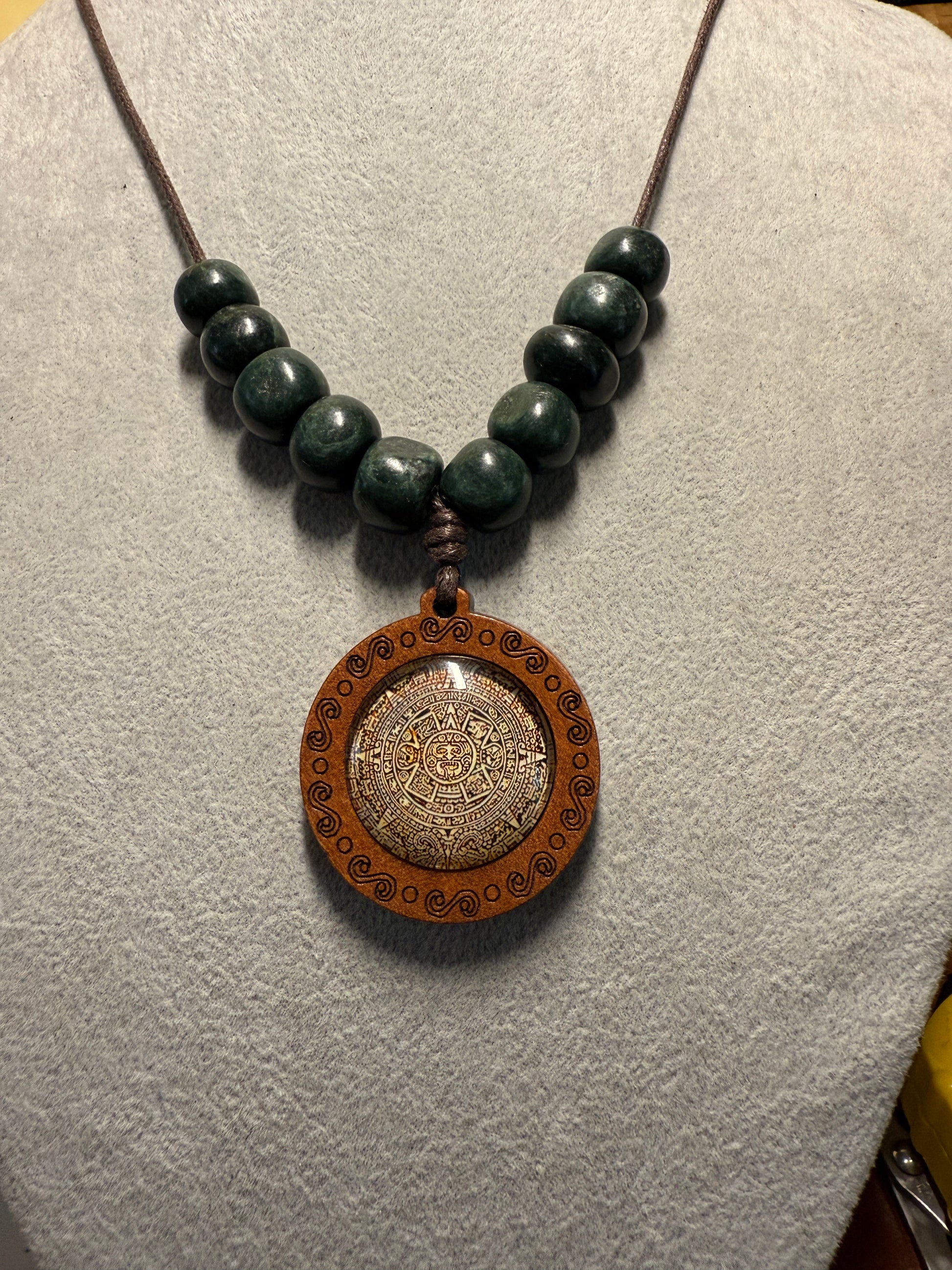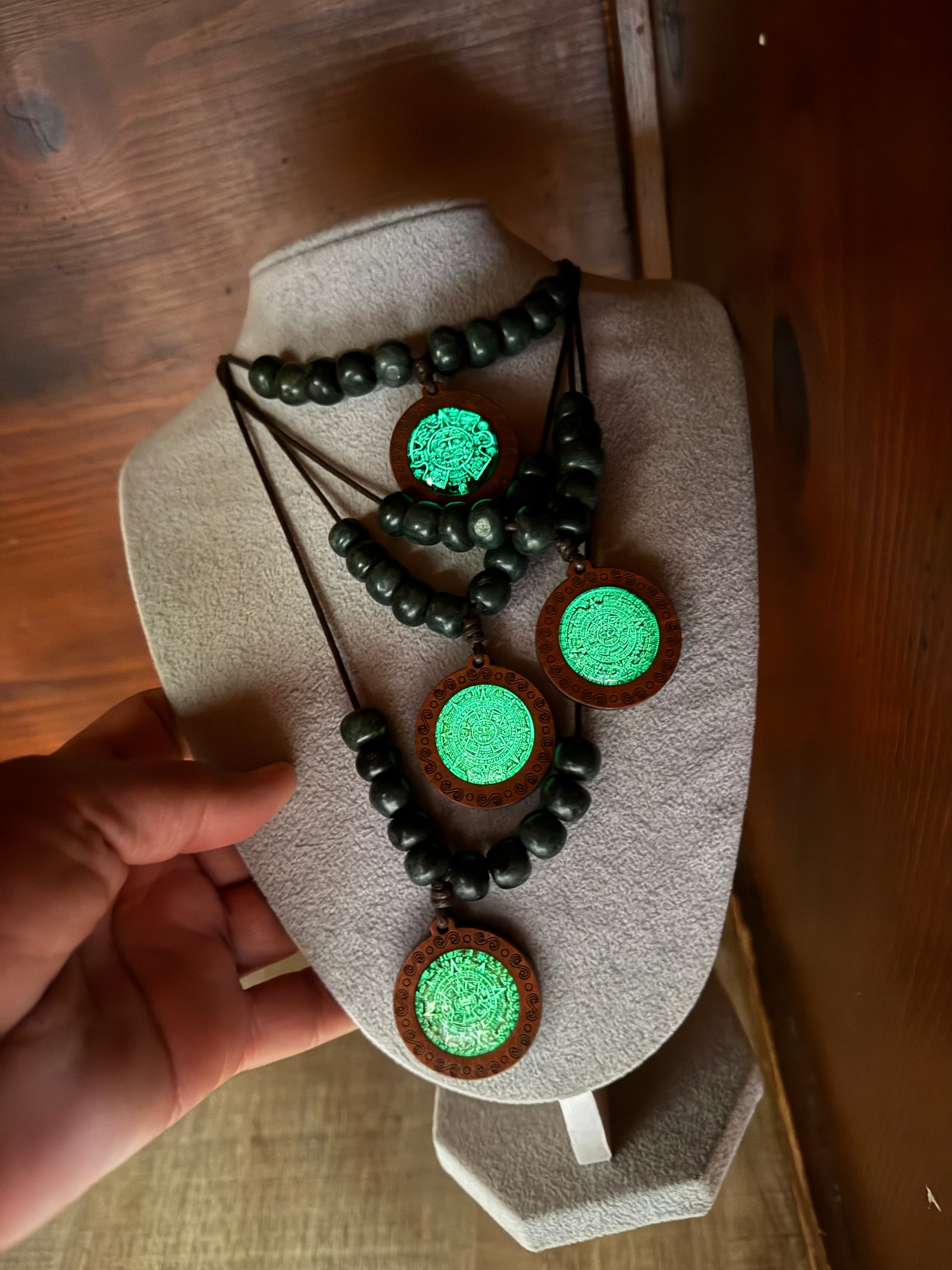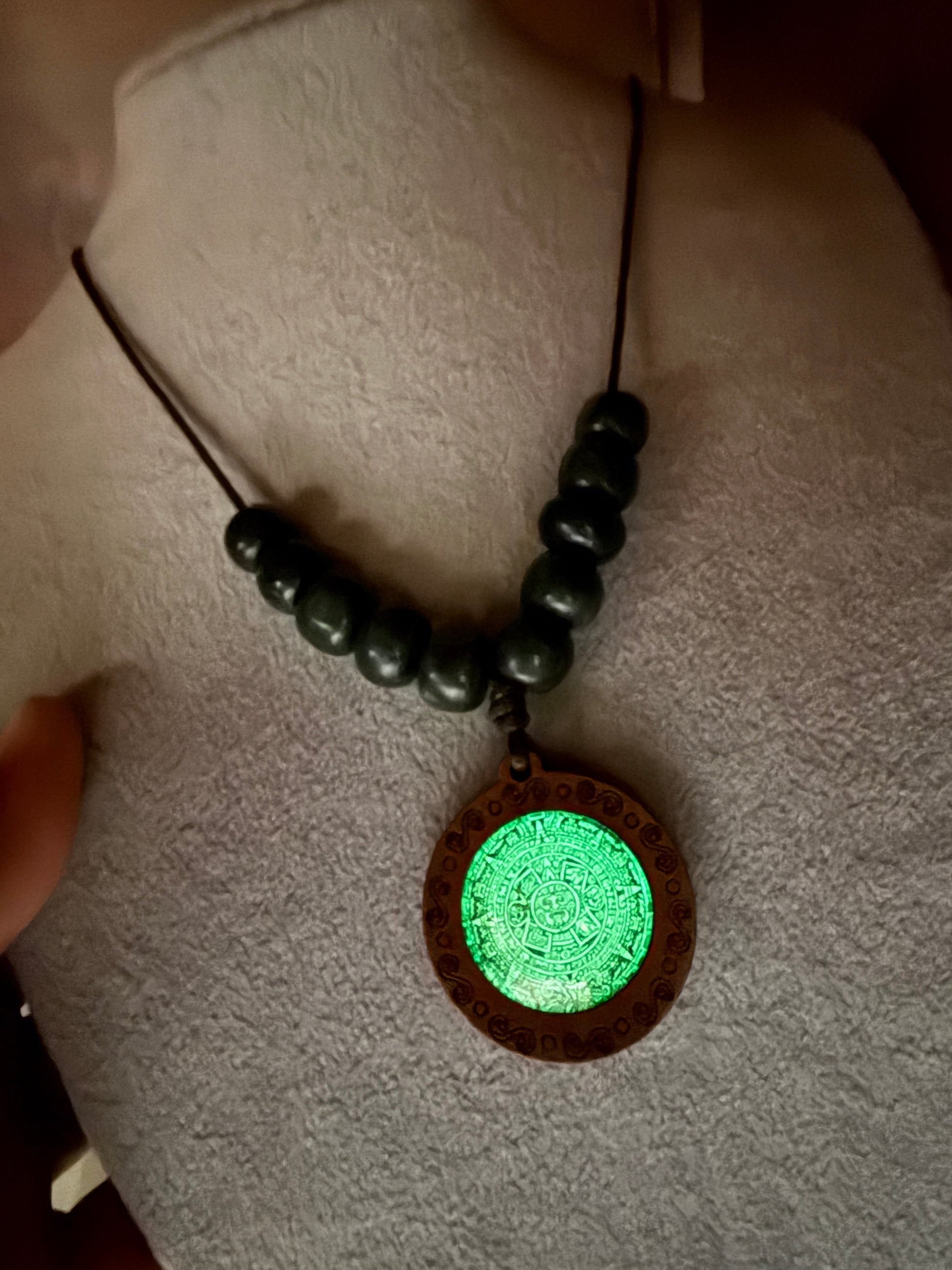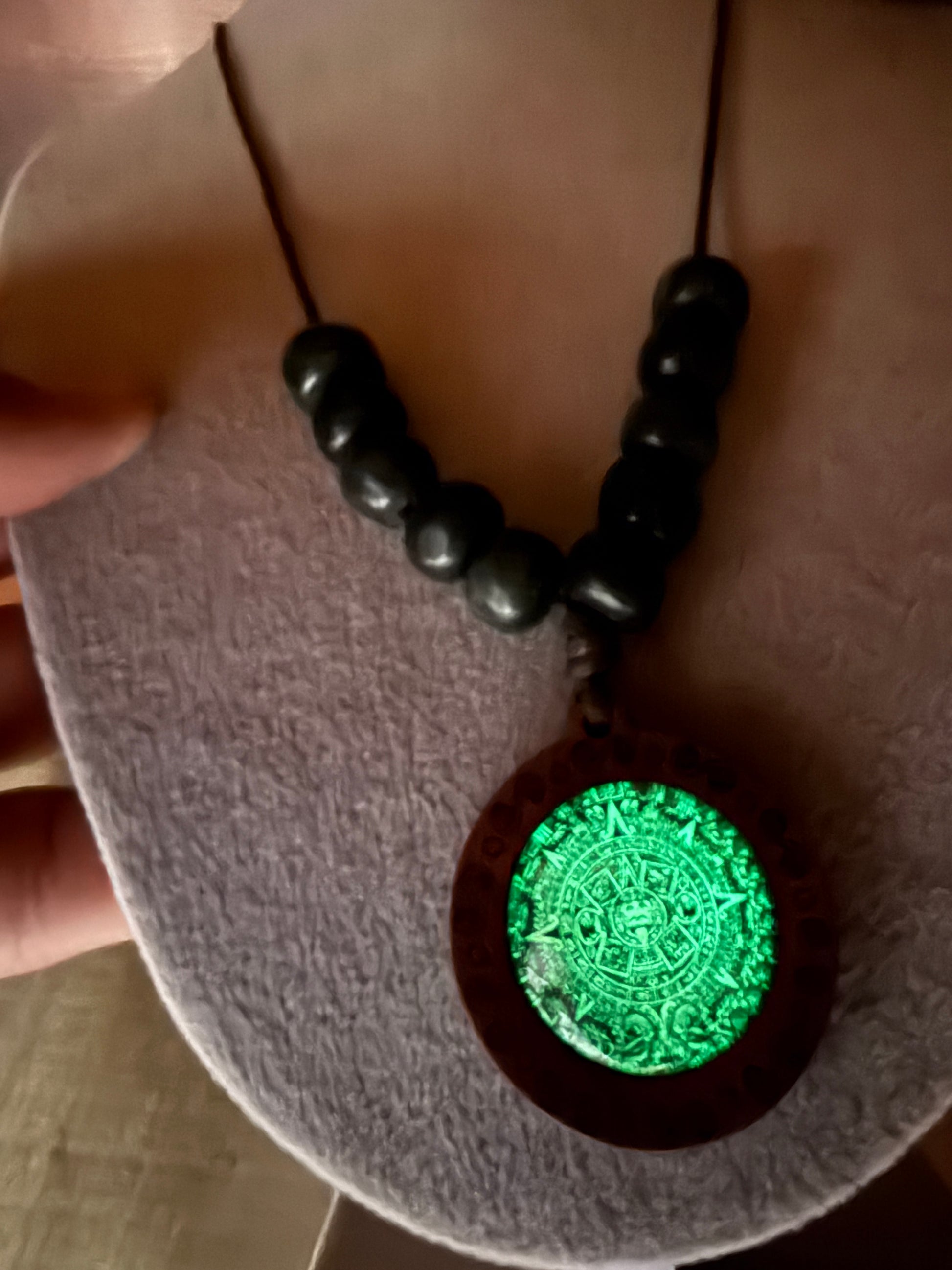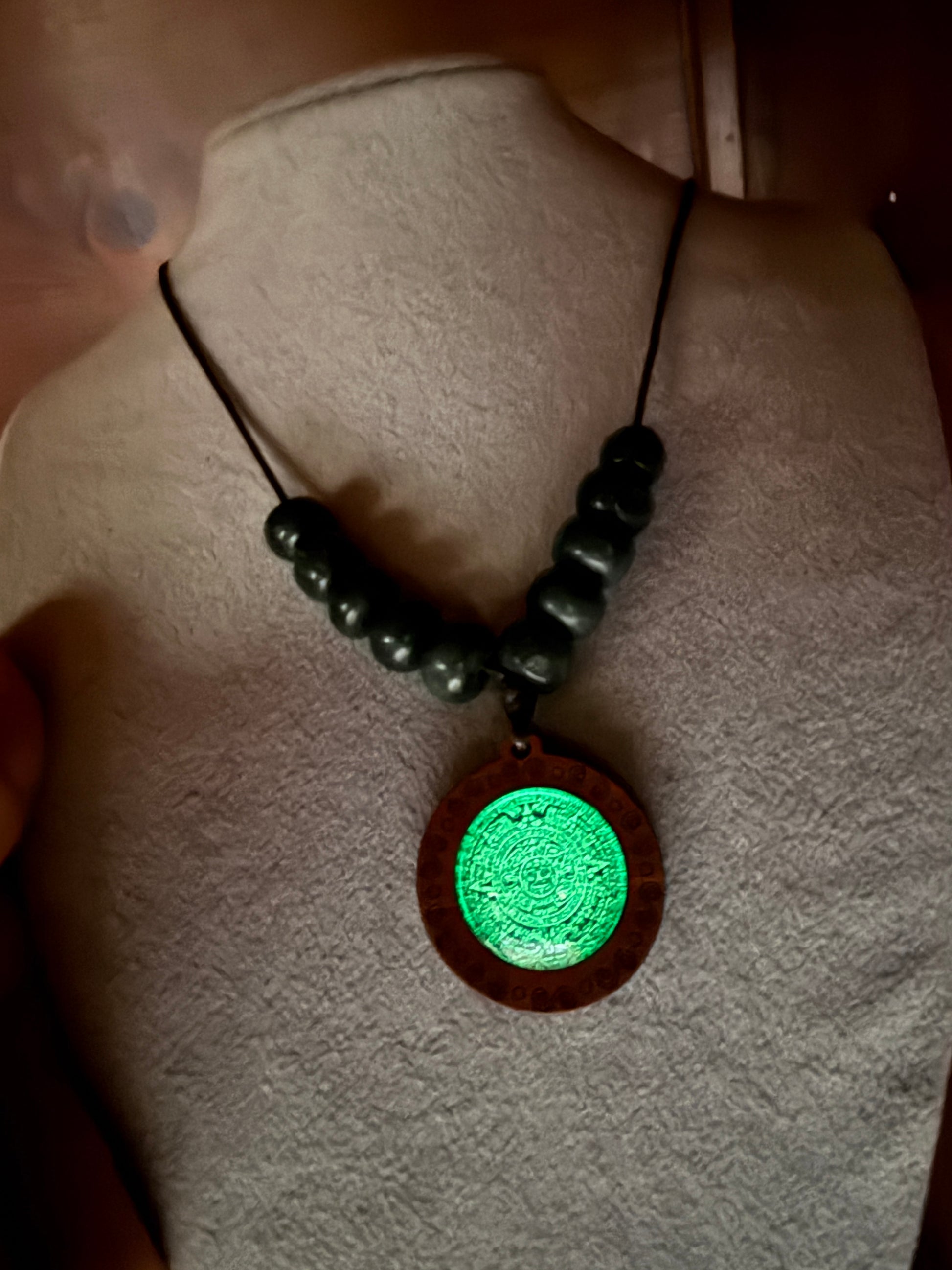 Glow In The Dark Aztec Calendar Pendant with Guatemalan jade beads, aka marmolina or marble.