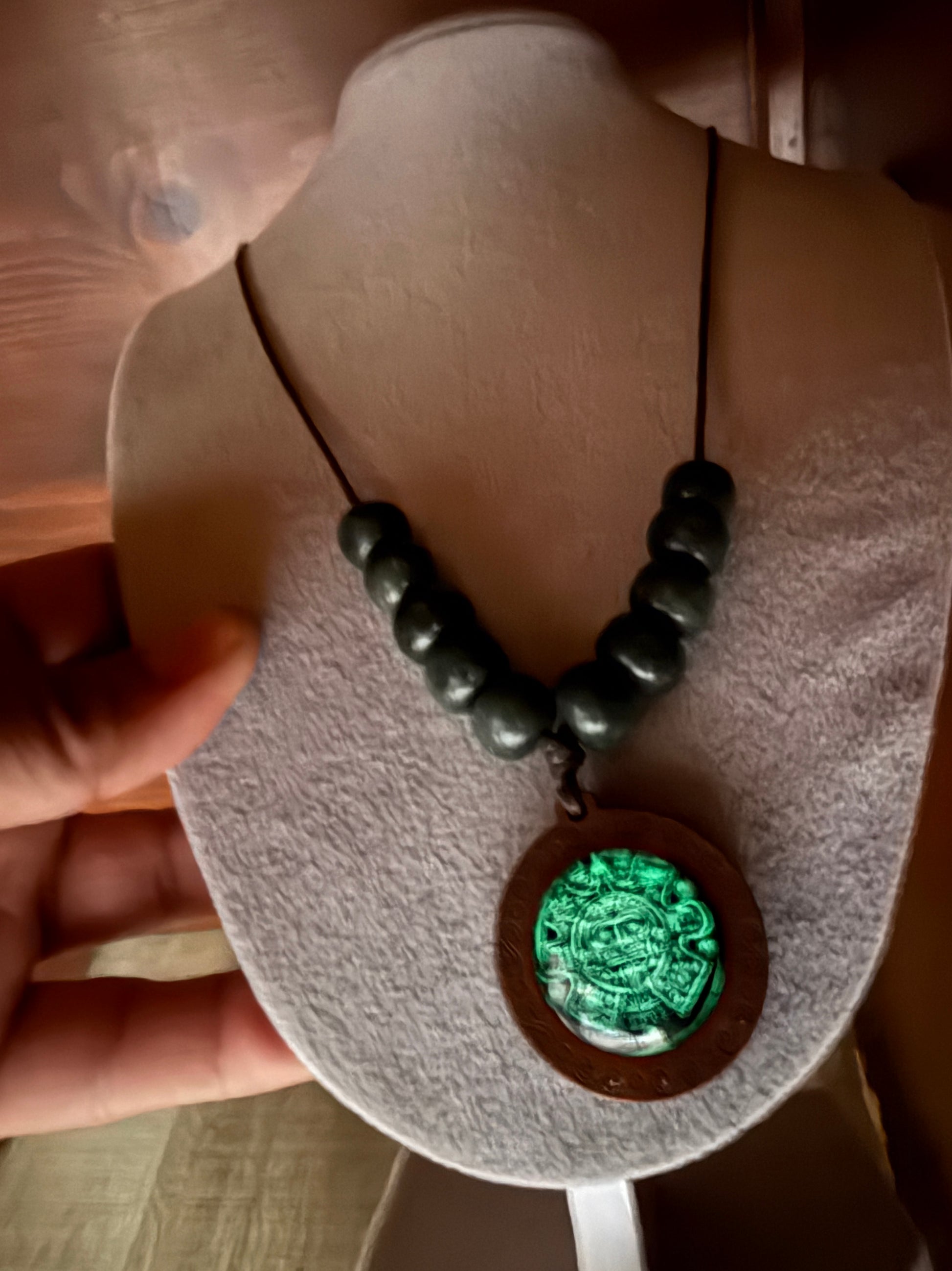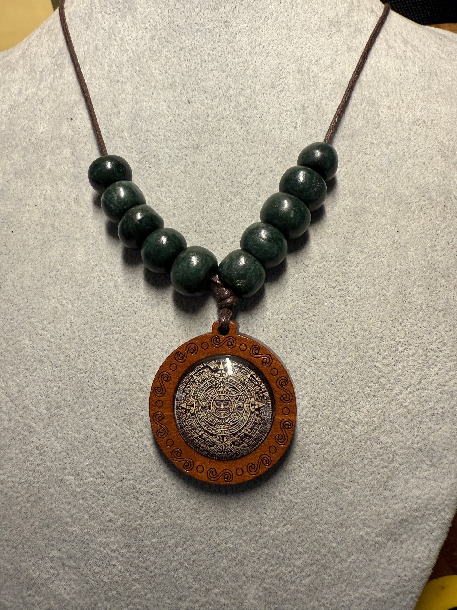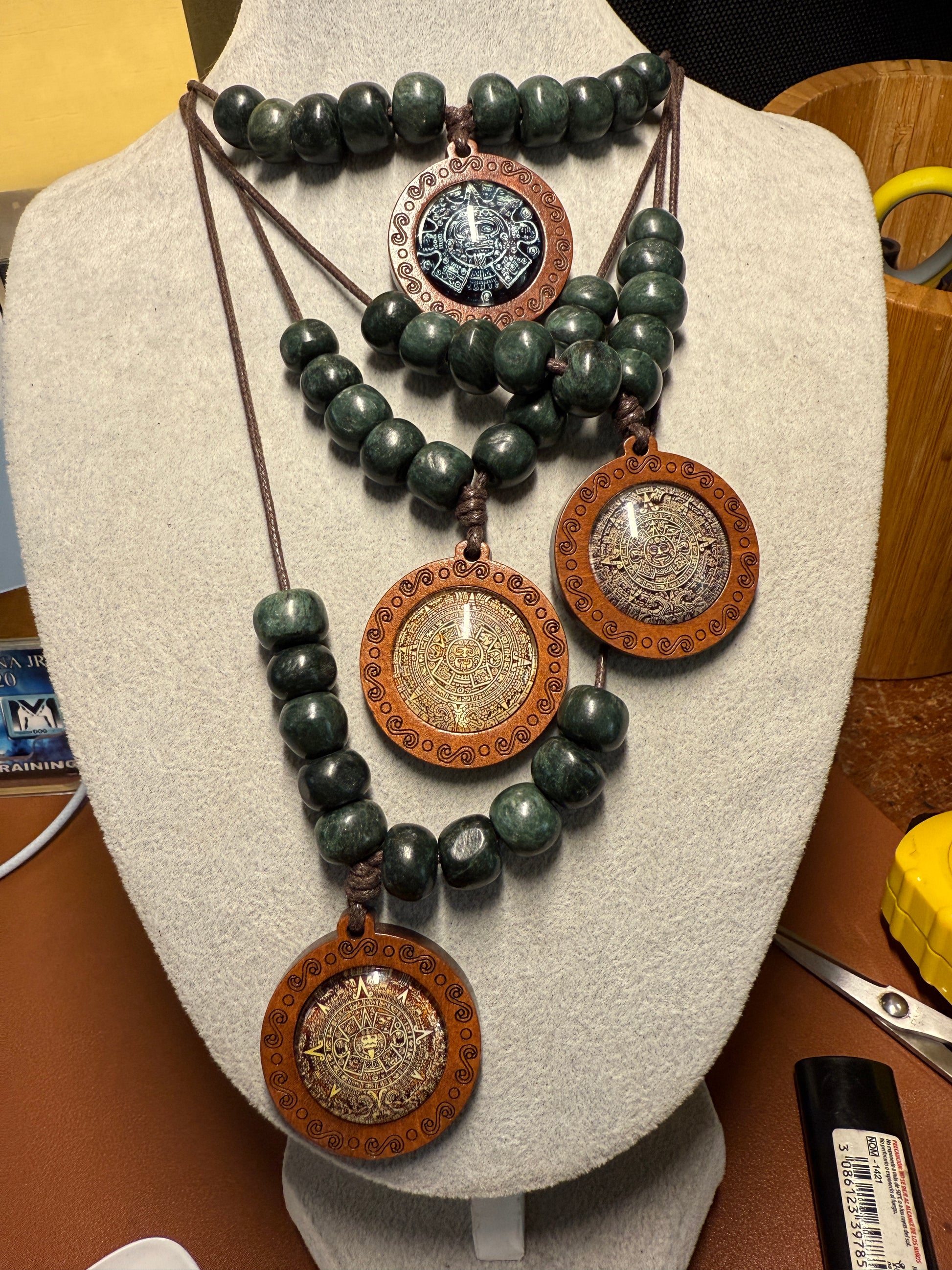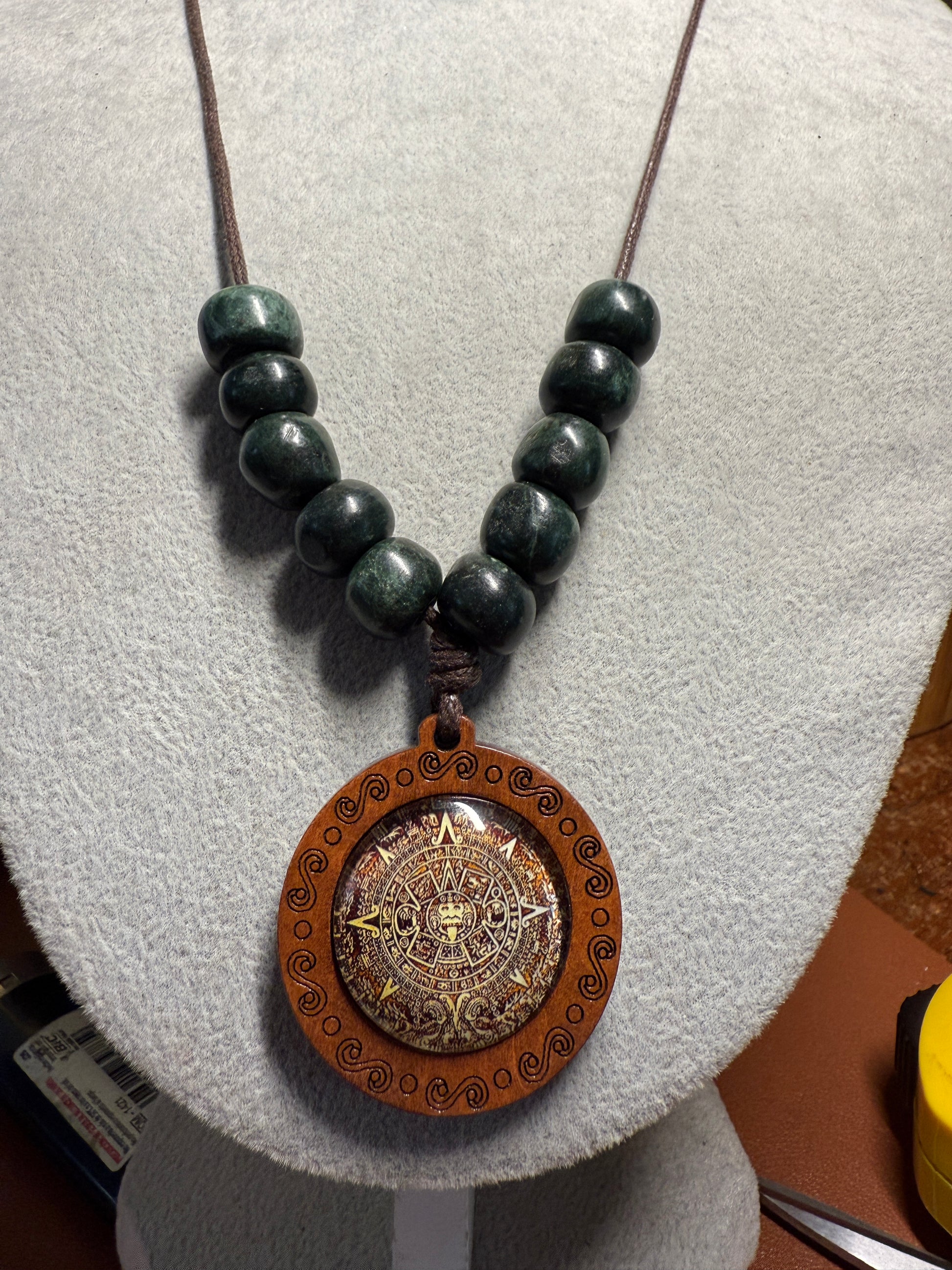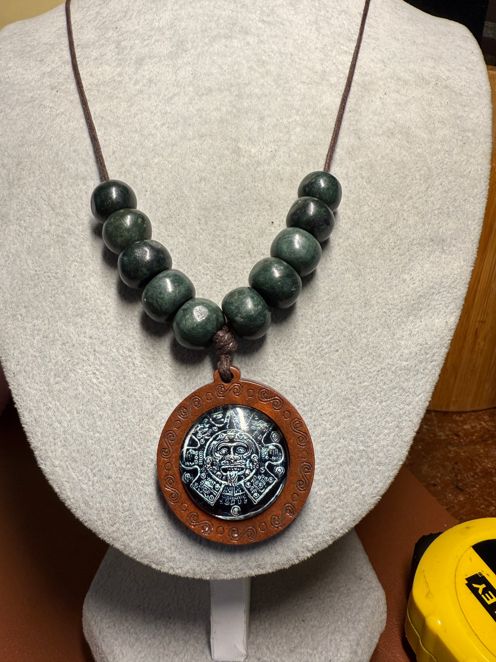 Glow In The Dark Aztec Calendar Pendant with Guatemalan jade beads, aka marmolina or marble.