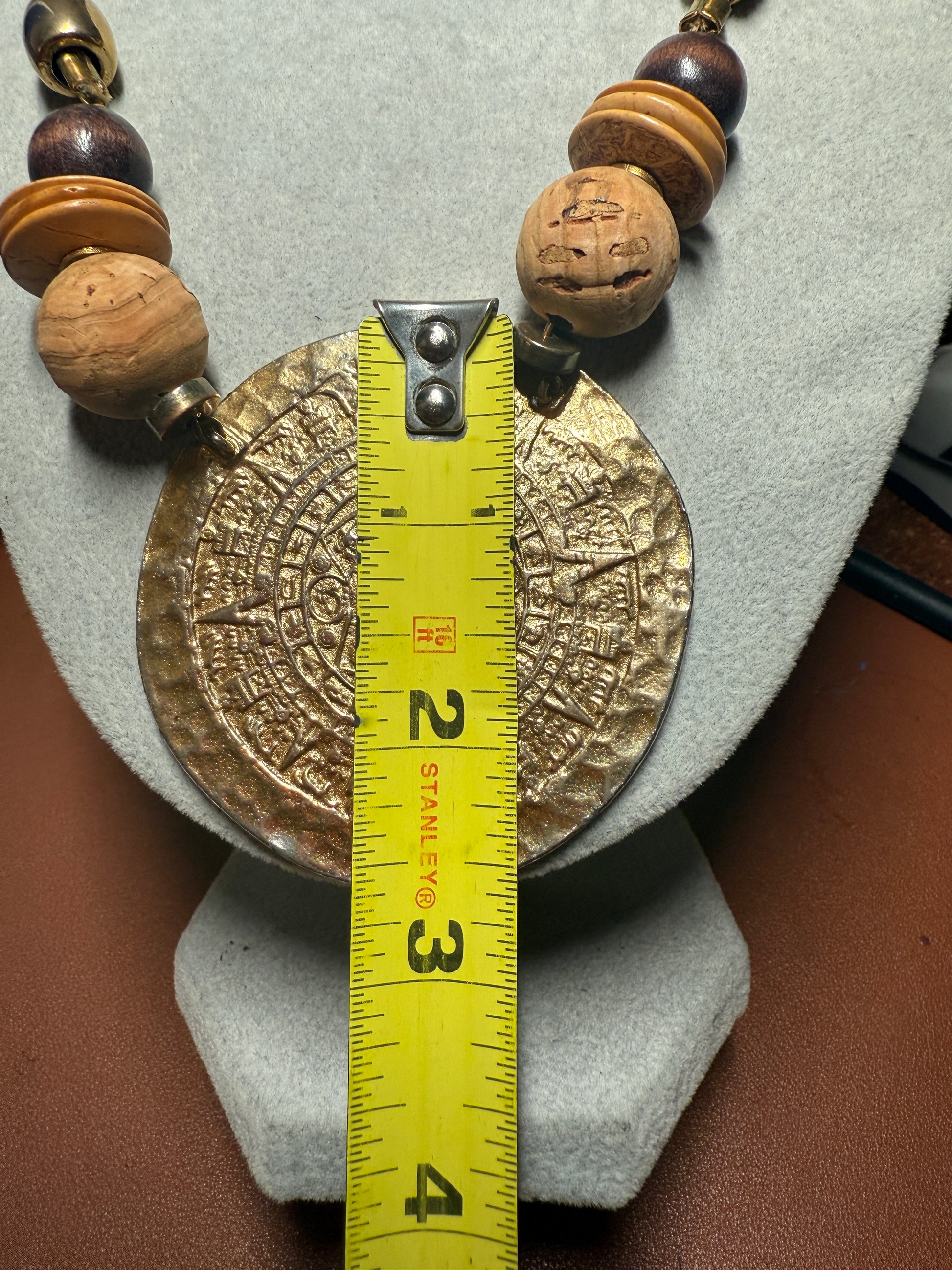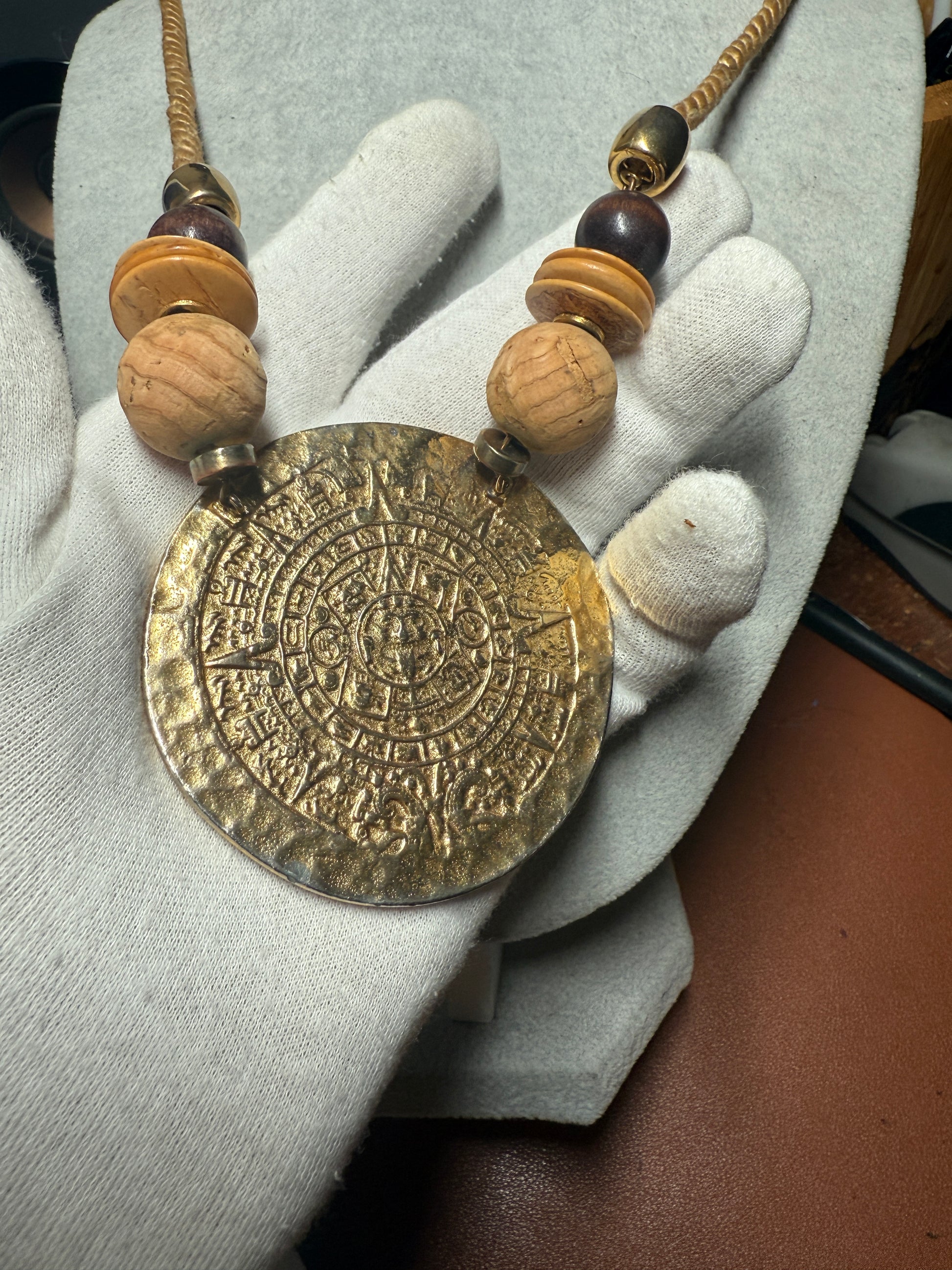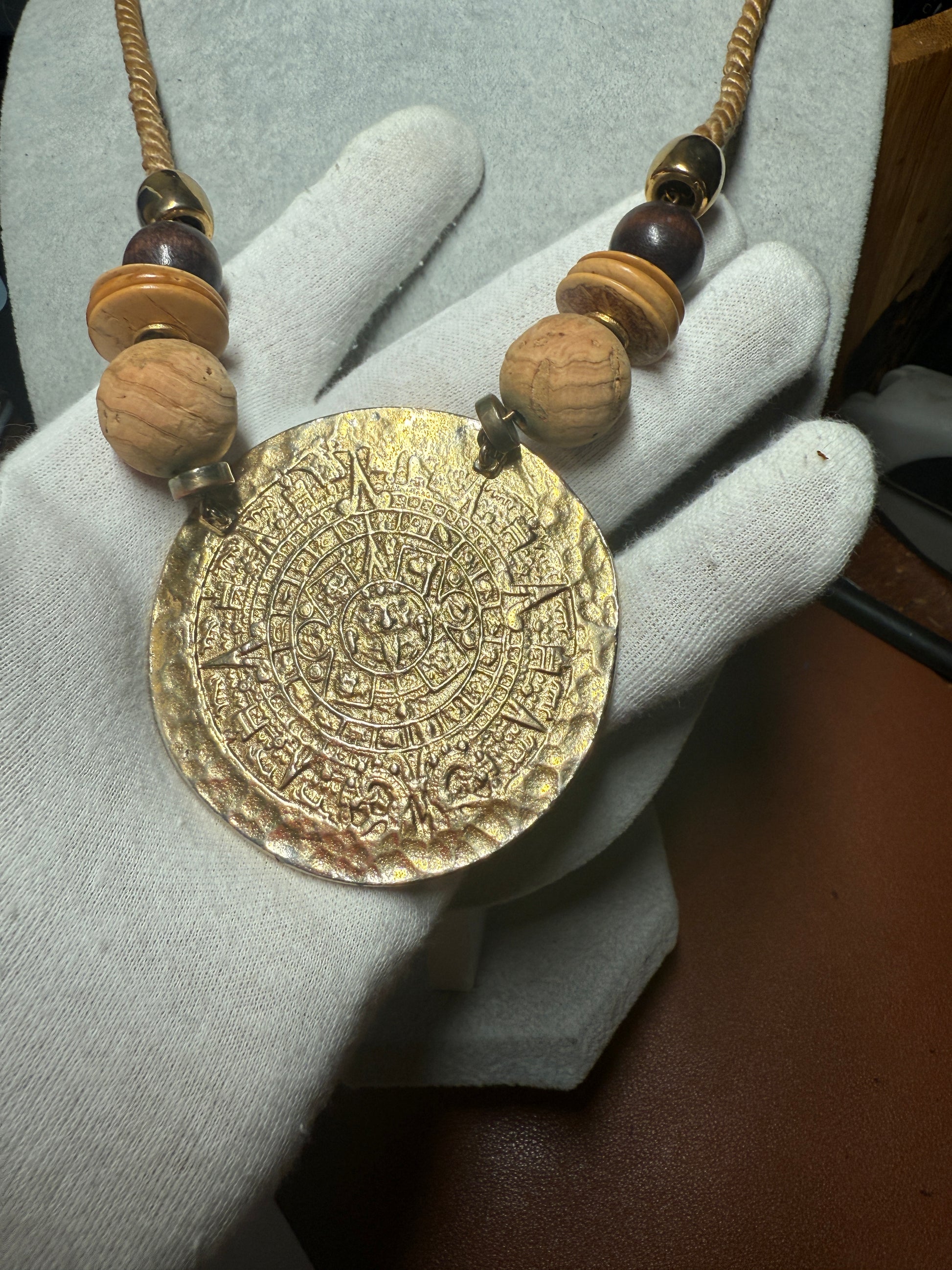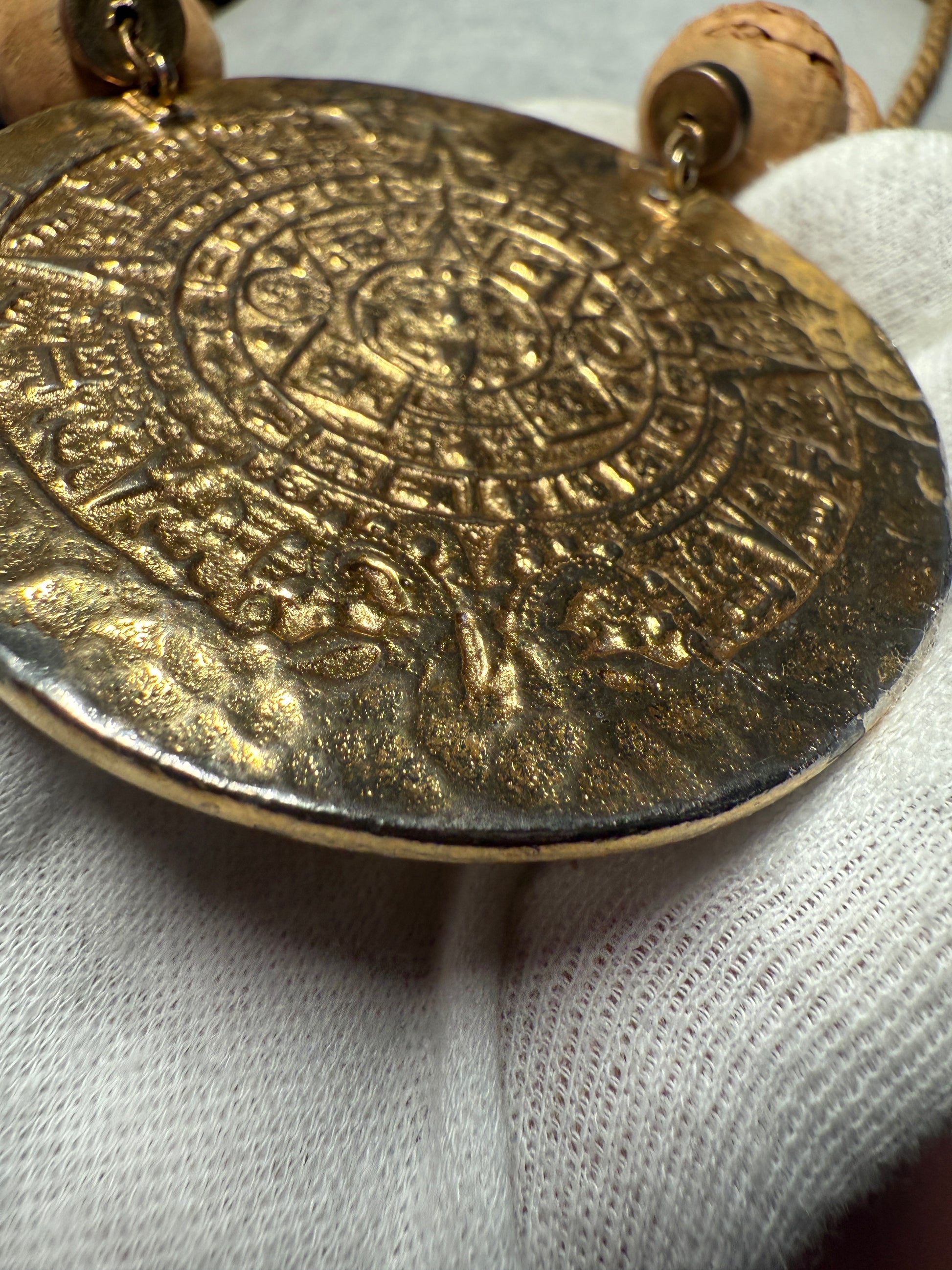 Gold Plated Aztec Calendar Pendant Medallion Necklace, Vintage, Handmade