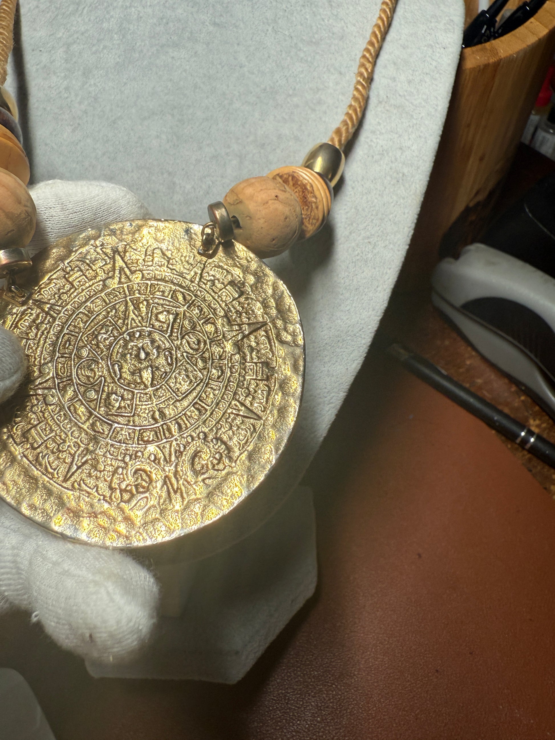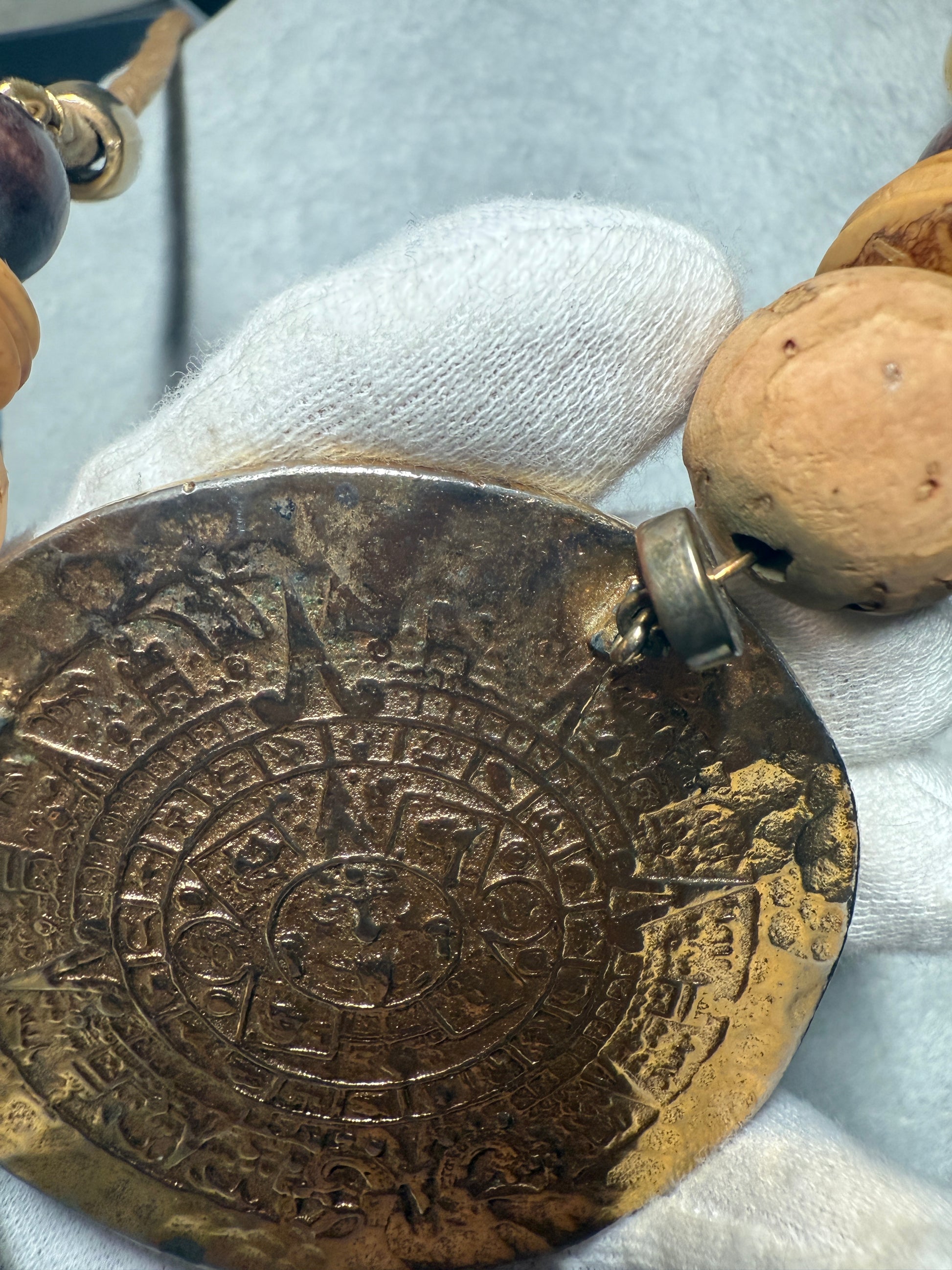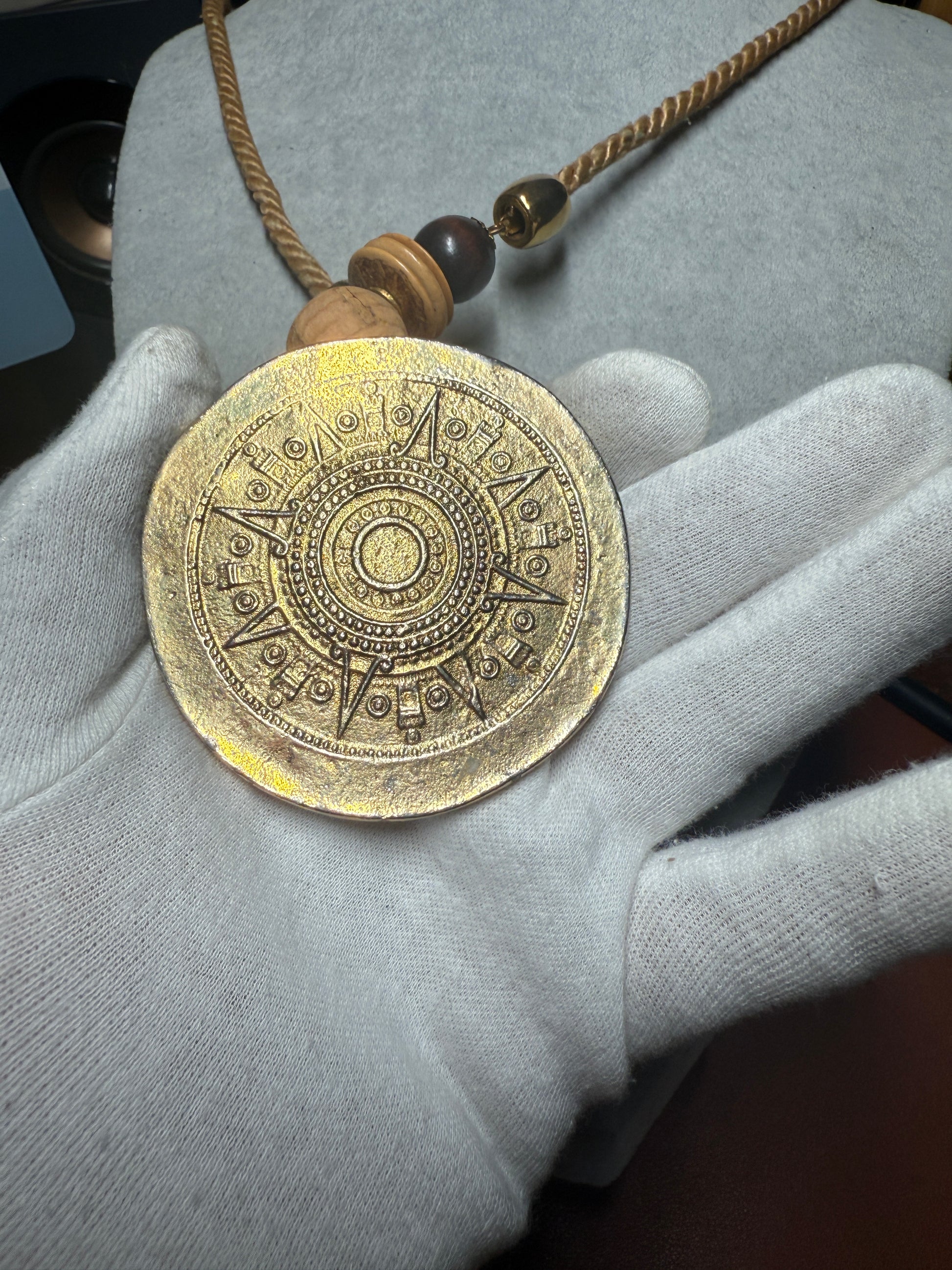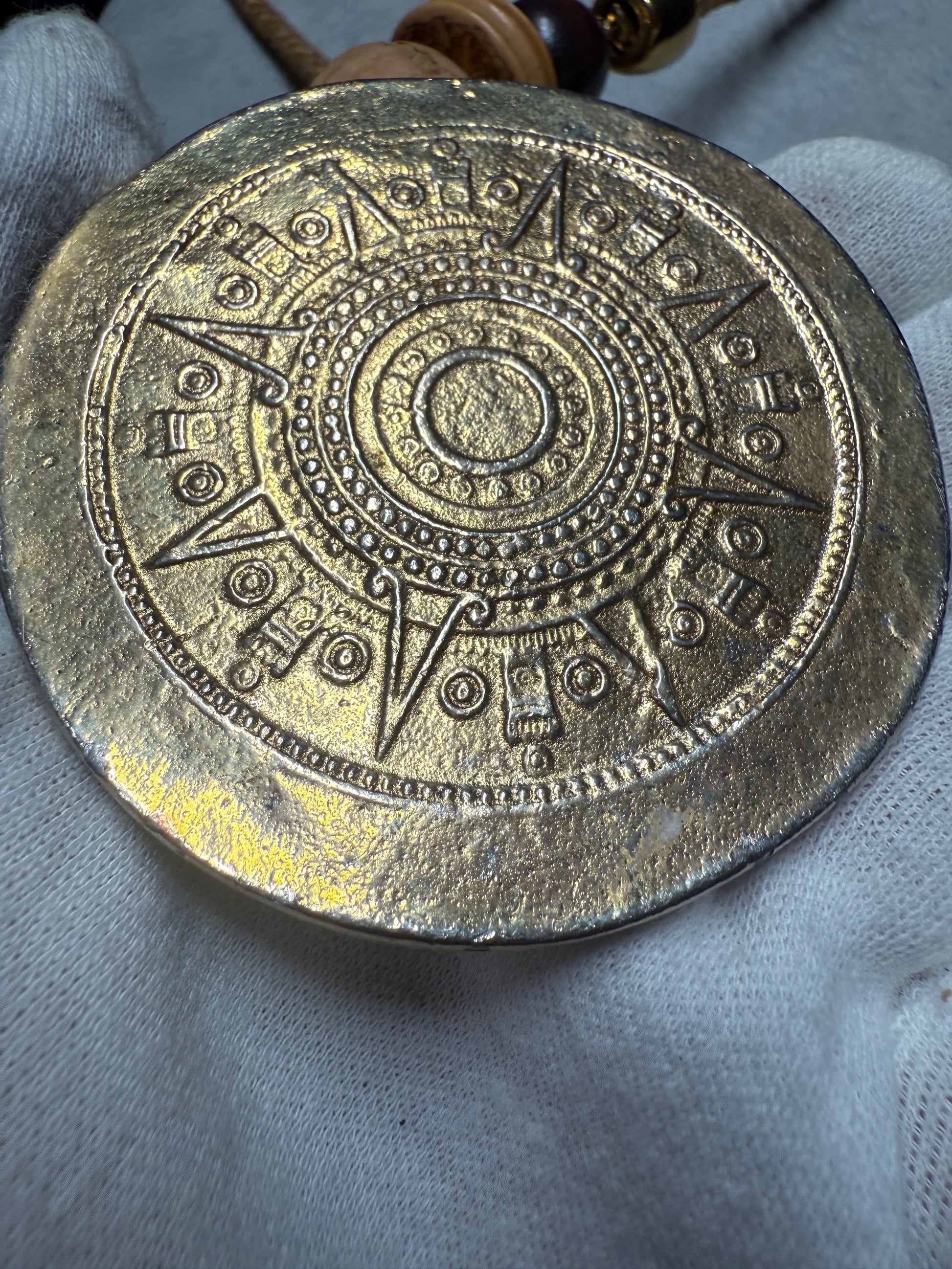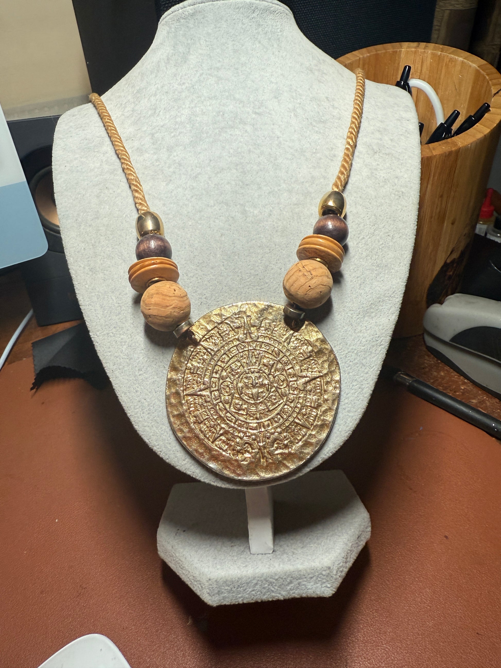 Gold Plated Aztec Calendar Pendant Medallion Necklace, Vintage, Handmade
