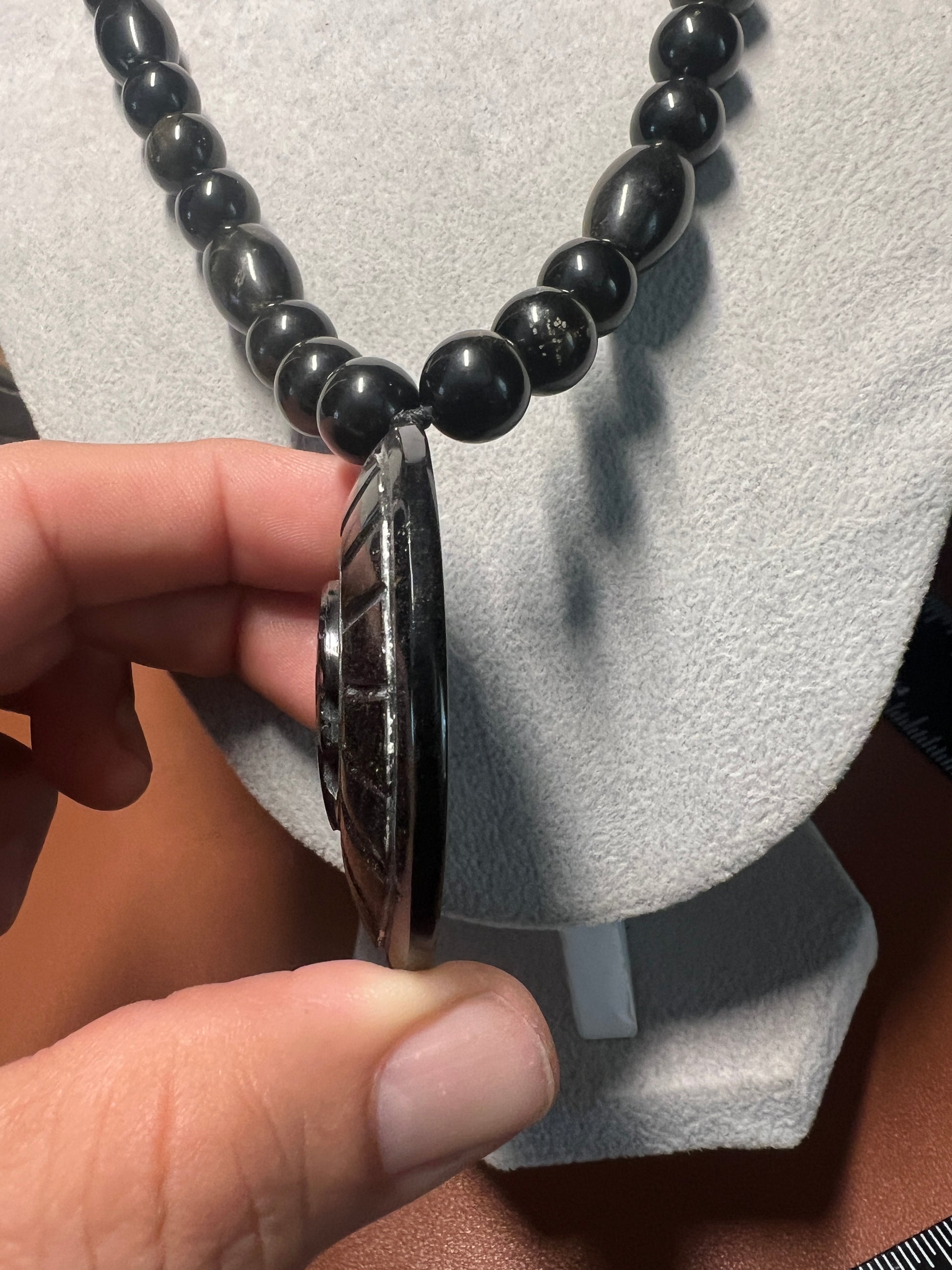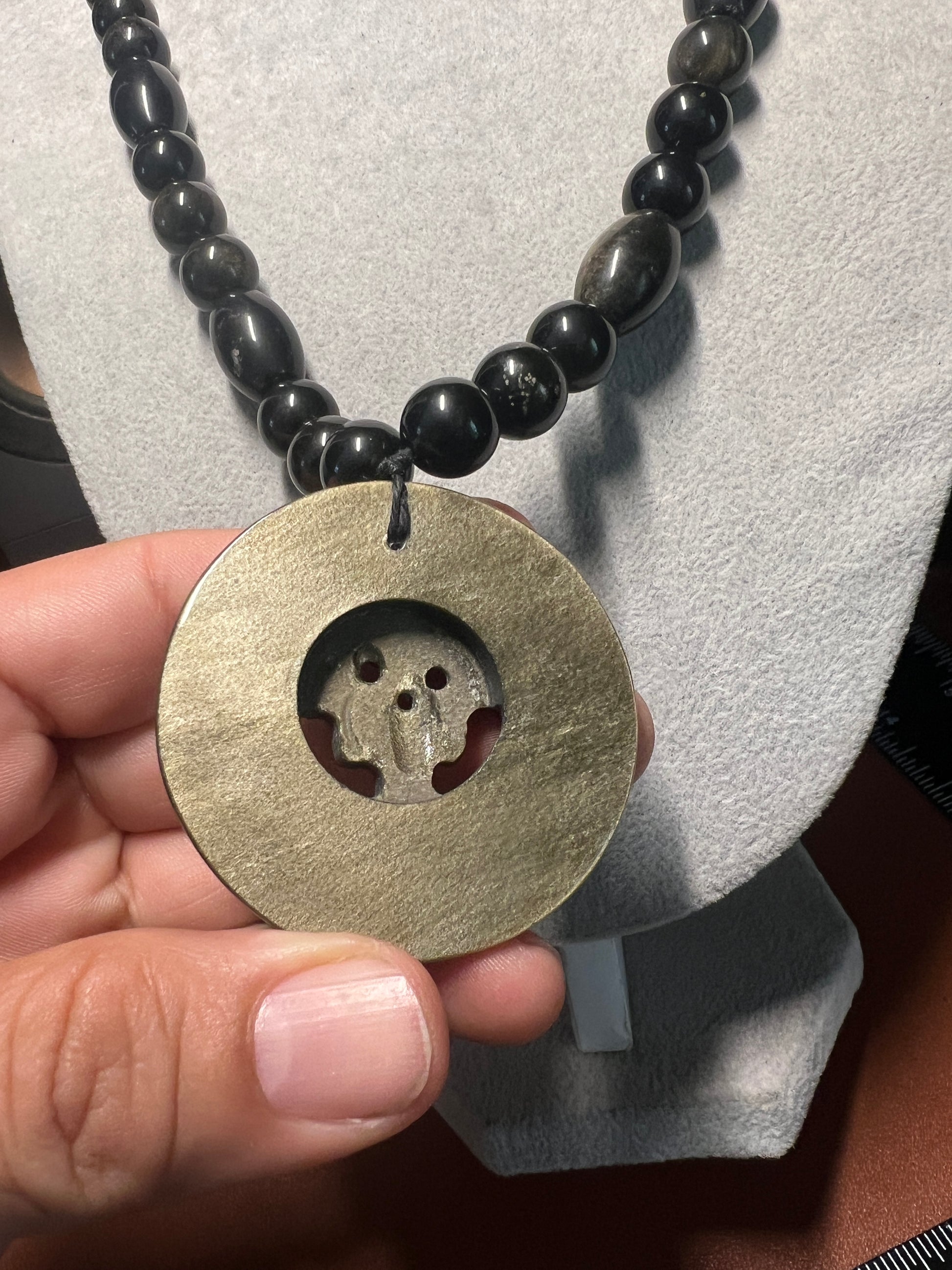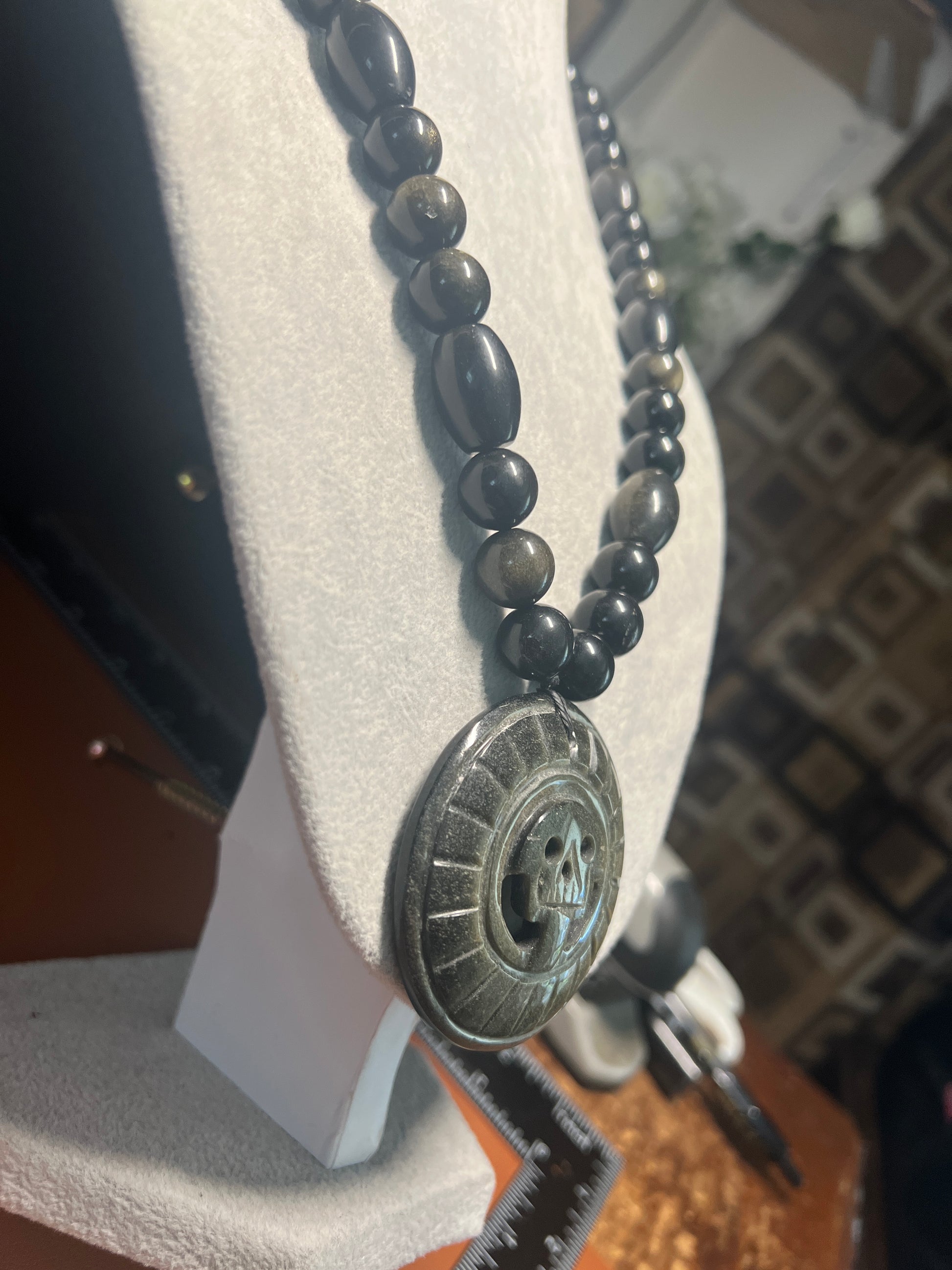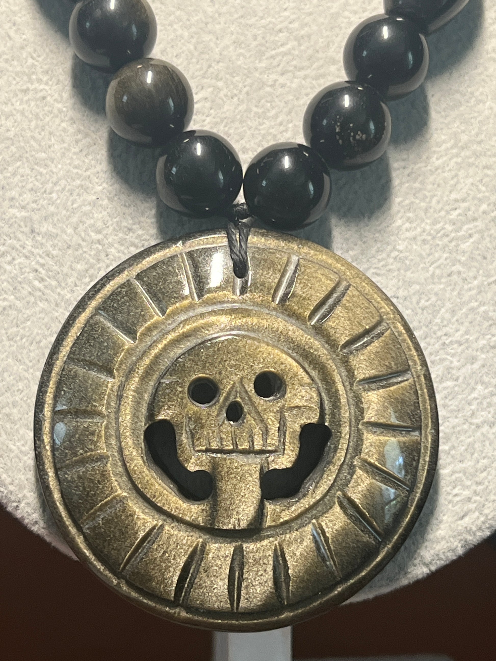 Gold Sheen Obsidian Full Circle Piedra De Muerte Pendant Beaded Necklace, The Stone of Death, Mictlantecuhtli, Handmade, Mexico, Prehispanic Jewelry (#16)