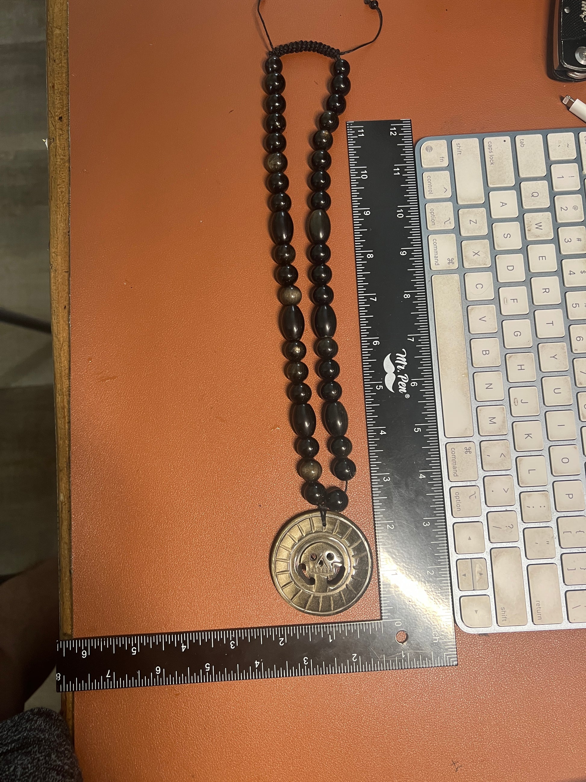 2 1/8" pendant, 24 inch beaded adjustable necklace.