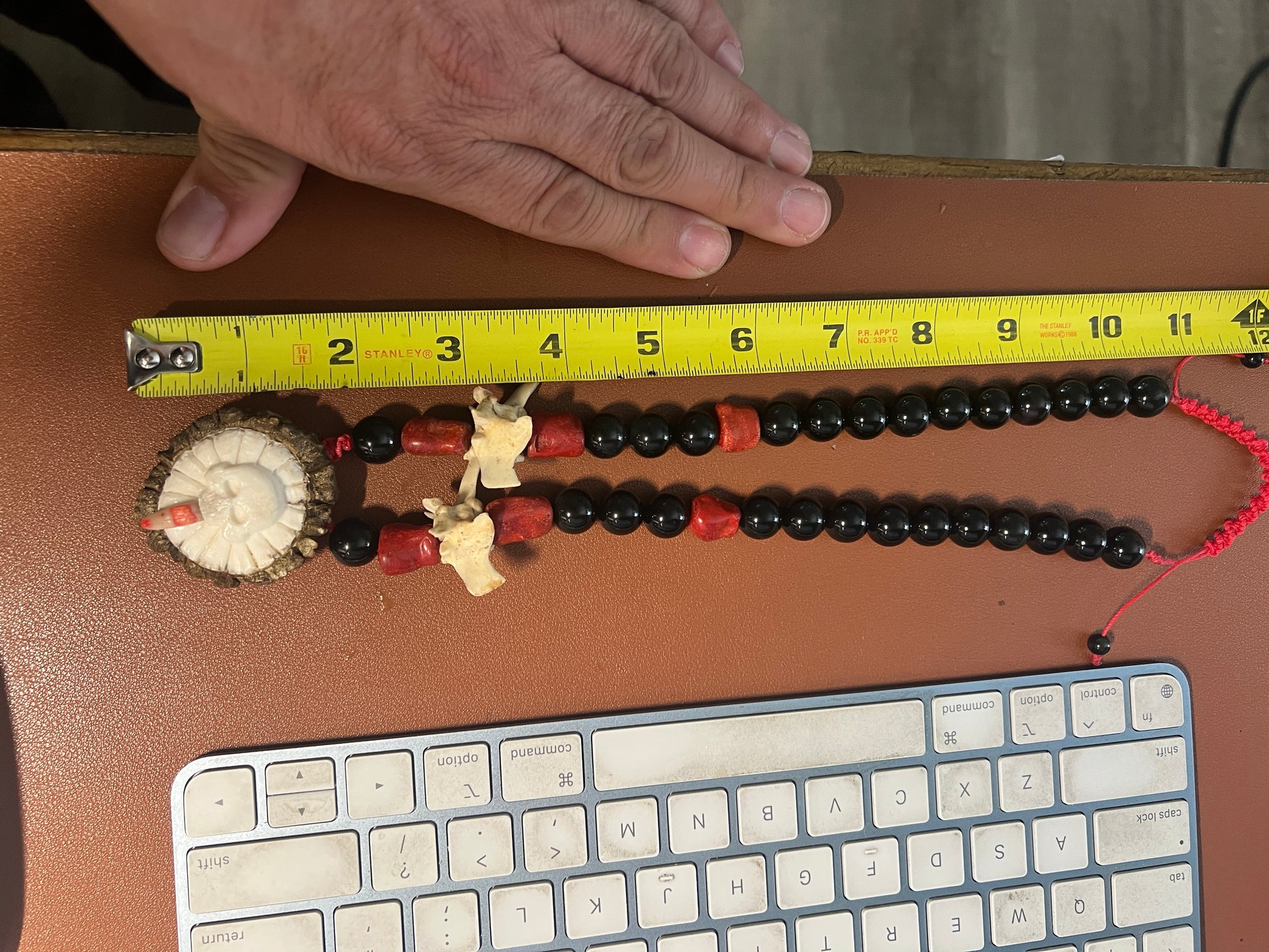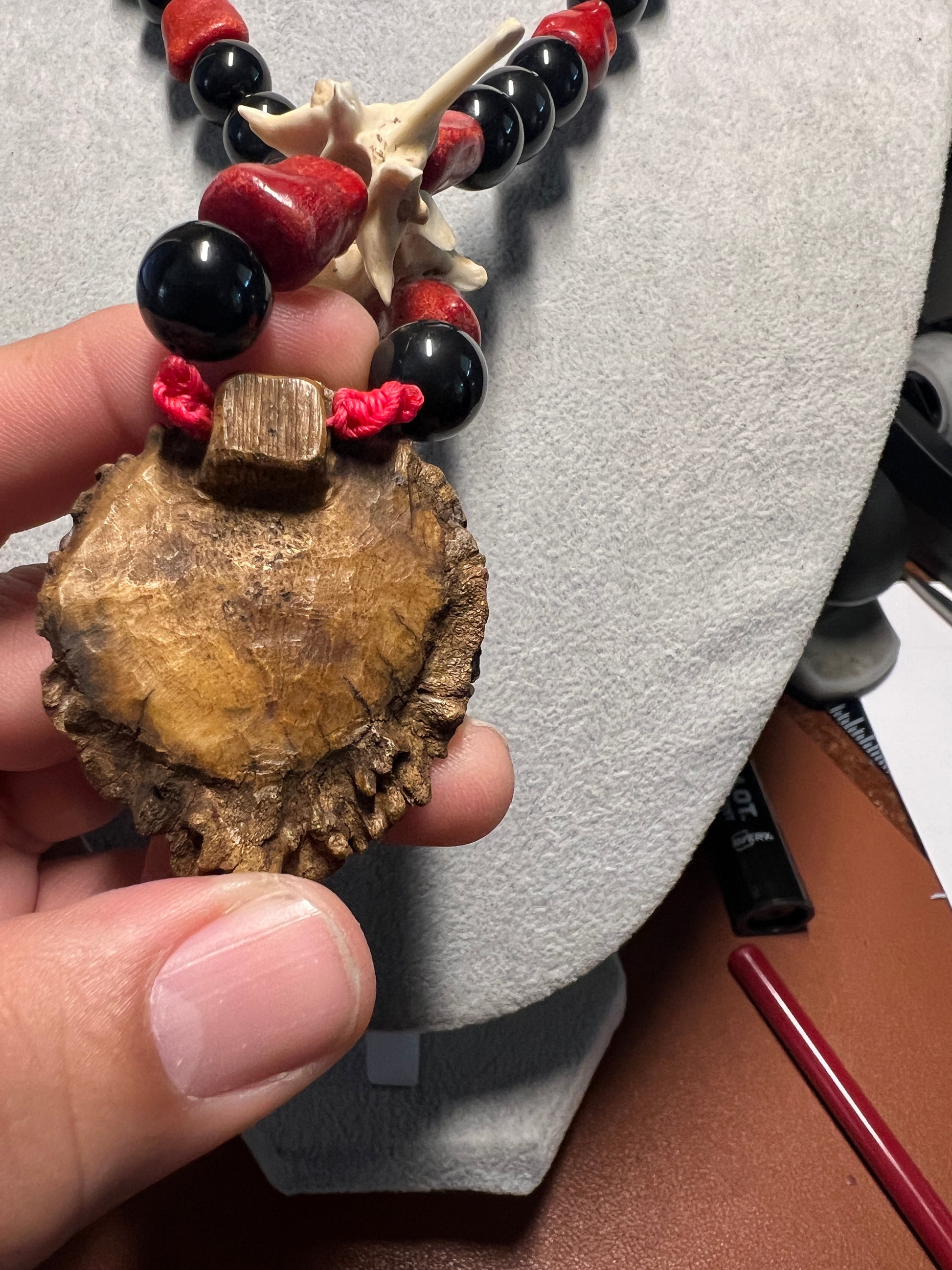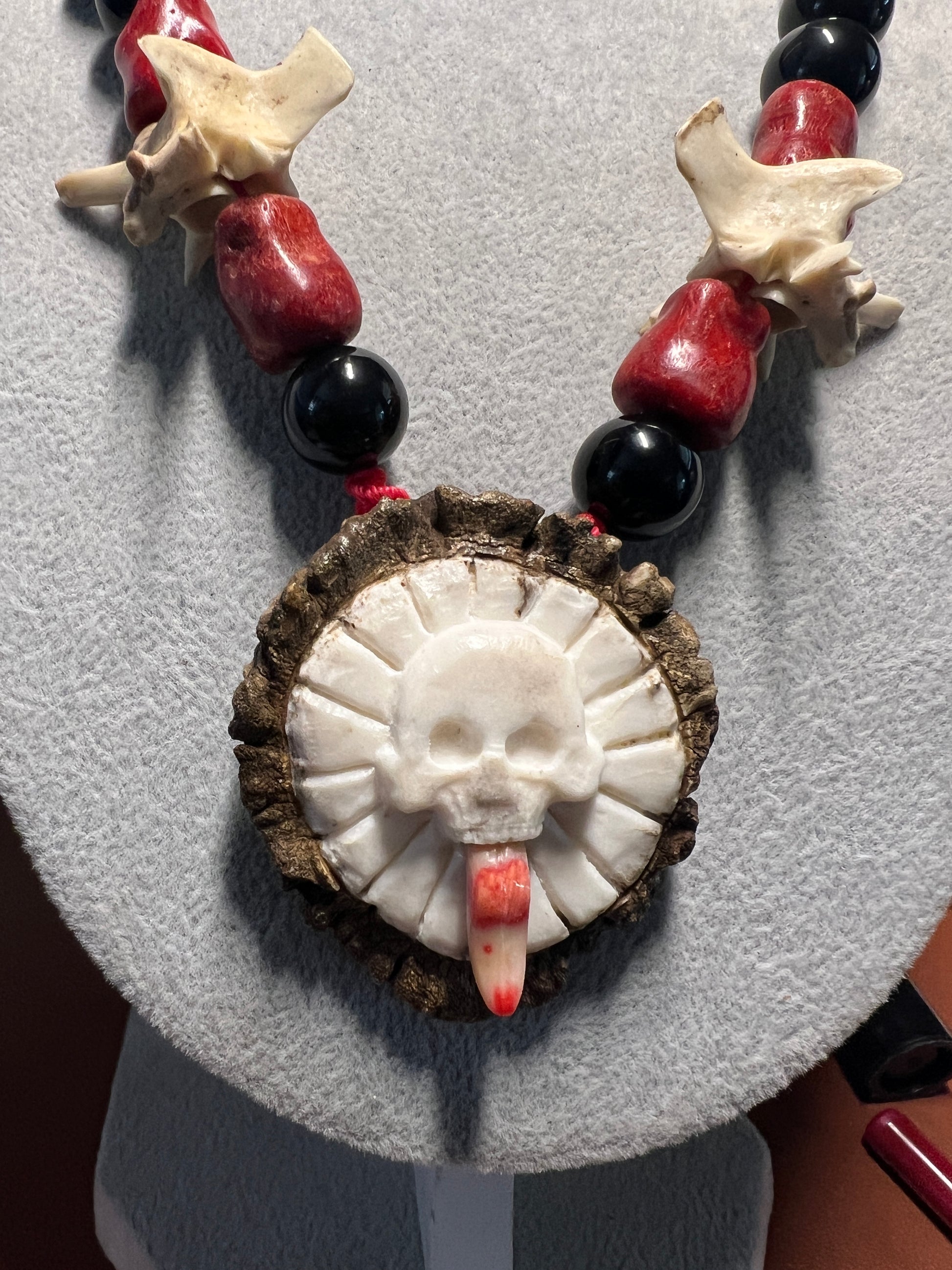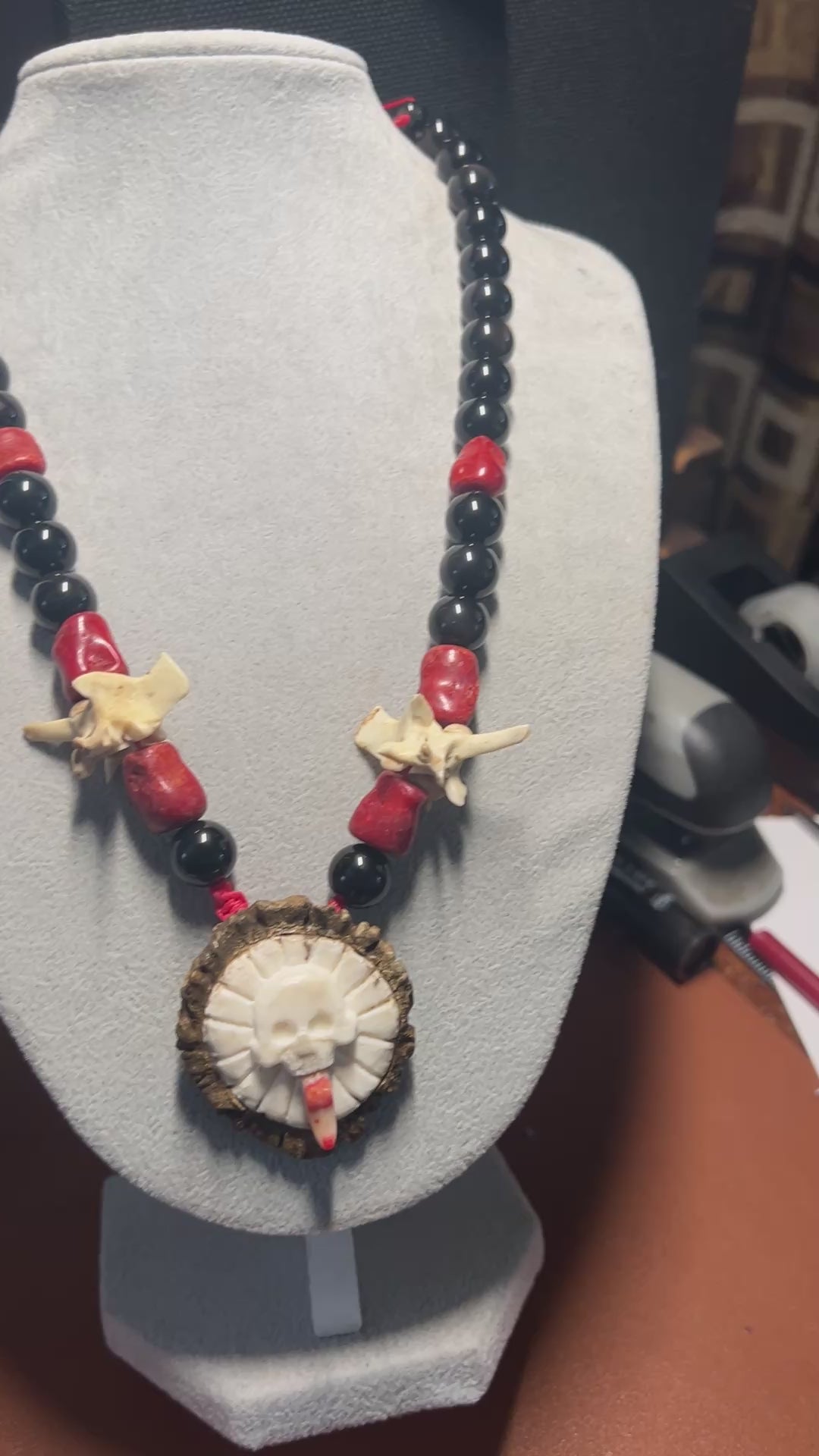 Discover the cultural richness and artisanal craftsmanship in the Mexica Tribe Piedra De Muerte Pendant Necklace. This piece is a stunning blend of tradition and style, featuring a striking Aztec stone of death pendant that's beautifully carved from deer antler (deer rosetta) and deer bone for the brown colored backing. The beaded necklace is of Aztec translucent garnet spheres, red coral, and Snake Spines / Vertebrae and adds a touch of natural elegance, making it a unique accessory for those who appreciate the artistry of indigenous cultures. With its intricate design and symbolism steeped in history, this necklace is more than just a fashion statement—it's a wearable piece of heritage. Ideal for collectors and enthusiasts of ethnic jewelry, the Piedra De Muerte Necklace is a testament to the enduring spirit of the Mexica tribe.