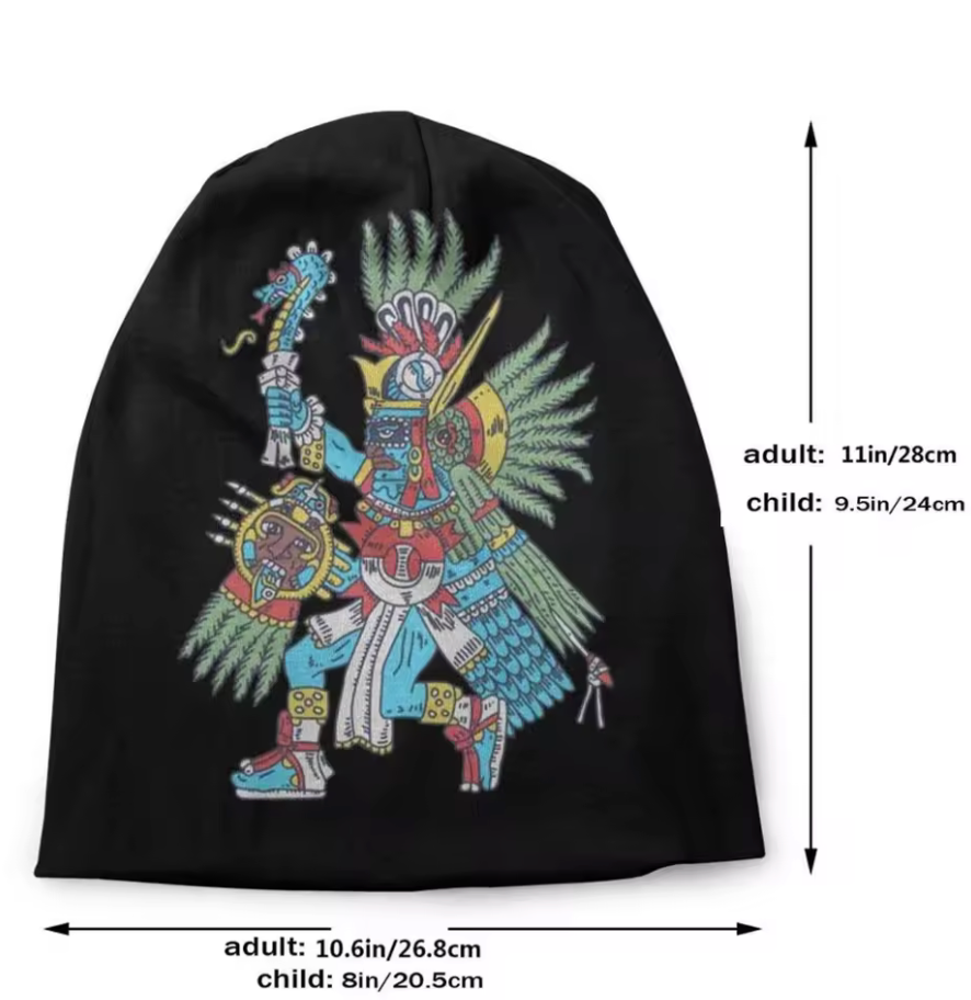 The product is a beanie featuring an artistic design of Huitzilopochtli, the Aztec god of sun and war, from the Mexica Tribe. It is suitable for both men and women, making it a unisex accessory for adults. The beanie comes in a multicolor style, offering a vibrant and cultural look inspired by Aztec deity imagery. Perfect for adding a touch of unique and historical flair to any outfit, this one-size-fits-most beanie is a trendy choice for those interested in showcasing their appreciation for Aztec culture.