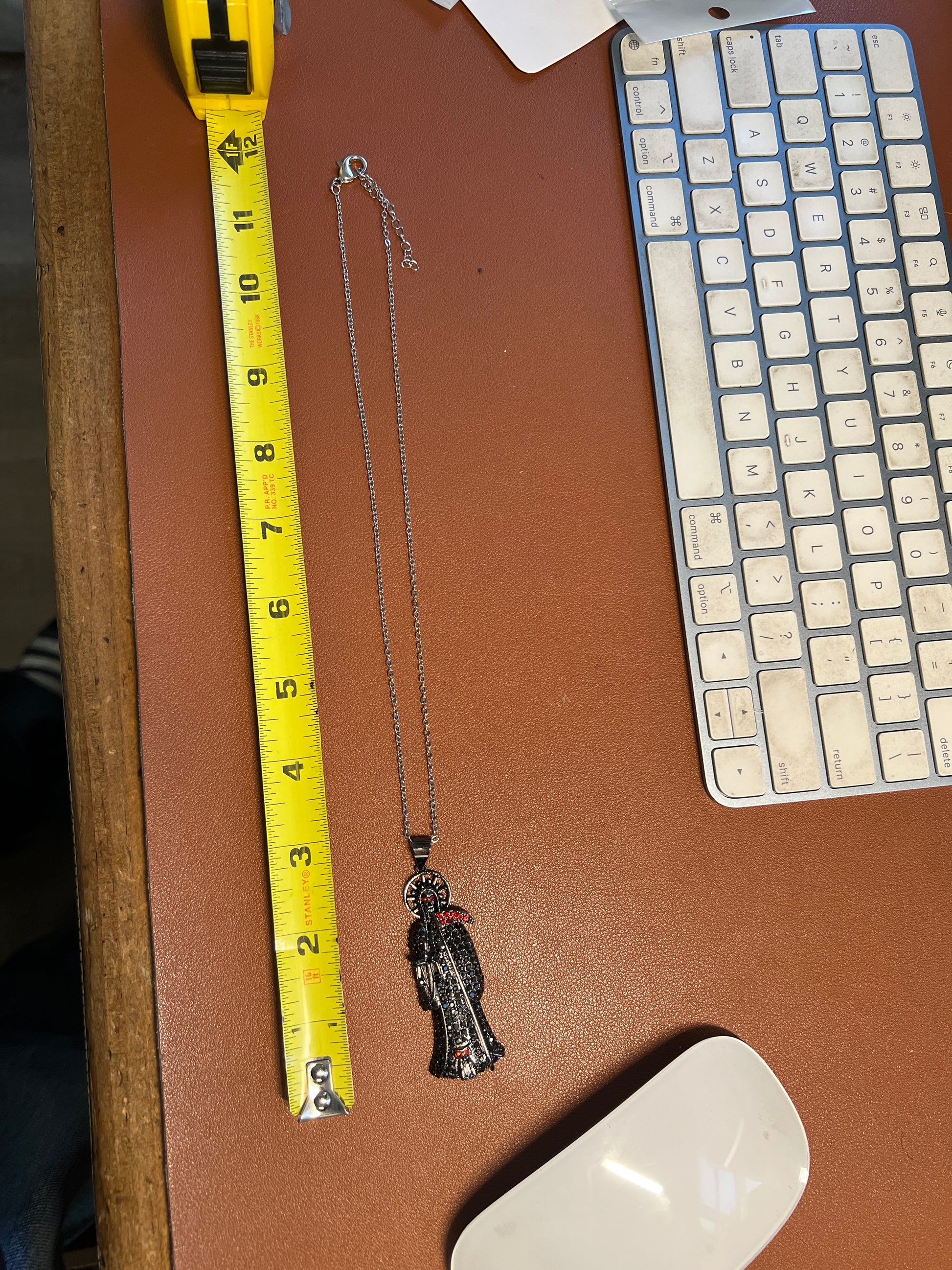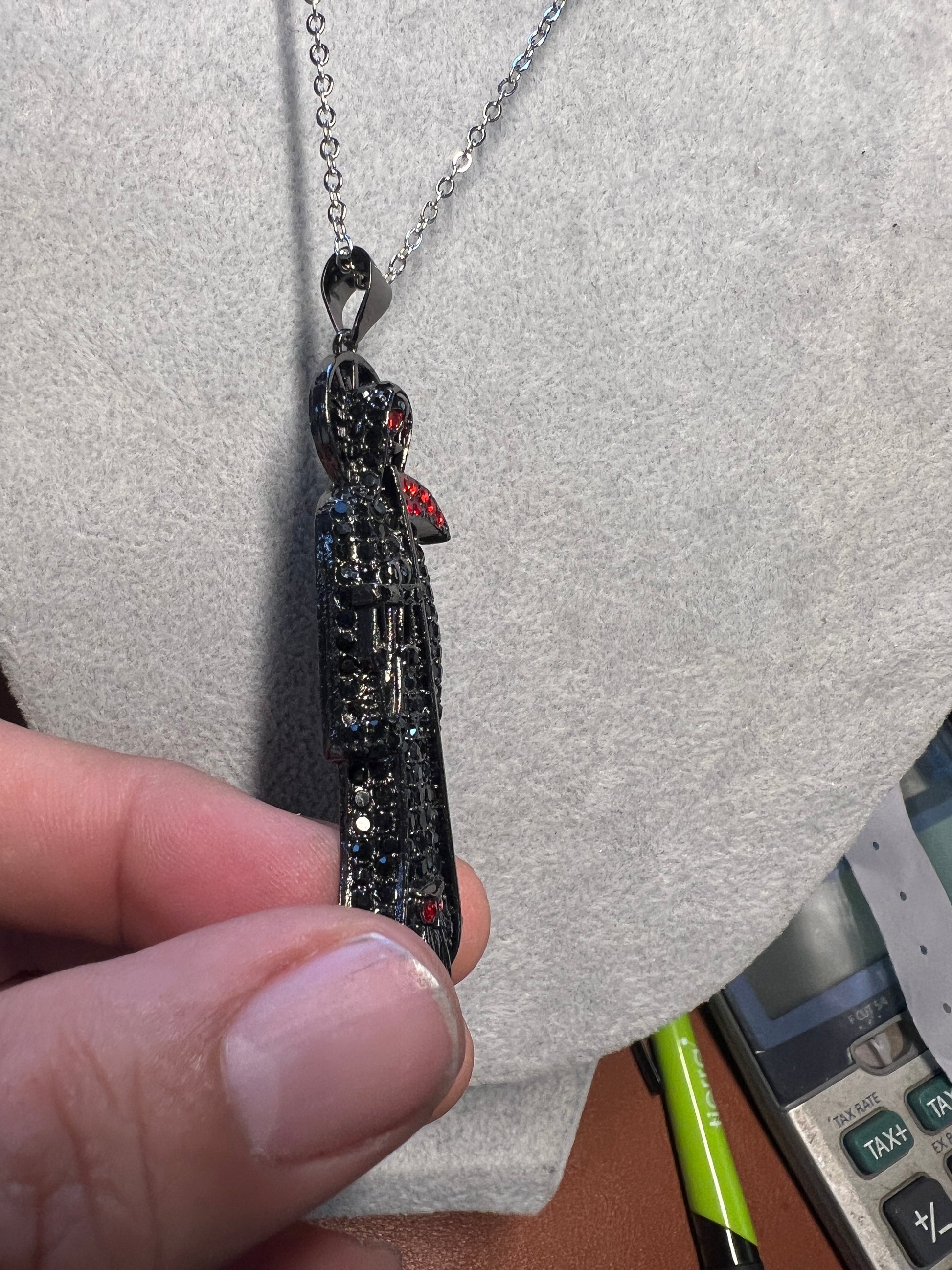 This pendant necklace features a design of a black Santa Muerte charm, symbolizing the Holy Death. The pendant is adorned with iced-out red stones that enhance its aesthetic appeal. The chain is made of stainless steel and temporary until you get your own upgraded chain.
