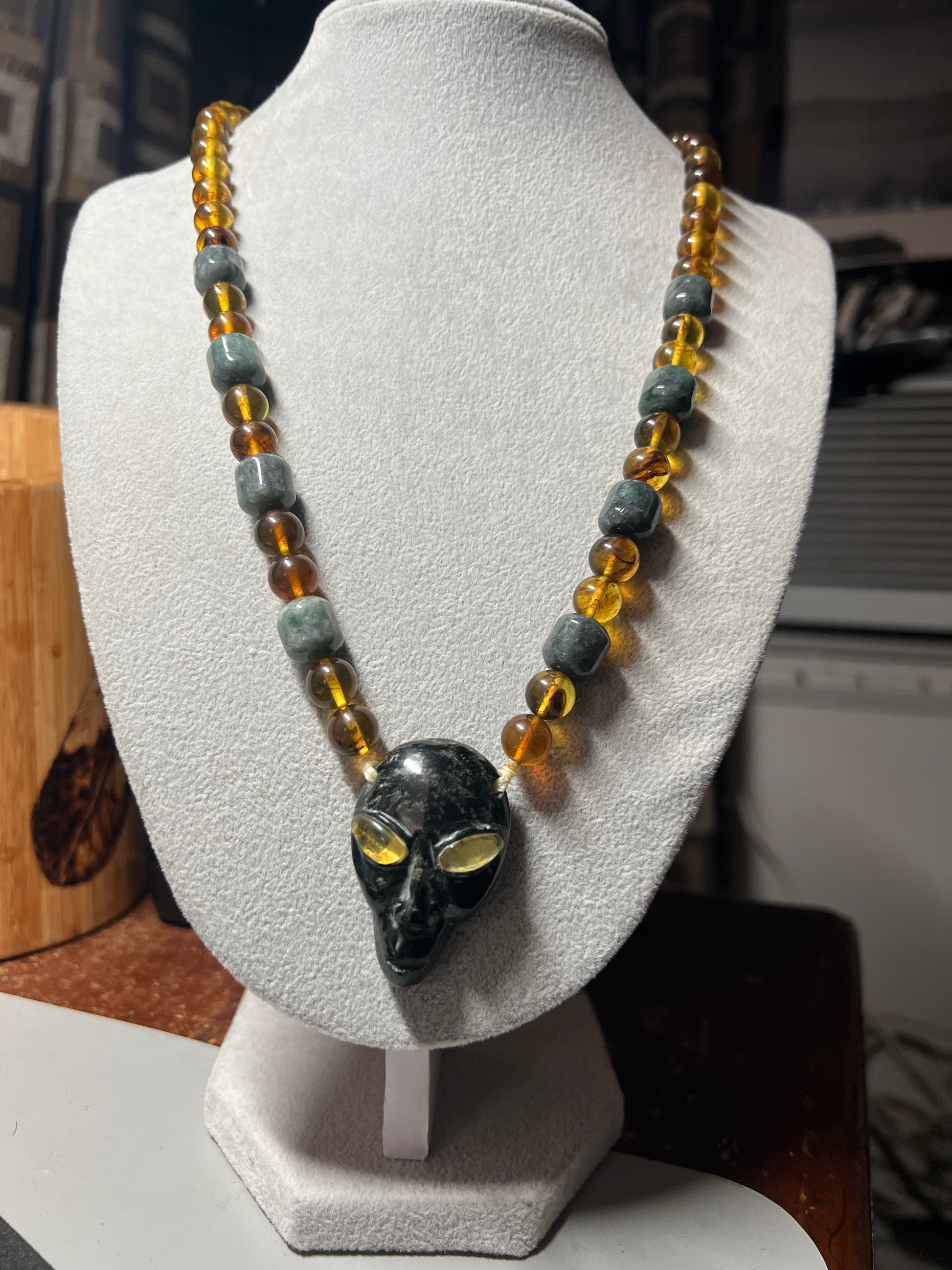 Jade Alien Head, Amber Eyes and Beads from Mexico