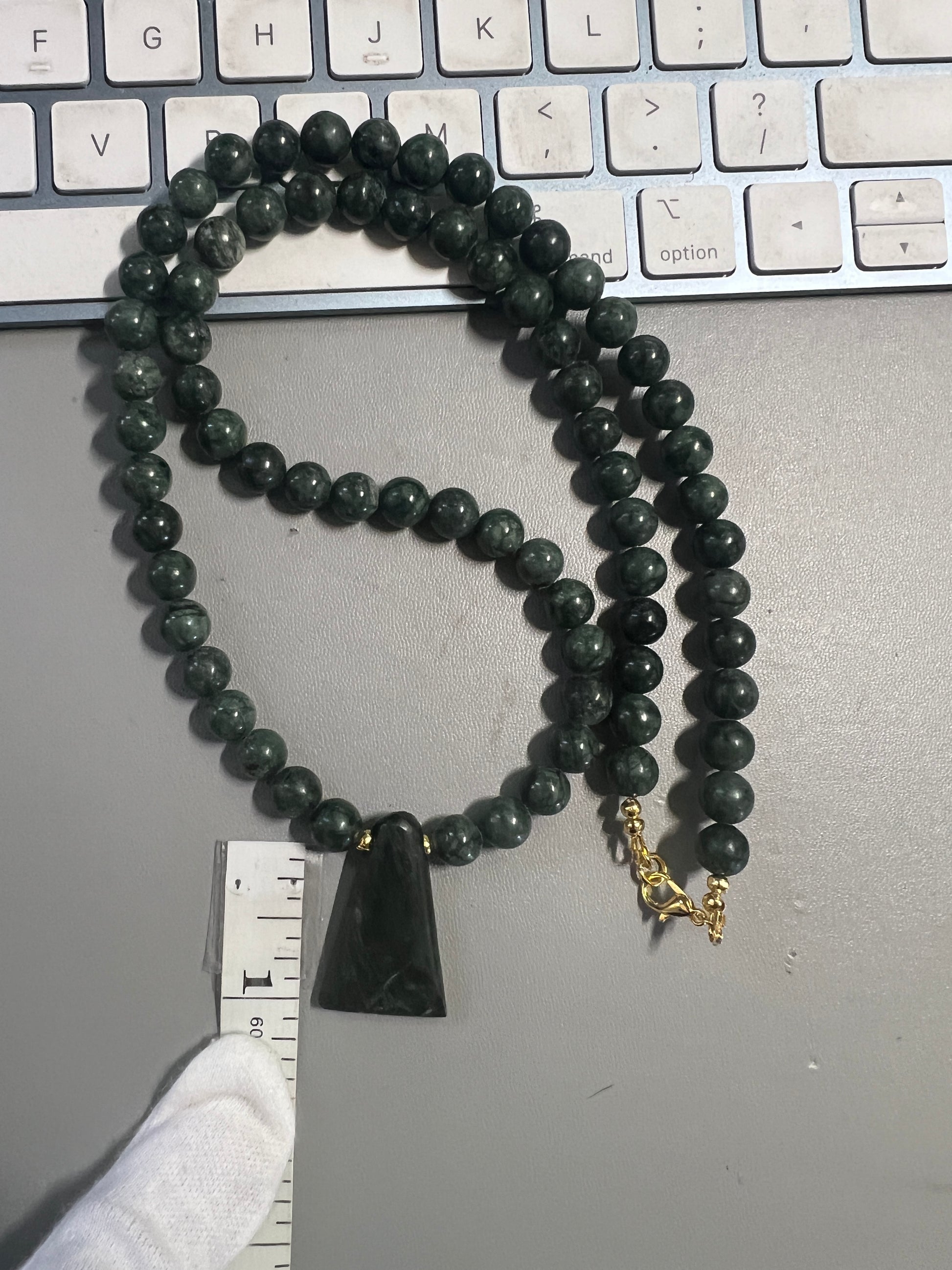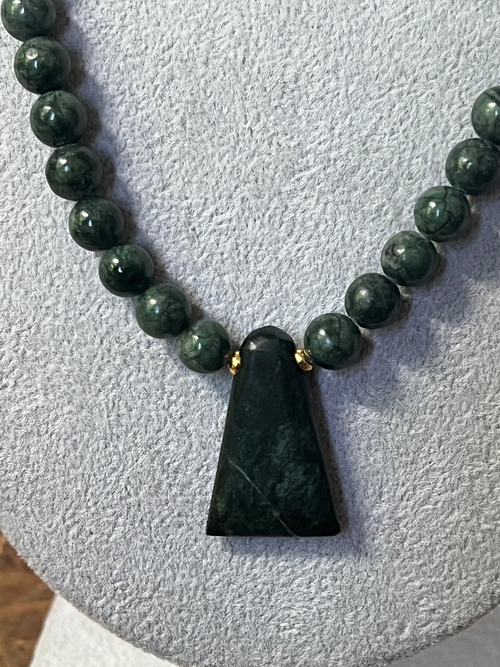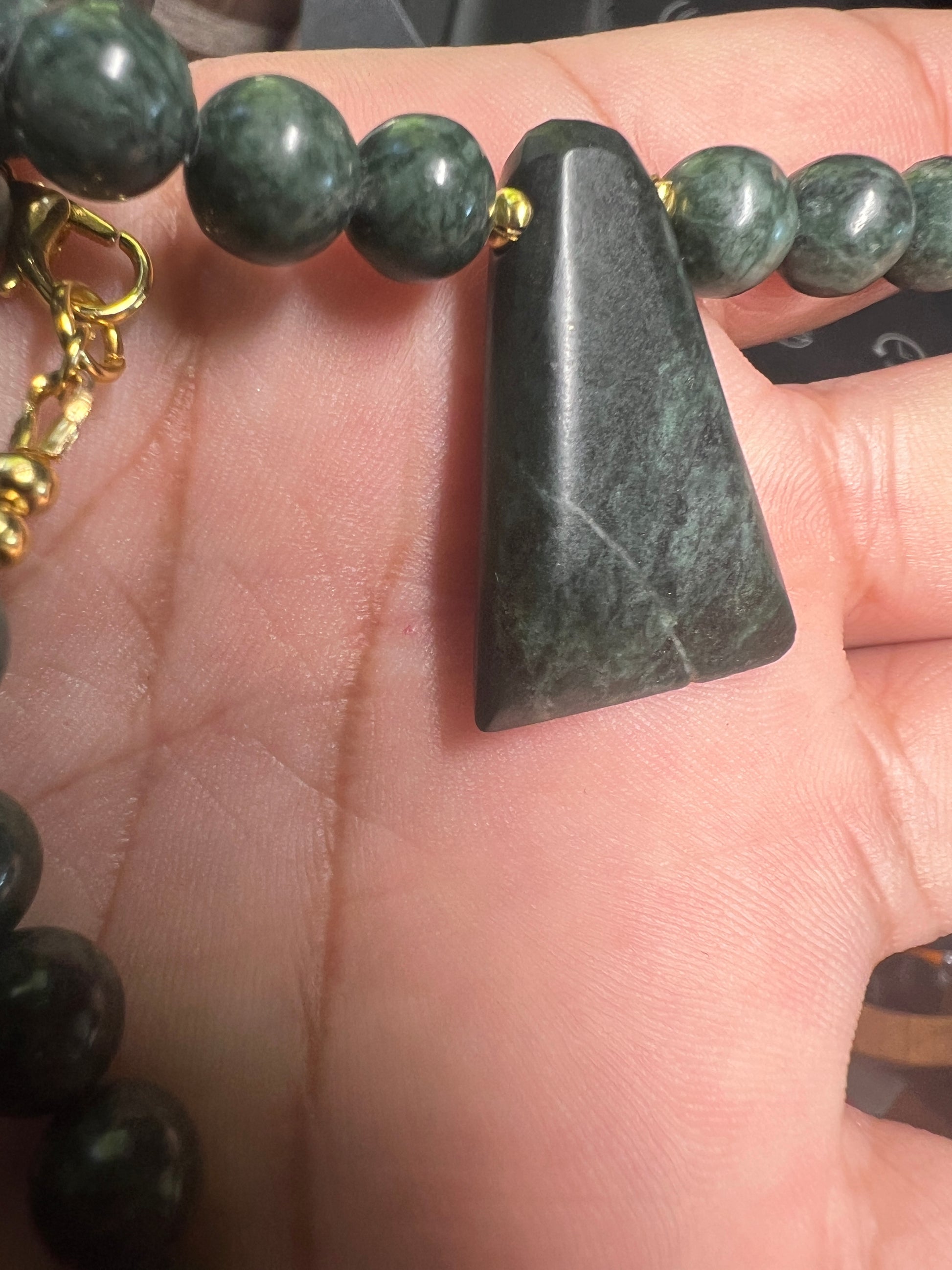 Jade Aztec Axe Beaded Necklace, Hand Made, Guatemalteco Jade Beads. Hecho en Mexico, gold plated clasps and bindings.