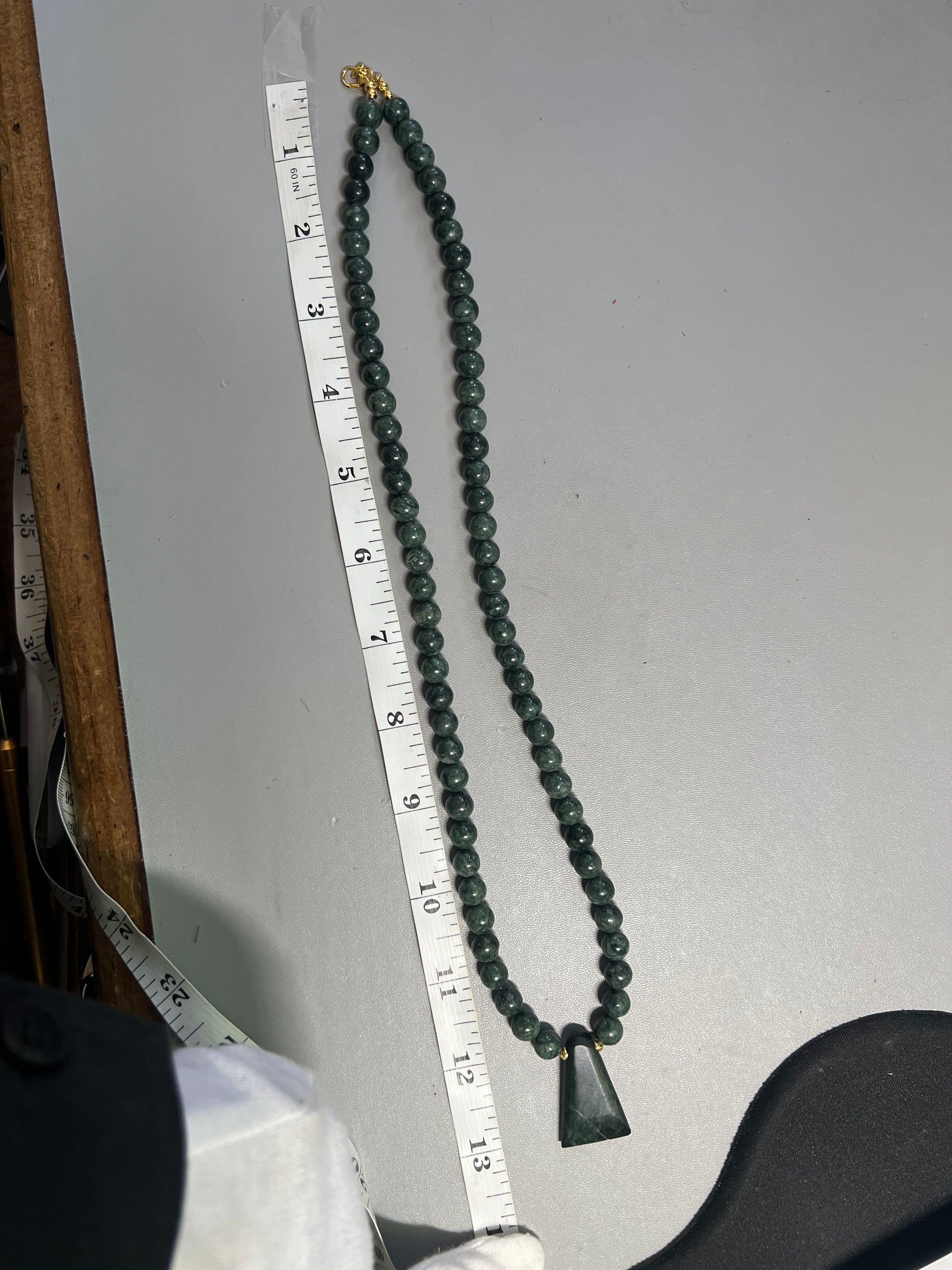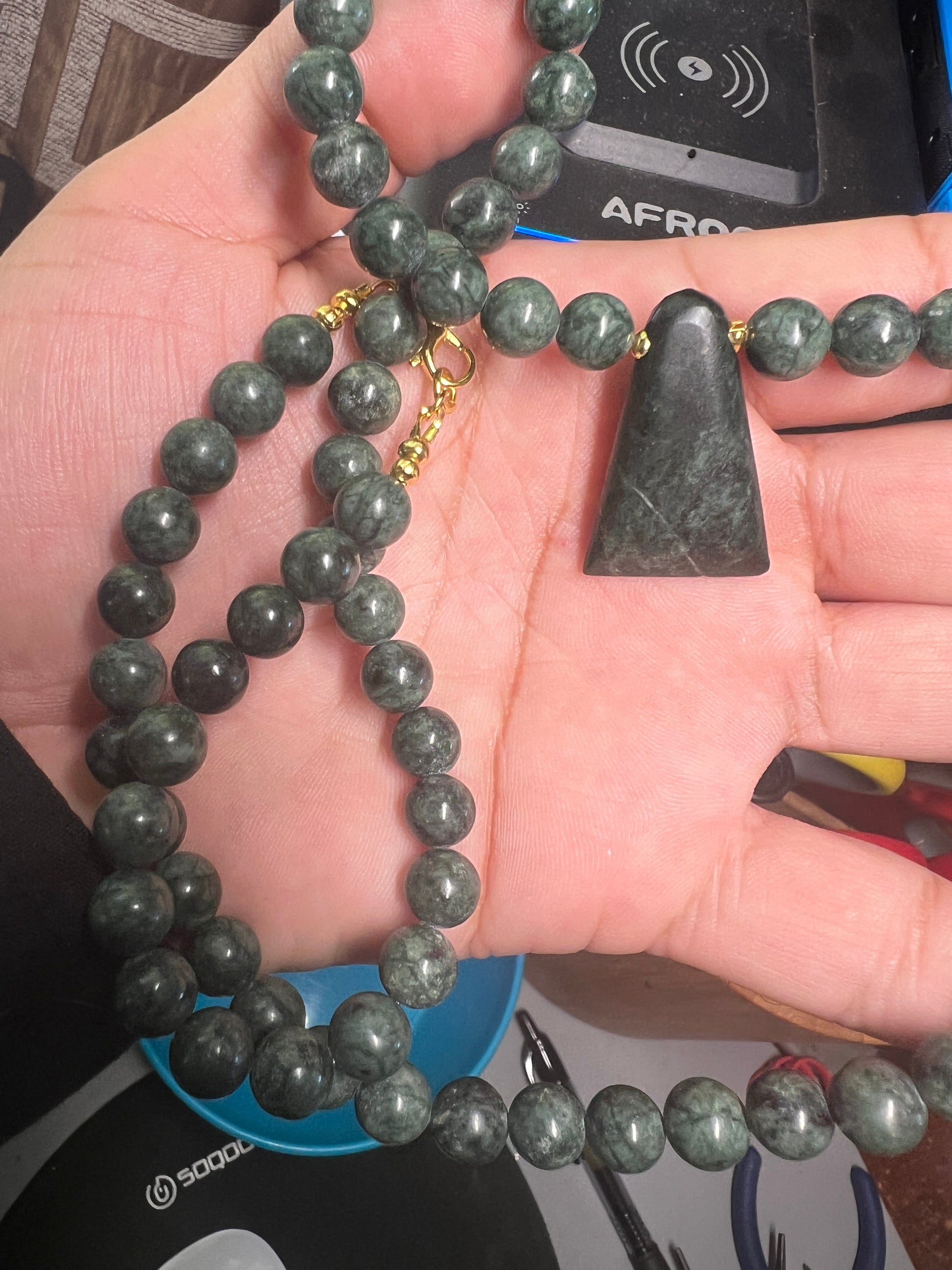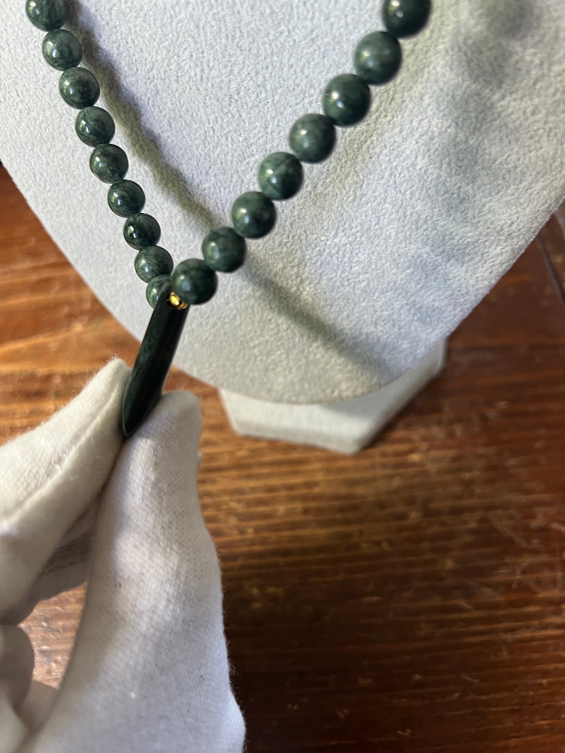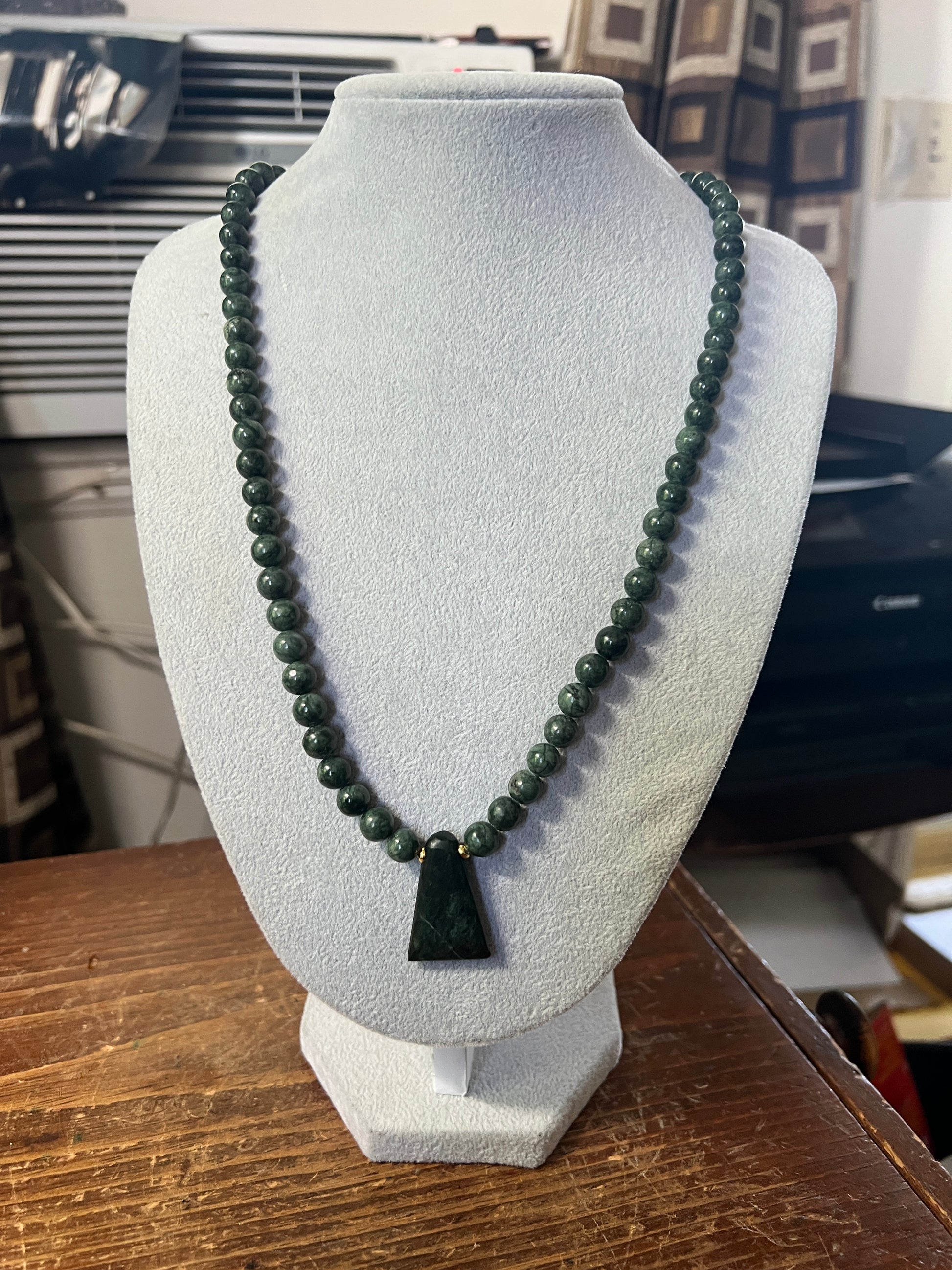 Jade Aztec Axe Beaded Necklace, Hand Made, Guatemalteco Jade Beads. Hecho en Mexico, gold plated clasps and bindings.
