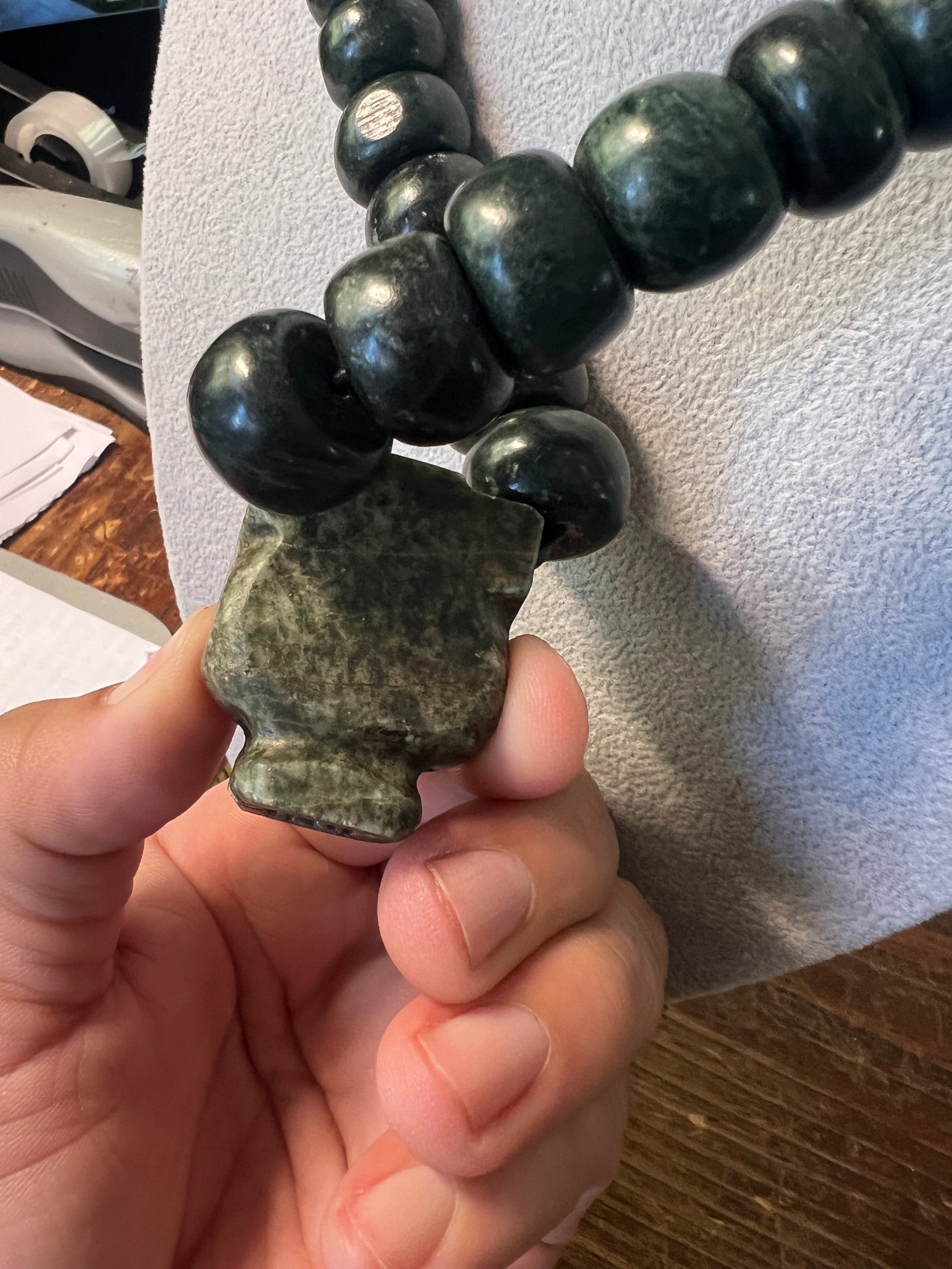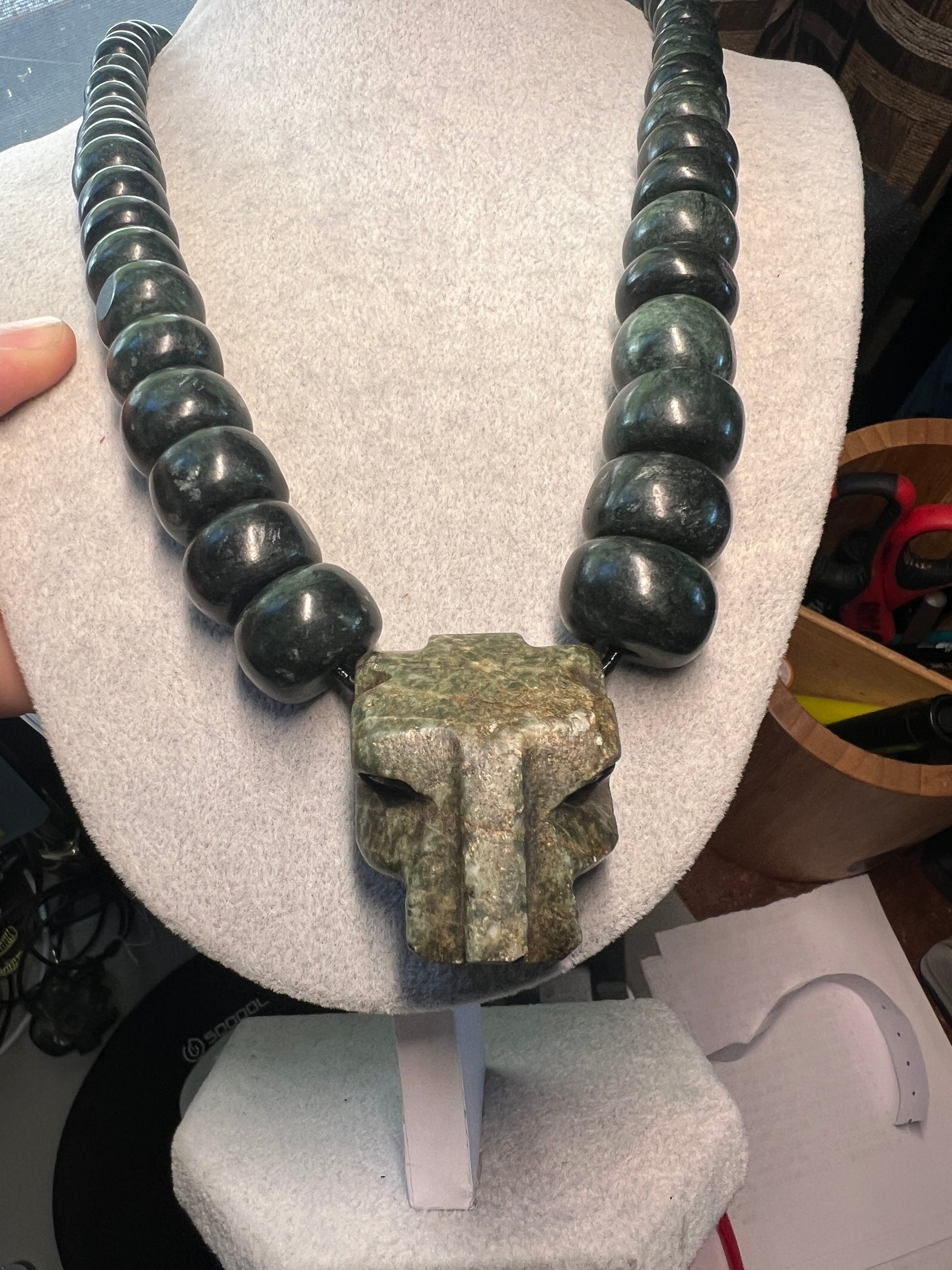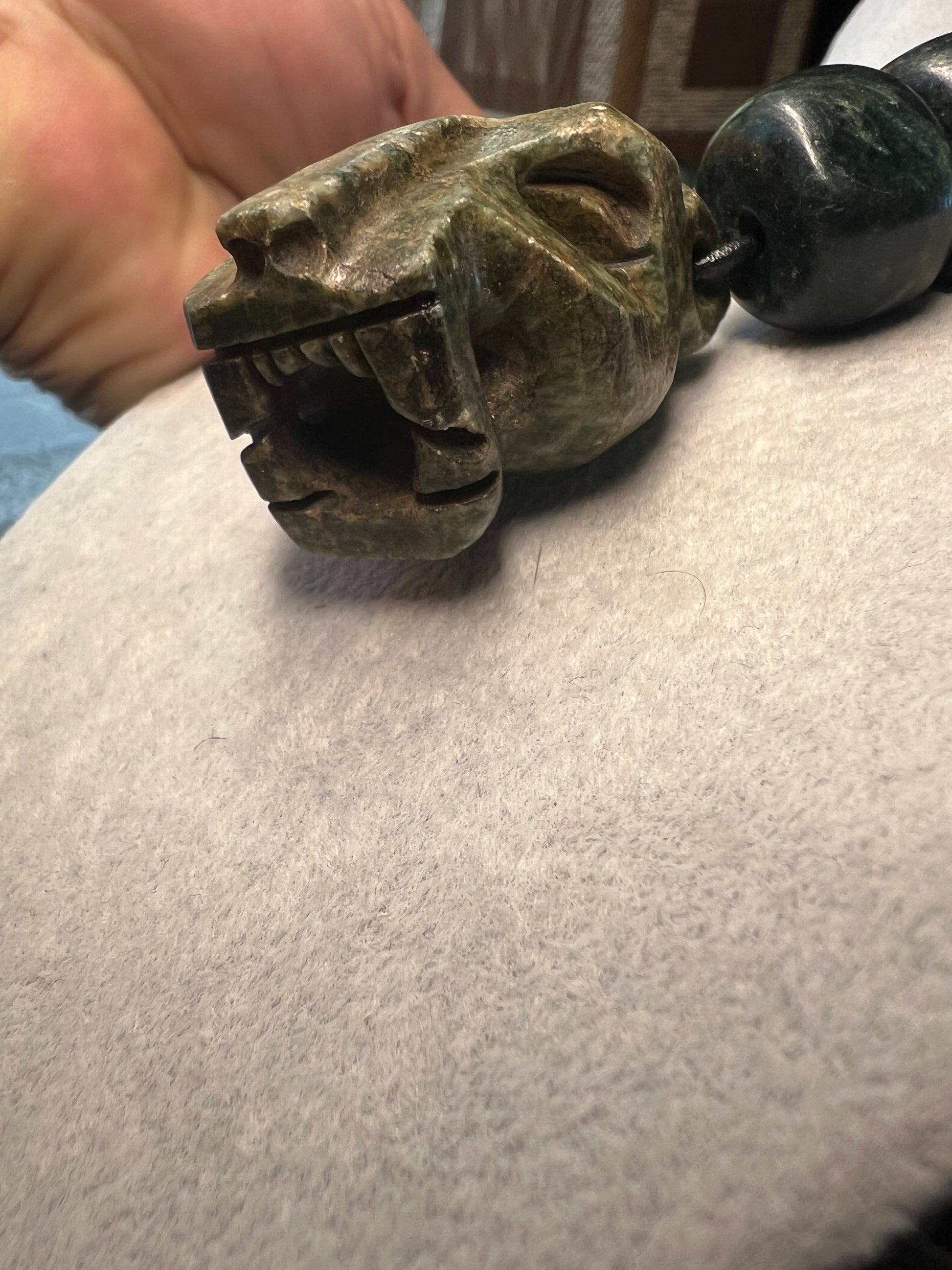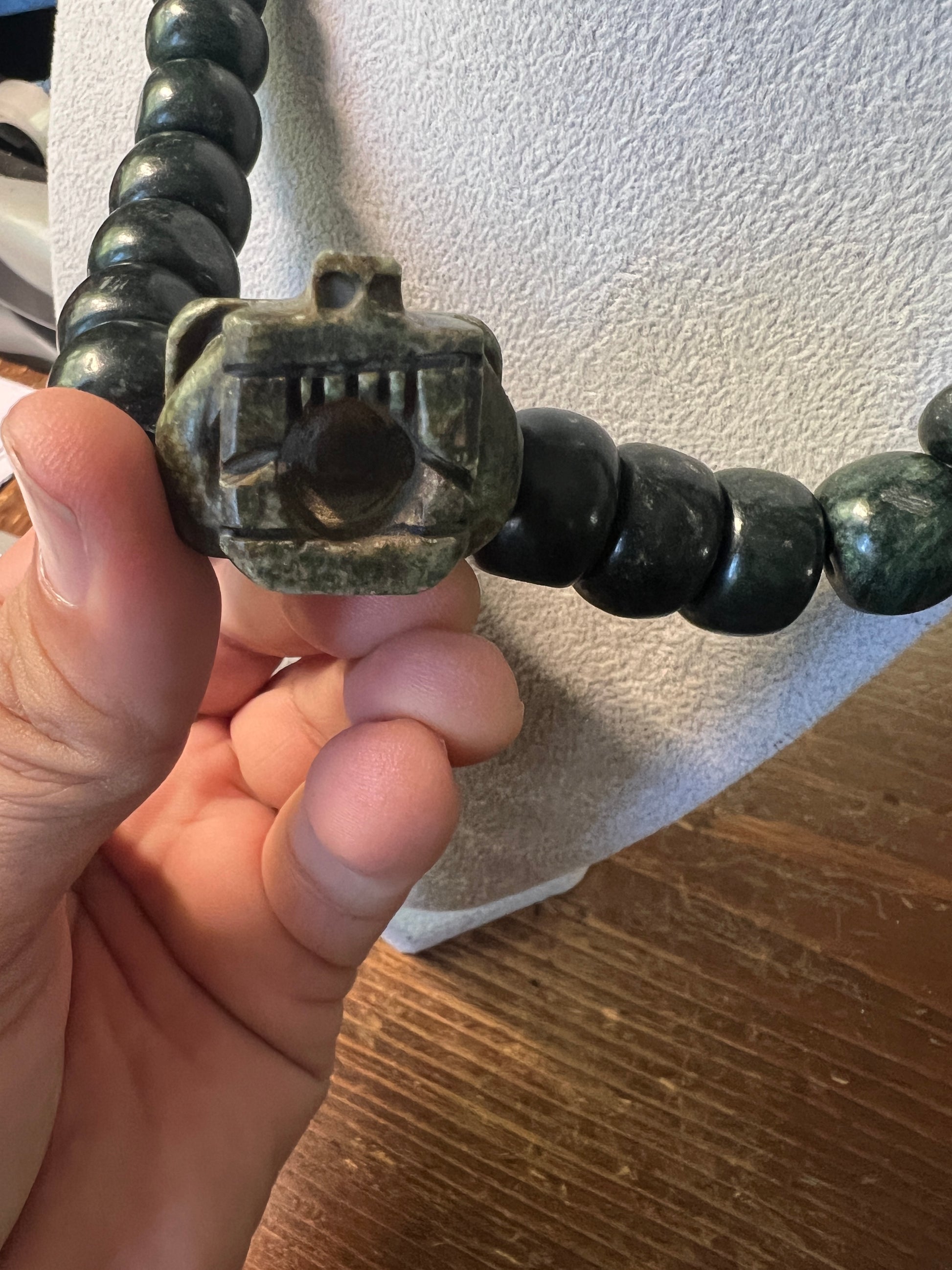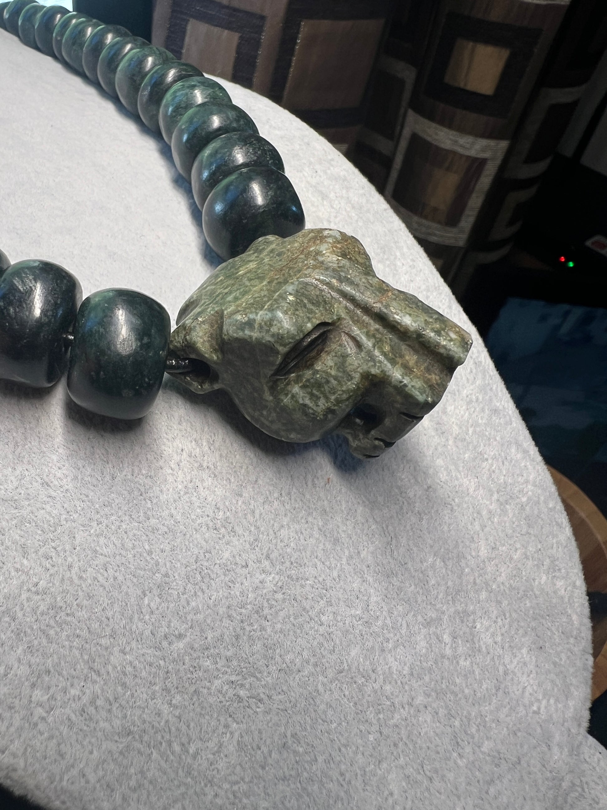 Jaguar Jade Pendant, Jade Beaded Necklace, Aztec, Mexica, Mayan, 24 plus in. long adjustable, Heavy!