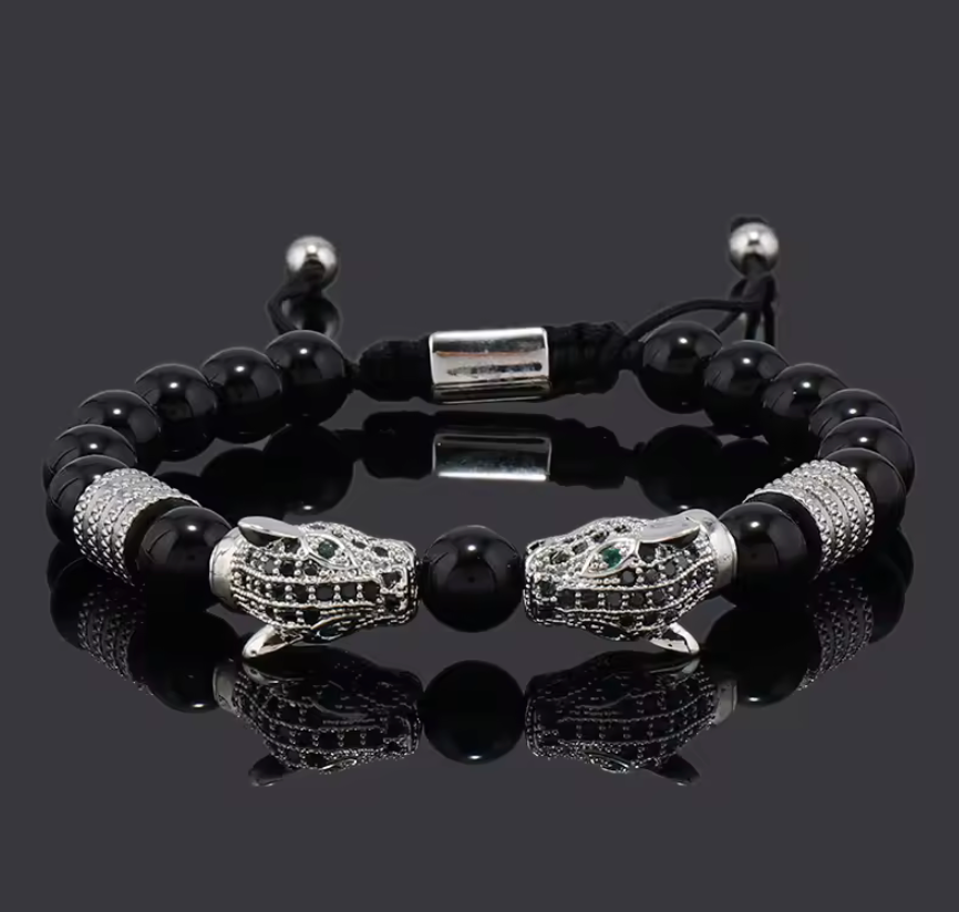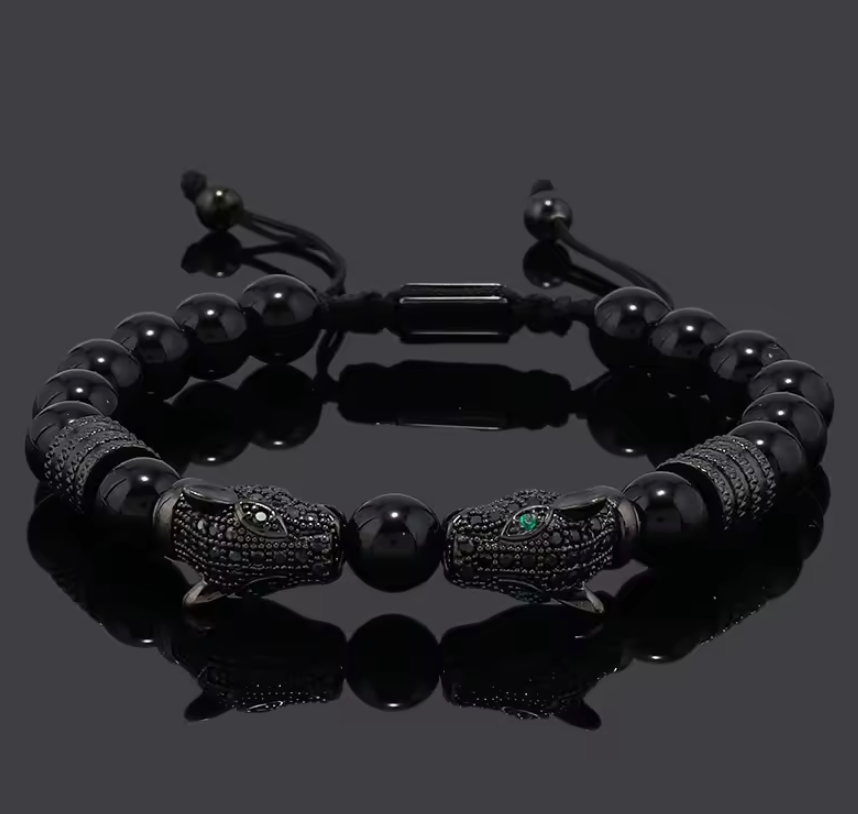 Kissing Mayan Jaguars Obsidian Stone Beads Bracelet Bracelets Men or Women (#2)