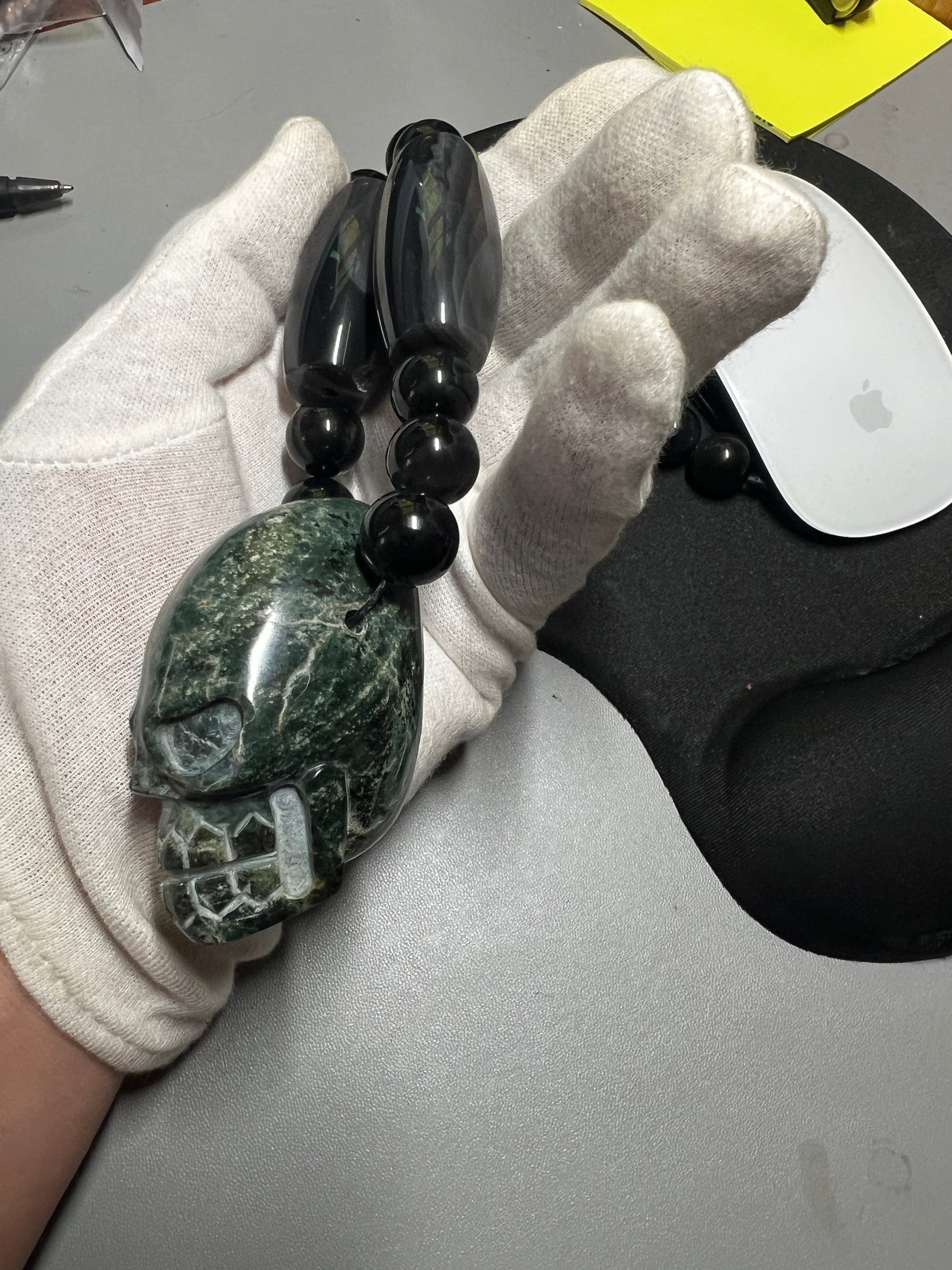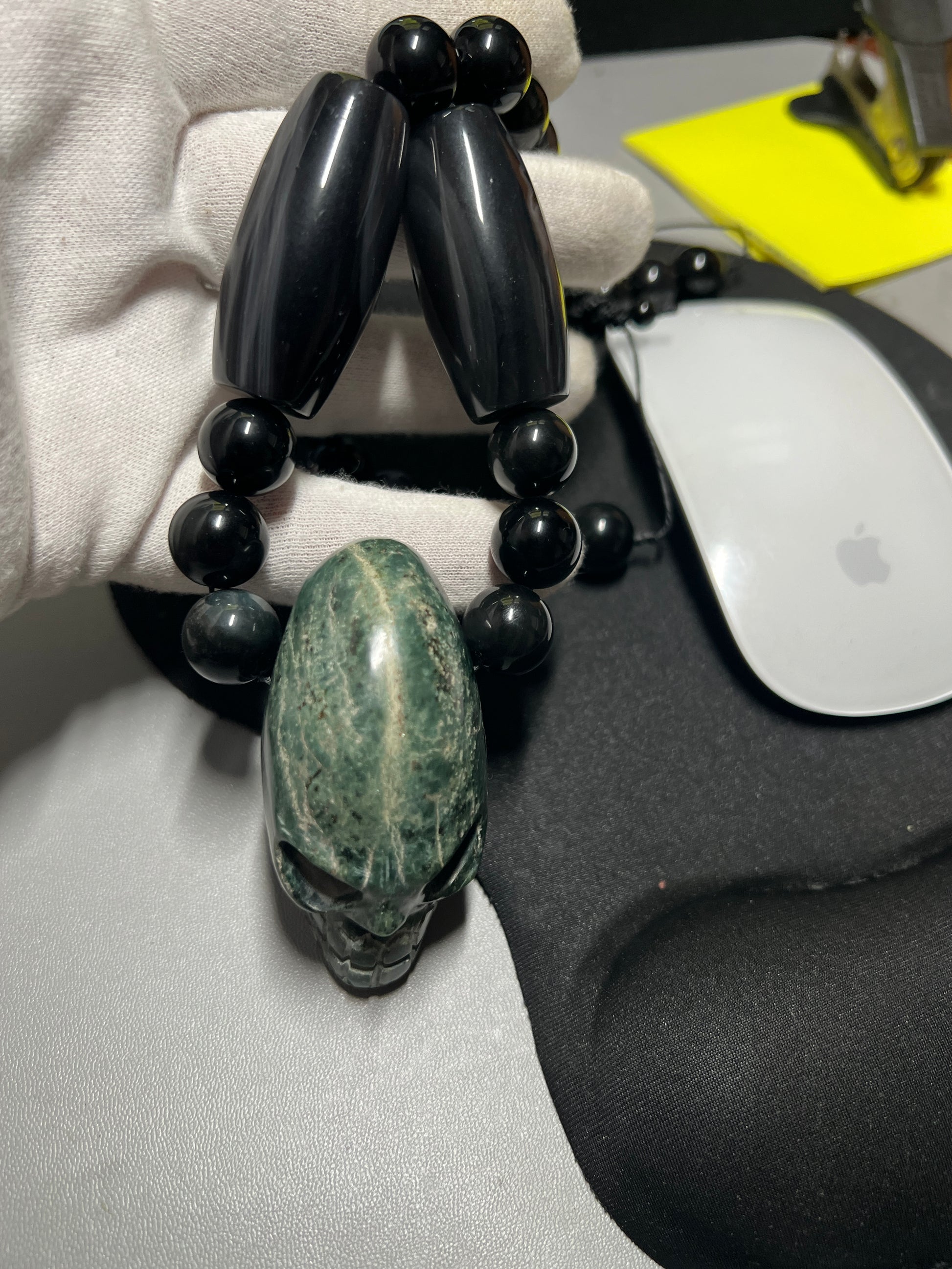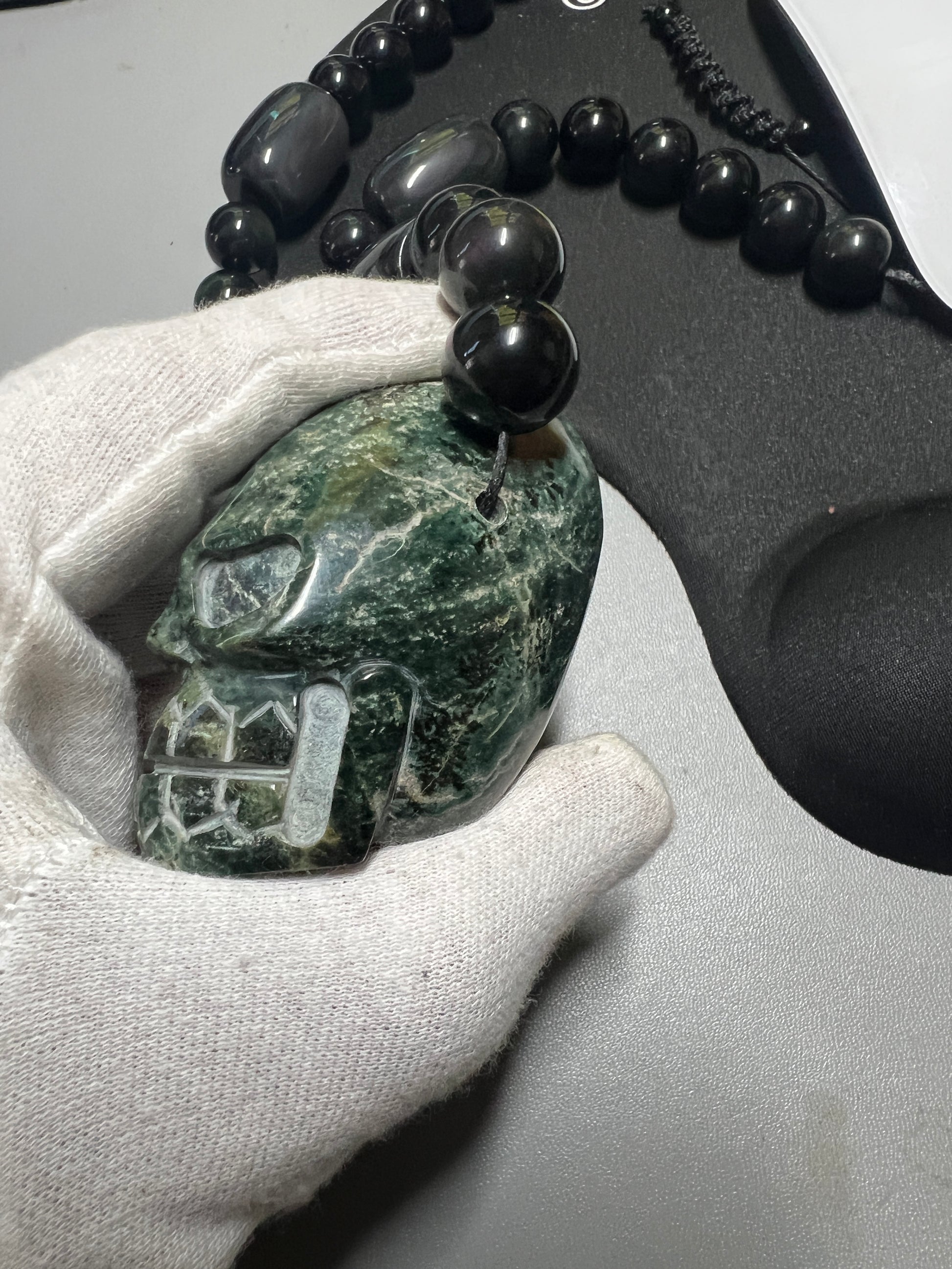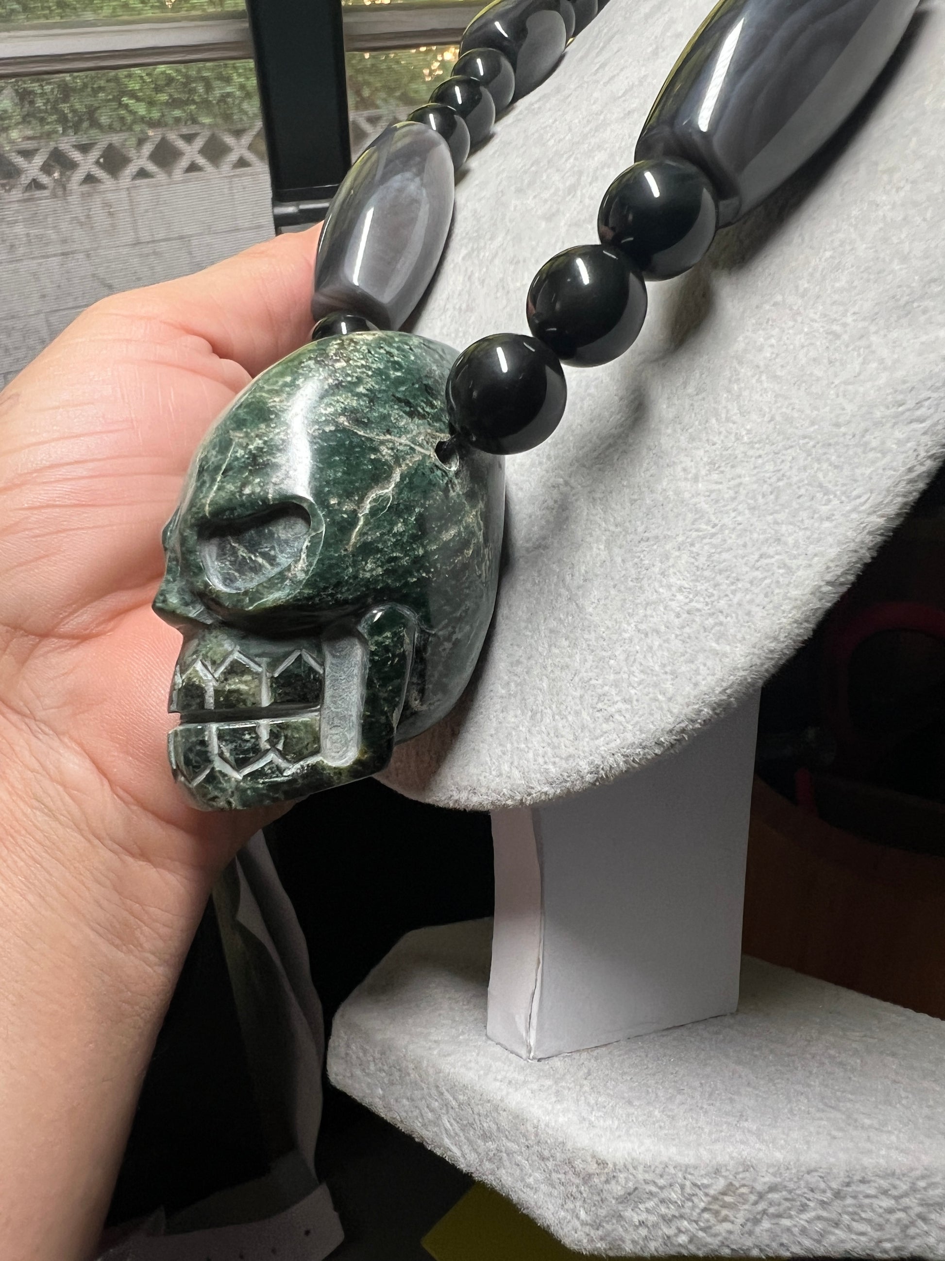 Large Jade Alien Head, Large Obsidian Beads, from Mexico