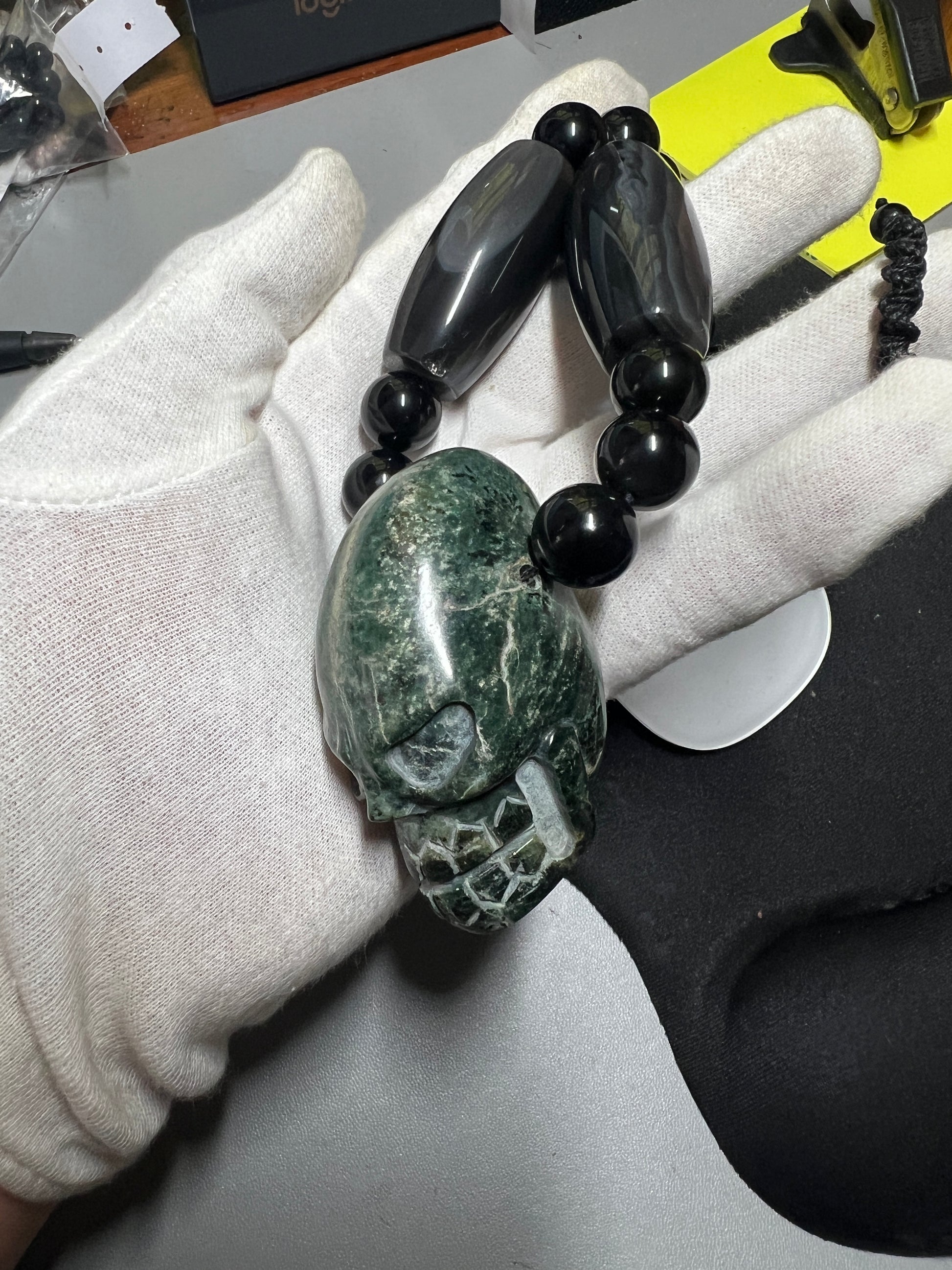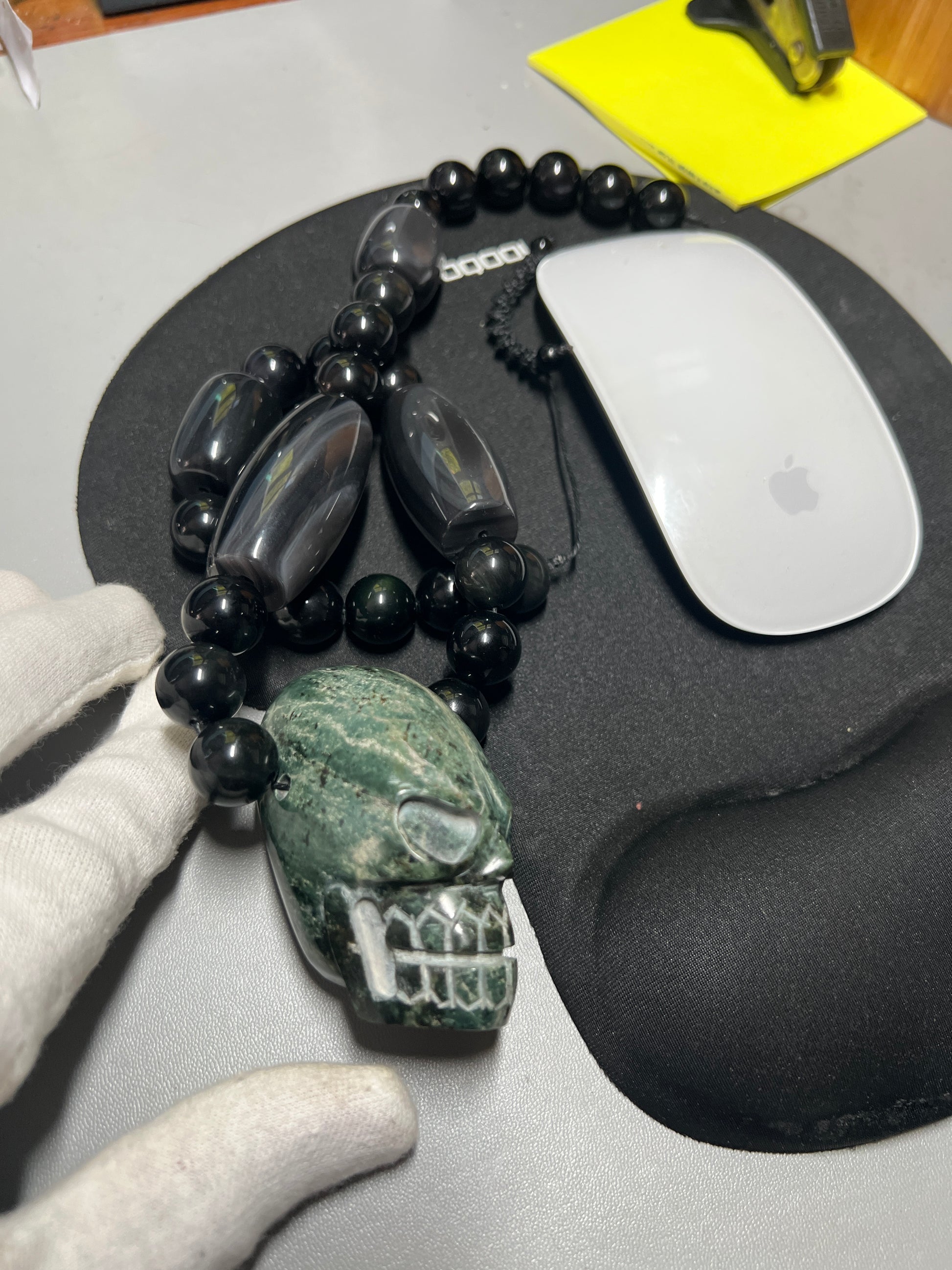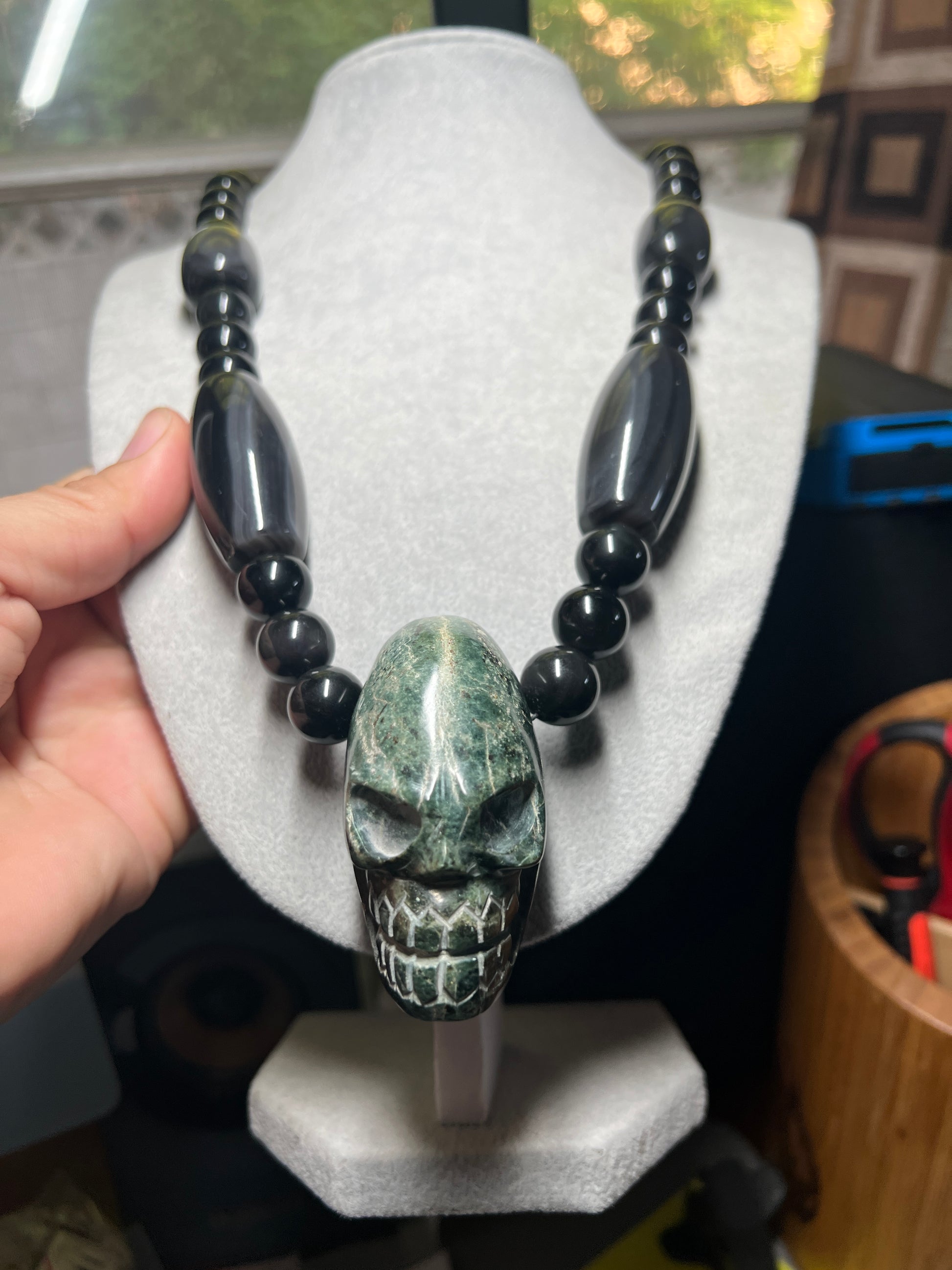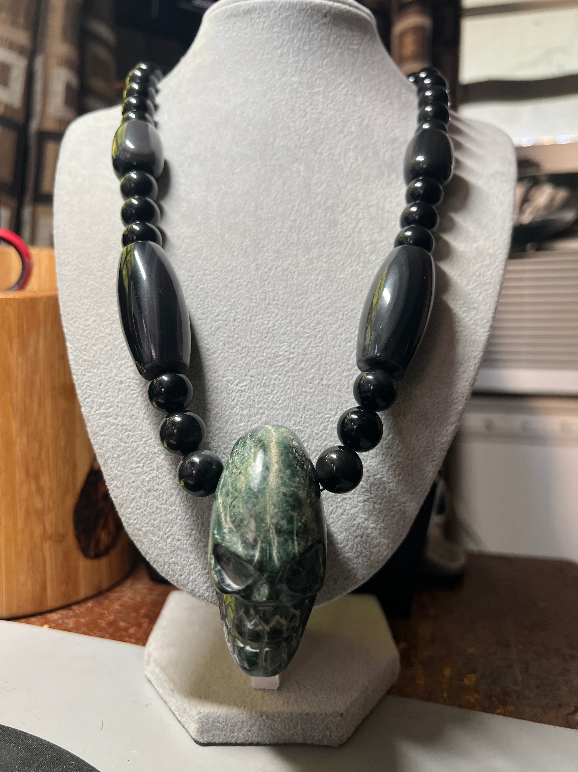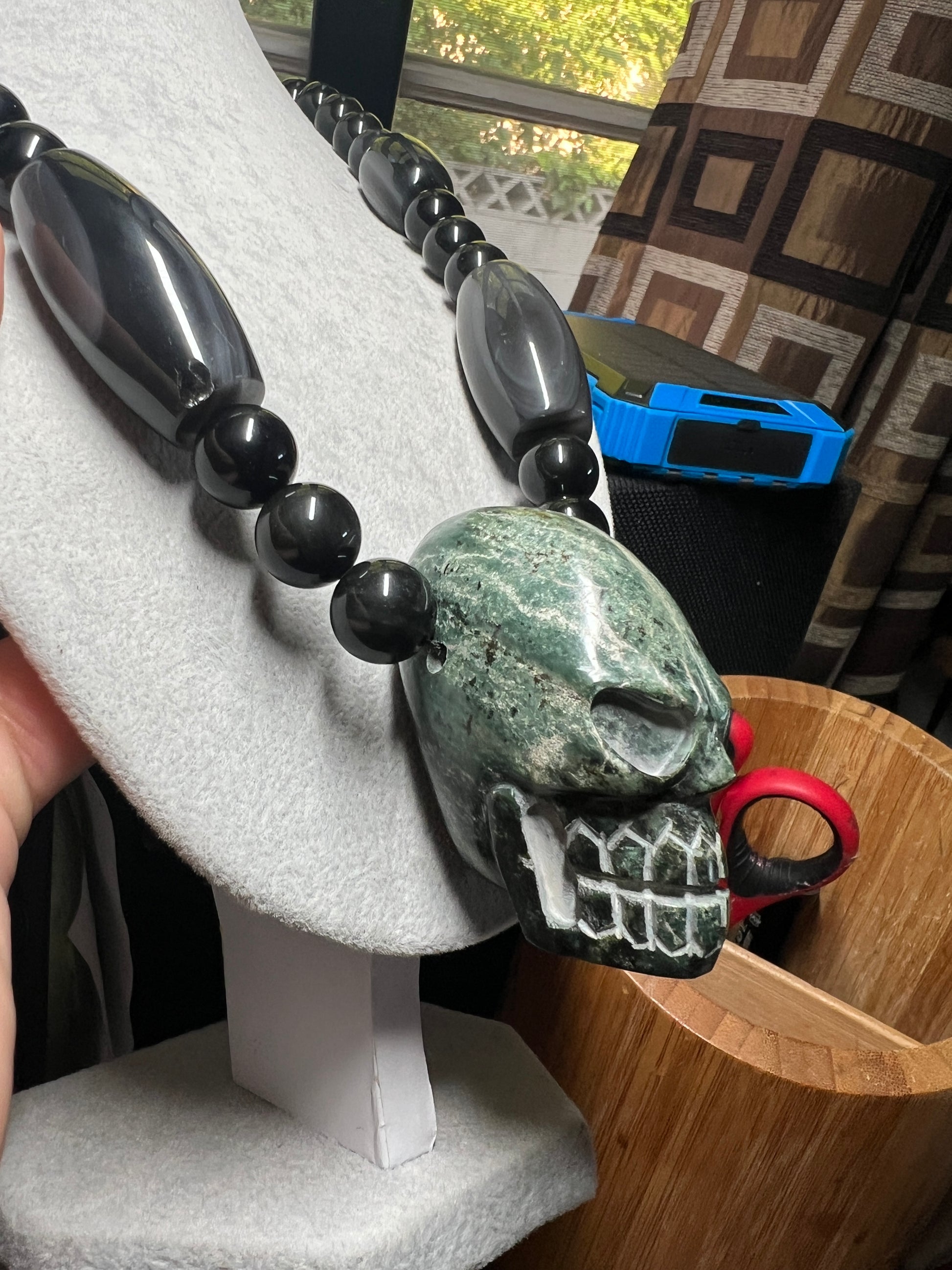 Large Jade Alien Head, Large Obsidian Beads, from Mexico