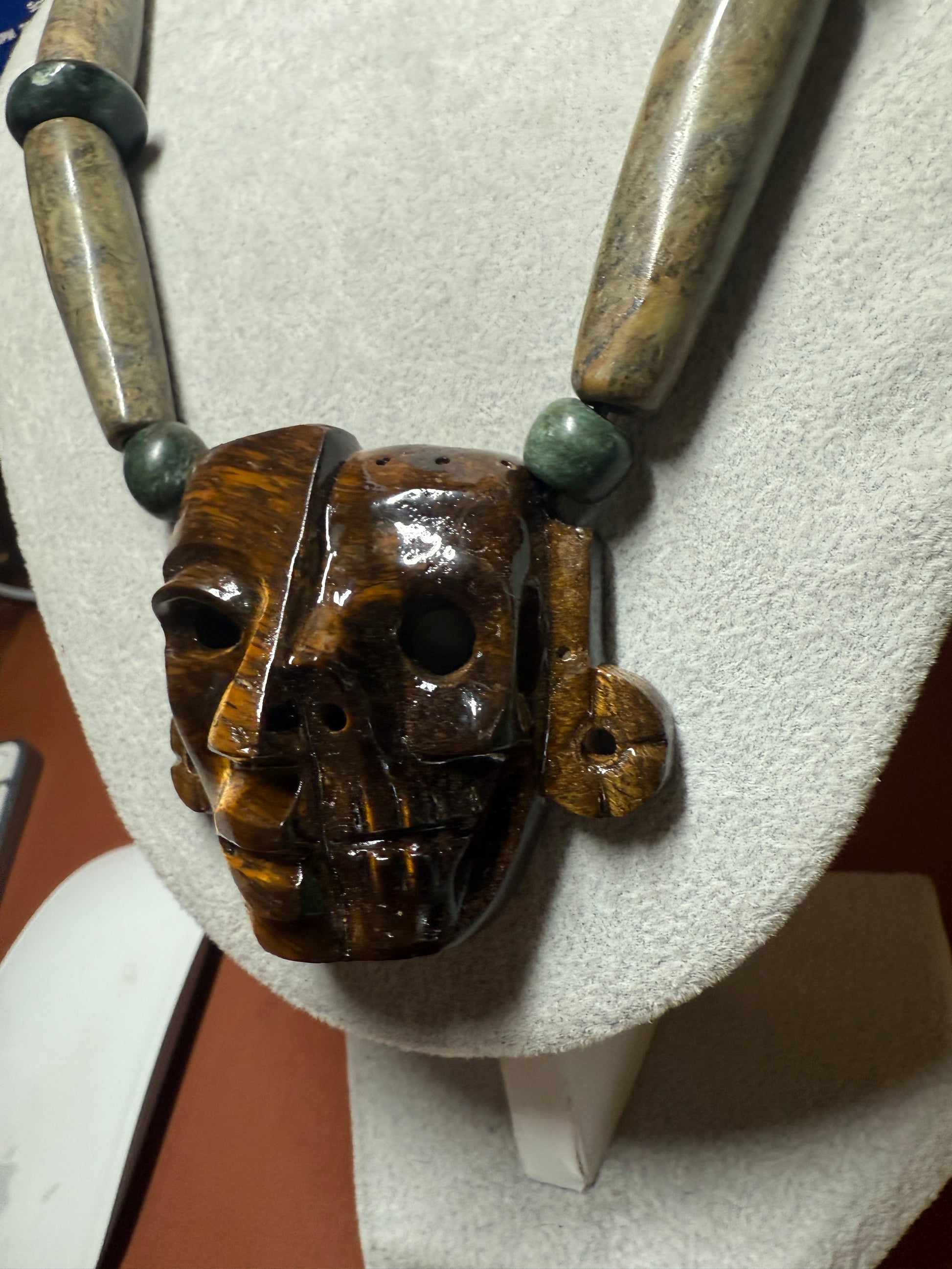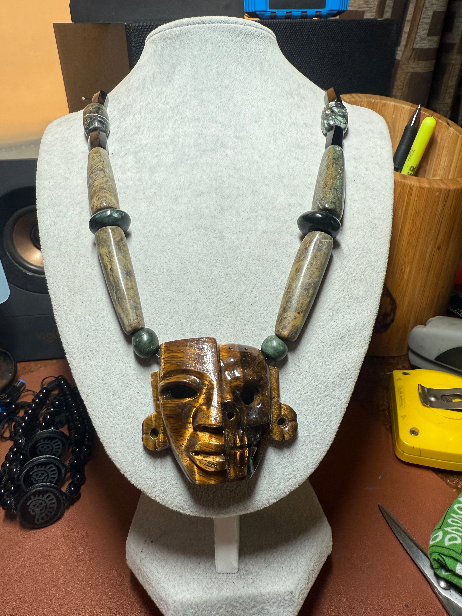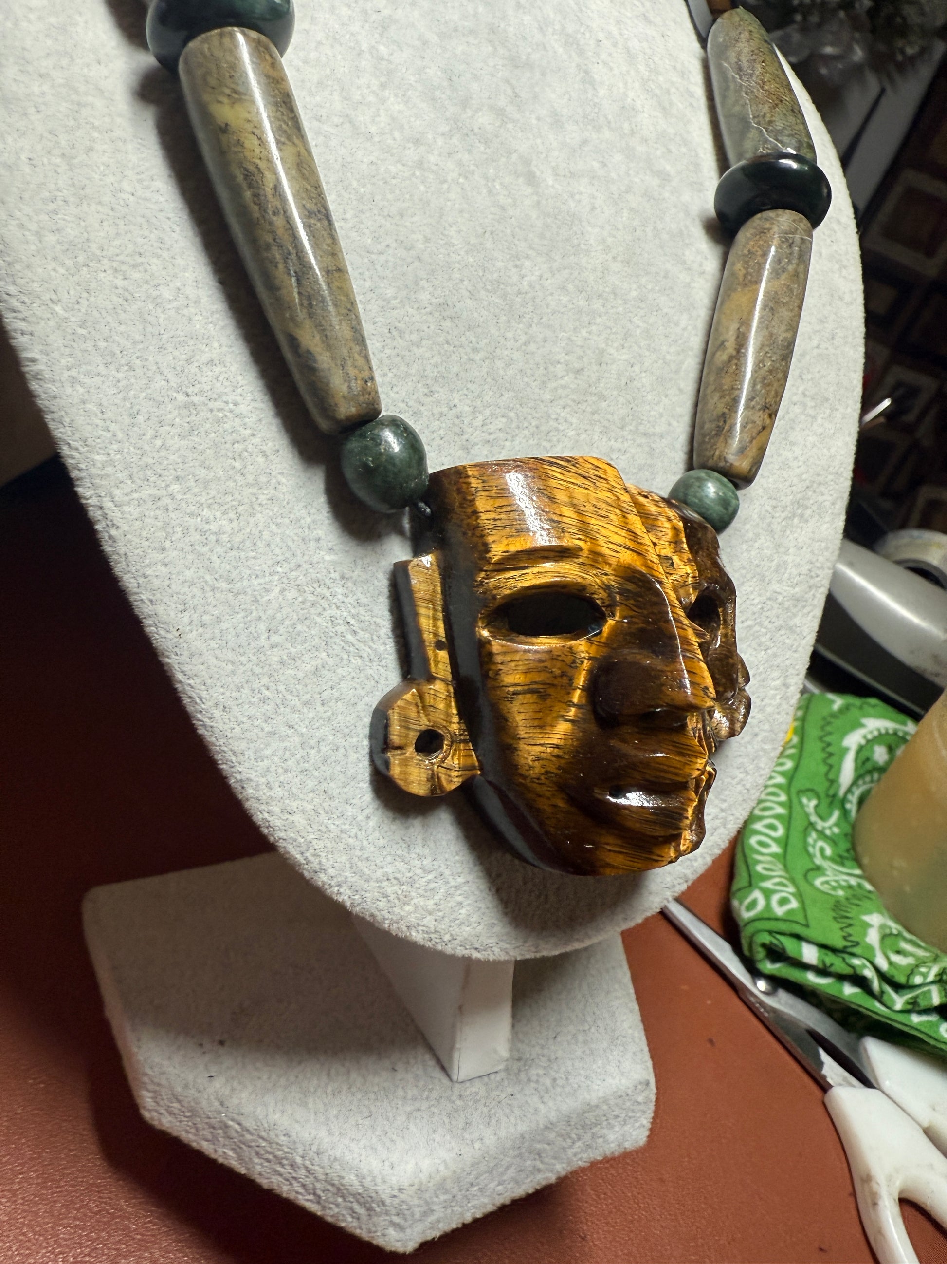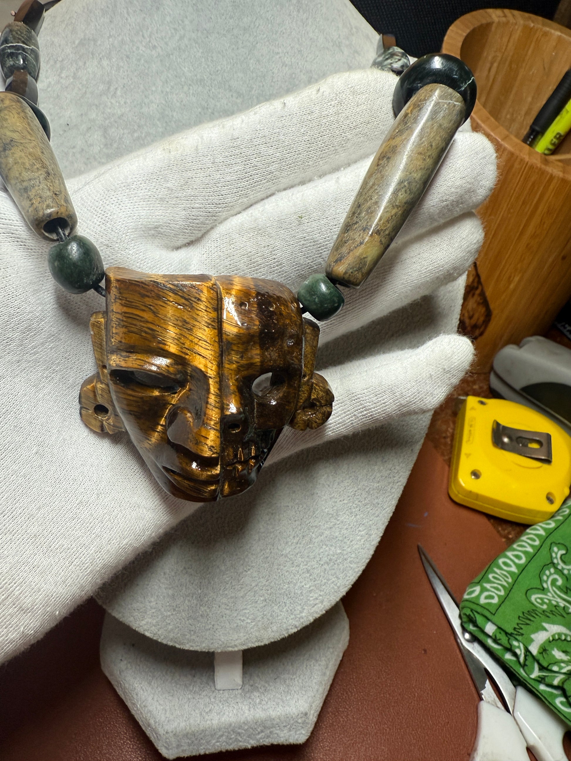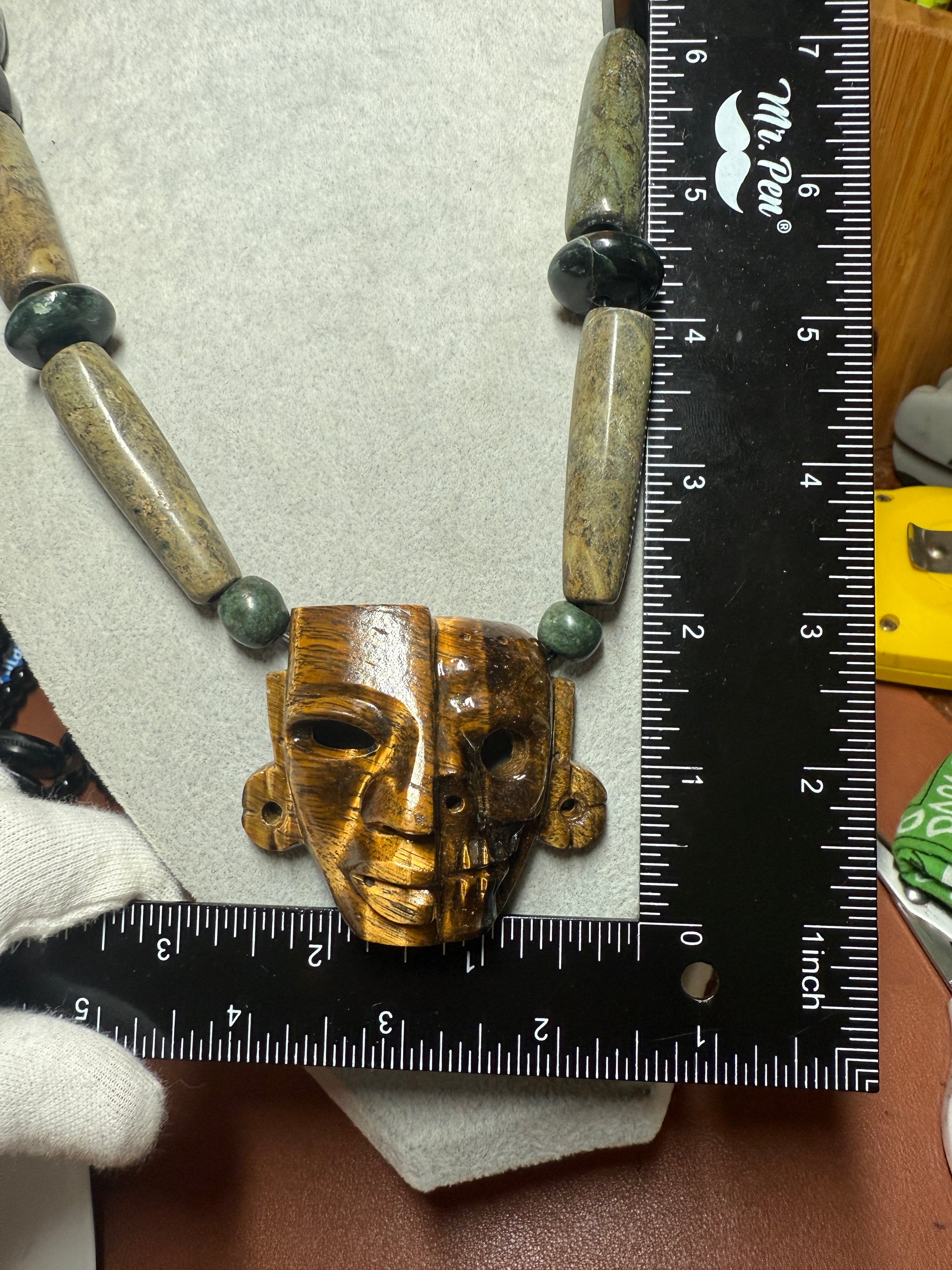 SOLD! Large Life Death Mask Tiger Eye Stone Pendant Necklace, Marble, Obsidian Beads, Aztec, Maya (#H)