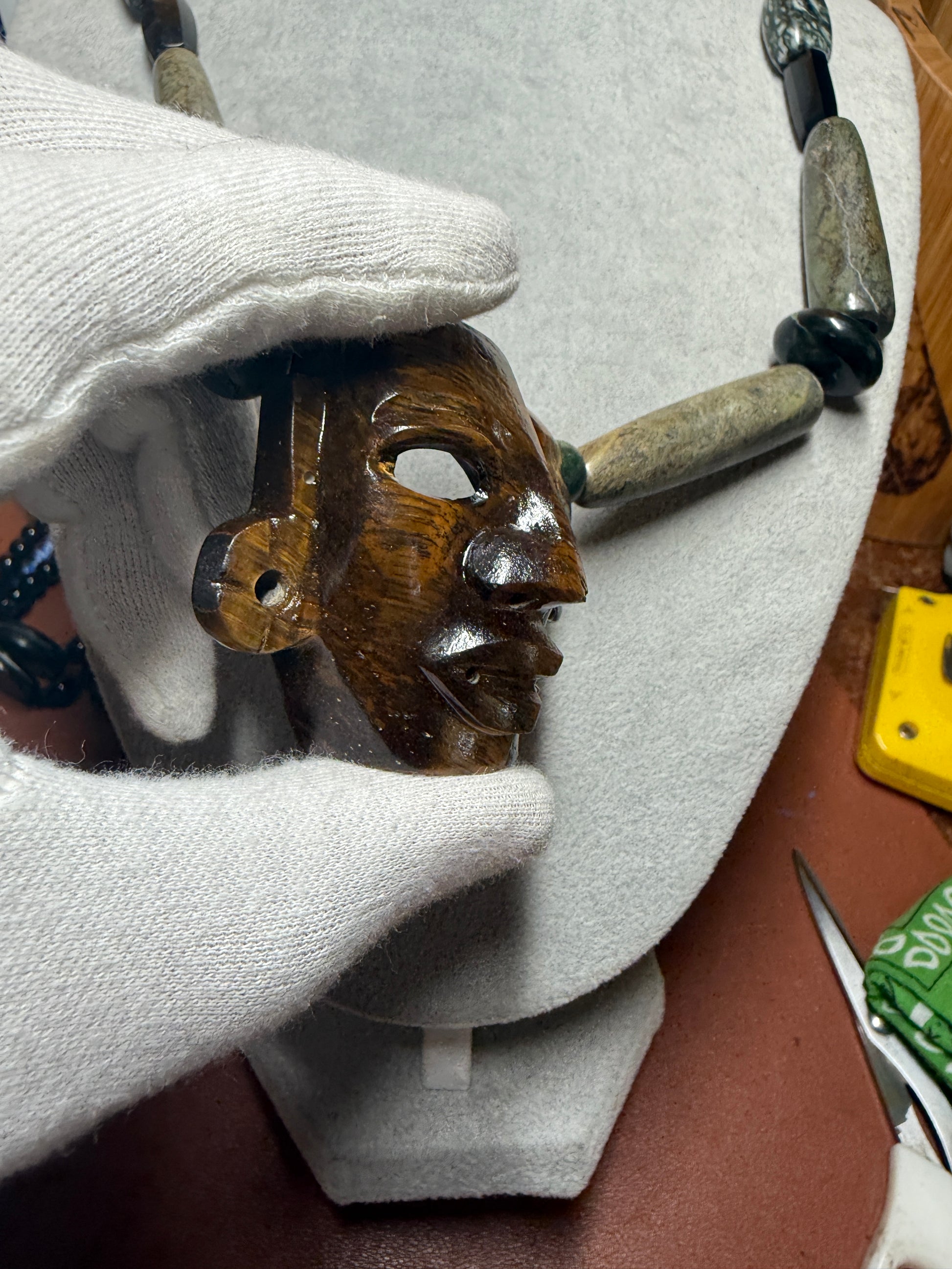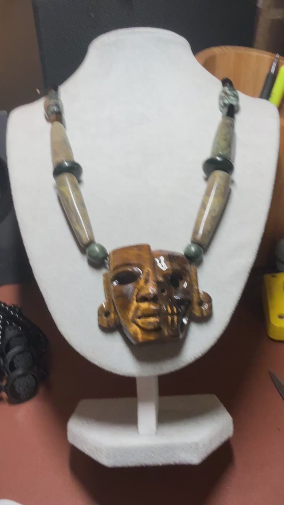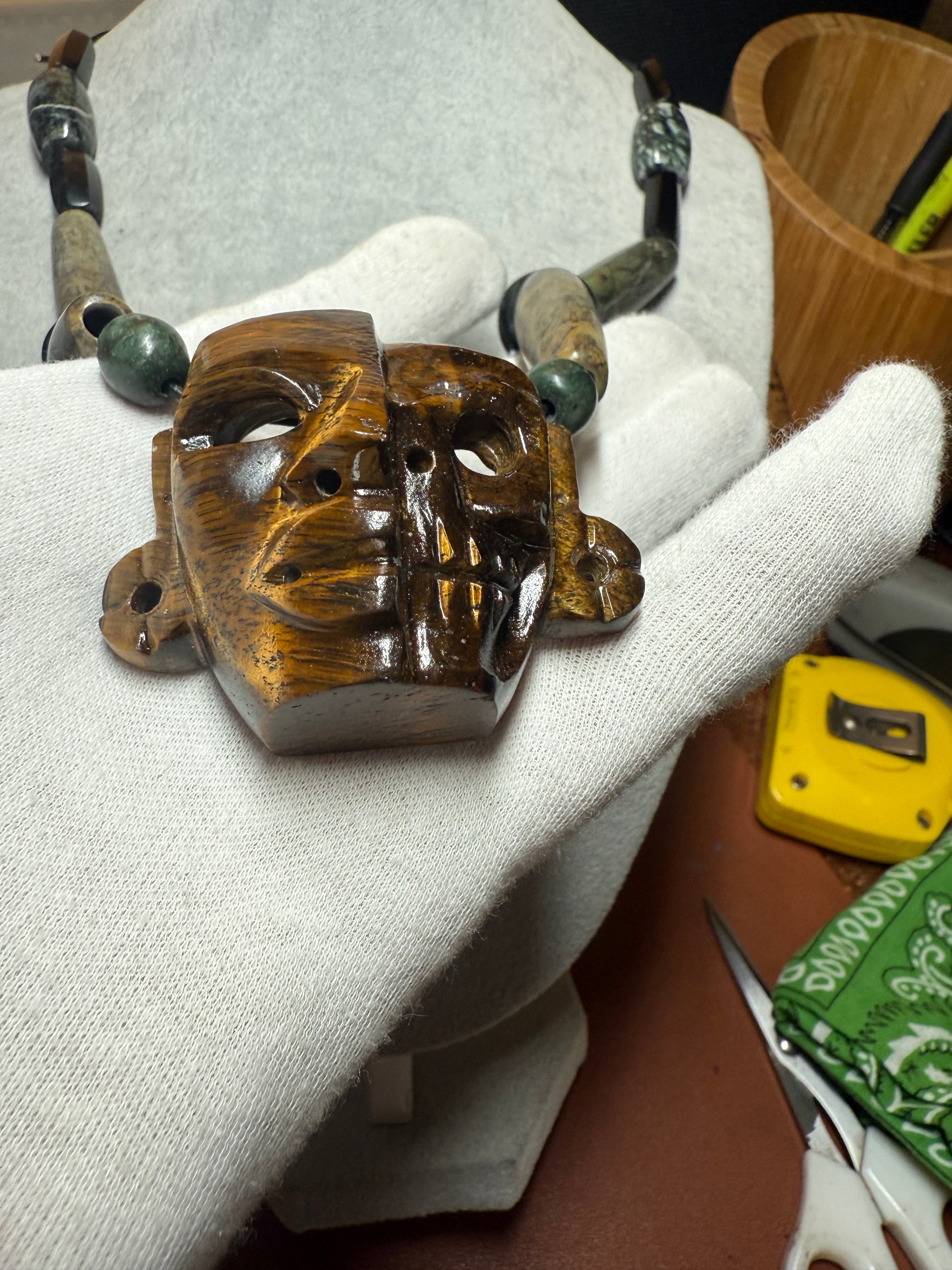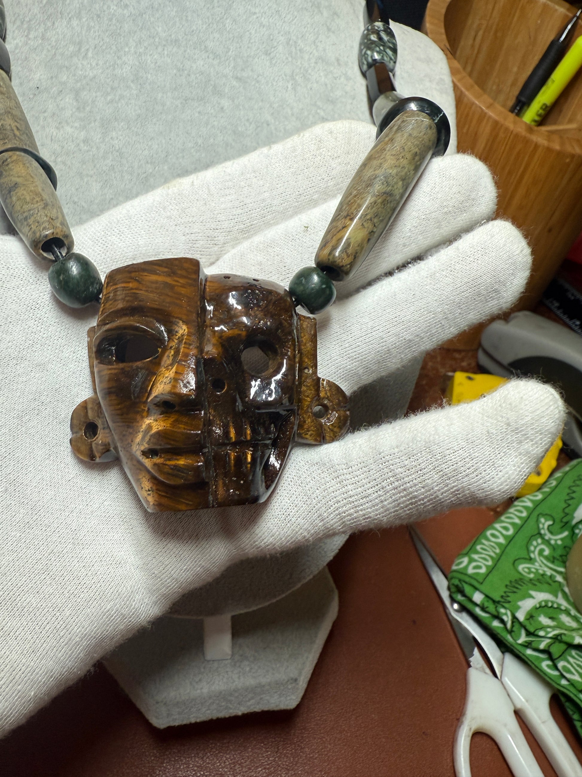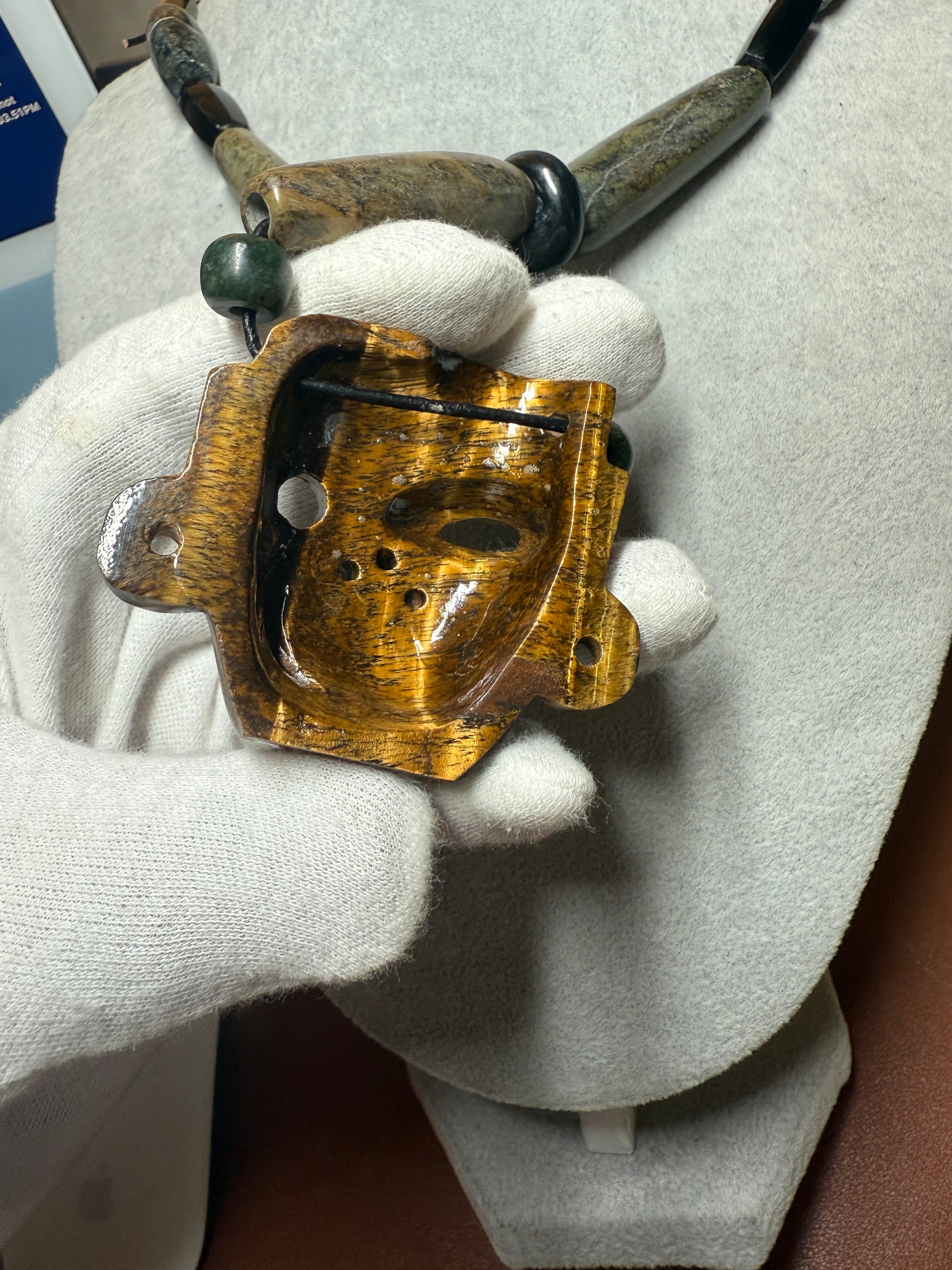 SOLD! Large Life Death Mask Tiger Eye Stone Pendant Necklace, Marble, Obsidian Beads, Aztec, Maya (#H)