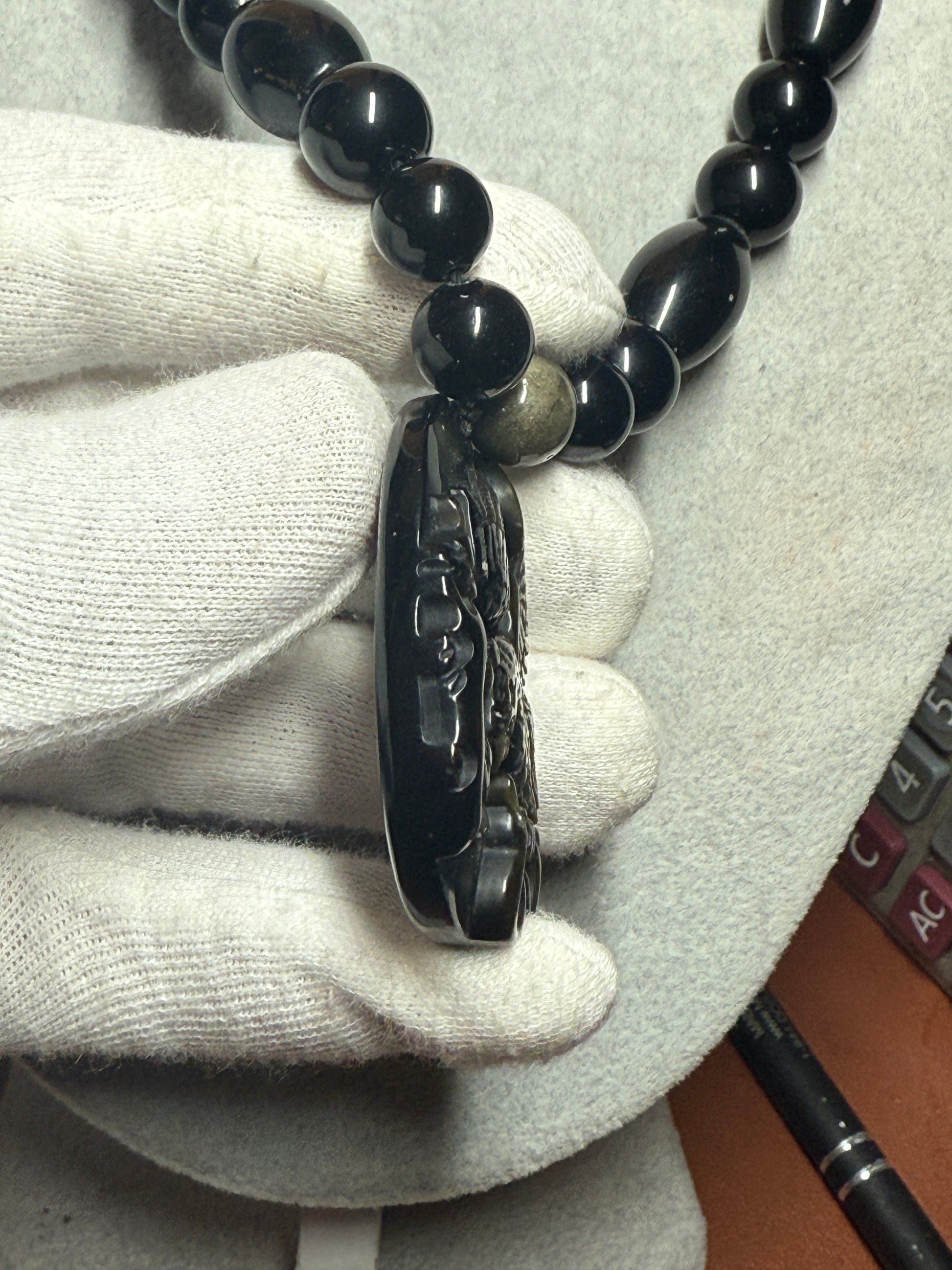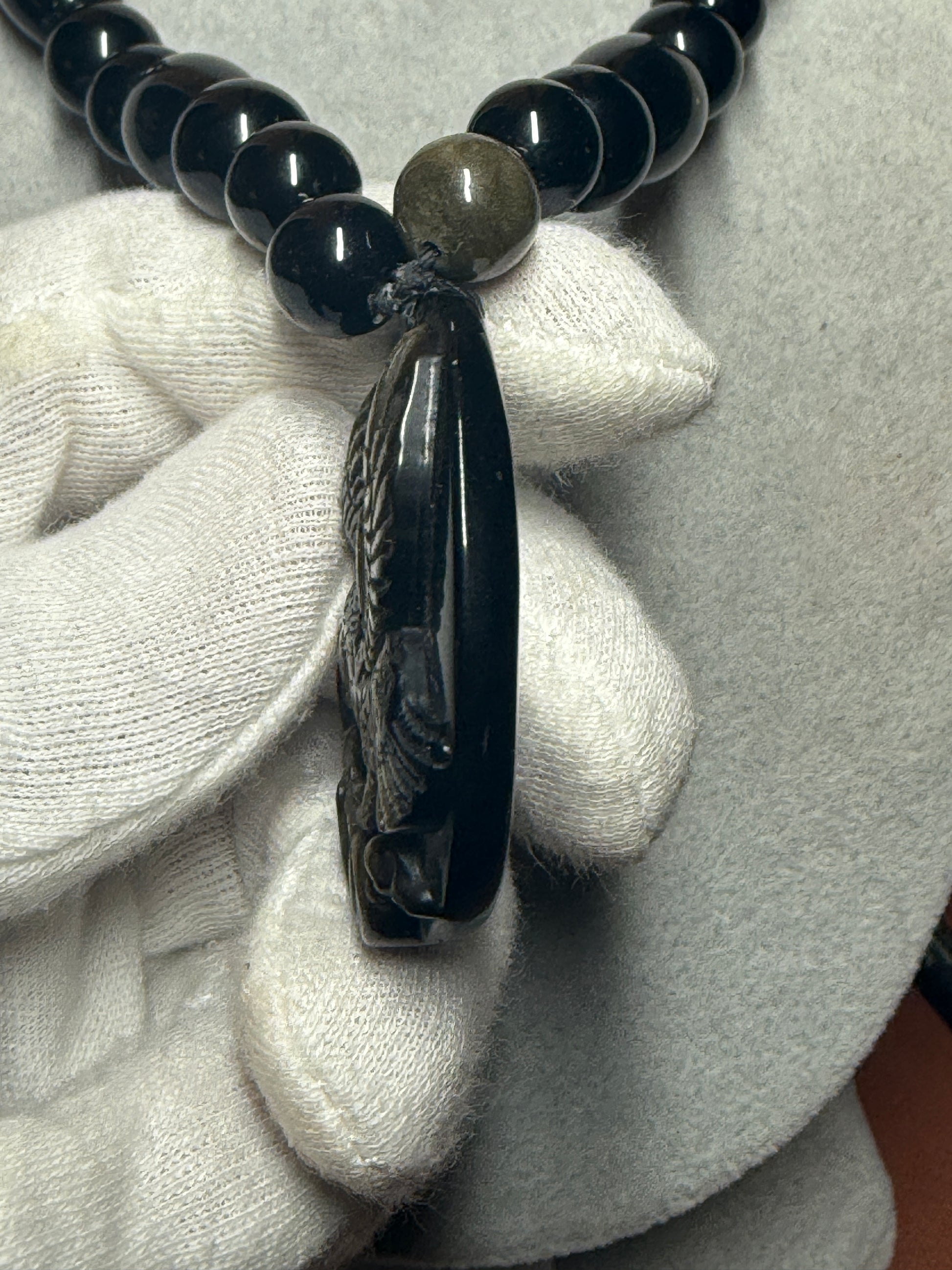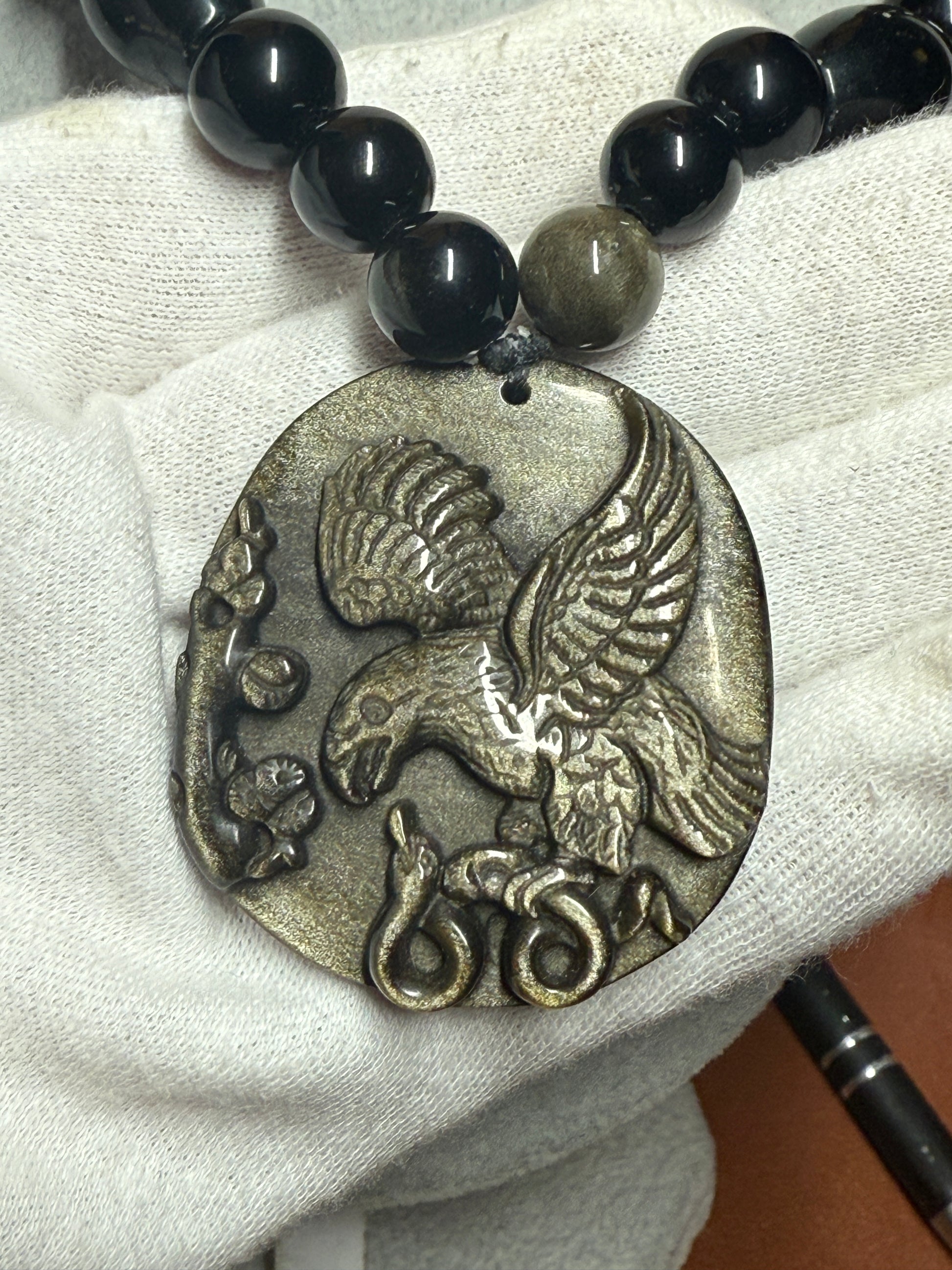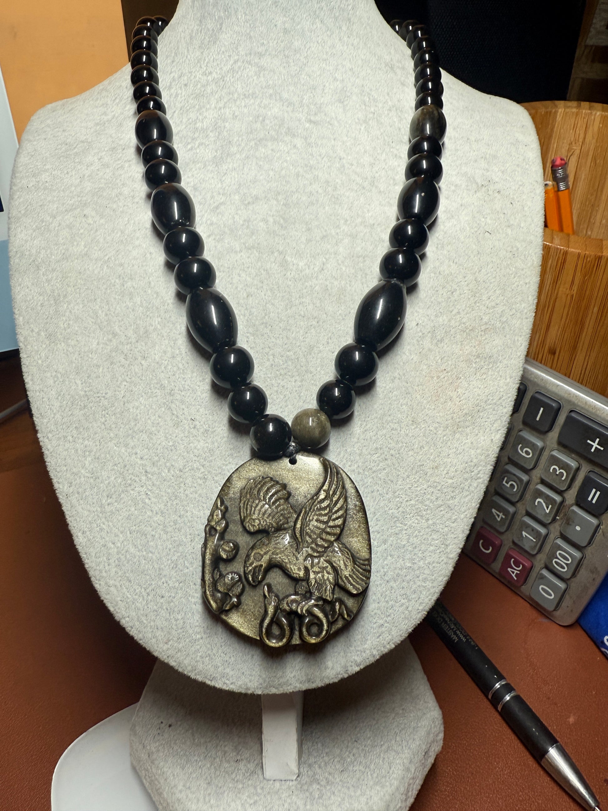Gold Obsidian Mexican Shield Eagle Snake Cactus Foundation Pendant Necklace