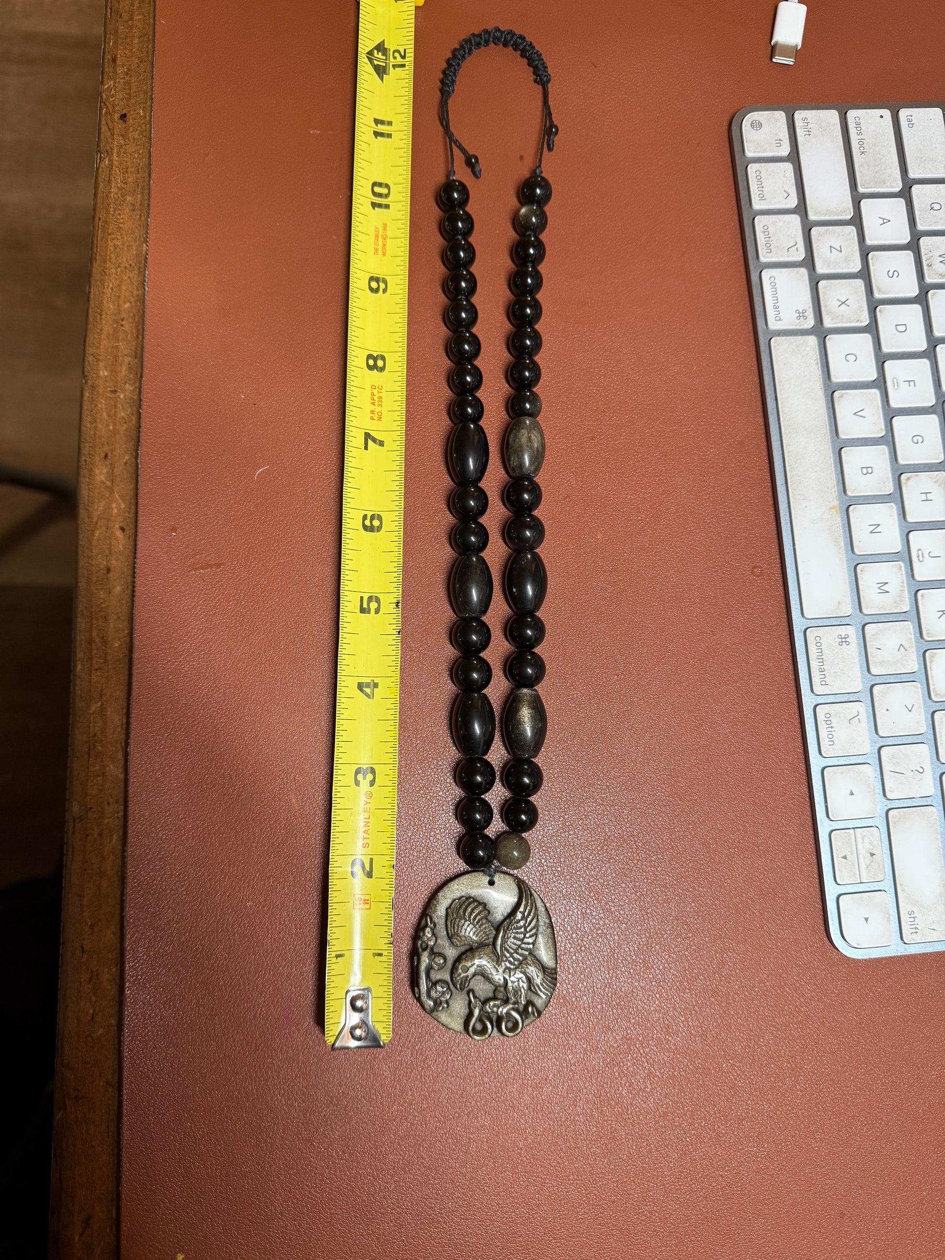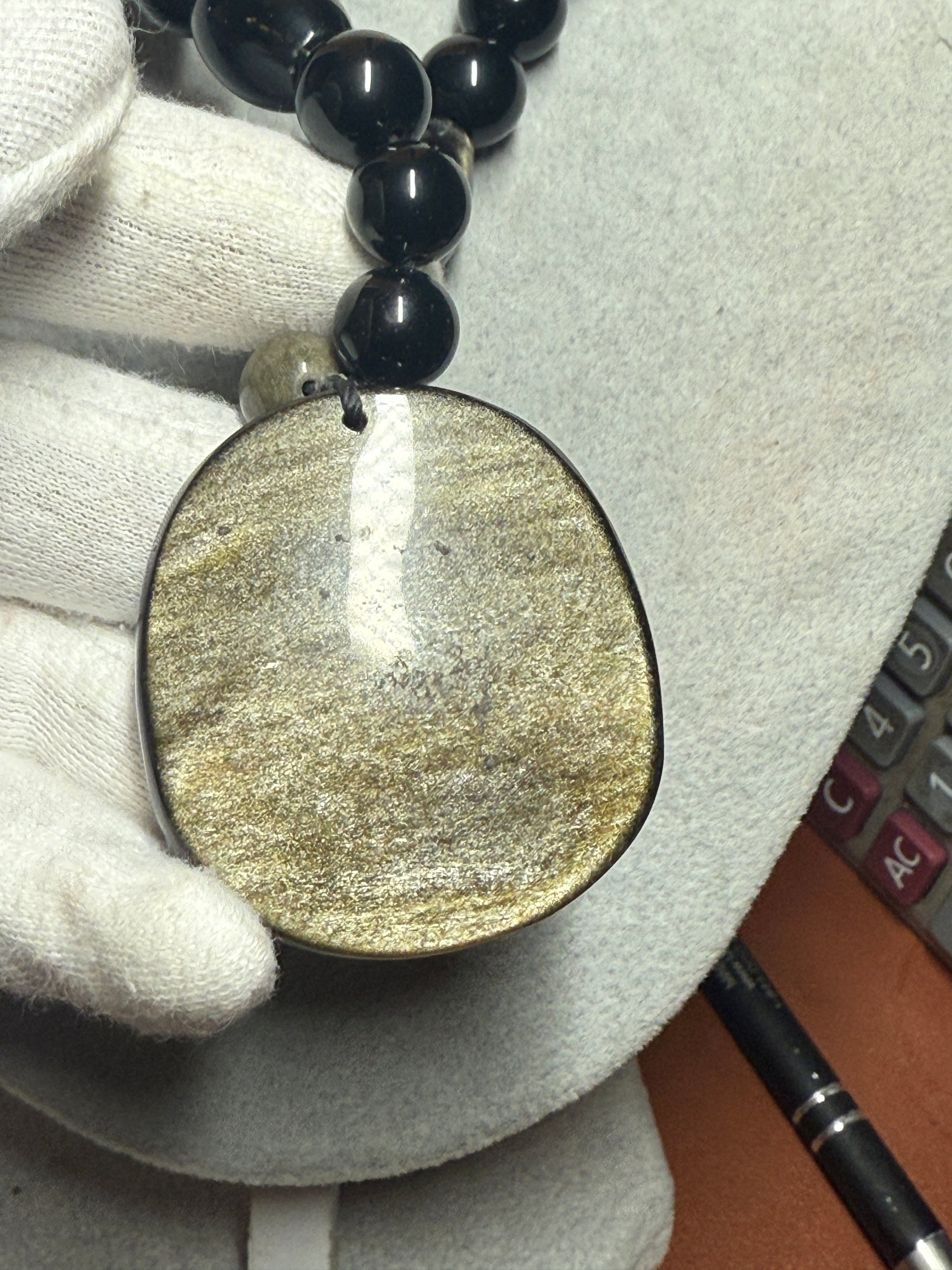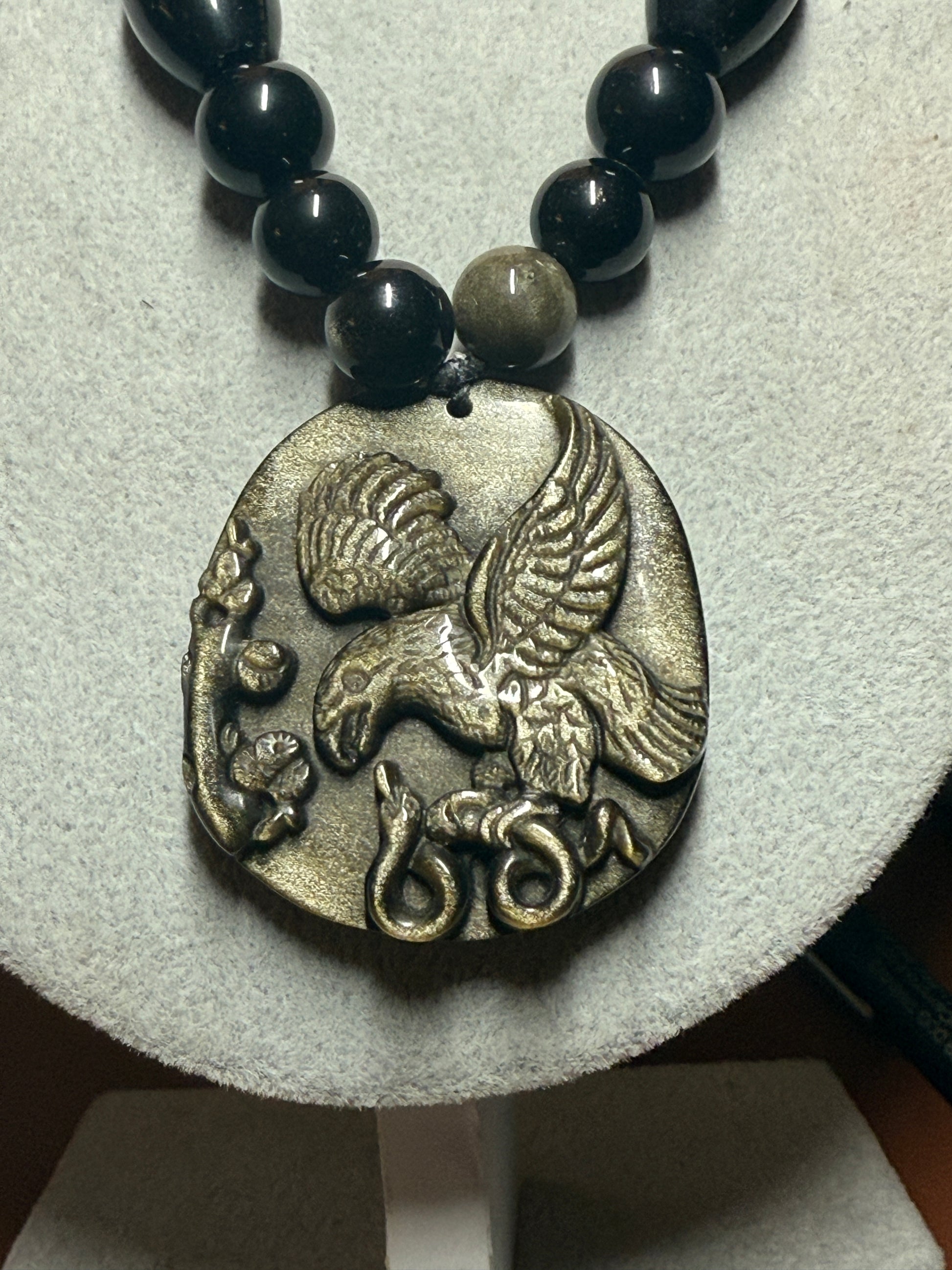 Gold Obsidian Mexican Shield Eagle Snake Cactus Foundation Pendant Necklace, Mexico (#39)
